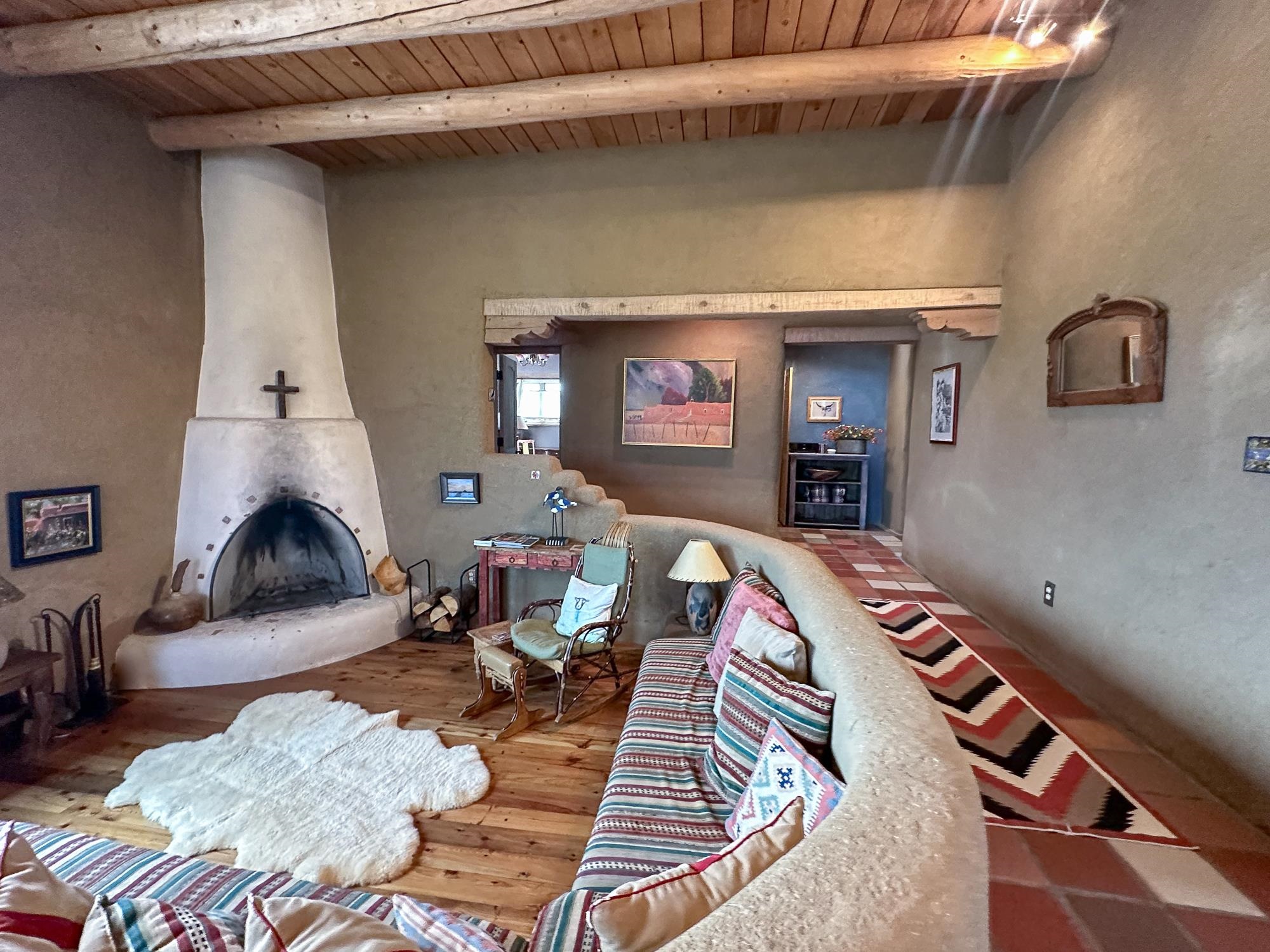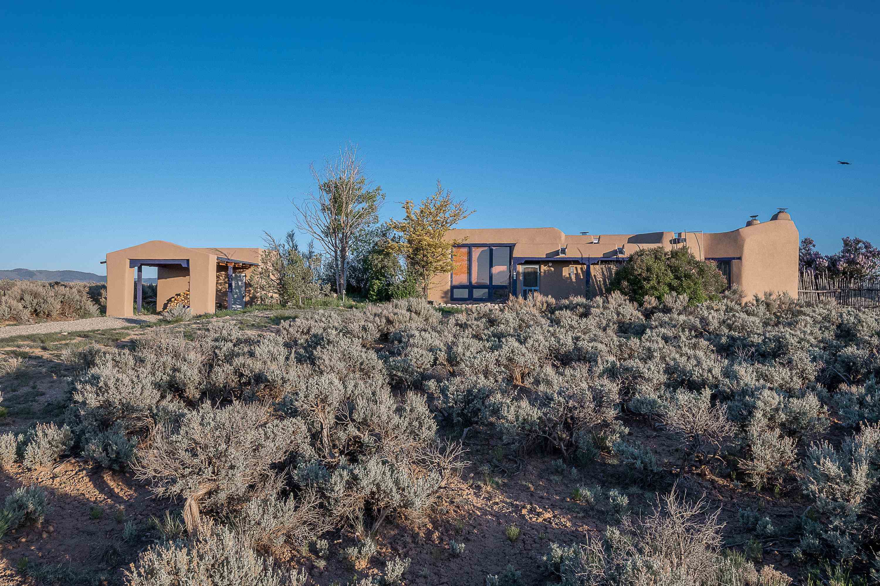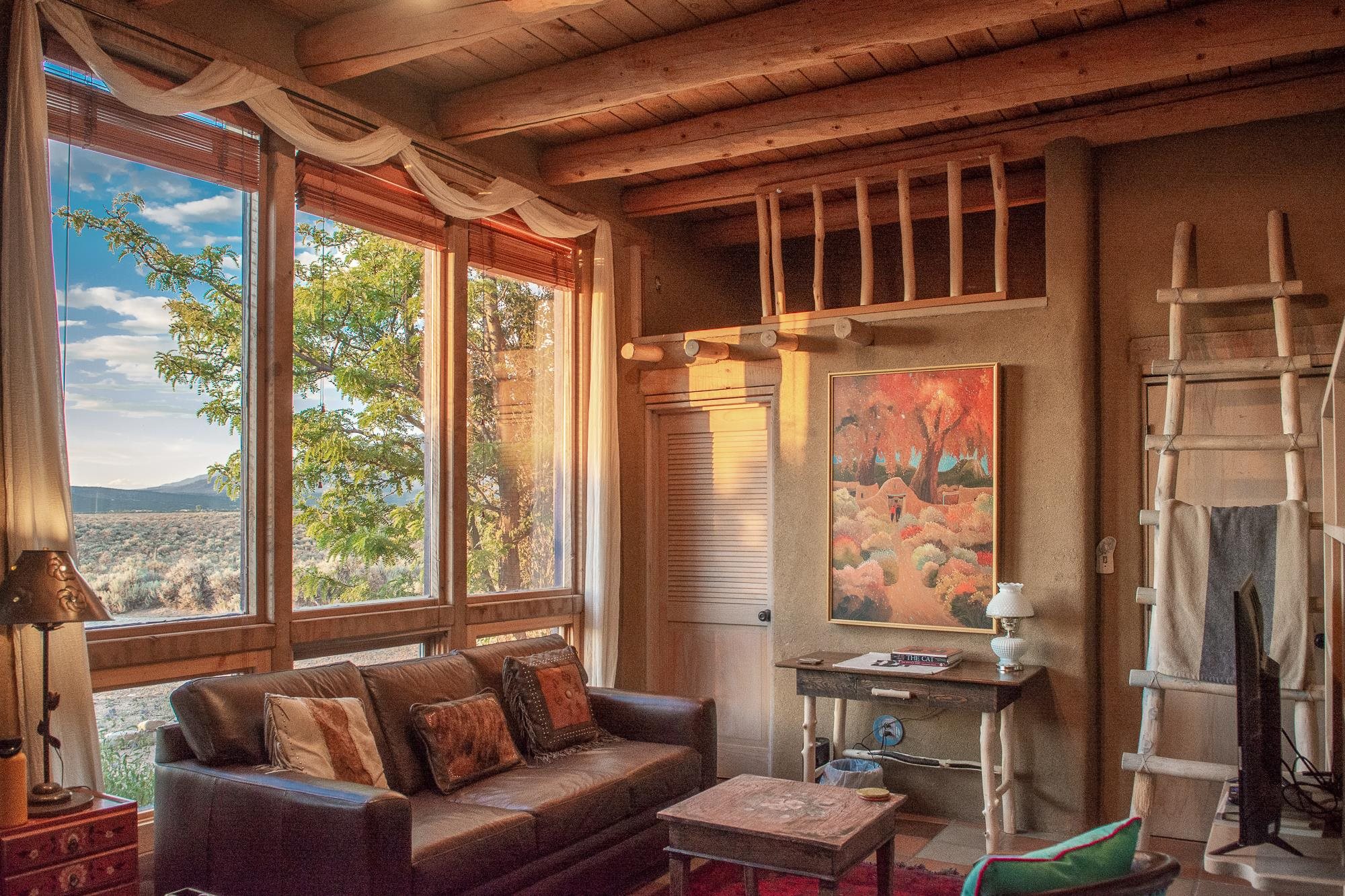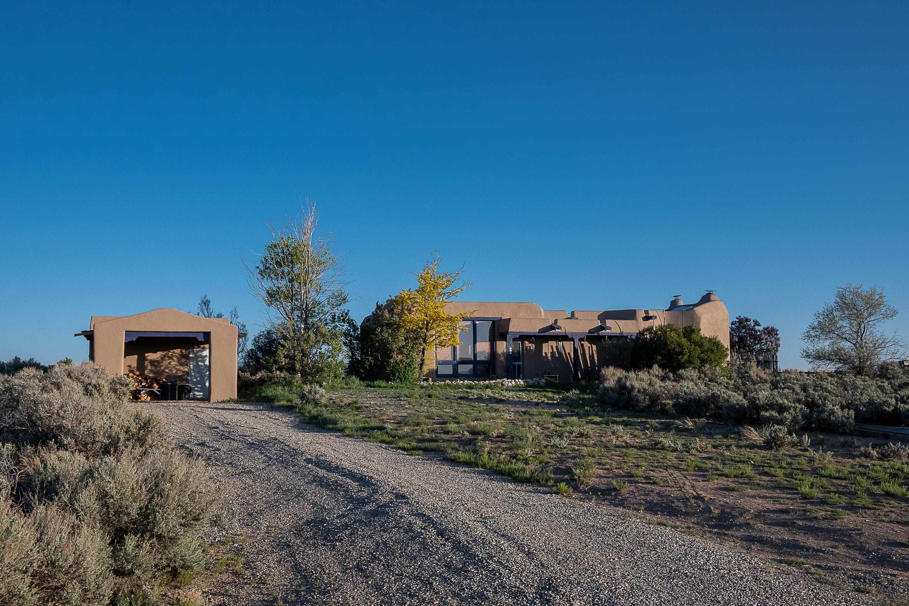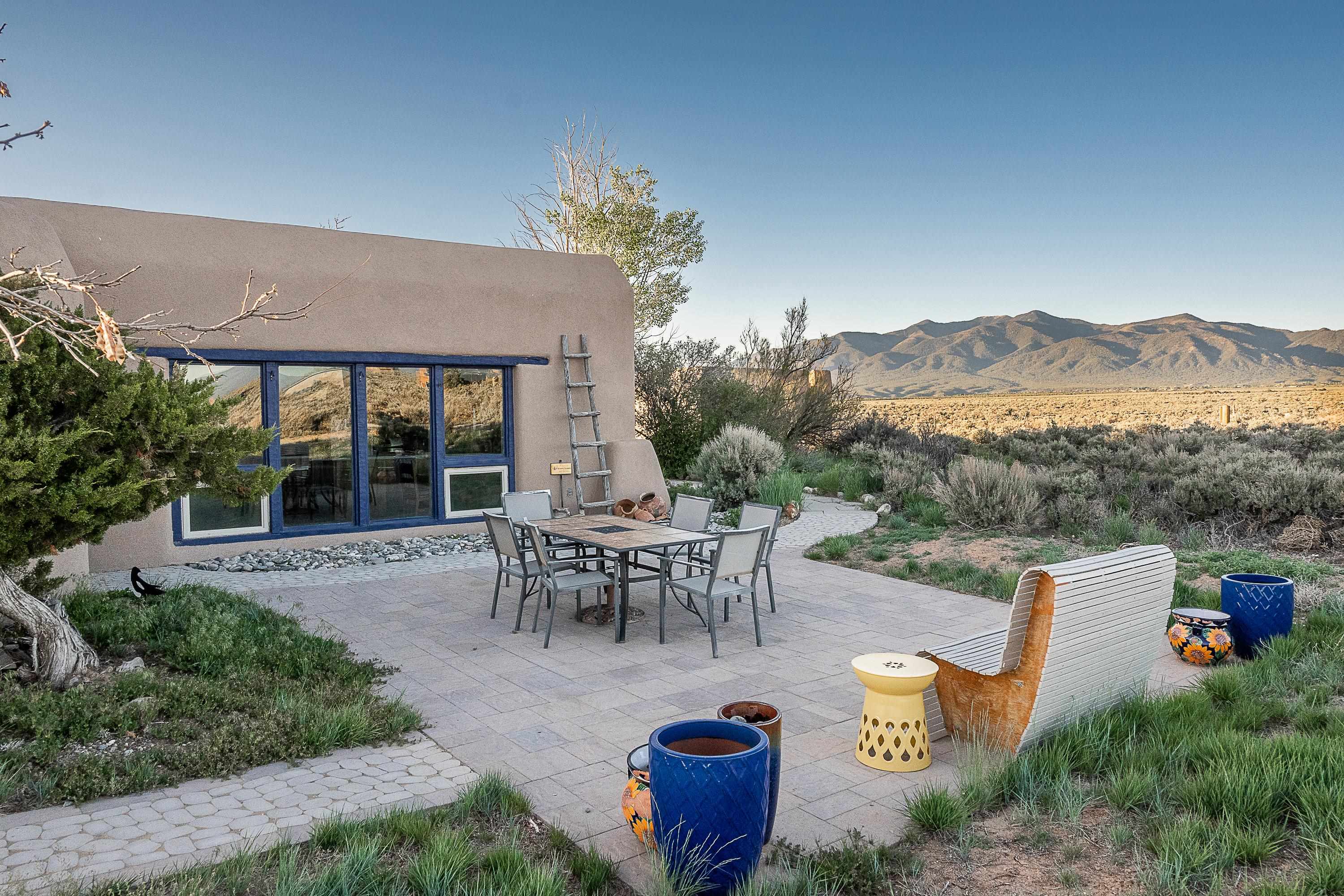 WELCOME TO ADOBE DE ARTISTA -- Where art, charm, and investment potential converge under the big Taos sky. Looking for a turn-key property with serious short-term rental mojo? This one’s got it! A guest favorite for years, Adobe de Artista boasts a loyal following of return visitors who just can’t get enough. Already in compliance with the new Taos County STR ordinance (though the permit isn’t transferable), the groundwork has been laid for smooth re-permitting. Furnishings? Let’s talk—available via separate bill of sale. High-speed fiber optic internet to keep remote life humming. This one-of-a-kind adobe is over 2,000 square feet of handcrafted soul. Designed and built by iconic Taos painter Ed Sandoval, the home is a sculptural blend of adobe, mica, straw, stone, and wood—an earthy, radiant, living work of art. Set on 1.25 acres and bordering Pueblo land, you’ll never lose sight of the mountains or the peace. Step inside and you’re wrapped in the soft curves and textures of classic Taos style: plaster walls, vigas, hand-troweled tile, and light-filled spaces. One of two living rooms features a sunken lounge, banco seating, and a traditional southwest style fireplace perfect for cozy nights in. The open-concept main living space flows into a kitchen with custom cabinets and a dining area where a massive round window perfectly frames the Sangre de Cristos. The primary bedroom is generous, serene, and romantic—featuring painted plank floors, a walk-in closet, and a second stunning fireplace with mica shimmer. The en suite bath? Think river rock shower + tiny fireplace = spa-like bliss. The second bedroom is sunny and opens to a private patio, with its own en suite bath for guests or renters. A third full bath and laundry closet complete the layout. Outside, you’ll find multiple patios, shady spots, and stargazing nooks—plus a hot tub made for soaking under the Milky Way. There’s also a carport and gear storage for your skis, bikes, or fly rods. Just 20 minutes to Taos Plaza and 25 to the Ski Valley, this is more than a home—it’s a retreat, a vibe, and a smart investment all wrapped into one adobe masterpiece.