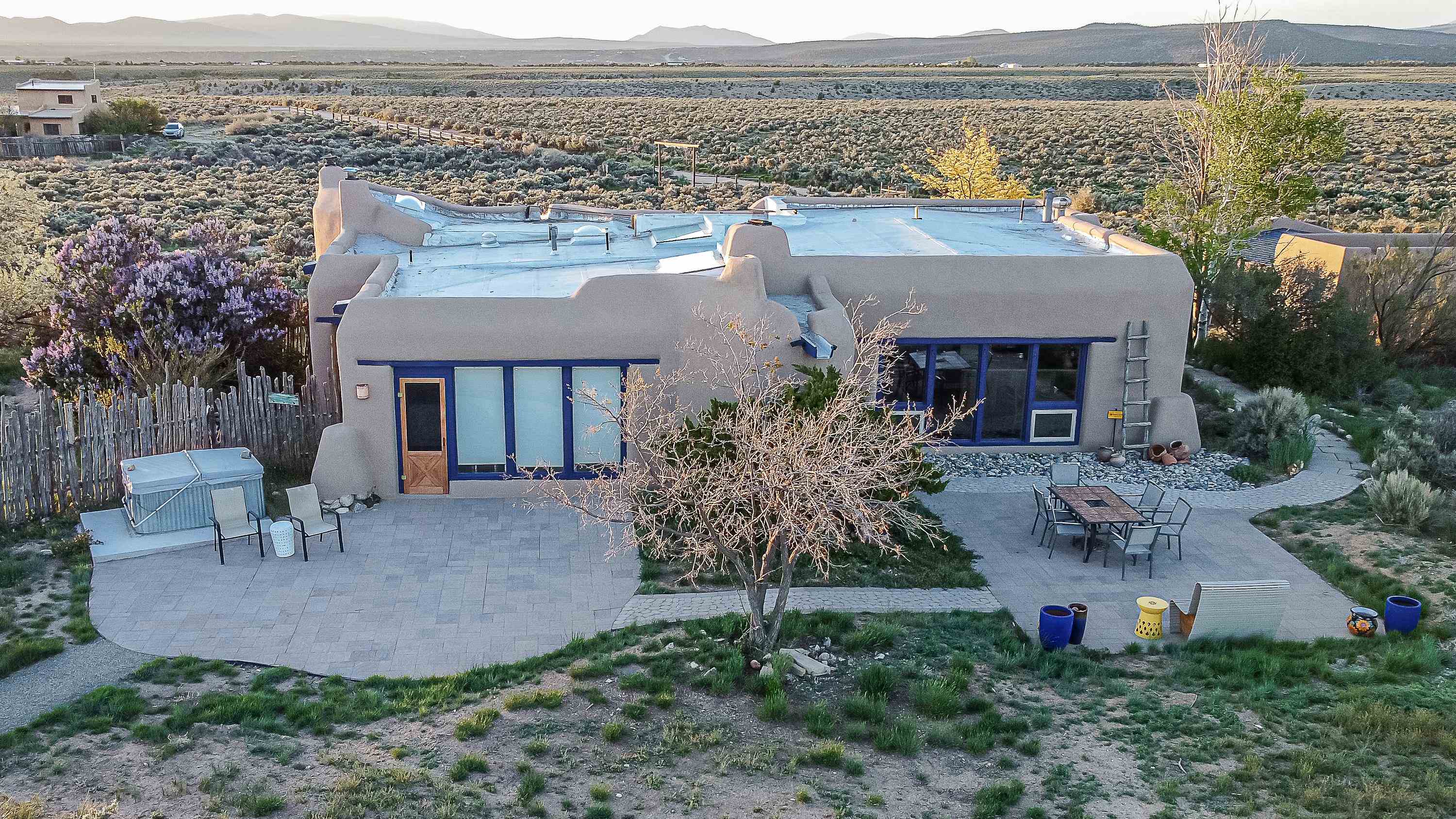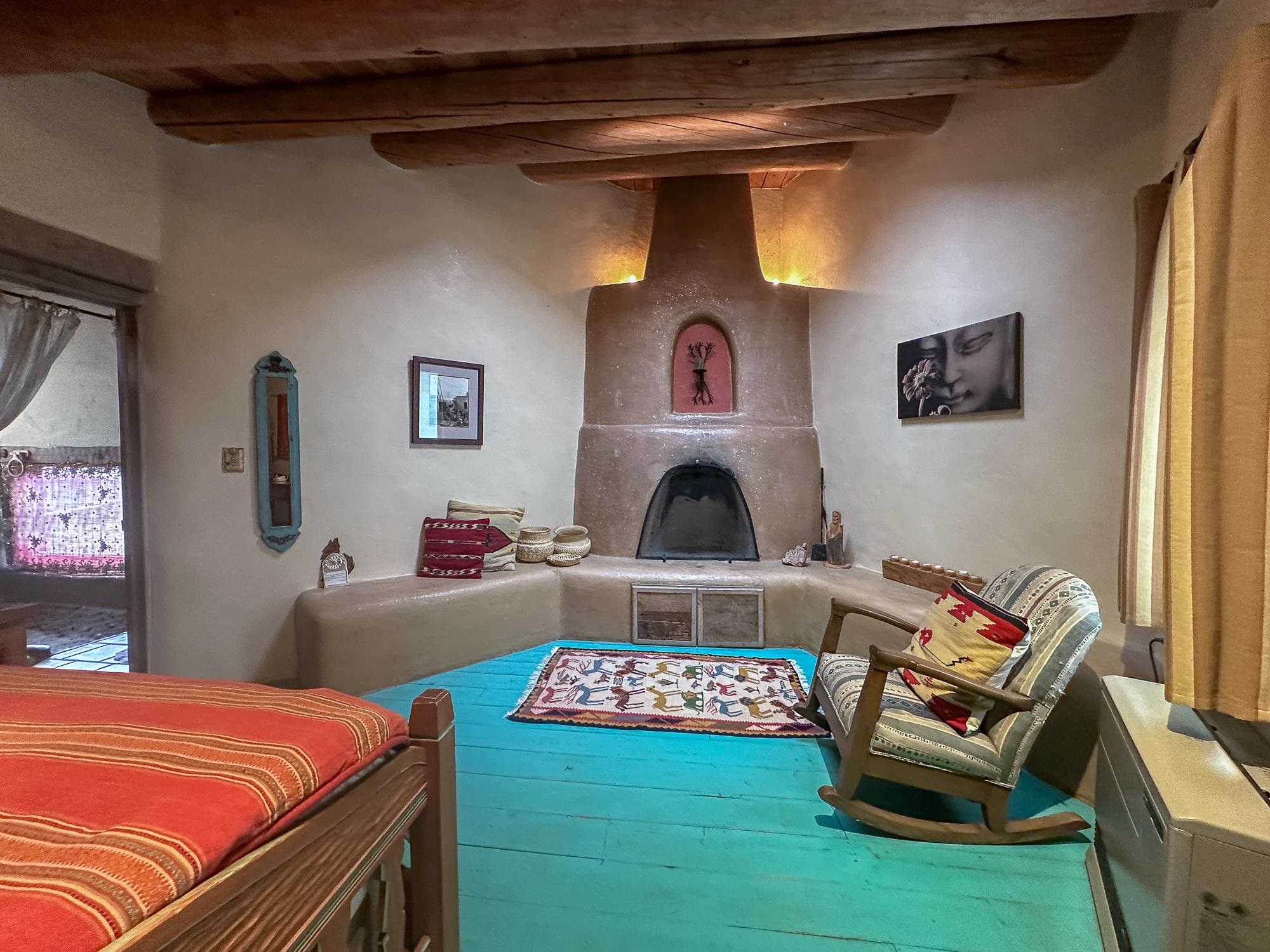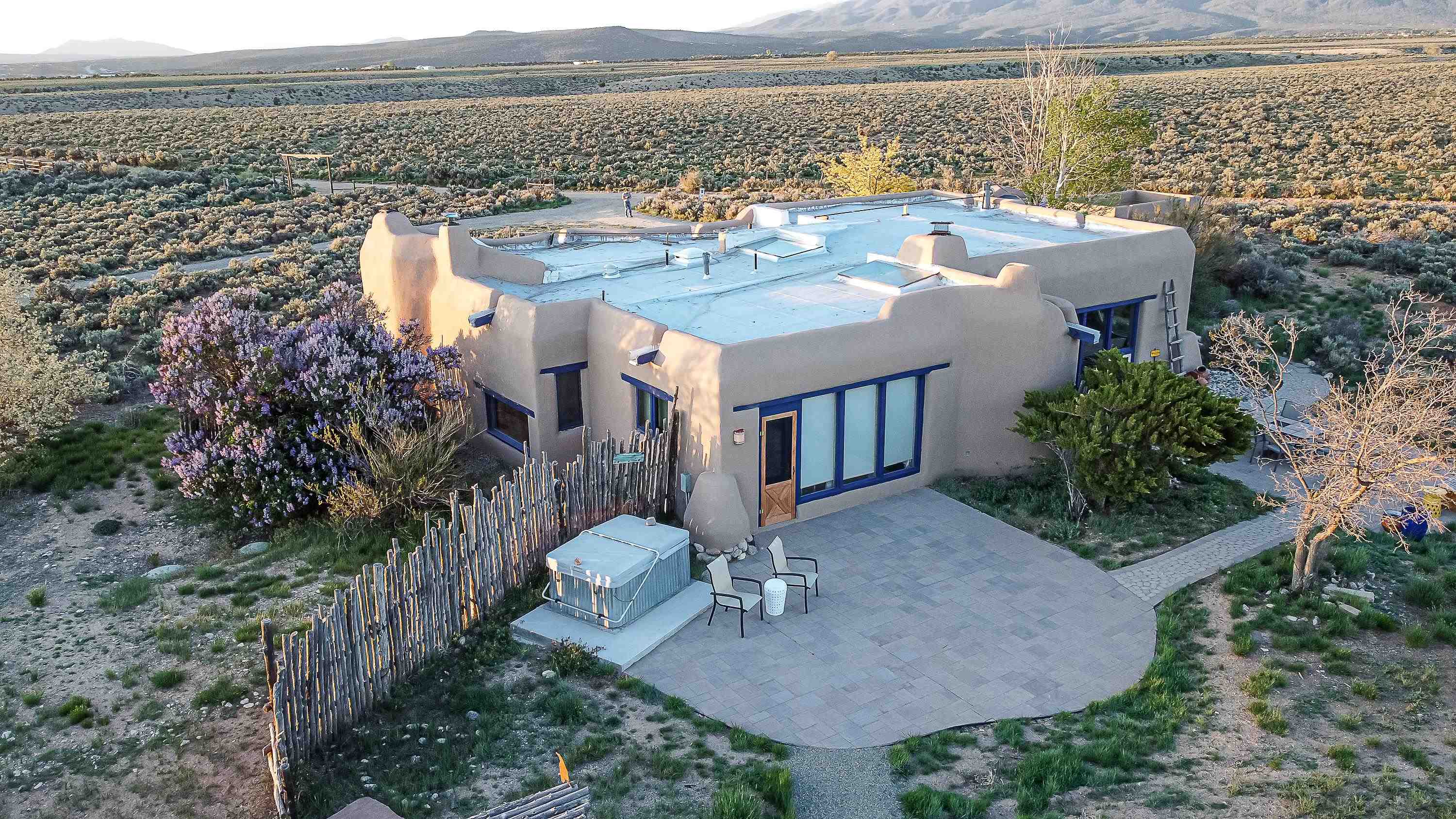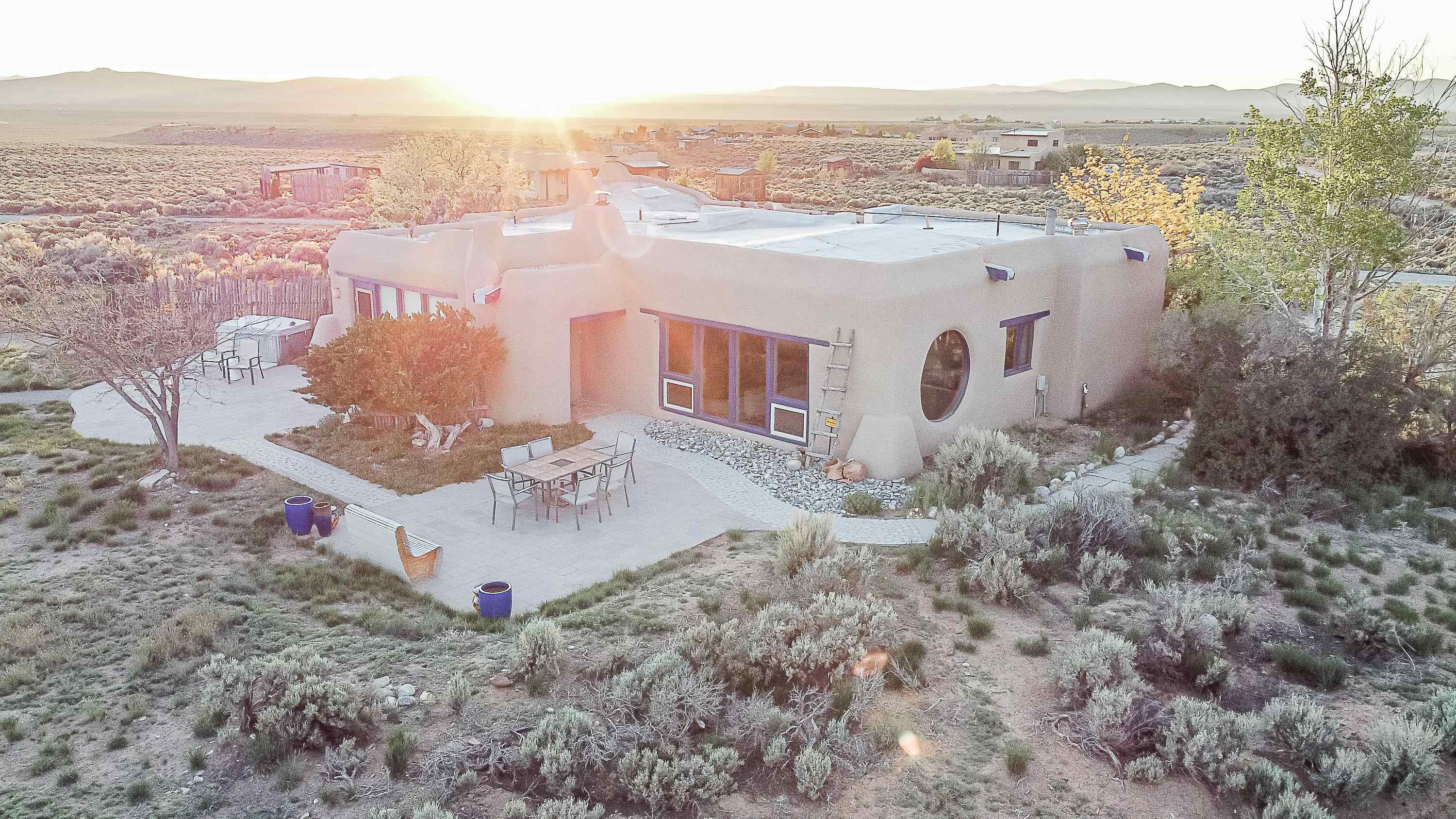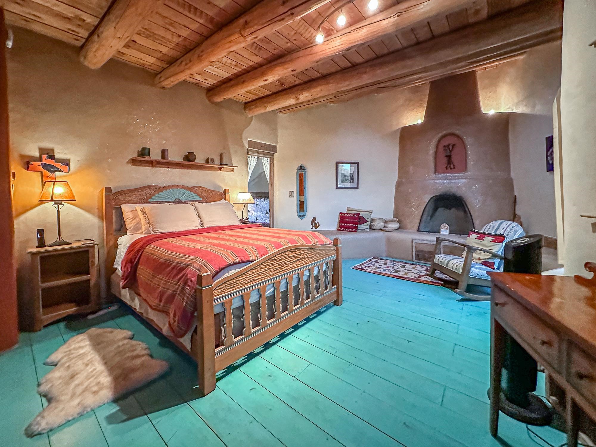 WELCOME TO ADOBE DE ARTISTA -- Where art, charm, and investment potential converge under the big Taos sky. Looking for a turn-key property with serious short-term rental mojo? This one’s got it! A guest favorite for years, Adobe de Artista boasts a loyal following of return visitors who just can’t get enough. Already in compliance with the new Taos County STR ordinance (though the permit isn’t transferable), the groundwork has been laid for smooth re-permitting. Furnishings? Let’s talk—available via separate bill of sale. High-speed fiber optic internet to keep remote life humming. This one-of-a-kind adobe is over 2,000 square feet of handcrafted soul. Designed and built by iconic Taos painter Ed Sandoval, the home is a sculptural blend of adobe, mica, straw, stone, and wood—an earthy, radiant, living work of art. Set on 1.25 acres and bordering Pueblo land, you’ll never lose sight of the mountains or the peace. Step inside and you’re wrapped in the soft curves and textures of classic Taos style: plaster walls, vigas, hand-troweled tile, and light-filled spaces. One of two living rooms features a sunken lounge, banco seating, and a traditional southwest style fireplace perfect for cozy nights in. The open-concept main living space flows into a kitchen with custom cabinets and a dining area where a massive round window perfectly frames the Sangre de Cristos. The primary bedroom is generous, serene, and romantic—featuring painted plank floors, a walk-in closet, and a second stunning fireplace with mica shimmer. The en suite bath? Think river rock shower + tiny fireplace = spa-like bliss. The second bedroom is sunny and opens to a private patio, with its own en suite bath for guests or renters. A third full bath and laundry closet complete the layout. Outside, you’ll find multiple patios, shady spots, and stargazing nooks—plus a hot tub made for soaking under the Milky Way. There’s also a carport and gear storage for your skis, bikes, or fly rods. Just 20 minutes to Taos Plaza and 25 to the Ski Valley, this is more than a home—it’s a retreat, a vibe, and a smart investment all wrapped into one adobe masterpiece.