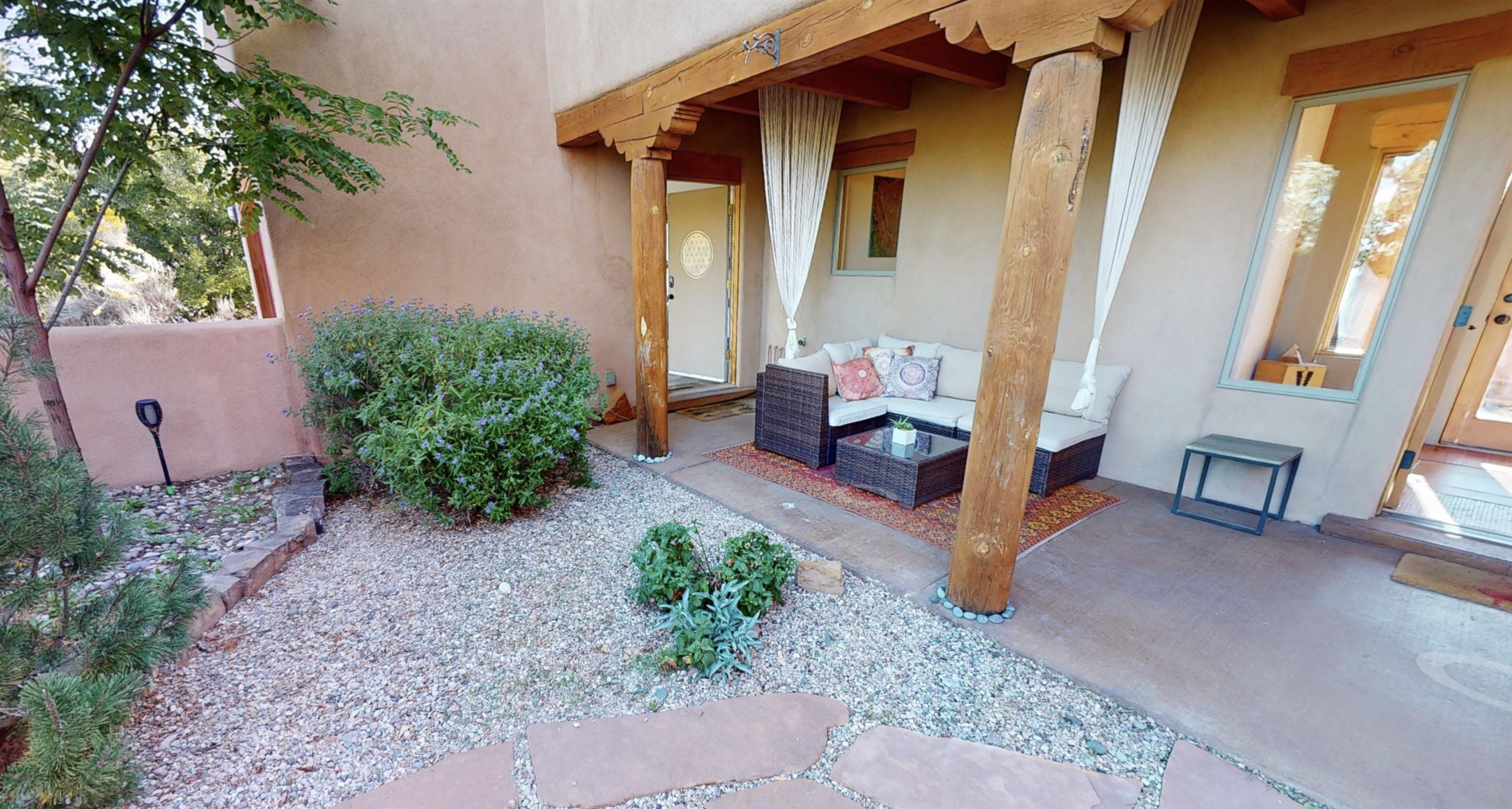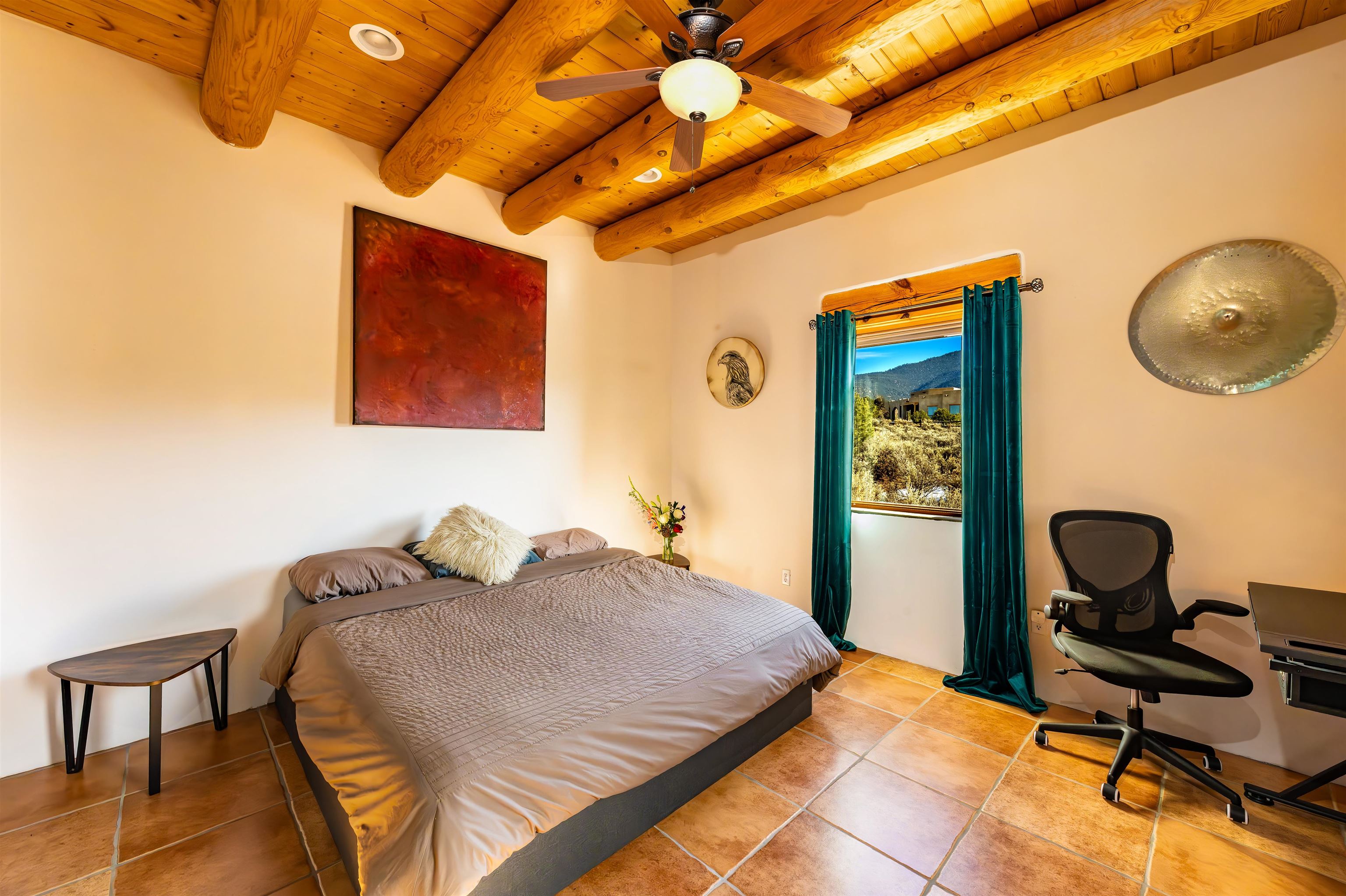 Beautiful, bright, turnkey single-level Pueblo-style home in the desirable Dos Arroyos neighborhood with breathtaking mountain views. Featuring 3 bedrooms, 2 baths, and 1,793 sq ft, this property combines traditional Taos charm with modern comfort. Spacious interiors showcase extra tall ceilings with exposed vigas and detailed woodwork throughout, complemented by 2 kiva fireplaces, and additional 255 sq ft sunny studio. Offers natural gas radiant floor heat throughout, a heated double garage, and custom kitchen cabinetry. Boasts a spa-like setting with cedar barrel sauna, outdoor shower, and salt water hot tub! Option for furnishings to convey via bill of sale upon buyers request. Fast fiberoptic internet. The home sits on a 0.25-acre lot , adjacent to an Open Space parcel which is protected. HOA includes irrigation and maintenance to the trees in the open space parcel and it ensures privacy and endless mountain views. There is easy access to hiking trails, Holy Cross Hospital, and Taos Plaza. Key Features: - 3 Bedrooms / 2 Bathrooms - 1,793 sq ft (approx.) - Lot: 0.25 acres / 10,802 sq ft, adjacent to Open Space parcel. - Year Built: 2007 - Natural Gas radiant floor heat - Attached 2-car radiant floor heated garage - Pueblo/Southwestern, single level - Hot Tub - Cedar Sauna - Xeriscape Landscaping with drip irrigation. Interior Highlights: - Soaring ceilings with exposed vigas & woodwork detail - Open floor plan with abundant natural light - Two kiva fireplaces (living room & master) - Tile flooring - Custom cabinetry & built-ins - Sunroom + covered portals for indoor/outdoor living - Fast fiberoptic internet - Stainless kitchen appliances Community: - Subdivision: Dos Arroyos - Low HOA Fee: Only $513/year (approx. $43/month) - Near Holy Cross Hospital & Dos Arroyos Trail system - 5 minutes to Taos Plaza