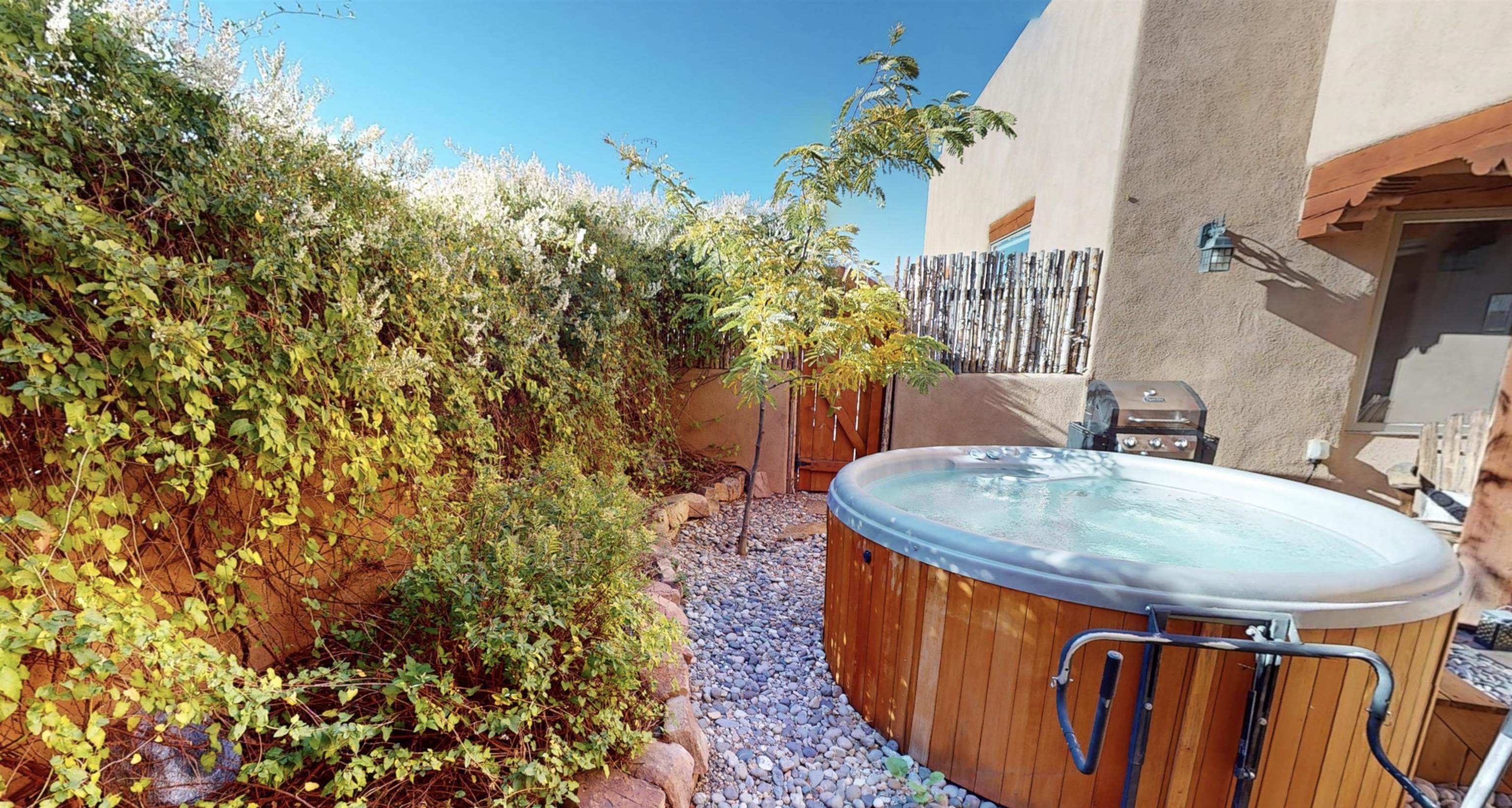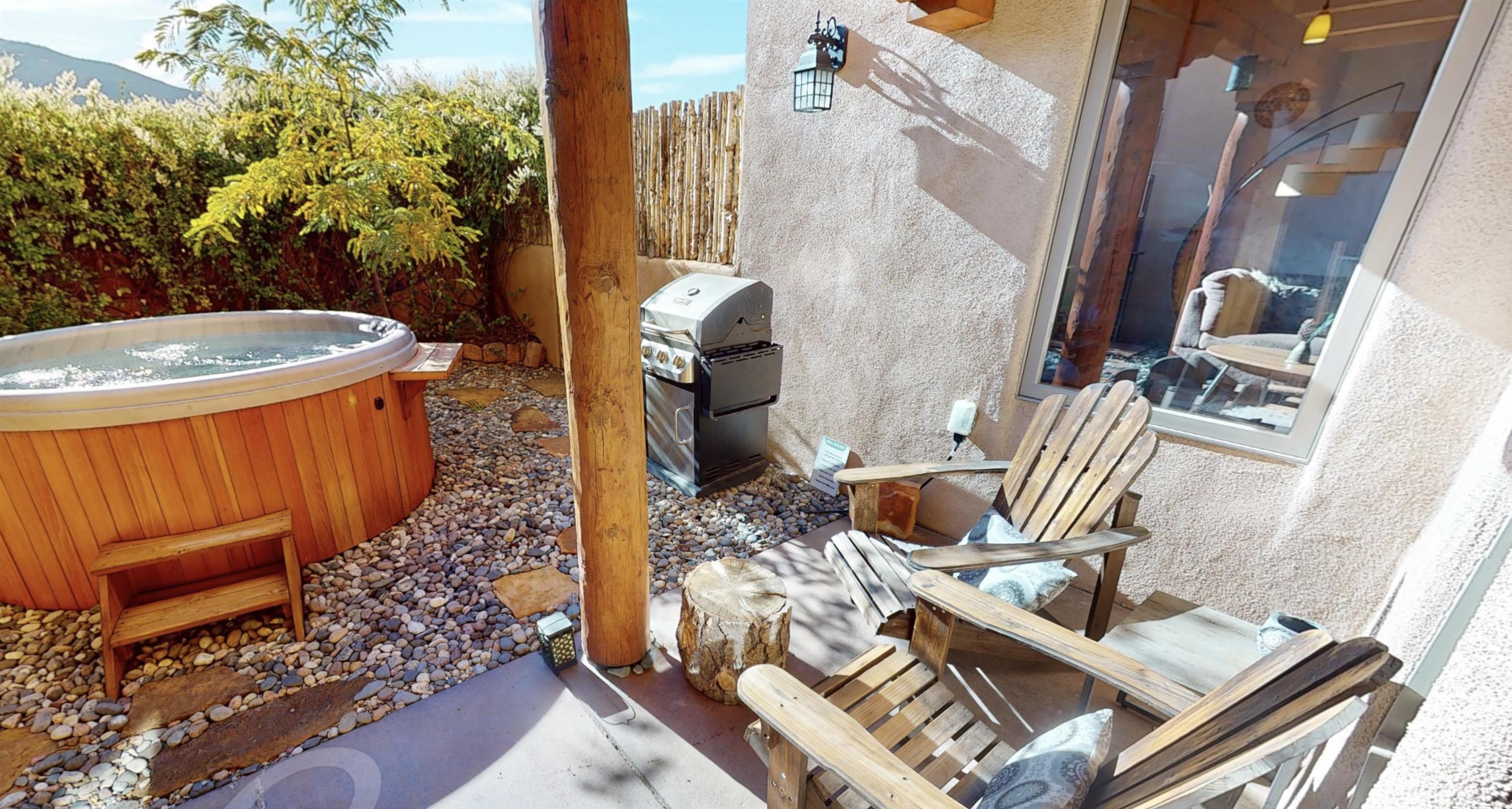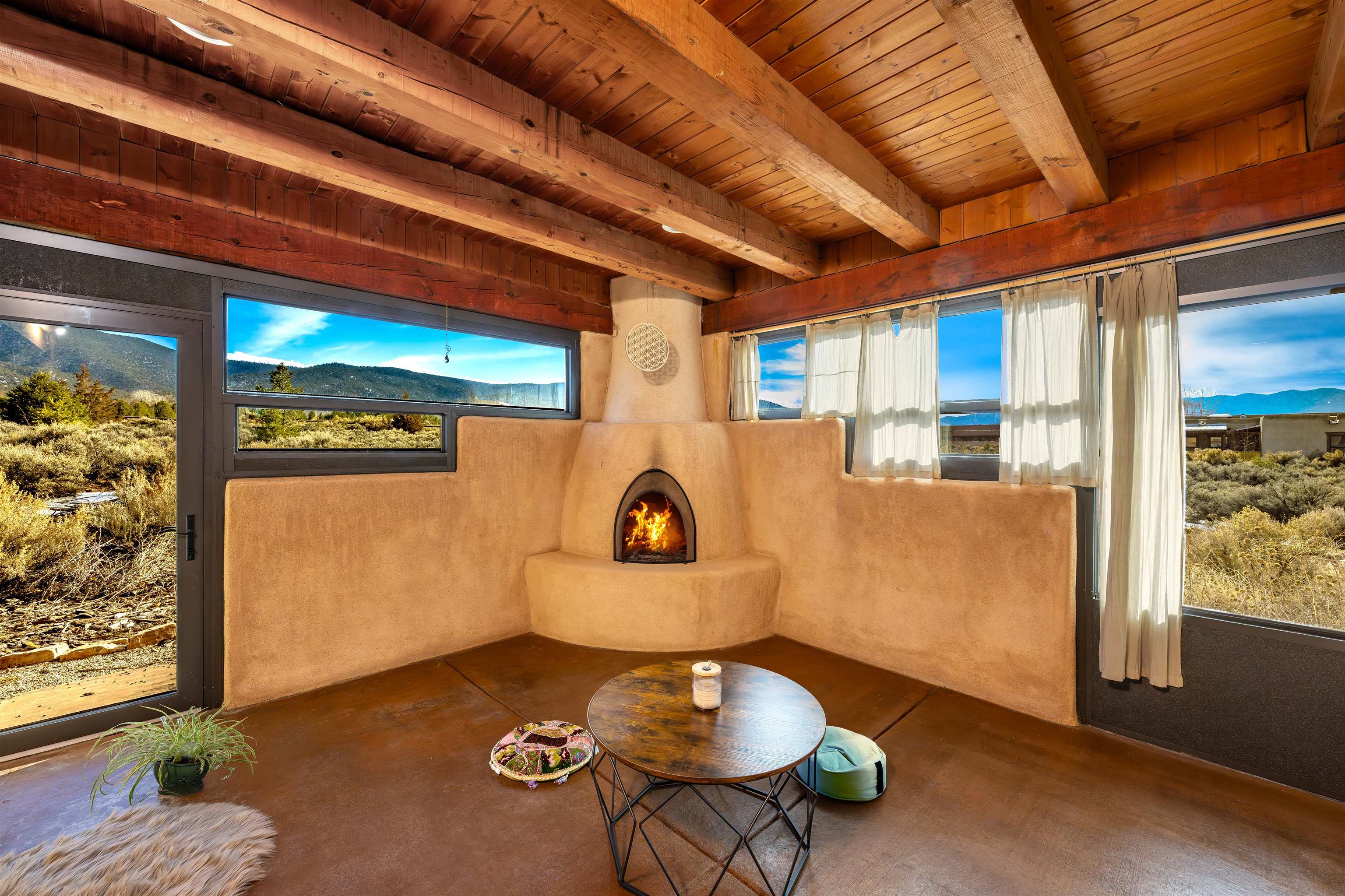 Beautiful, bright, turnkey single-level Pueblo-style home in the desirable Dos Arroyos neighborhood with breathtaking mountain views. Featuring 3 bedrooms, 2 baths, and 1,793 sq ft, this property combines traditional Taos charm with modern comfort. Spacious interiors showcase extra tall ceilings with exposed vigas and detailed woodwork throughout, complemented by 2 kiva fireplaces, and additional 255 sq ft sunny studio. Offers natural gas radiant floor heat throughout, a heated double garage, and custom kitchen cabinetry. Boasts a spa-like setting with cedar barrel sauna, outdoor shower, and salt water hot tub! Option for furnishings to convey via bill of sale upon buyers request. Fast fiberoptic internet. The home sits on a 0.25-acre lot , adjacent to an Open Space parcel which is protected. HOA includes irrigation and maintenance to the trees in the open space parcel and it ensures privacy and endless mountain views. There is easy access to hiking trails, Holy Cross Hospital, and Taos Plaza. 3D Tour Link: https://my.matterport.com/show/?m=fRKLUUkGLQX&mls=1 Key Features: - 3 Bedrooms / 2 Bathrooms; - 1,793 sq ft (approx.); - Lot: 0.25 acres / 10,802 sq ft, adjacent to Open Space parcel; - Year Built: 2007; - Natural Gas radiant floor heat; - Attached 2-car radiant floor heated garage; - Pueblo/Southwestern, single level ; - Hot Tub; - Cedar Sauna ; - Xeriscape Landscaping with drip irrigation; Interior Highlights: - Soaring ceilings with exposed vigas & woodwork detail ; - Open floor plan with abundant natural light; - Two kiva fireplaces (living room & master); - Tile flooring; - Custom cabinetry & built-ins; - Sunroom + covered portals for indoor/outdoor living; - Fast fiberoptic internet ; - Stainless kitchen appliances; Community: - Subdivision: Dos Arroyos; - Low HOA Fee: Only $513/year (approx. $43/month); - Near Holy Cross Hospital & Dos Arroyos Trail system - 5 minutes to Taos Plaza.