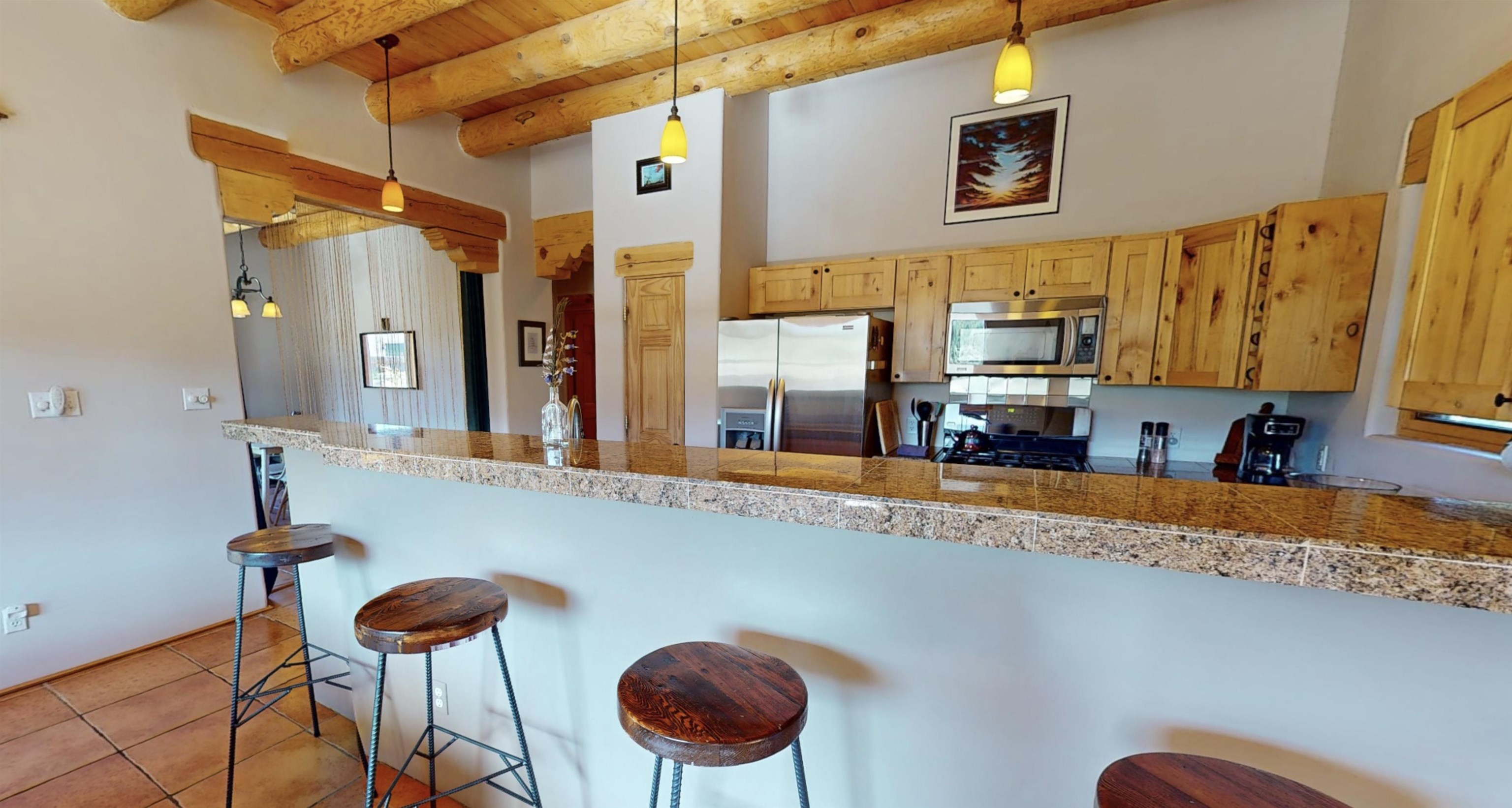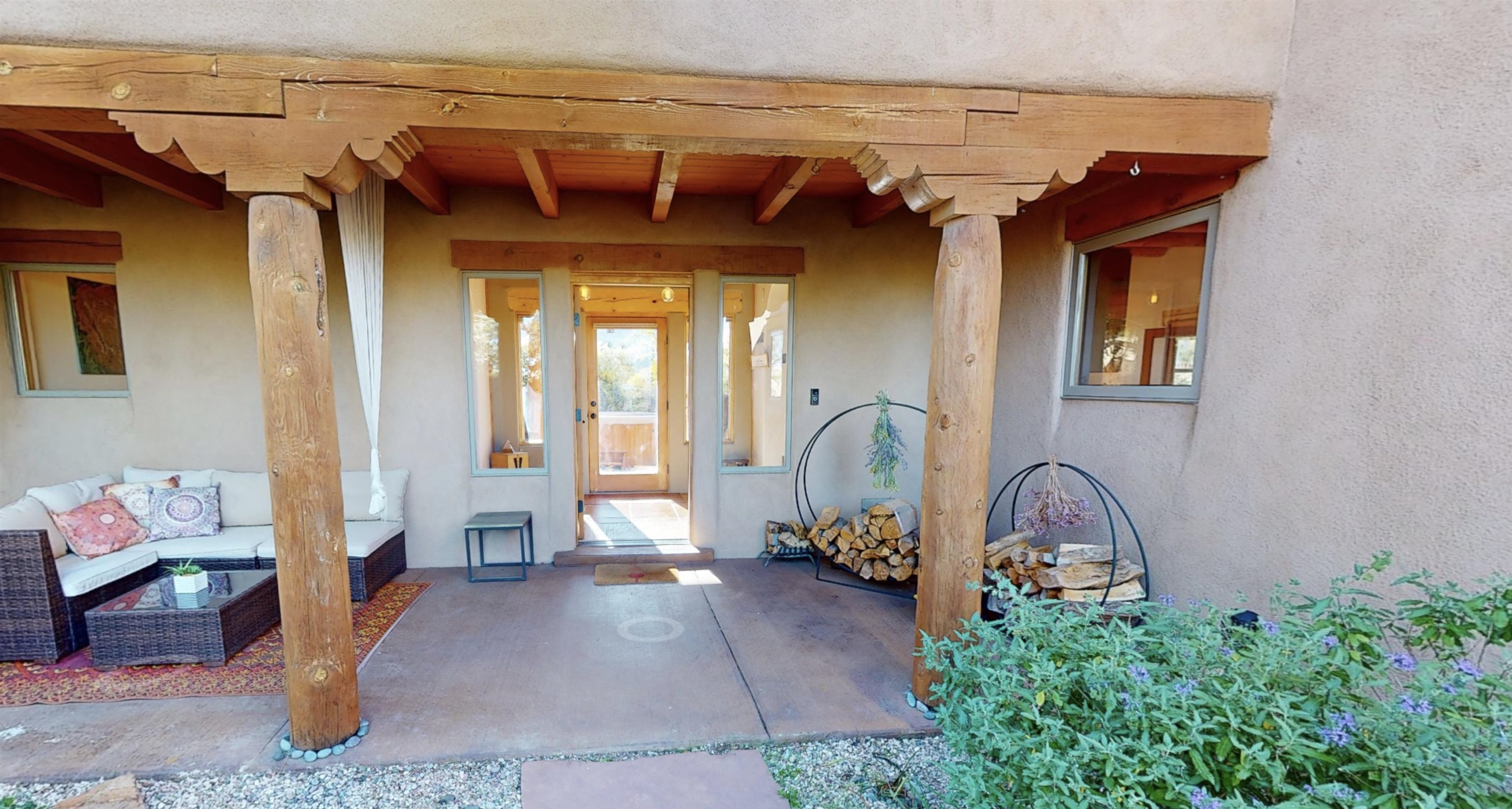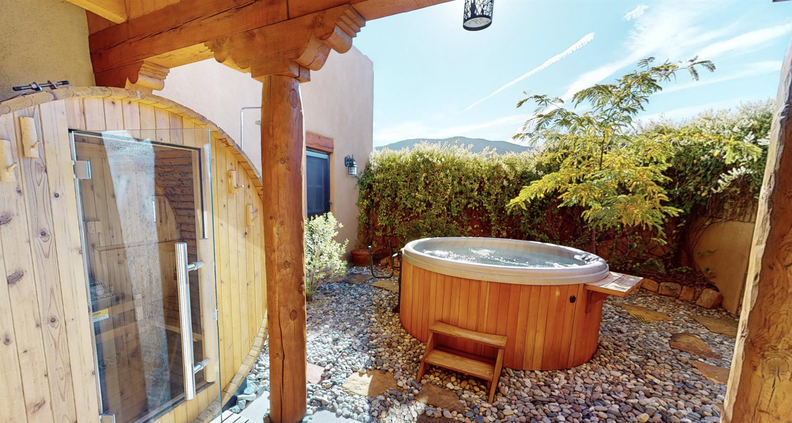 Beautiful, bright, turnkey single-level Pueblo-style home in the desirable Dos Arroyos neighborhood with breathtaking mountain views. Featuring 3 bedrooms, 2 baths, and 1,793 sq ft, this property combines traditional Taos charm with modern comfort. Spacious interiors showcase extra tall ceilings with exposed vigas and detailed woodwork throughout, complemented by 2 kiva fireplaces, and additional 255 sq ft sunny studio. Offers natural gas radiant floor heat throughout, a heated double garage, and custom kitchen cabinetry. Boasts a spa-like setting with cedar barrel sauna, outdoor shower, and salt water hot tub! Option for furnishings to convey via bill of sale upon buyers request. Fast fiberoptic internet. The home sits on a 0.25-acre lot , adjacent to an Open Space parcel which is protected. HOA includes irrigation and maintenance to the trees in the open space parcel and it ensures privacy and endless mountain views. There is easy access to hiking trails, Holy Cross Hospital, and Taos Plaza. 3D Tour Link: https://my.matterport.com/show/?m=fRKLUUkGLQX&mls=1 Key Features: - 3 Bedrooms / 2 Bathrooms; - 1,793 sq ft (approx.); - Lot: 0.25 acres / 10,802 sq ft, adjacent to Open Space parcel; - Year Built: 2007; - Natural Gas radiant floor heat; - Attached 2-car radiant floor heated garage; - Pueblo/Southwestern, single level ; - Hot Tub; - Cedar Sauna ; - Xeriscape Landscaping with drip irrigation; Interior Highlights: - Soaring ceilings with exposed vigas & woodwork detail ; - Open floor plan with abundant natural light; - Two kiva fireplaces (living room & master); - Tile flooring; - Custom cabinetry & built-ins; - Sunroom + covered portals for indoor/outdoor living; - Fast fiberoptic internet ; - Stainless kitchen appliances; Community: - Subdivision: Dos Arroyos; - Low HOA Fee: Only $513/year (approx. $43/month); - Near Holy Cross Hospital & Dos Arroyos Trail system - 5 minutes to Taos Plaza.