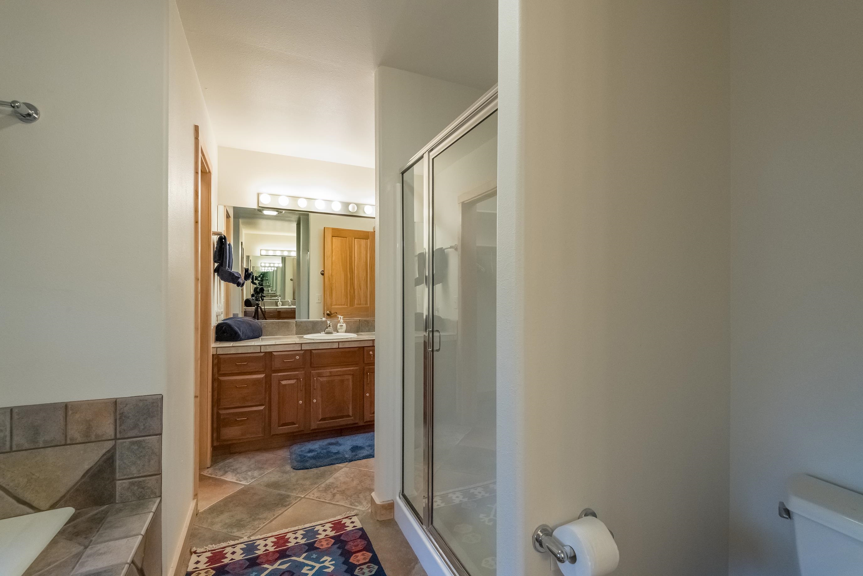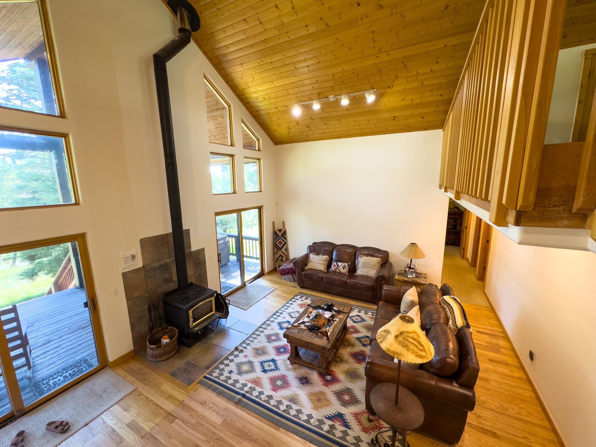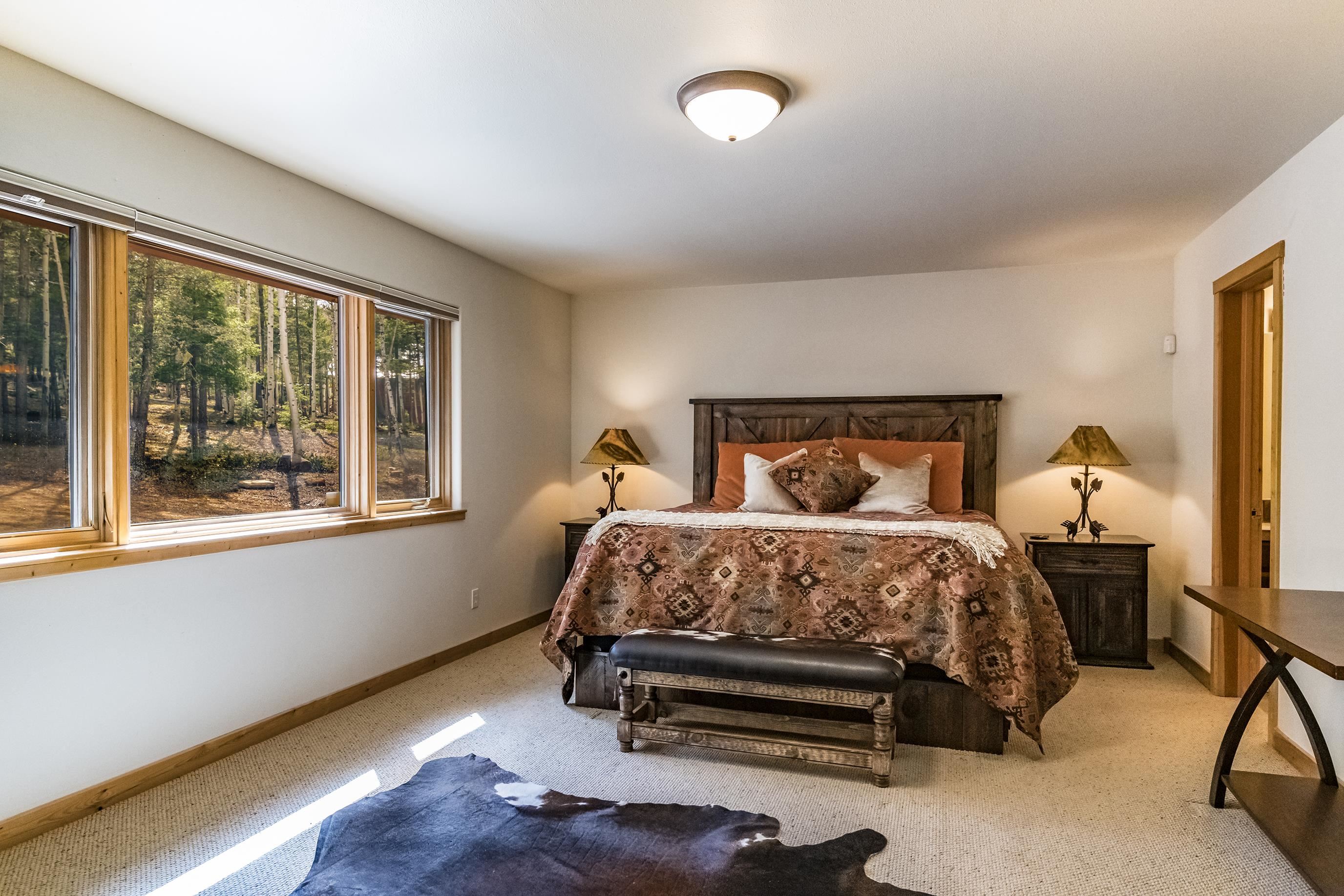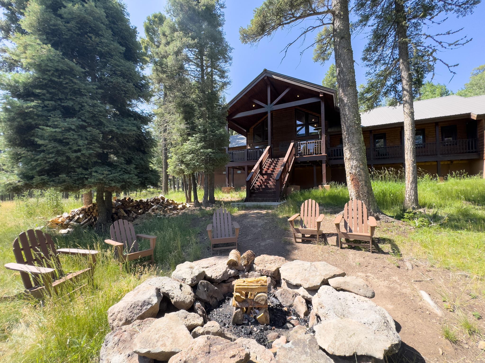 Tucked away in the pines less than 10 minutes from the slopes and Angel Fire Village center, this 4-bedroom, 2-bathroom home offers a true mountain retreat. The living room is warmed by a wood stove and opens to a spacious deck that looks out into the trees, with a fire pit just below. The primary bedroom includes a walk-in closet, two vanities, a soaking tub, and a separate shower. With four bedrooms on the main floor, plus a large loft upstairs, this home offers a quiet setting with everything you need close by.