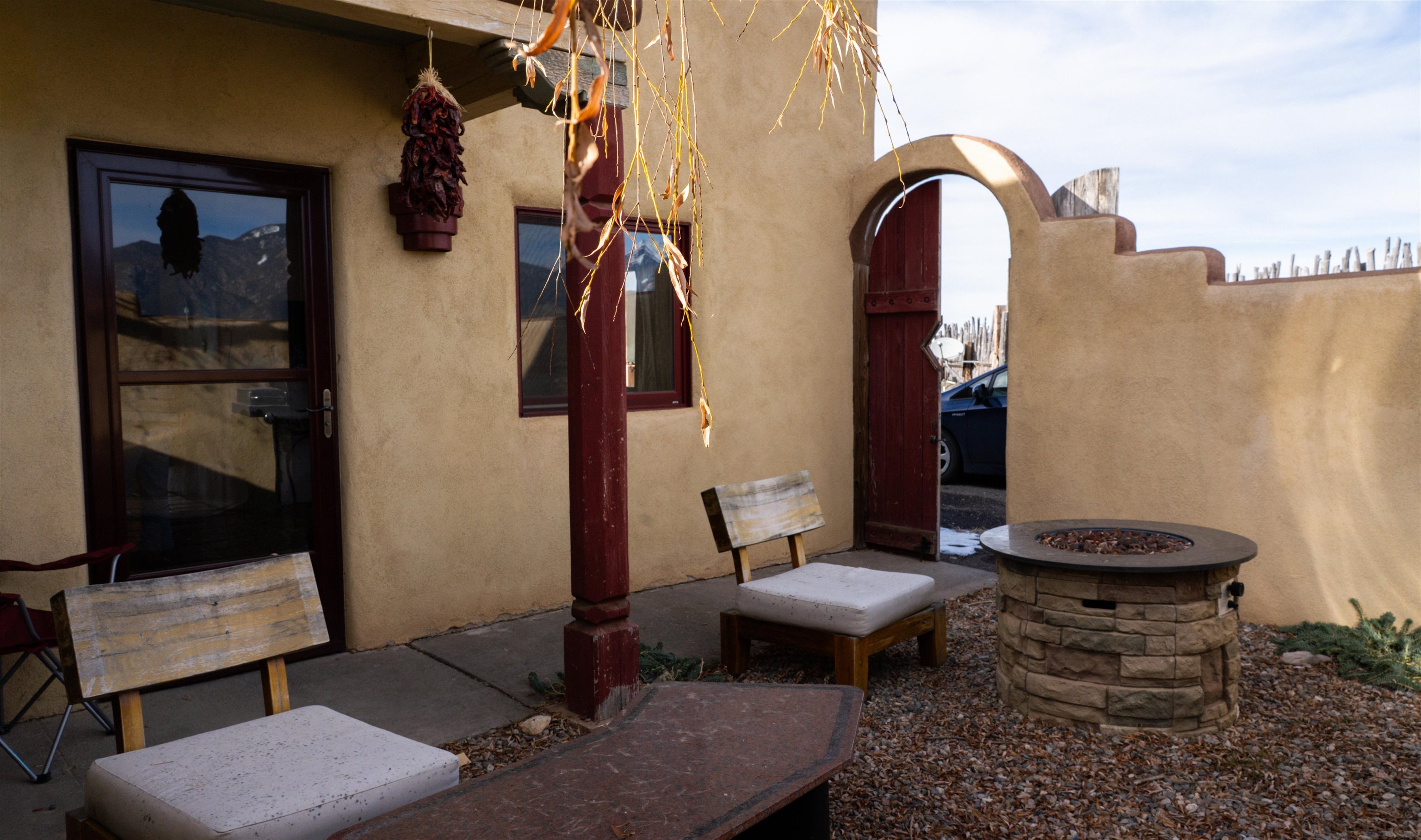 Conveniently located in El Prado, only 13 miles from Taos Ski Valley, and approximately 5 miles from Taos Plaza, this recently remodeled one-bedroom, one-bath end-unit condominium offers an ideal opportunity for a full-time residence, part-time Taos retreat, or income-producing property. The end-unit design features four concrete block walls creating excellent insulation and a strong noise barrier from the road and neighboring units. This particular unit has two of its own parking spaces next to the unit, separate from the remaining units parking spaces, along with a 10x20 garage with electric service, with an insulated ceiling, and a concrete block west wall. The garage is electrified and has previously been rented on a monthly basis, offering added flexibility and potential income. The interior includes plaster-finished walls, three ceiling fans with lights, and an efficient floor plan with abundant natural light throughout. Heating and cooling are well-supported with two heat-pump mini-splits, electric baseboard heat, and a Jøtul propane stove in the living area capable of heating the entire condo and operating without power during outages. The unit has its own individual propane tank, not shared with other units. A generator system powers the water supply during power outages, adding reliability and peace of mind. Recent 2025 updates include a complete bathroom remodel, installation of heat-pump mini-splits with separate compressor units for each room, replacement of the hot water tank with an instant propane Rinnai system designed for altitude, new appliances including washer/dryer, refrigerator, stove/oven, and water heater, upgraded electrical panel capacity, and replacement of both exterior doors with energy-efficient doors for improved heat and sound control. The condominium association has also recently updated the shared septic system. Enjoy immaculate western views of the mesa, San Antonio Mountain, and stunning Taos sunsets. The property is bordered on the west by undeveloped Taos Pueblo land, providing a rare sense of openness and privacy. Outdoor living includes a fully enclosed front patio and a partially walled rear deck. Personal Garden space along the front exterior wall, and shared garden space with 4' x 4' Wicking Beds. Easy access to all that the Taos area offers completes this well-maintained and thoughtfully updated property.