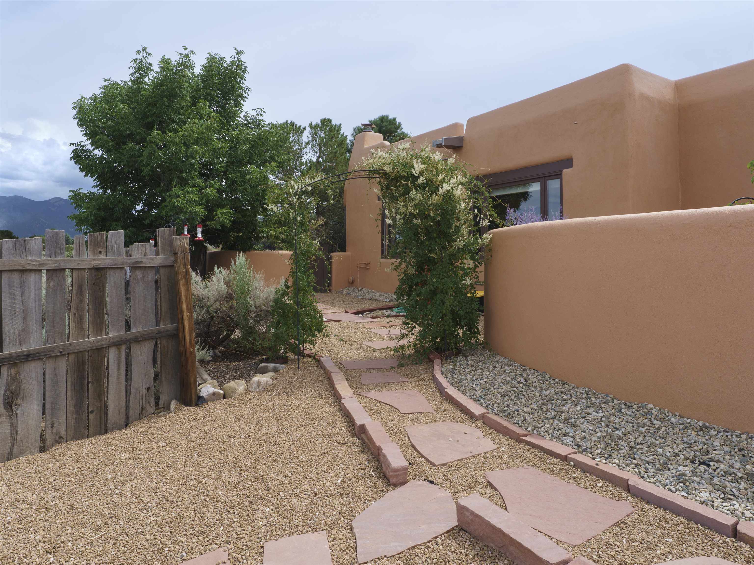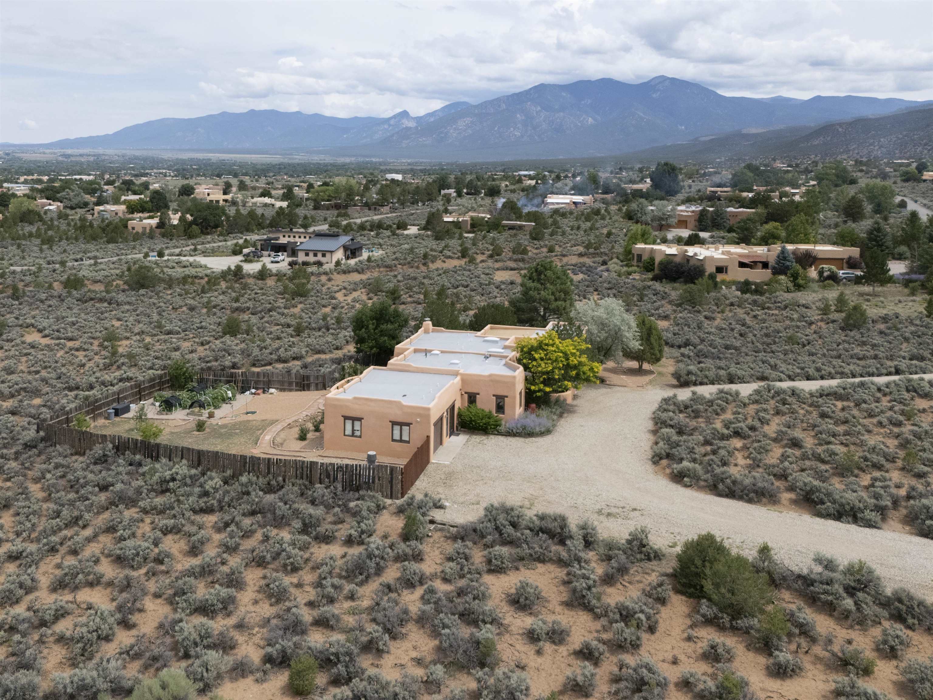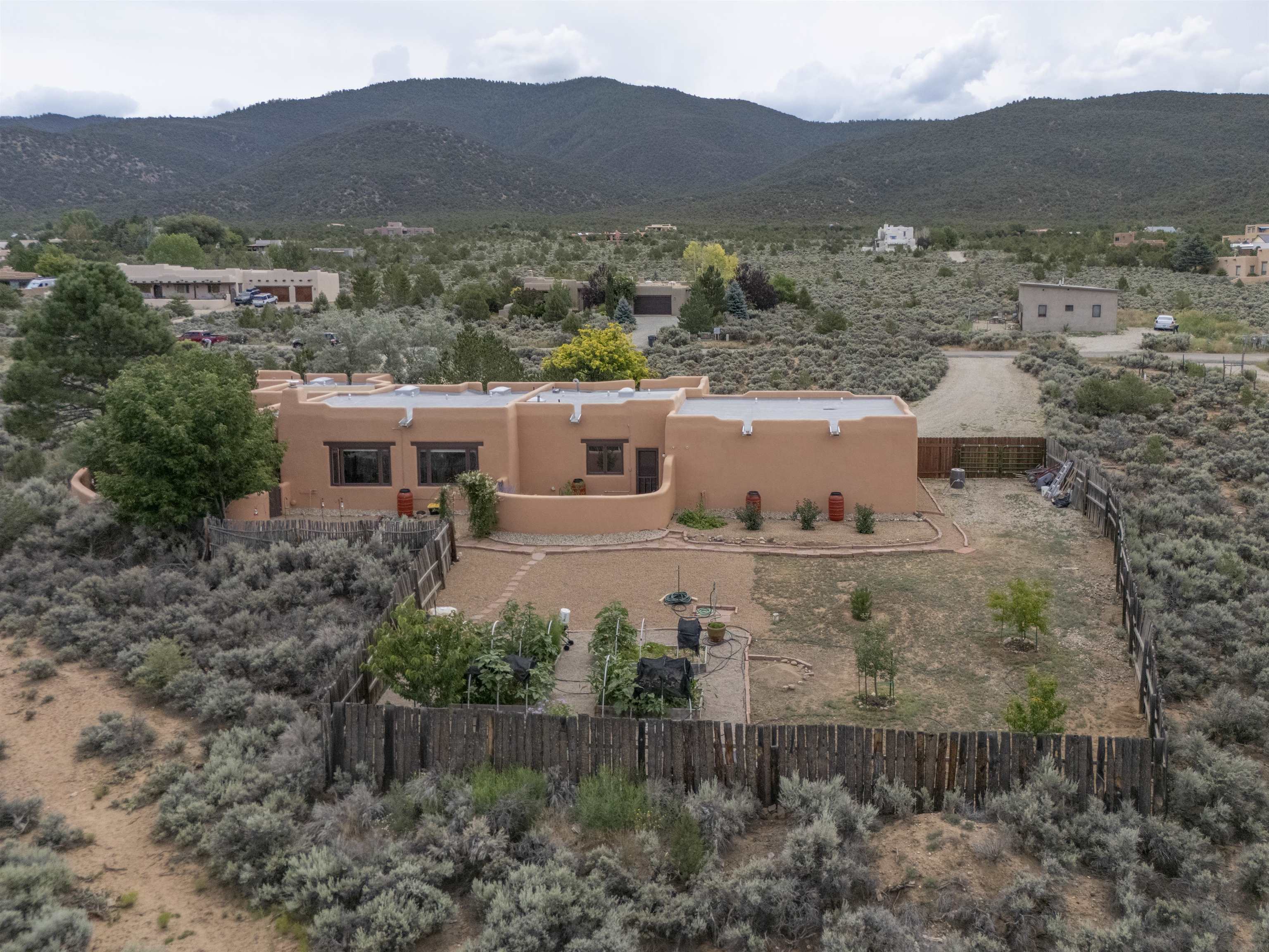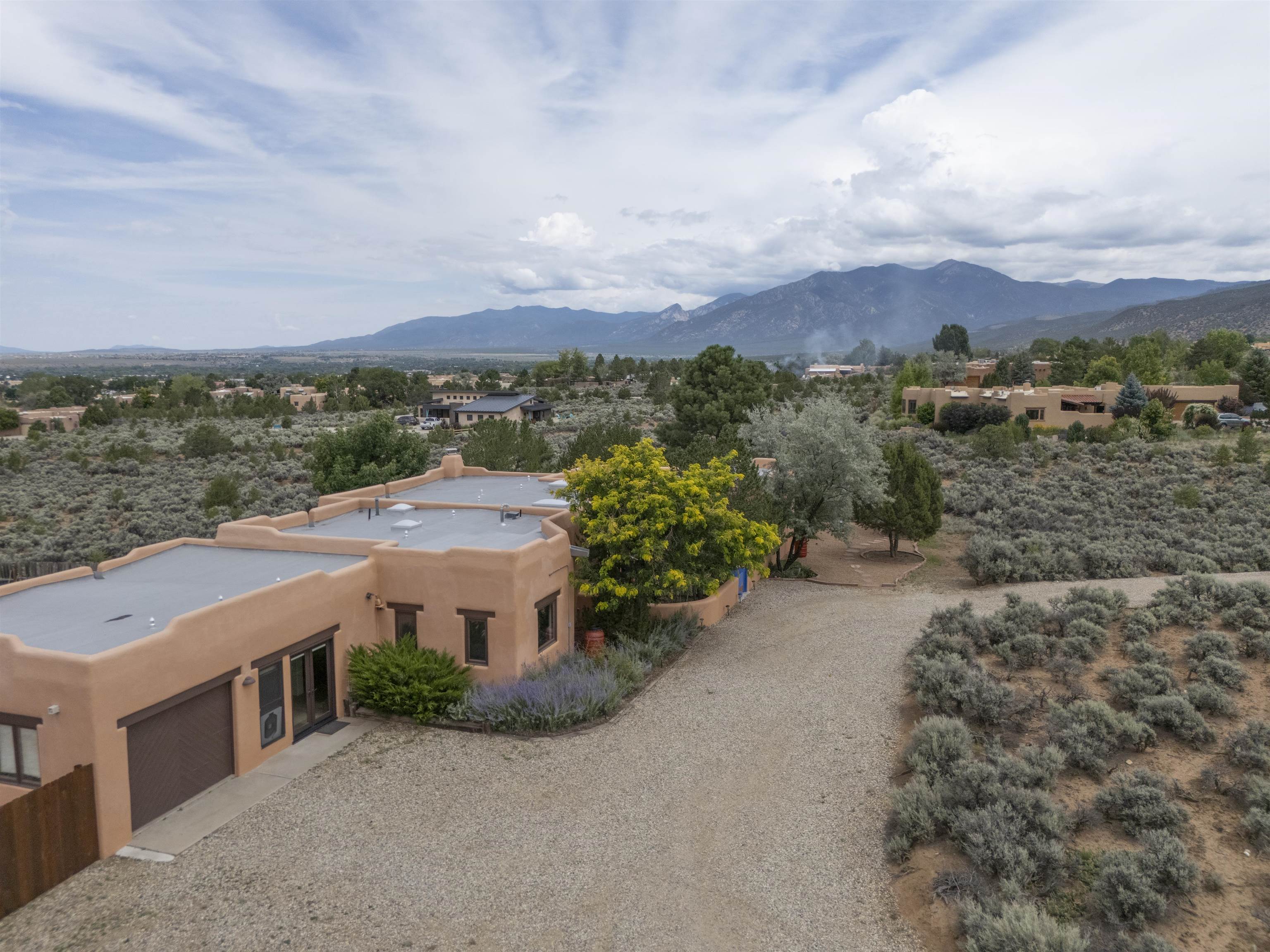 Gorgeous views just minutes from the Town of Taos. Located in the desirable Weimer neighborhood, this lovingly renovated adobe home has 2350 square feet of well thought out living space. The home is very private and has wonderful gardens, patios, trees, and sits on 1.27 acres. A very welcoming living/dining area faces west and offers wonderful sunset viewing. The kitchen has been fully renovated with new knotty cherry cabinets, new appliances (Bosch stove, dishwasher and refrigerator, new back splash, quartz countertops, new farm sink and under cabinet lighting. The primary bedroom is large and light. The bathroom and closet are spacious. The two guestrooms are good sized and share a sweet bathroom. One bay of the garage has been converted into a great media room/office/craft room which has a separate entrance. The one car garage has a level 2 Electric car charger. The exterior spaces add so much functional living space to an already generous sized house. Fruit trees and vegetable gardens are producing great home grown groceries. A new well pump, ceiling fans, yard hydrants and so many more improvements, make this home move-in ready. Escape city life with glorious starry night skies and close proximity to many outdoor adventures. Come and see this wonderful home . Close to town and yet so private.