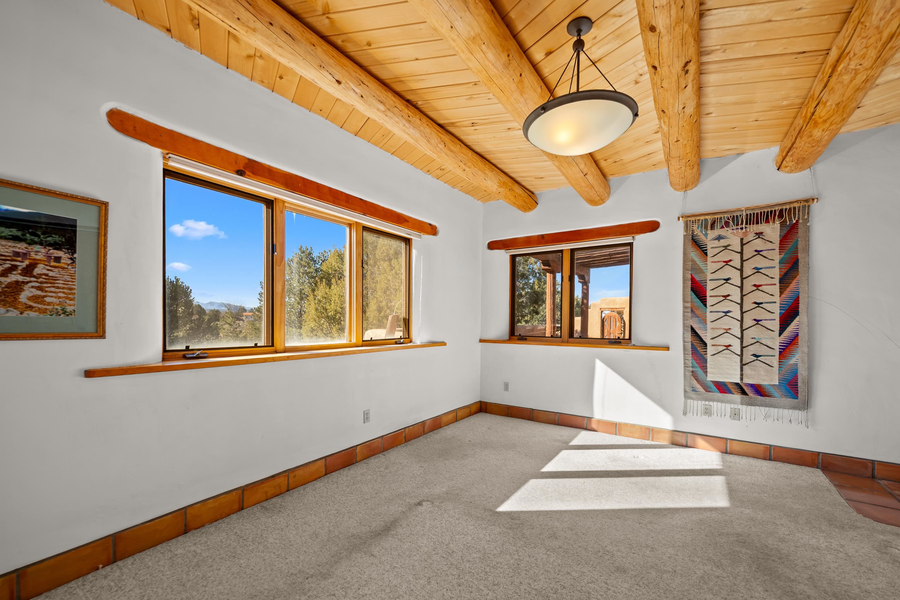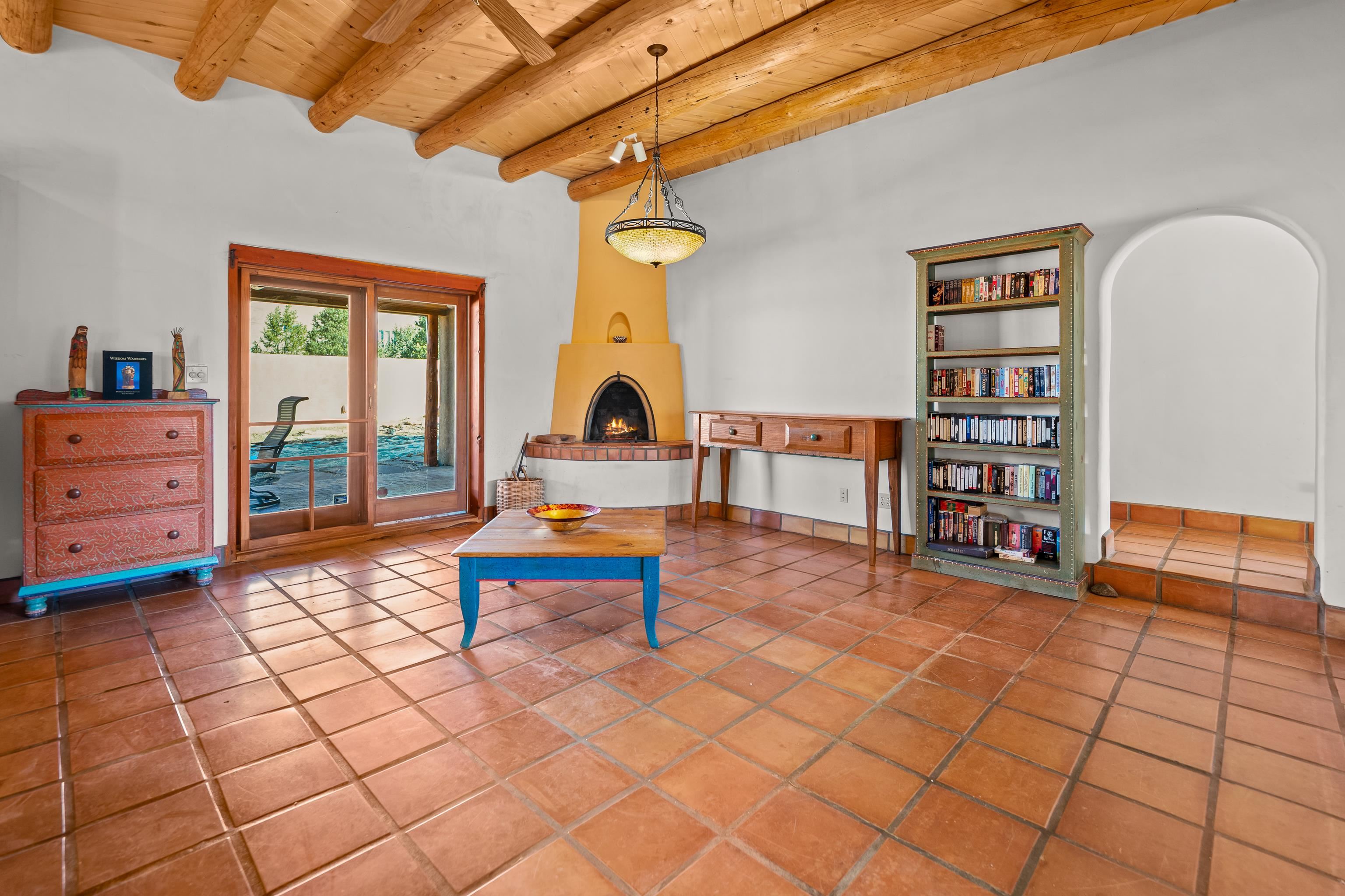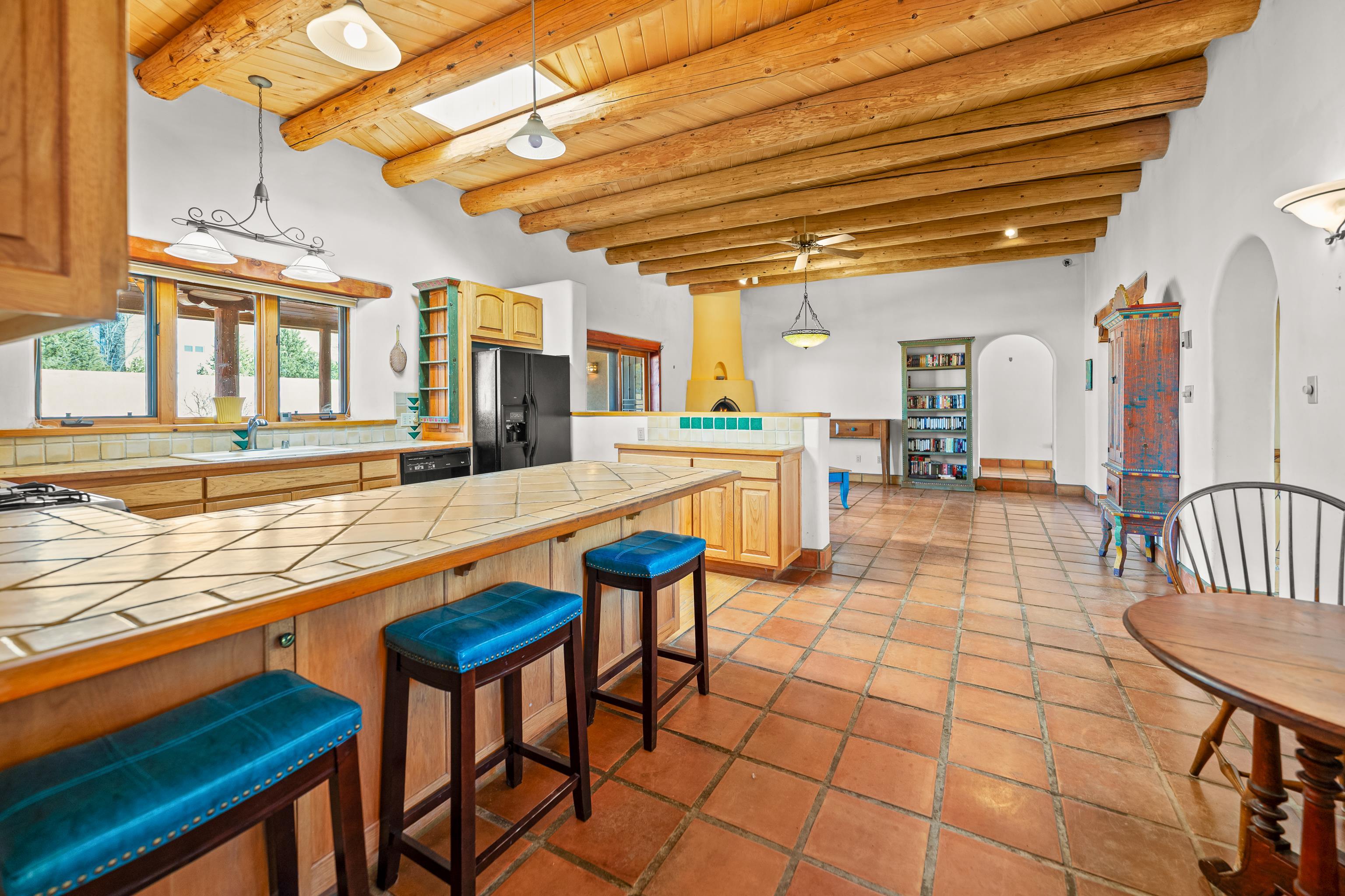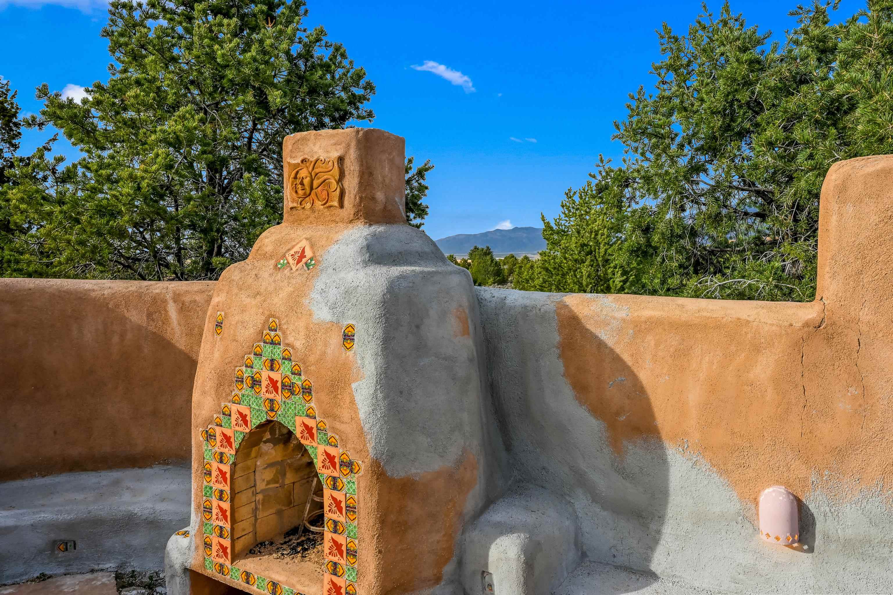 Southwest-style home offering classic New Mexico character with warm wood accents and flexible living spaces. Exposed vigas and wood-plank ceilings create architectural interest throughout, complemented by saltillo tile and carpeted areas for comfort. The open living and dining areas are anchored by a traditional kiva fireplace, providing a cozy focal point and seamless flow for everyday living or entertaining. The kitchen features custom wood cabinetry, tiled countertops, a center island with seating, and abundant natural light. Bedrooms are generously sized with wood-beamed ceilings and ample closet space. Bathrooms include colorful tile accents and well-laid-out vanities. A dedicated laundry/mechanical room adds functionality. Additional highlights include an attached garage/workshop space with storage potential, multiple exterior access points, and a classic adobe-style exterior set against a scenic Northern New Mexico backdrop. This property offers a solid foundation for a primary residence, second home, or creative retreat.