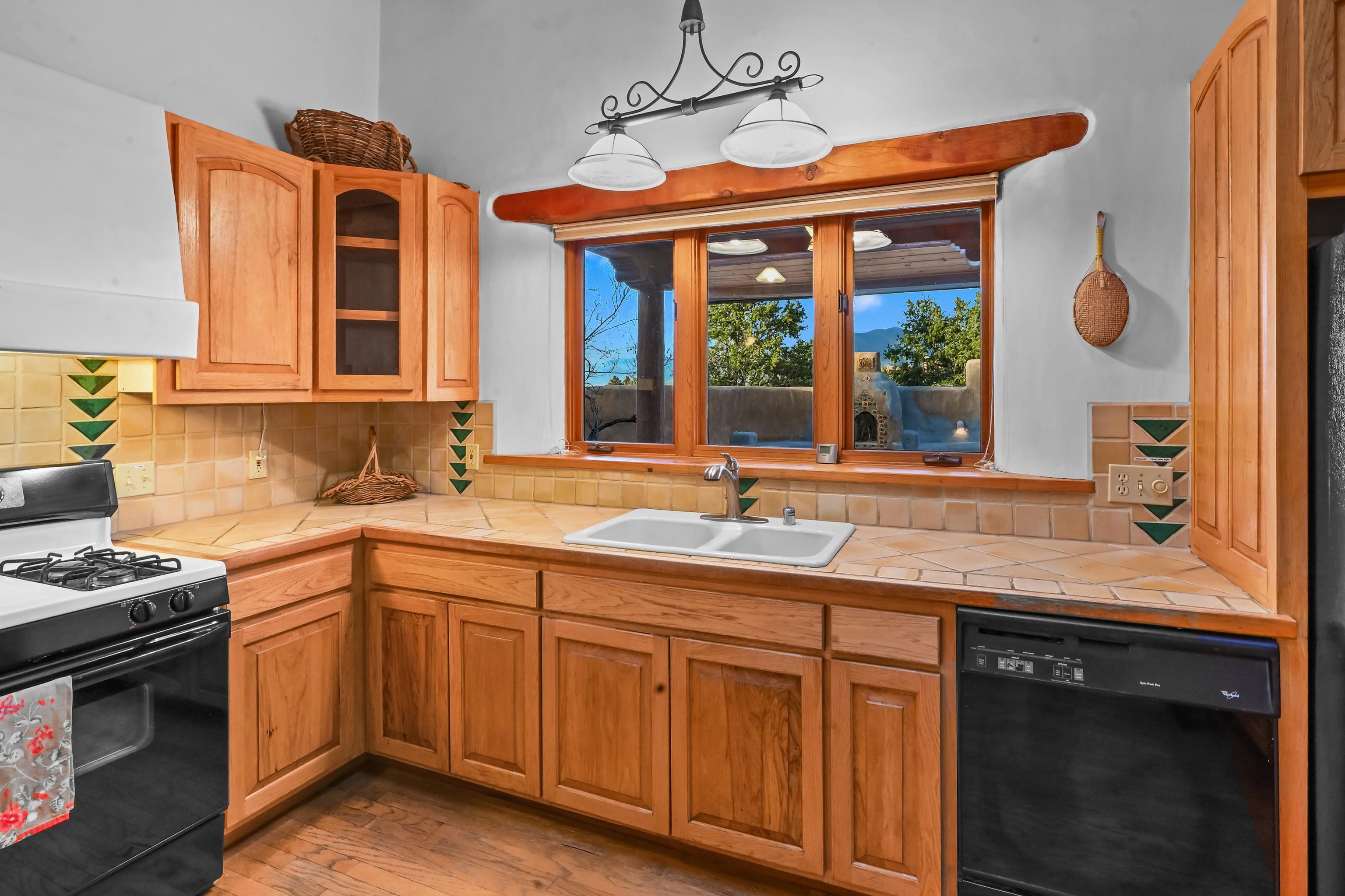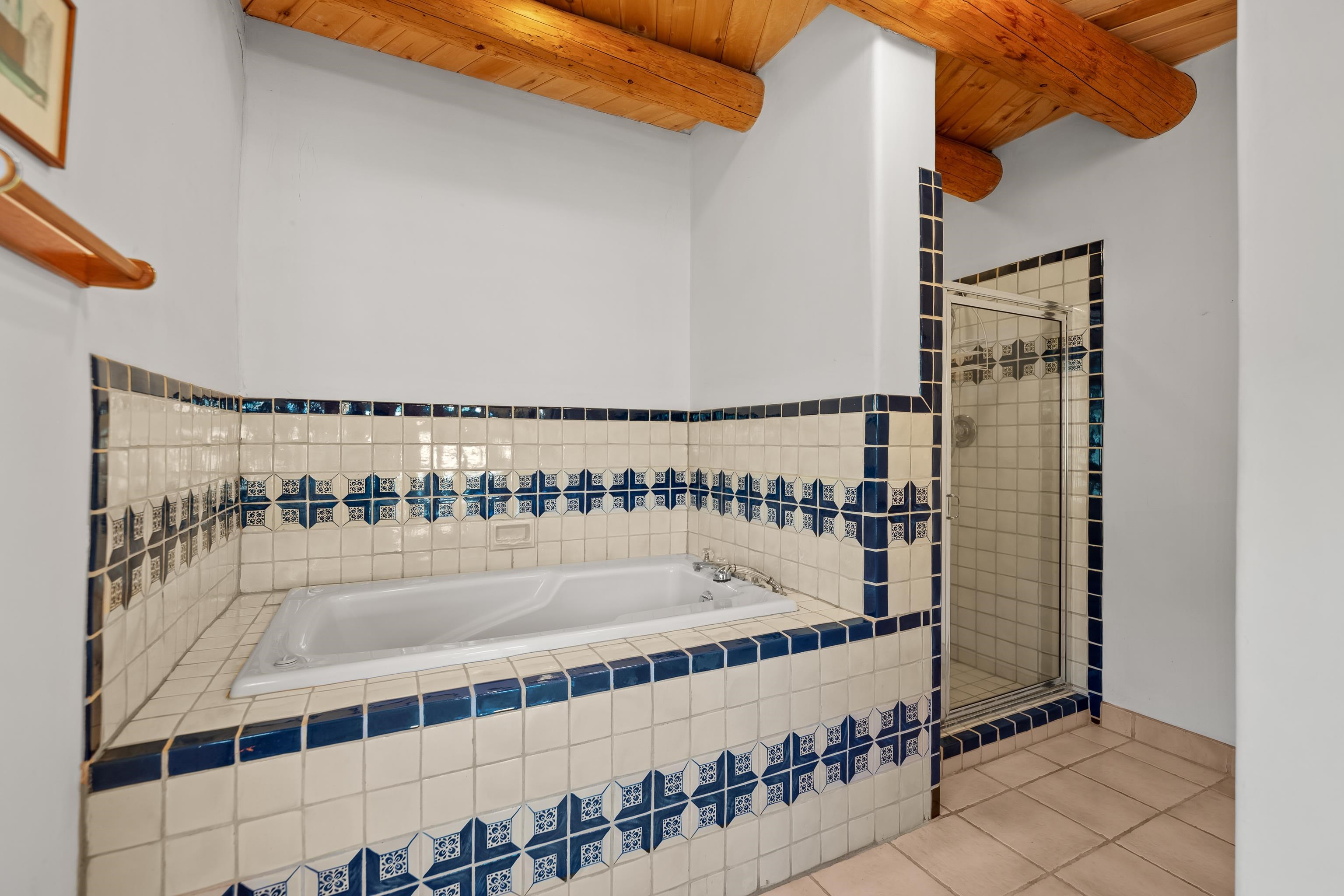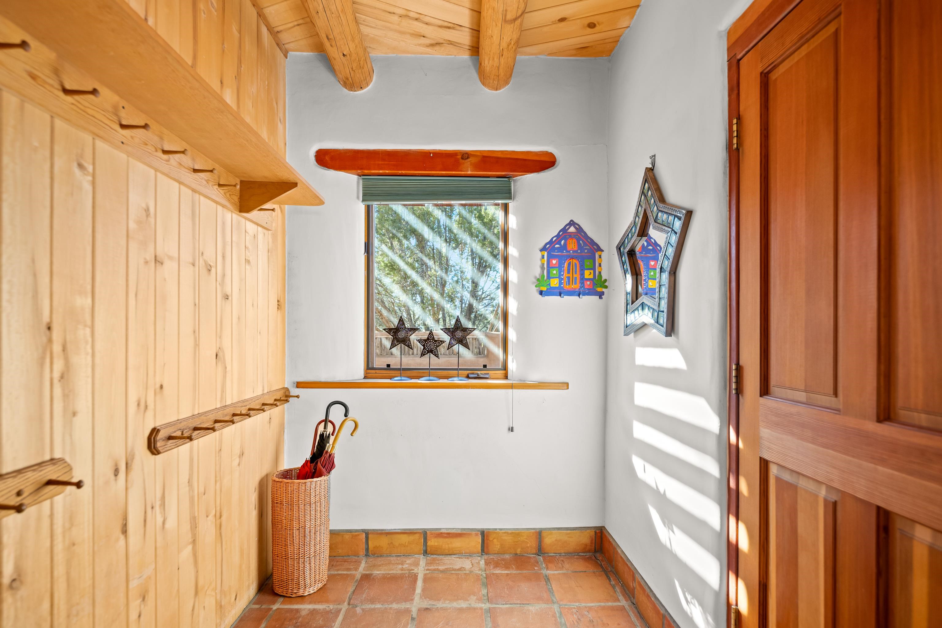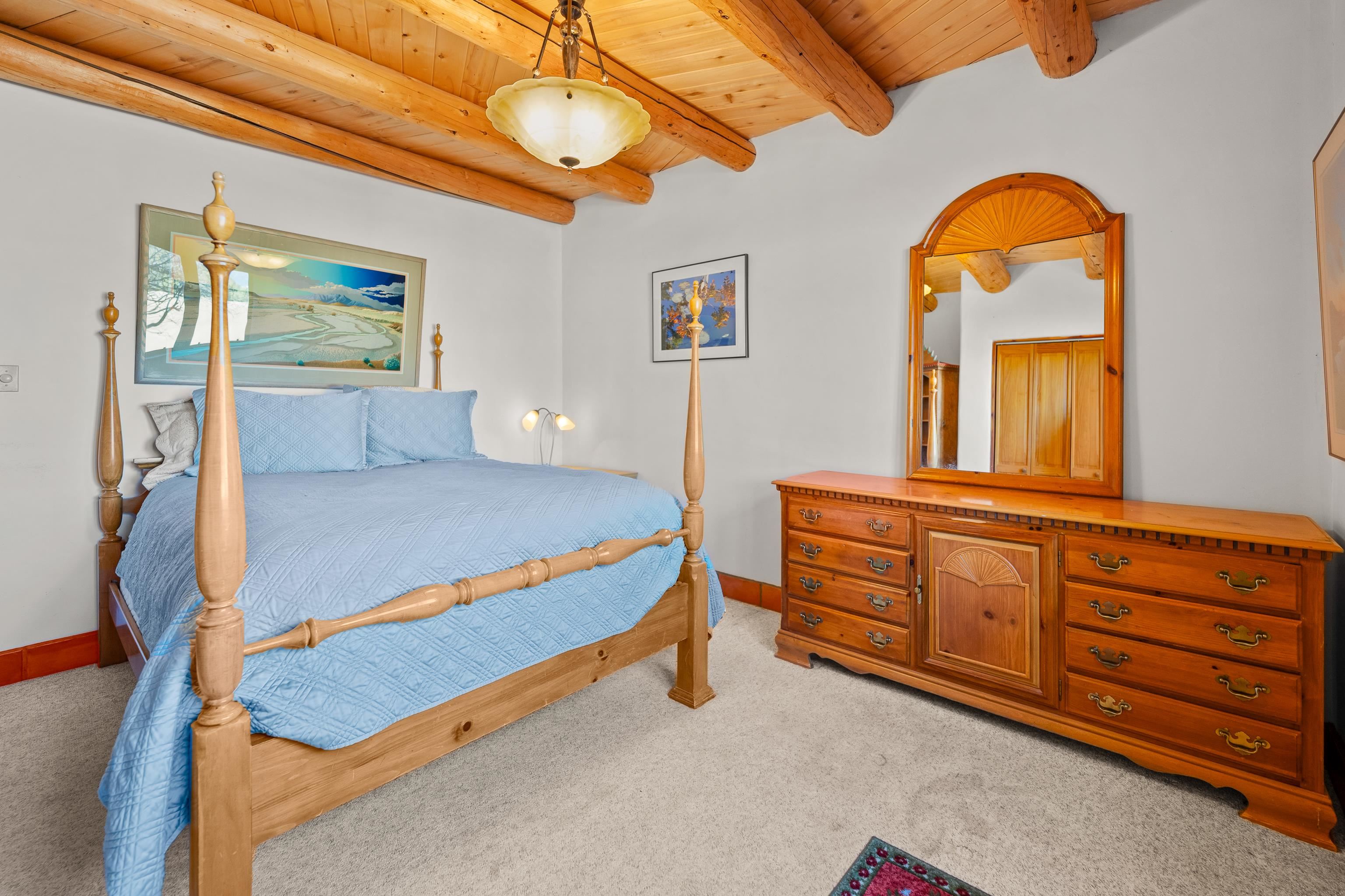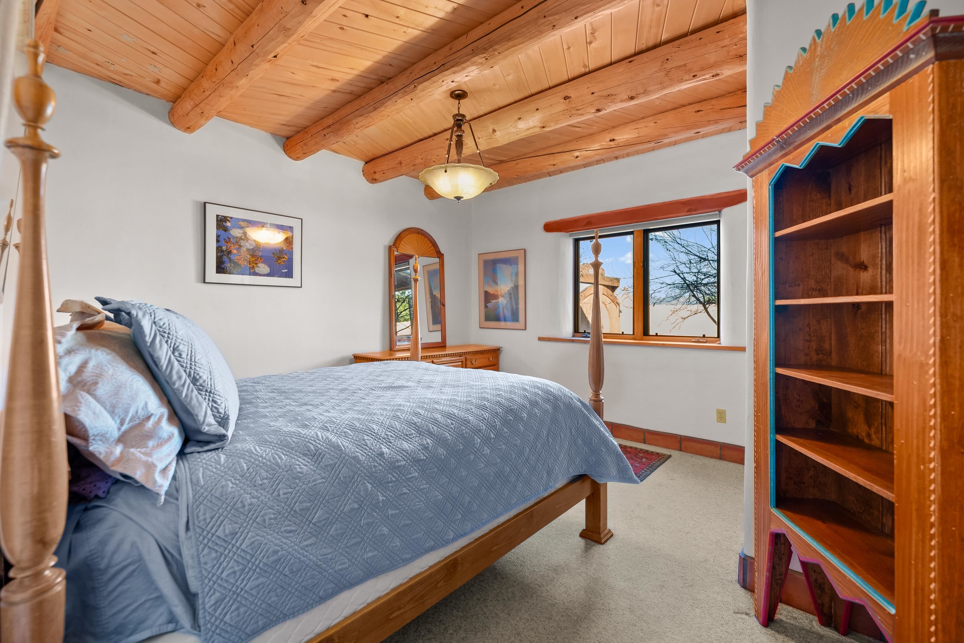 Southwest-style home offering classic New Mexico character with warm wood accents and flexible living spaces. Exposed vigas and wood-plank ceilings create architectural interest throughout, complemented by saltillo tile and carpeted areas for comfort. The open living and dining areas are anchored by a traditional kiva fireplace, providing a cozy focal point and seamless flow for everyday living or entertaining. The kitchen features custom wood cabinetry, tiled countertops, a center island with seating, and abundant natural light. Bedrooms are generously sized with wood-beamed ceilings and ample closet space. Bathrooms include colorful tile accents and well-laid-out vanities. A dedicated laundry/mechanical room adds functionality. Additional highlights include an attached garage/workshop space with storage potential, multiple exterior access points, and a classic adobe-style exterior set against a scenic Northern New Mexico backdrop. This property offers a solid foundation for a primary residence, second home, or creative retreat.