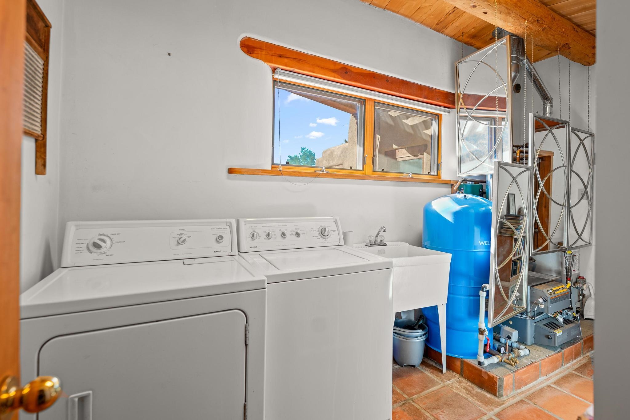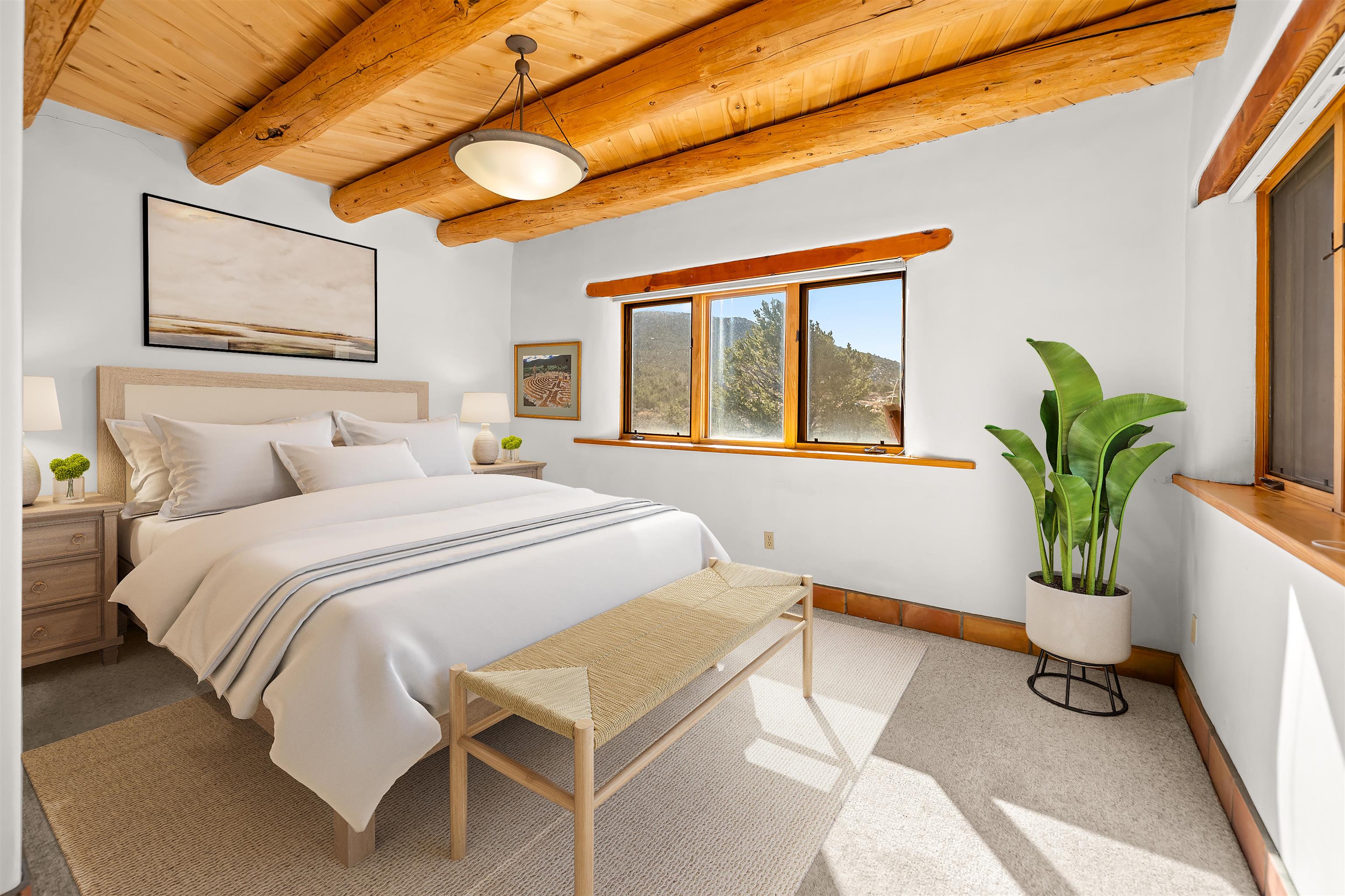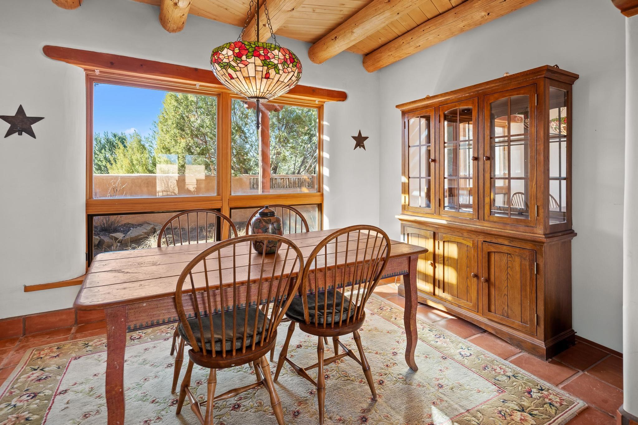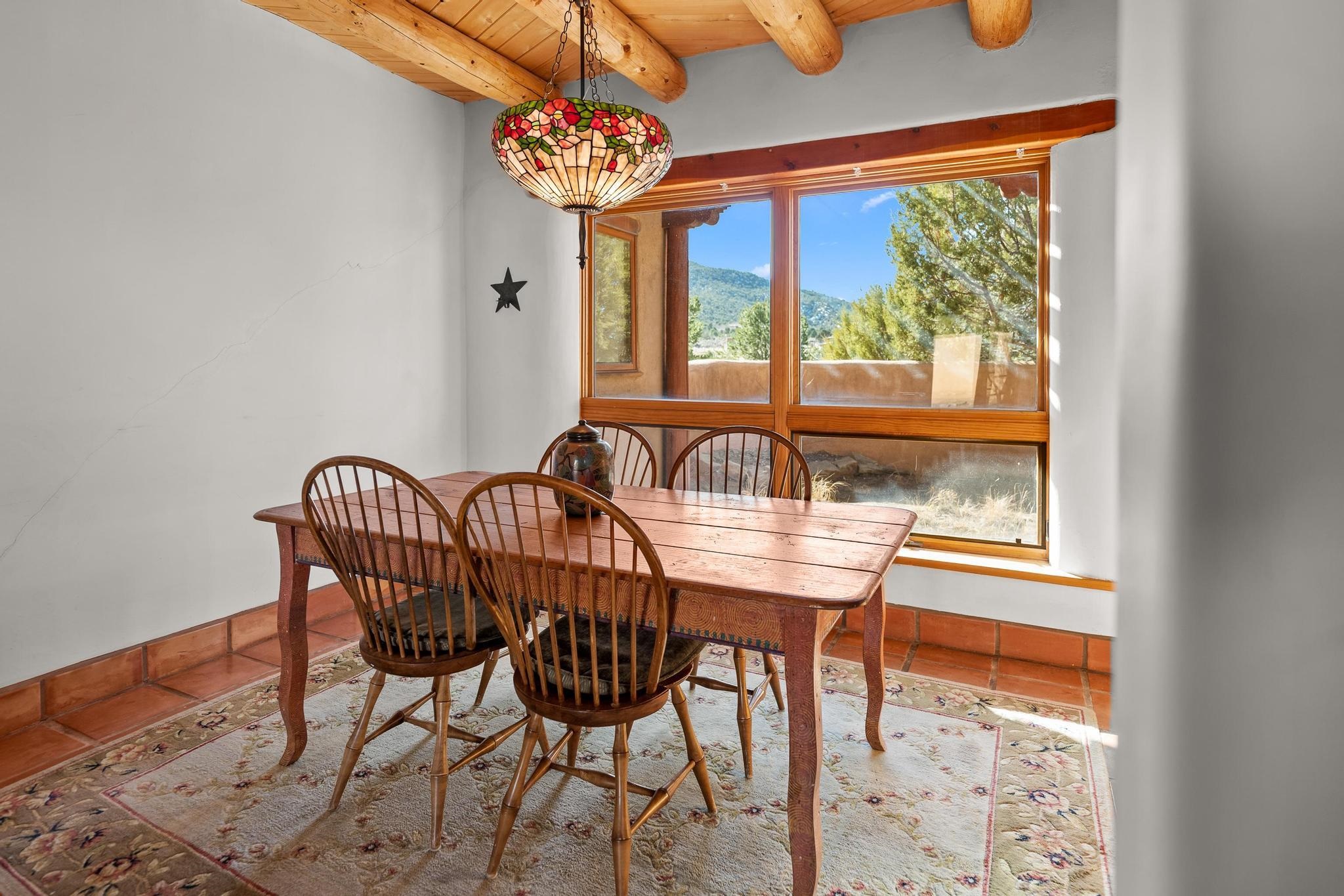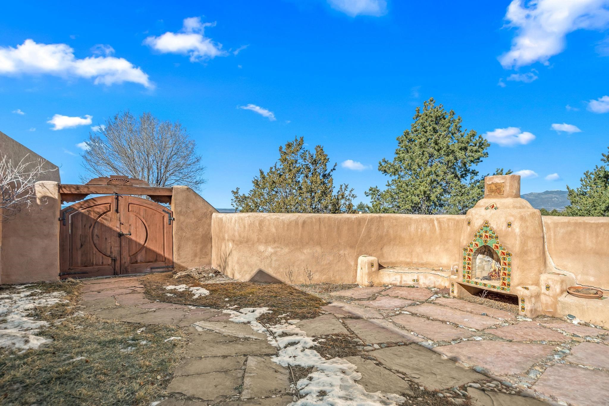 Southwest-style home offering classic New Mexico character with warm wood accents and flexible living spaces. Exposed vigas and wood-plank ceilings create architectural interest throughout, complemented by saltillo tile and carpeted areas for comfort. The open living and dining areas are anchored by a traditional kiva fireplace, providing a cozy focal point and seamless flow for everyday living or entertaining. The kitchen features custom wood cabinetry, tiled countertops, a center island with seating, and abundant natural light. Bedrooms are generously sized with wood-beamed ceilings and ample closet space. Bathrooms include colorful tile accents and well-laid-out vanities. A dedicated laundry/mechanical room adds functionality. Additional highlights include an attached garage/workshop space with storage potential, multiple exterior access points, and a classic adobe-style exterior set against a scenic Northern New Mexico backdrop. This property offers a solid foundation for a primary residence, second home, or creative retreat.
