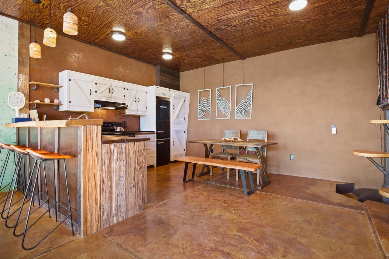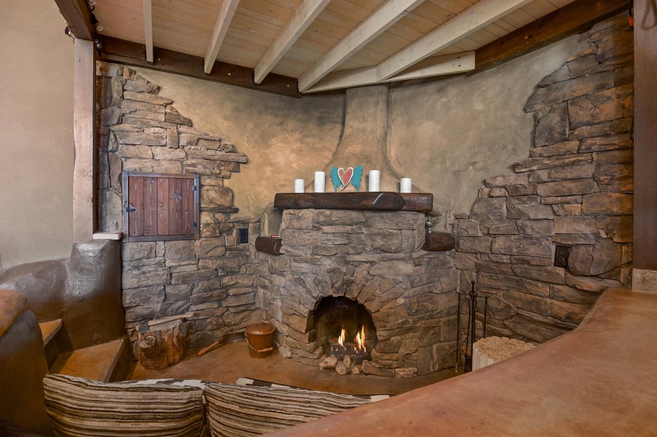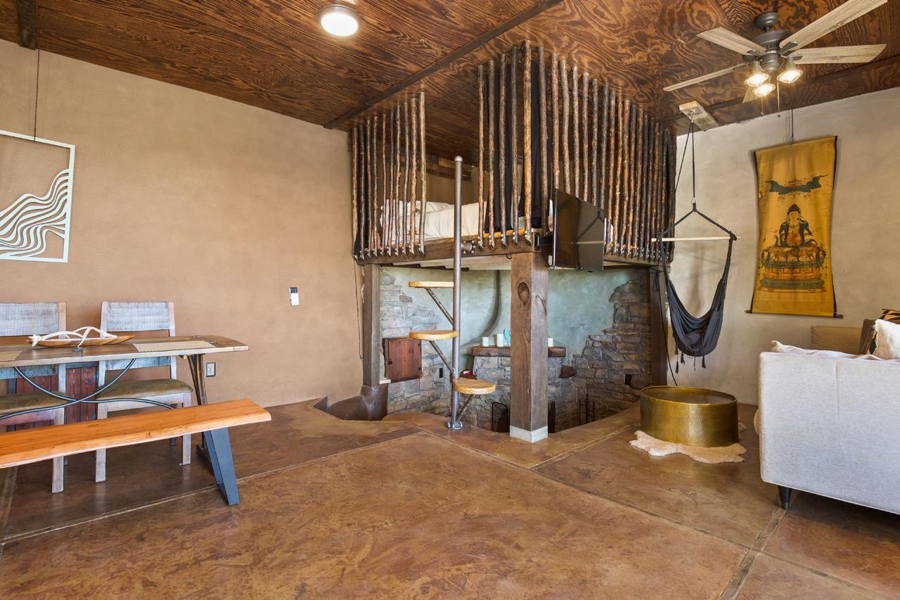 Elegant Living is not typically associated with an Earthship—yet in this case, the term is an understatement. This beautifully built and thoughtfully designed custom Earthship blends refined aesthetics with modern convenience, redefining luxury off-grid living. A low-maintenance front yard welcomes you with a firepit and net hammock, creating an inviting outdoor retreat just outside the atrium entrance. Inside, the atrium features producing banana trees and classic Earthship plantings, framed by large thermal-gain windows that capture views across the landscaped entry and toward the compact Earthship community beyond. The home incorporates the latest advancements in passive temperature regulation, including a convection cooling system designed for warm summer days, as well as a professionally installed radon mitigation system for added indoor air quality and peace of mind. Its recessed placement within the landscape provides natural protection from prevailing seasonal winds, enhancing comfort year-round. Interior spaces are thoughtfully laid out around the atrium. On opposite ends are a private toilet room with sink and mirror, and a full bathroom featuring a clawfoot tub/shower and sink. The main living area is expansive and well appointed, offering a chef’s kitchen with ample custom cabinetry, comfortable lounging space with a flat-screen TV, and a sunken fireplace seating area. Above, a loft with privacy curtains provides flexible additional sleeping or relaxation space. At the far end of the home, the spacious primary bedroom includes generous closet and storage areas, along with a lockable owner’s closet. Satellite TV and internet service are available by contract through TaosNet, and a cellular booster ensures reliable connectivity. A large cistern supports rainwater catchment, while an oversized solar power system easily accommodates modern appliances—including a full-size washer and dryer—delivering true luxury living with no utility bills. Located approximately 15–20 minutes from Taos and 20–30 minutes from Taos Ski Valley, this property offers exceptional versatility as a primary residence, second home, income-producing short-term rental, or a combination thereof. Owners and guests enjoy full access to the Greater World Community’s common areas, with the Rio Grande Gorge nearby, stables available for horses, and miles of private walking and biking trails. This Earthship also boasts a successful short-term rental history, and the seller will make every reasonable effort to transfer advance bookings where permitted by booking platforms. There is truly no Earthship on Earth like this one—an extraordinary opportunity not to be missed. Seller, Broker, and Brokerage make no guarantee as to lot size or structure square footage. Measurements were obtained from Assessor records. Buyers are advised to independently verify all information.