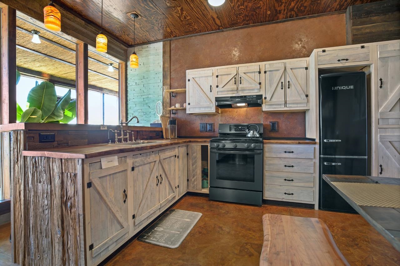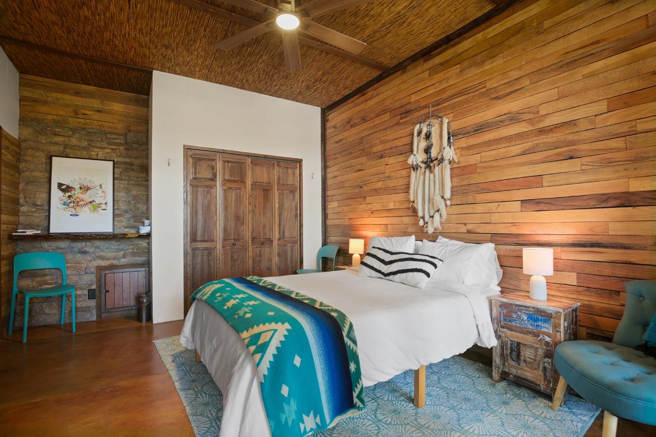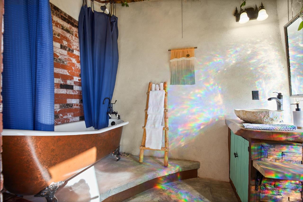 Elegant Living is not typically associated with an Earthship—yet in this case, the term is an understatement. This beautifully built and thoughtfully designed custom Earthship blends refined aesthetics with modern convenience, redefining luxury off-grid living. A low-maintenance front yard welcomes you with a firepit and net hammock, creating an inviting outdoor retreat just outside the atrium entrance. Inside, the atrium features producing banana trees and classic Earthship plantings, framed by large thermal-gain windows that capture views across the landscaped entry and toward the compact Earthship community beyond. The home incorporates the latest advancements in passive temperature regulation, including a convection cooling system designed for warm summer days, as well as a professionally installed radon mitigation system for added indoor air quality and peace of mind. Its recessed placement within the landscape provides natural protection from prevailing seasonal winds, enhancing comfort year-round. Interior spaces are thoughtfully laid out around the atrium. On opposite ends are a private toilet room with sink and mirror, and a full bathroom featuring a clawfoot tub/shower and sink. The main living area is expansive and well appointed, offering a chef’s kitchen with ample custom cabinetry, comfortable lounging space with a flat-screen TV, and a sunken fireplace seating area. Above, a loft with privacy curtains provides flexible additional sleeping or relaxation space. At the far end of the home, the spacious primary bedroom includes generous closet and storage areas, along with a lockable owner’s closet. Satellite TV and internet service are available by contract through TaosNet, and a cellular booster ensures reliable connectivity. A large cistern supports rainwater catchment, while an oversized solar power system easily accommodates modern appliances—including a full-size washer and dryer—delivering true luxury living with no utility bills. Located approximately 15–20 minutes from Taos and 20–30 minutes from Taos Ski Valley, this property offers exceptional versatility as a primary residence, second home, income-producing short-term rental, or a combination thereof. Owners and guests enjoy full access to the Greater World Community’s common areas, with the Rio Grande Gorge nearby, stables available for horses, and miles of private walking and biking trails. This Earthship also boasts a successful short-term rental history, and the seller will make every reasonable effort to transfer advance bookings where permitted by booking platforms. There is truly no Earthship on Earth like this one—an extraordinary opportunity not to be missed. Seller, Broker, and Brokerage make no guarantee as to lot size or structure square footage. Measurements were obtained from Assessor records. Buyers are advised to independently verify all information.
