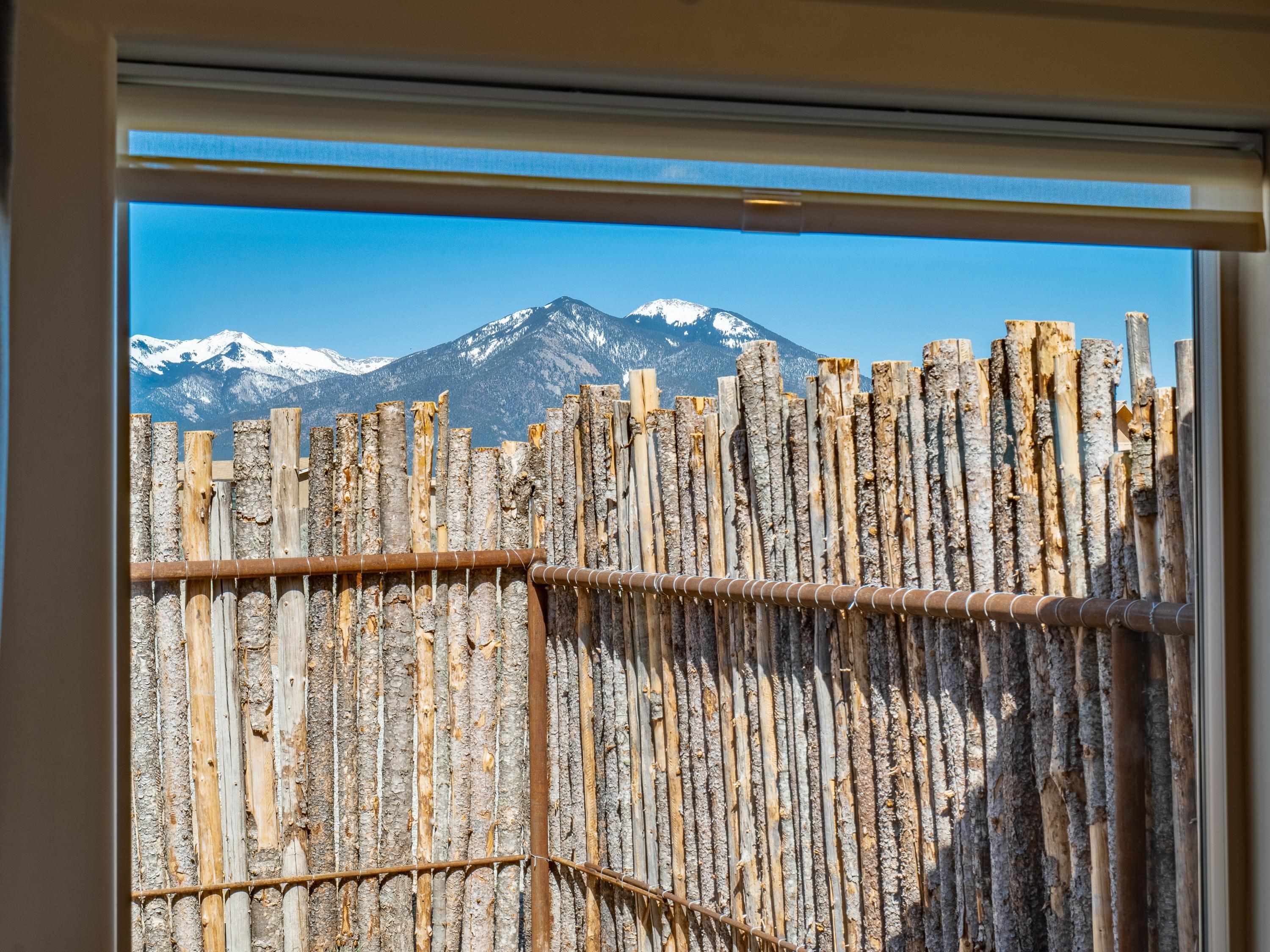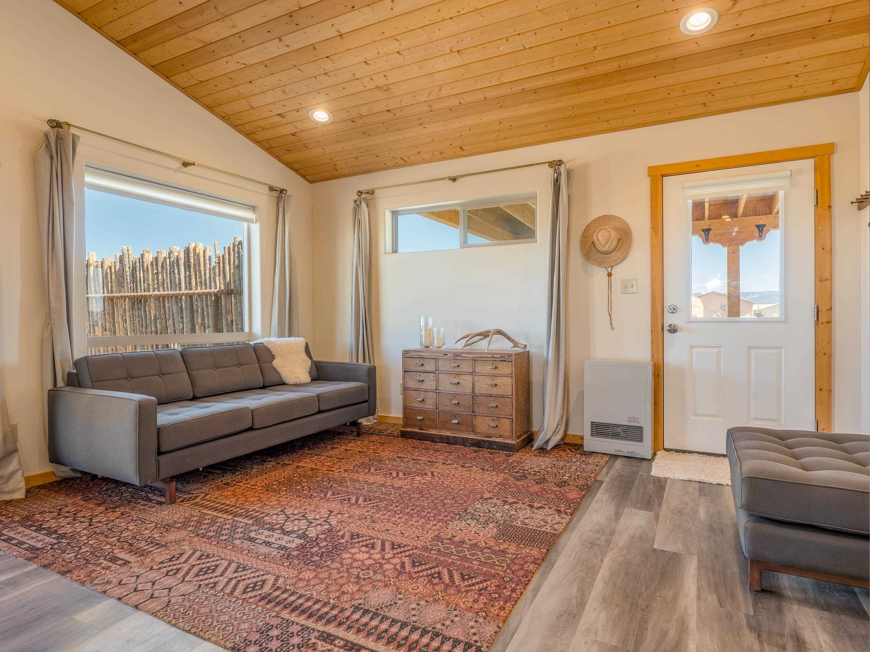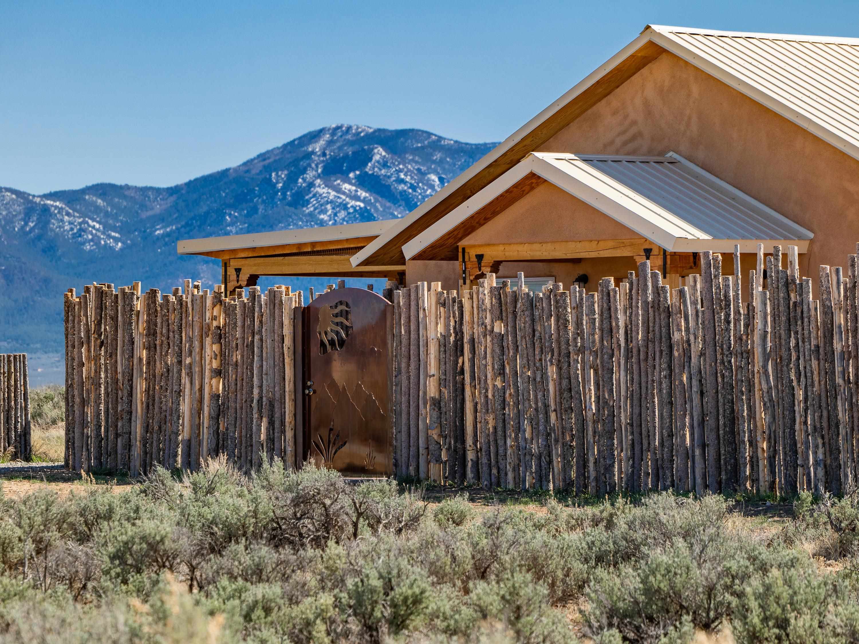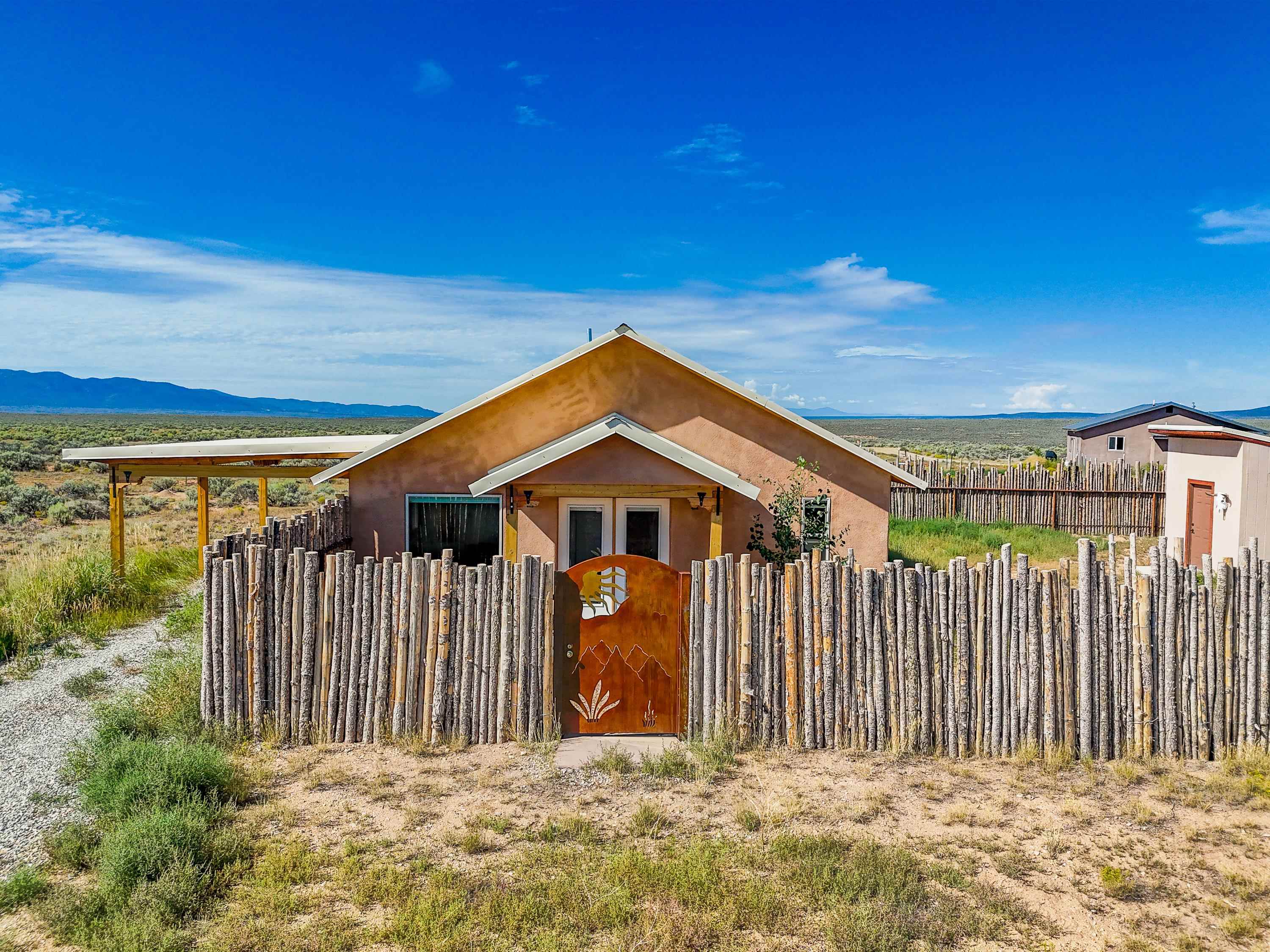 Tucked away at the end of a peaceful road, this recently-built 2 bedroom, 1 bathroom home is a cozy haven amidst nature's beauty. The neighborhood is situated adjacent to over 16,000 acres of Pueblo land. Surrounded by sagebrush and jaw-dropping mountain views, 15 Sacred Vista Road offers the serene ambience you’ve been craving. Step inside and be greeted by the open living and kitchen area with a vaulted ceiling and large windows with new custom shades from The Shade Store, letting in tons of natural light for a breezy feel. Outside, enjoy summer hangouts in the yard, with ample privacy from the large (250 linear feet), steel-framed latilla fence. The large corner lot provides ample room to expand your outdoor oasis, and an attached carport keeps you and your vehicle out of the elements. With recent upgrades like an eye-catching, handcrafted gate by artist Jose Varela and large storage shed on a concrete slab, this home has it all! Located only a quick 20-minute drive to the historic Taos Plaza, grocery stores, and shopping, 15 Sacred Vista Road epitomizes the perfect balance between tranquility and accessibility!
