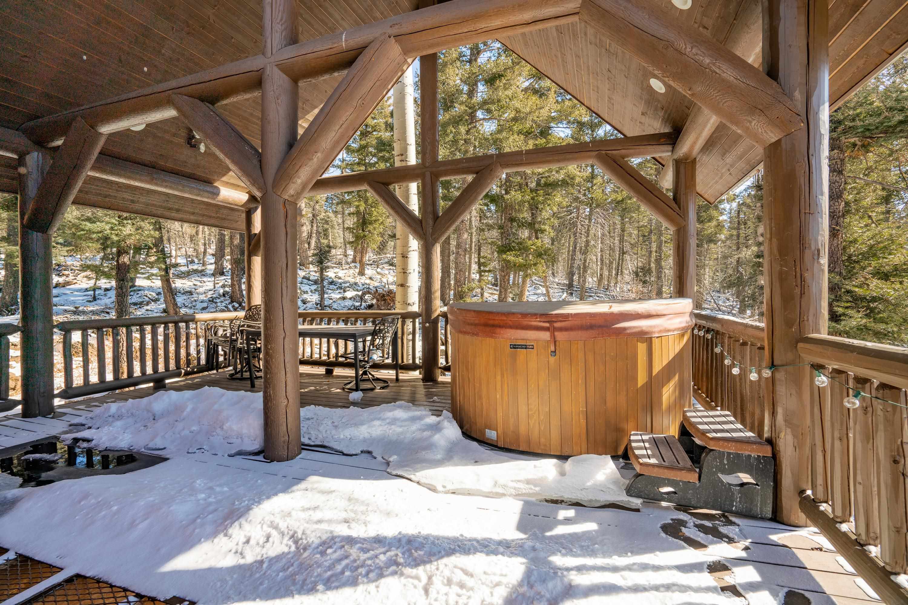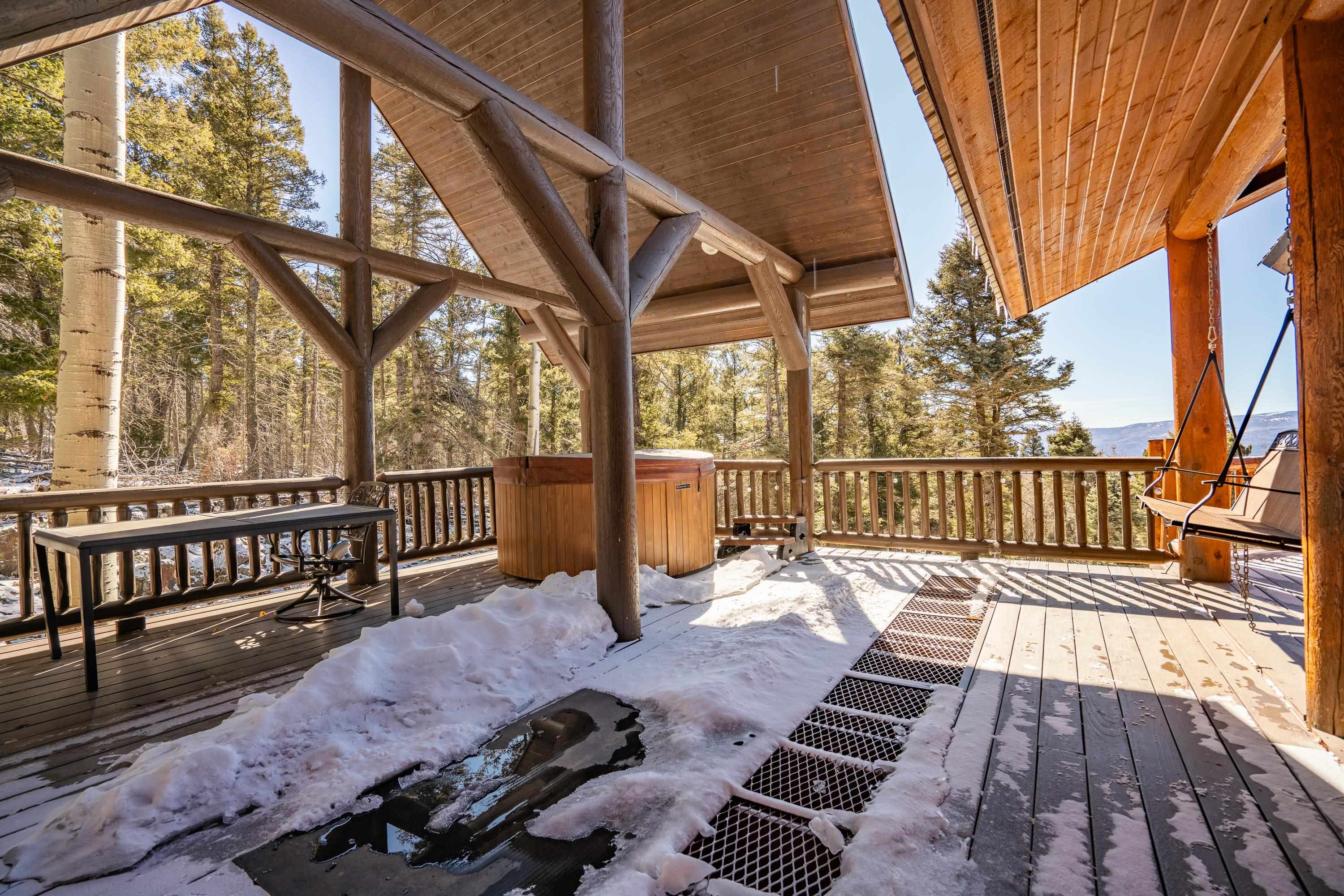 Impressive, luxurious, private! This exquisite custom log home was built in 2009 by Eric Hoffmann of Mammoth Mill Construction. Mammoth Mill only uses dead-standing trees from Northern New Mexico and Southern Colorado for their custom builds, and the results are true masterpieces. These are not log kits, but they are one-of-a-kind works of art. This home was awarded the “Best Interior” during the annual Parade of Homes and featured in the Land and Home Magazine for its “mountain form meets modern function”. 15 Sunrise Overlook is hidden at the end of a cul-de-sac and has stunning mountain views. The property is on 1.84 acres nestled amongst the grove of Aspen trees. The Great Room has vaulted ceilings, a massive stone fireplace, large windows for those picturesque views and opens to the gourmet kitchen and adjoining 8-person dining room with additional bar seating. This three-bedrooms, two-and-a-half bathrooms, 2,325 square feet work of art has private balconies off each bedroom, ample closet space and high ceilings. In addition, the wrap-around deck is expansive with hot tub under the covered roof, plenty of outdoor space for entertaining or just sitting back to enjoy the solitude of the beautiful surroundings. The home has several additional features, including a walk-in pantry, large laundry/mud room, stainless steel appliances, wood plank floors, level driveway, and a toy storage/workshop/garage under the house. There is not only forced heat, but this home also has air conditioning, which is very rare in these parts. The owners had the pro-panel roof tightened, and the entire exterior of the house including the deck have been sealed and stained, so no deferred maintenance to deal with this property. This is truly a must-see and is being sold completely furnished. It is your turn…start creating your lifetime of memories today!