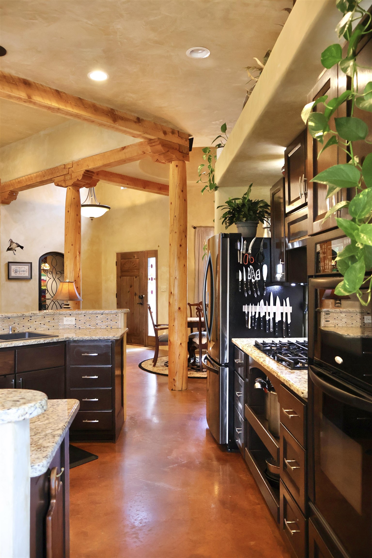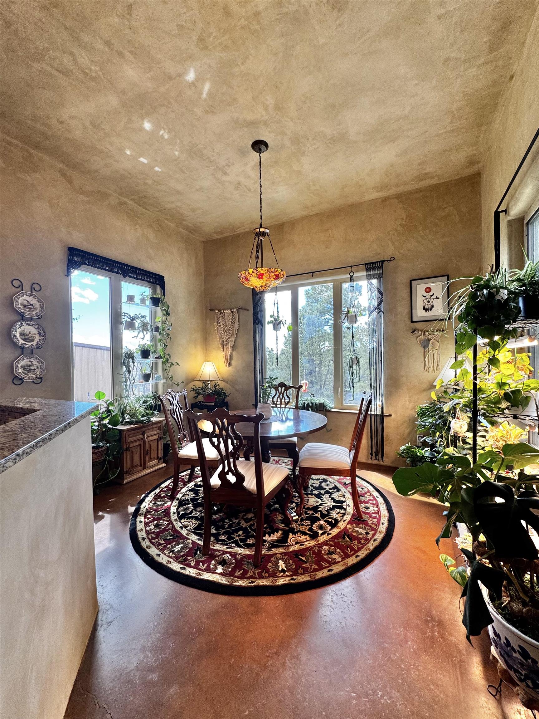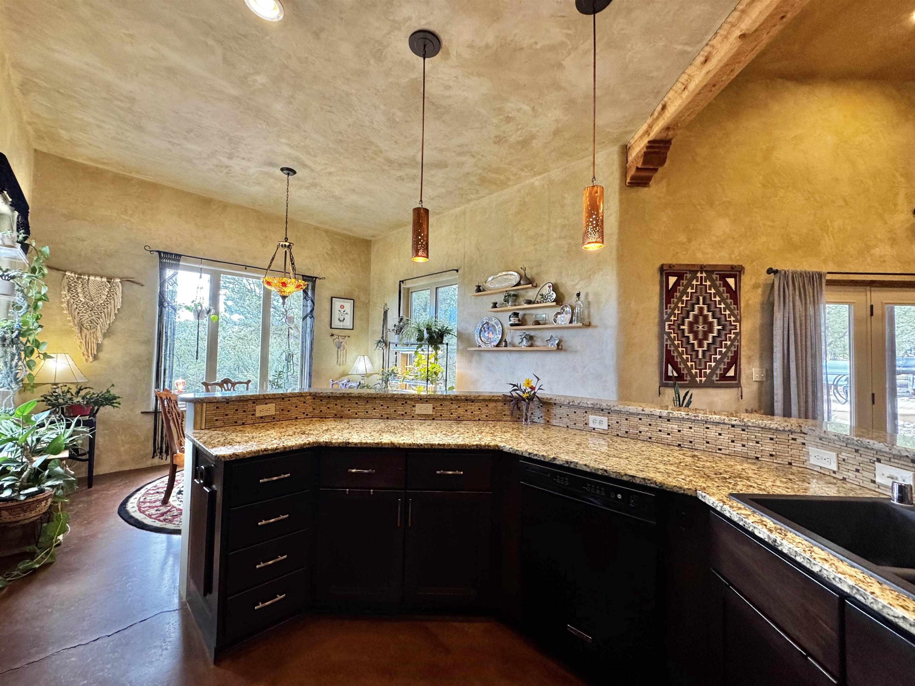 154 Gallina Canyon Road is a unique property situated within the Sangre de Cristo Mountains of the Northern Taos Valley. This remarkable residence is perched high among the pine, juniper, and piñon trees on two acres of serene mountainous land. This exquisite pueblo-style home is approximately 2,475 square feet, and consists of three-bedrooms, and three-bathrooms. Conveniently, there is a bonus room that can be utilized for various purposes. You decide how this space best suits your needs. This home boasts spacious living, comfort and luxury all in one. Soak in the beautiful diamond finished walls, granite counter tops, stained concrete floors, tall ceilings and beautiful wood beams and vigas which create a beautiful and inviting ambiance. Enjoy family meals from the formal dining area or from the more intimate dining space located off the kitchen. Windows can be found throughout the home bringing in an abundance of natural light and nature. The home features two kivas. One is located in the living room. The second can be found in the master bedroom. Both are perfectly located for those cold winter nights. Outside the home, you are welcomed with nicely manicured landscape as well as a large driveway and yard creating ample space to move around. Notably, this property is the sole Gallina Canyon area property available for sale, featuring a detached two-bay, 45’x45’ garage/workshop. The garage is laid upon a concrete foundation and includes a 15'x45' covered parking area, one roll up 12 foot tall door and one single automatic door. One wall within the garage has a built-in workbench with storage and a built-in mini fridge. Additional storage space, shelving and countertops can be found throughout which adds to the conveniences needed. Additionally, there is a sink with a 10 gallon hot water heater and an exterior gutter system that feeds into two water tanks for watering as well as for emergency fire extinguishing purposes. The home benefits from a private domestic well as well as an above ground sprinkler system. This incredible neighborhood brings tranquility, accessibility and exterior beauty to any outdoor enthusiast, with so many amenities surrounding this property. This house is located only 23 minutes from the Taos Ski Valley, 24 minutes from the Rio Grande Gorge Bridge, 13 minutes from the village or Arroyo Seco, 24 minutes from the Taos Plaza and 23 minutes from the Taos Pueblo. We invite you to schedule your showing today to experience in person what this exquisite property has to offer.