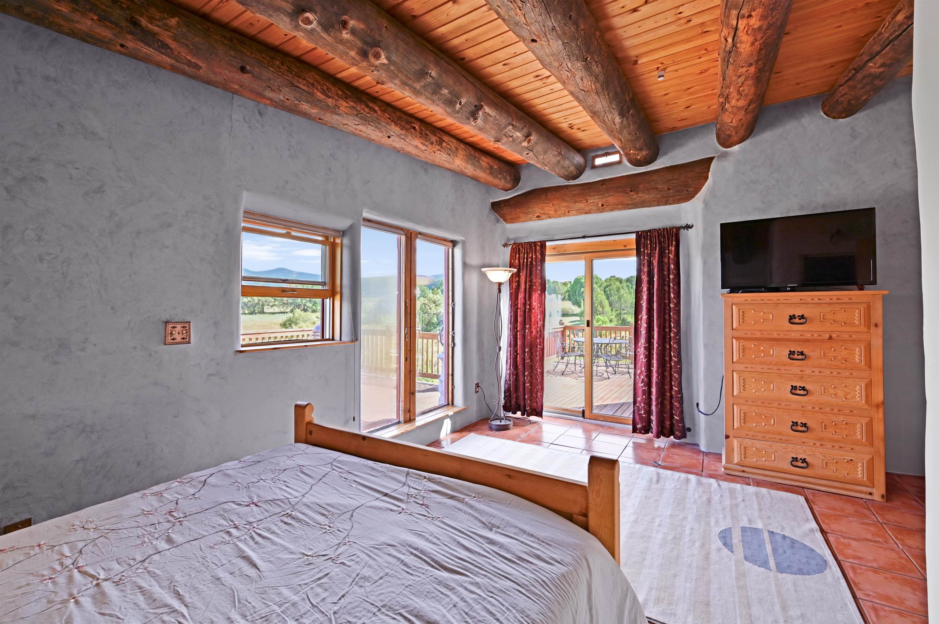 A truly rare 34-acre mountain retreat awaits, nestled in the Sangre de Cristo Mountains with stunning views of Jicarita Peak and Truchas Peaks. This exceptional, self-sufficient, and sustainably developed property is perfect for a small family business, equestrian estate, or serene retreat center. The total living space of 4,100 sq ft includes a charming 1,600 sq ft earth-bermed 2-bedroom home featuring custom stone floors, vigas, radiant in-floor heat in the kitchen and master suite, and an updated kitchen with a Wolf Stove and granite countertops. The home is designed for energy efficiency, maximizing solar gain, and has a wrap-around deck with captivating pond and mountain views. The property also boasts a 2,225 sq ft office/mixed-use building (zoned for cottage industry, previously a successful institute), a 275 sq ft studio/guest house with a half-bath, and a 30’ insulated yurt with off-grid solar, ideal for meditation or a classroom—offering immense flexibility and separate spaces for living, working, and gathering. Outside, find unparalleled amenities dedicated to Earth Stewardship and conservation: • 10 irrigated acres with water rights for farming or grazing. • Rustic 3-stall horse barn and tack room with separate fencing. • 33’ geodesic Growing Dome for year-round production. • A comprehensive water catchment system utilizing heavy-duty roof guttering on all buildings and multiple cisterns. • A quarter-acre pond with a Trex deck, fed by wetlands and springs, and aerated by a windmill. • A vast network of maintained trails on forested acres (thinned and managed), offering direct access to the Carson National Forest. Additional features include an owned grid-tied solar array, a root cellar, a 40’ cargo container, and extensive landscaping with drip irrigation. This property is a rare gem, beautifully developed, and ready for its next steward.