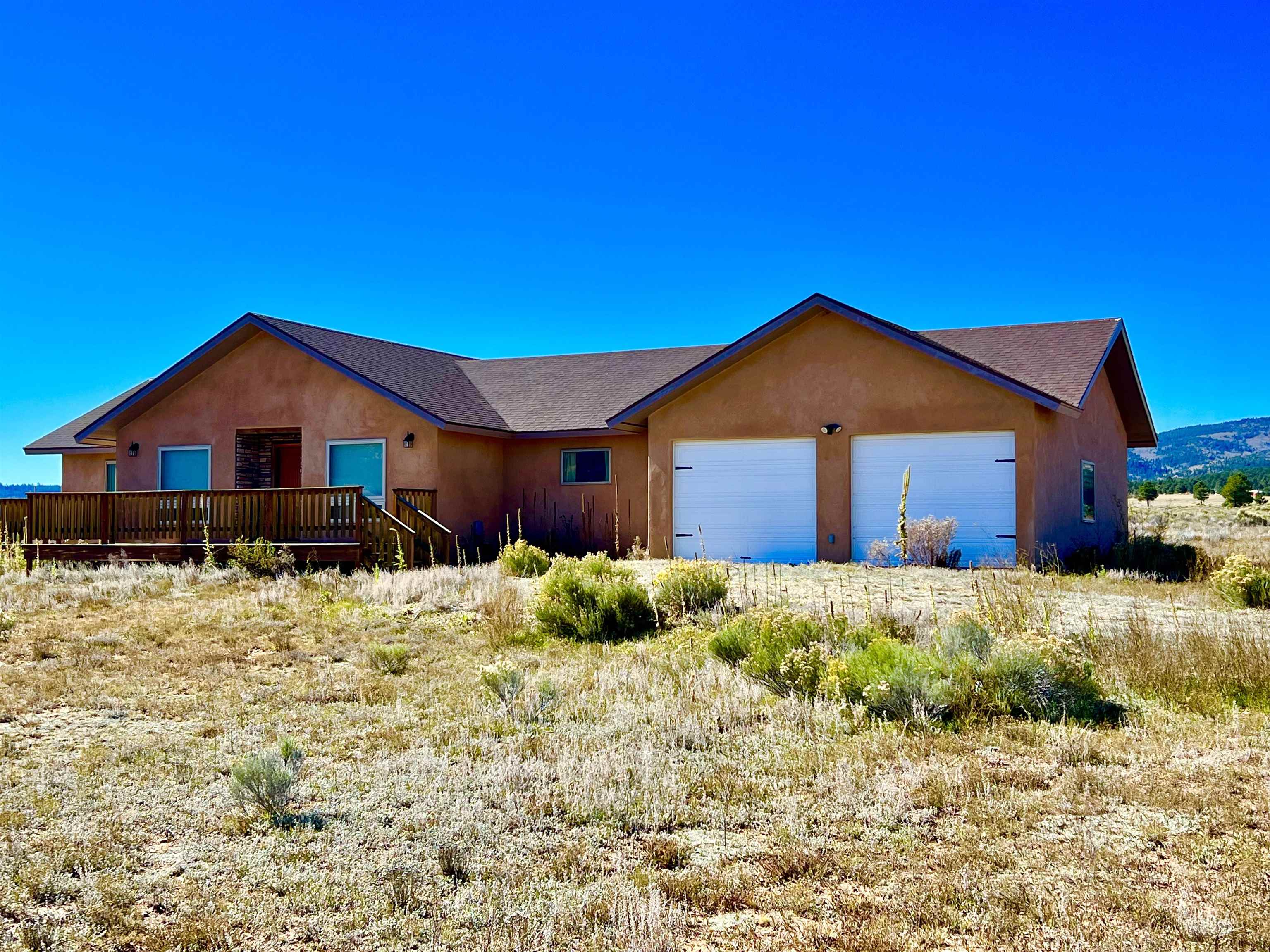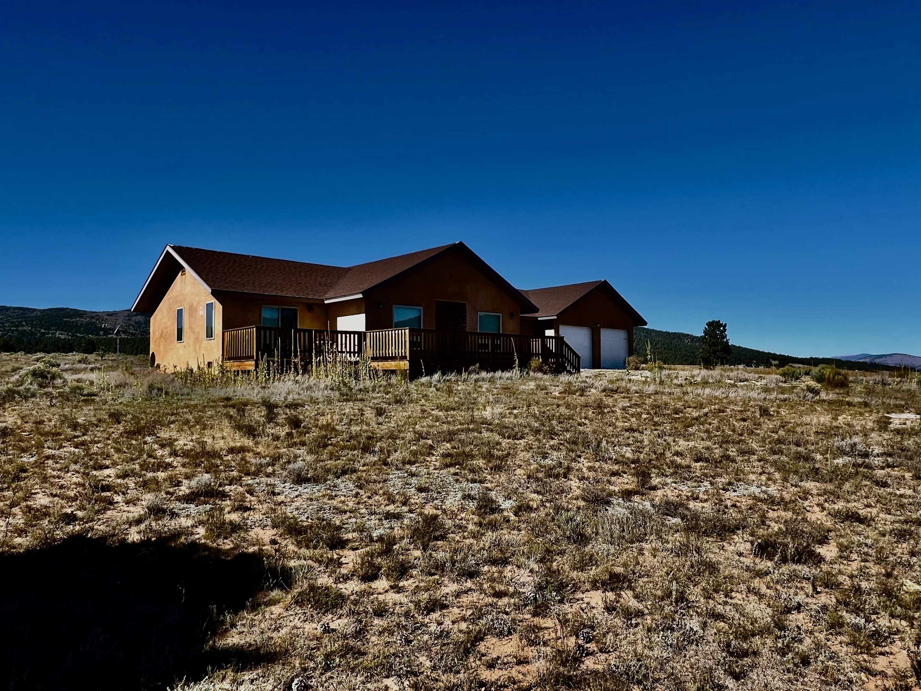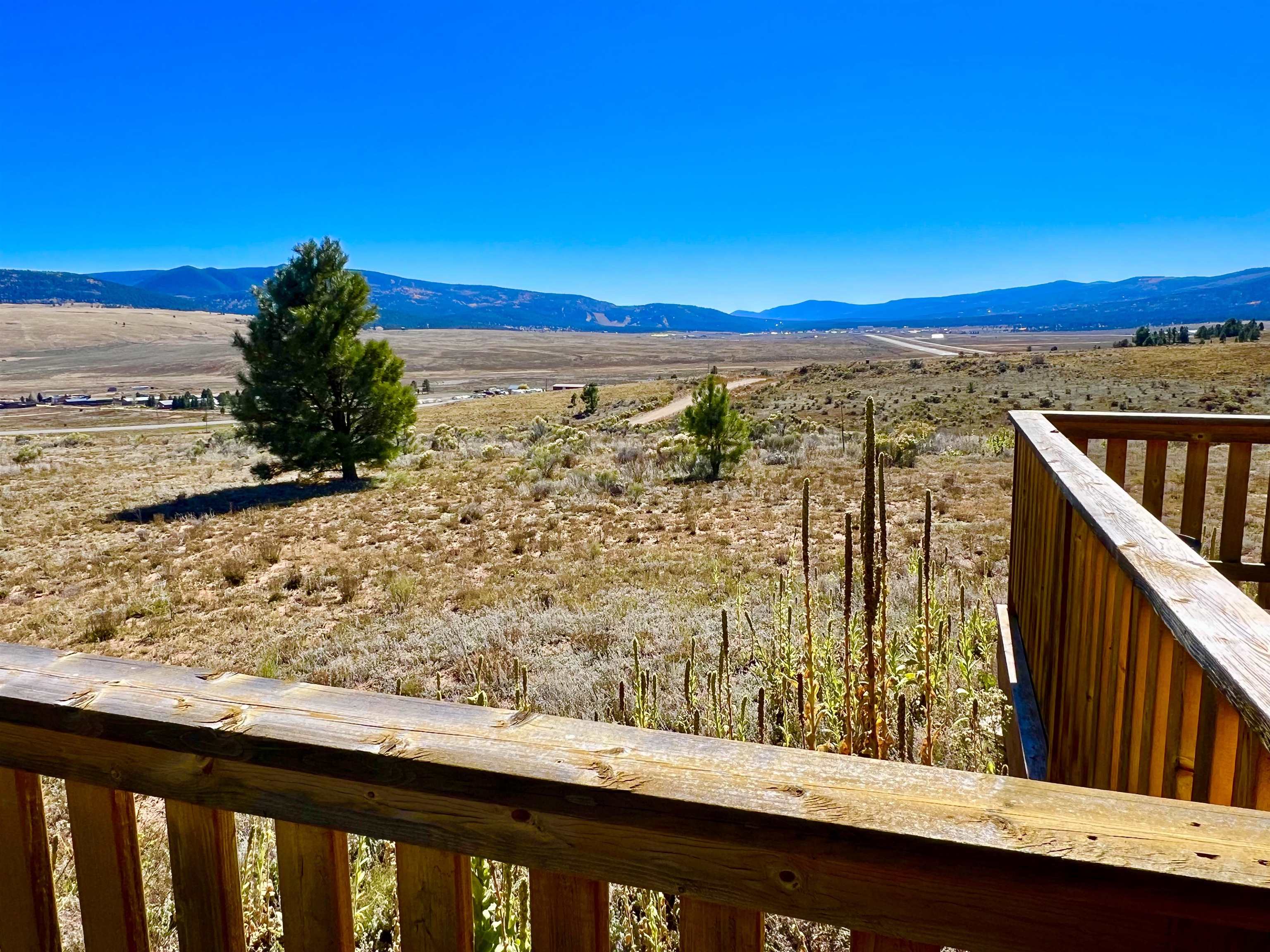VIEWS, VIEWS! This Ranch style home sits on a hillside with 360deg views of he Moreno Valley, Angel Fire Ski Mountain and Eagle Nest Lake. Only 6 years old, this well built stucco home has an attractive floor plan with open space kitchen, dining and living room. The master boasts a large walk-in closet, private deck and walk in shower. The ample size kitchen has a pantry and stainless appliances with lots of counterspace! The 2.5 acre lot is ready for your special landscaping trees and gardens for outdoor enjoyment! Relax on the large front deck overlooking the Sangre de Christo Mountain Range where you will witness Elk Herds, and many other wildlife neighbors!