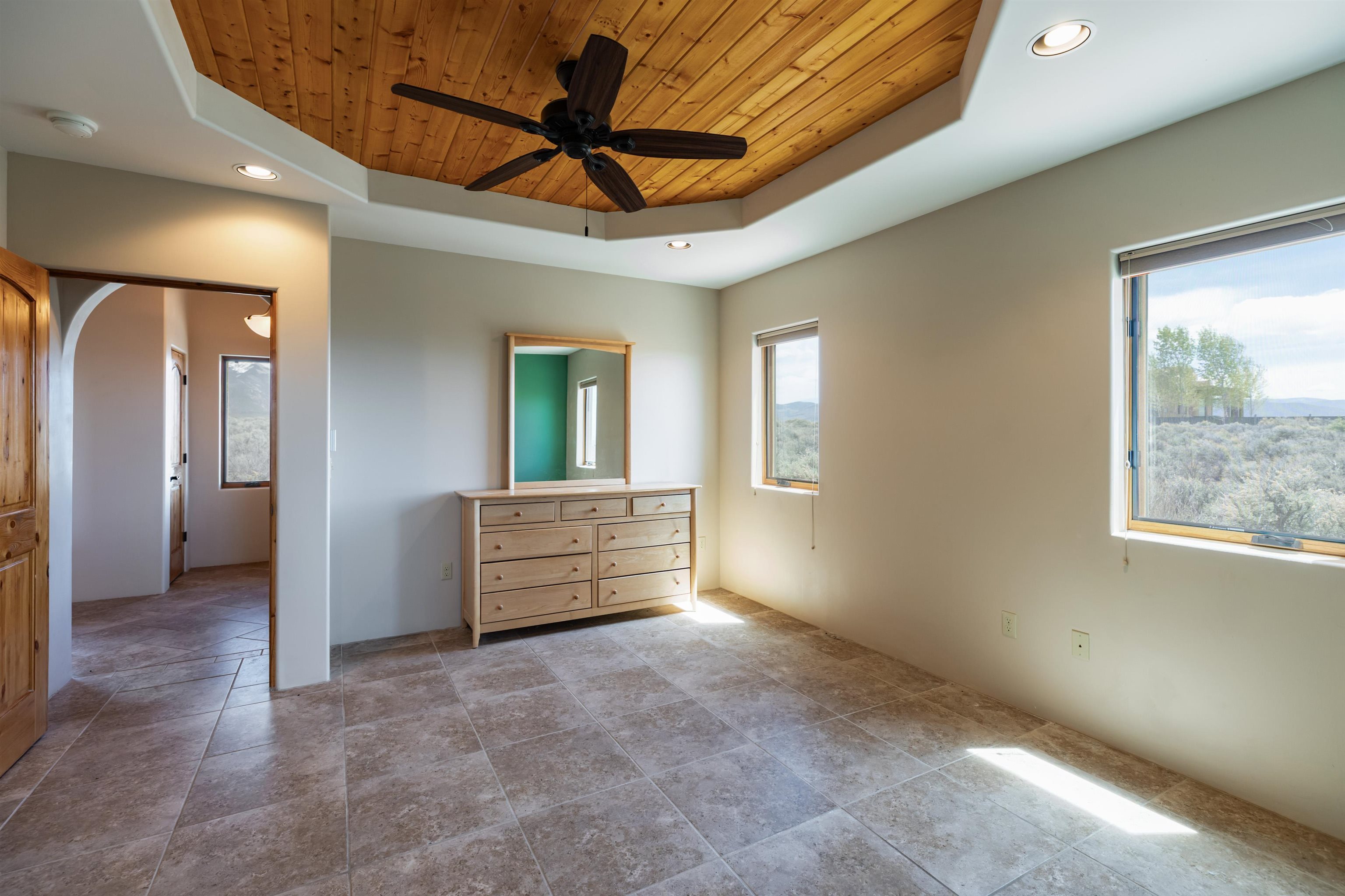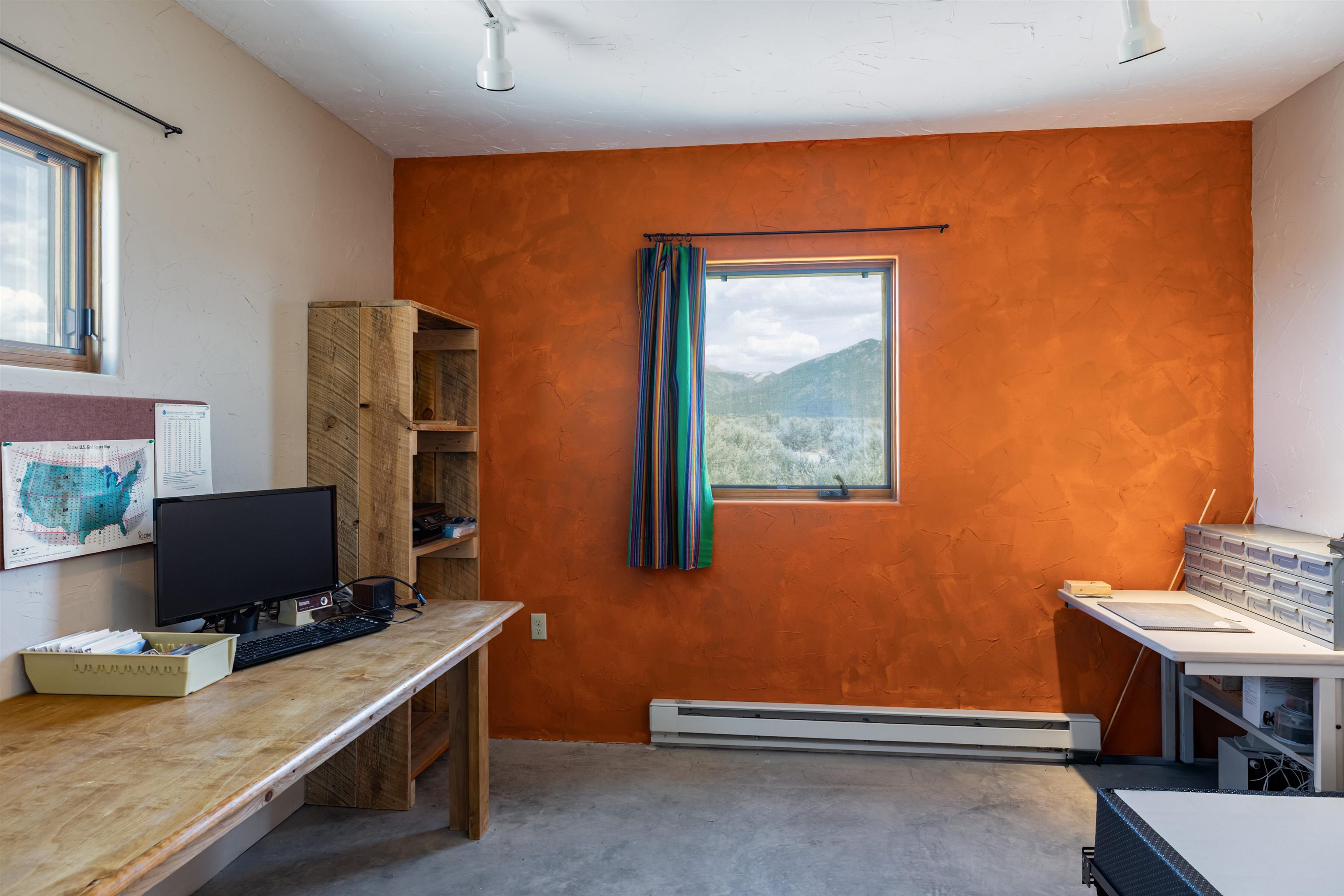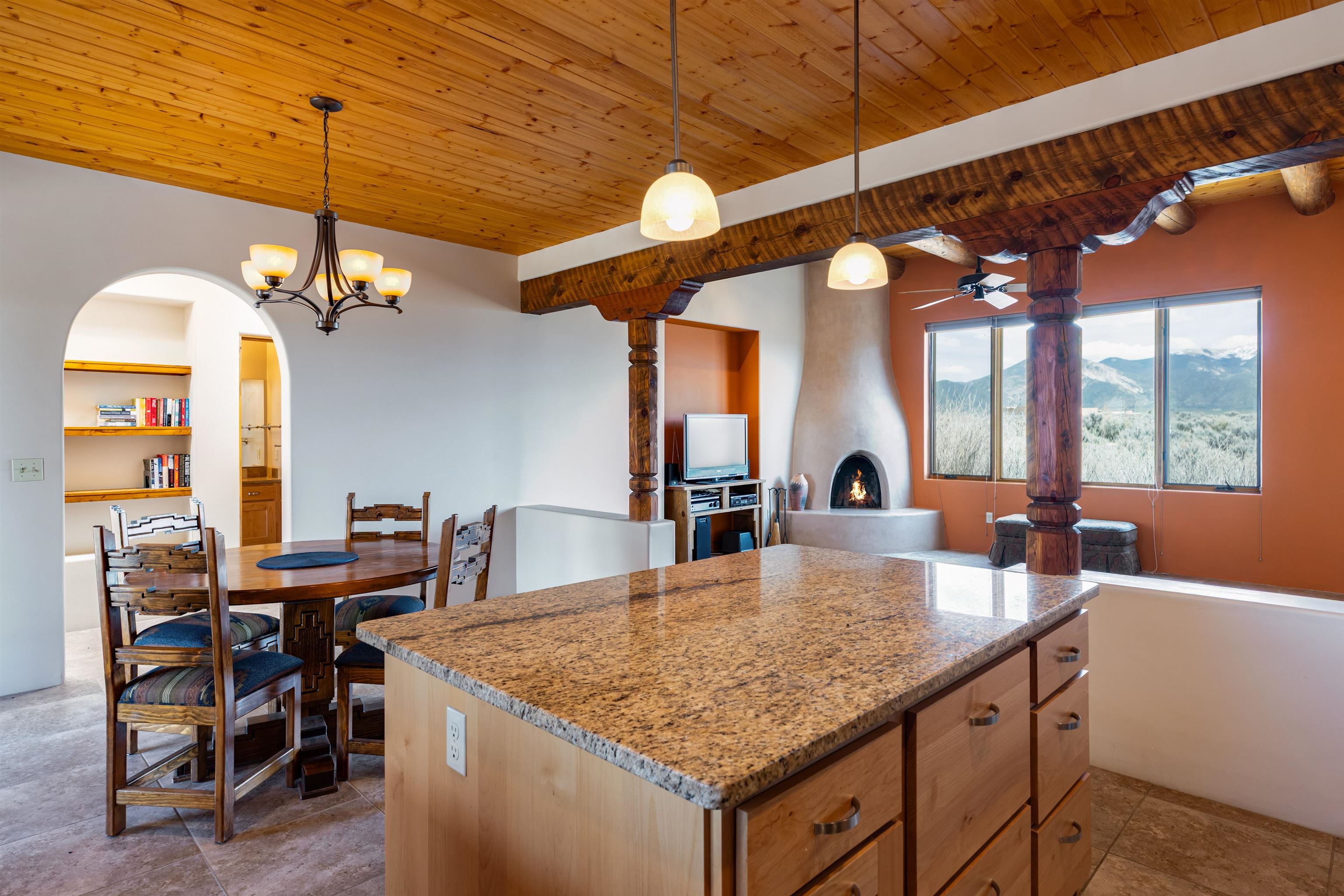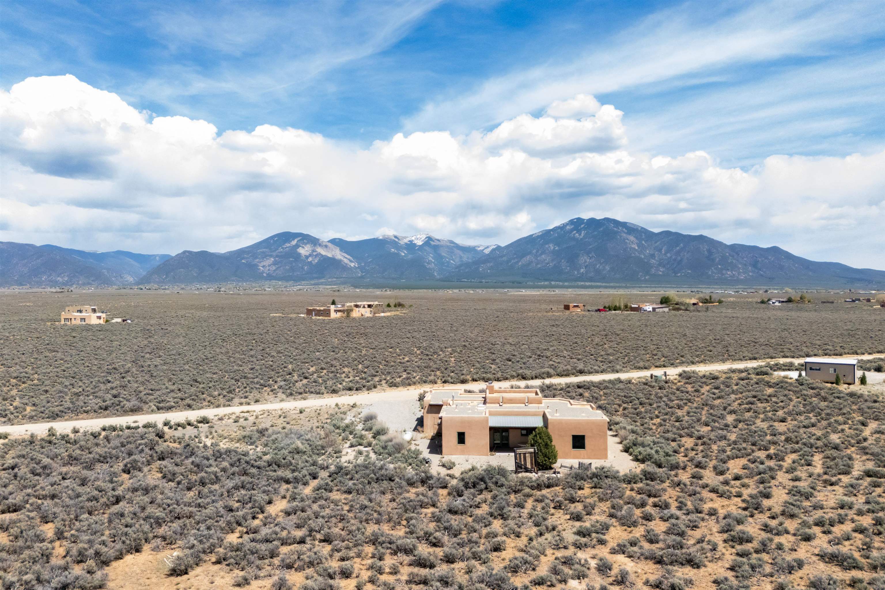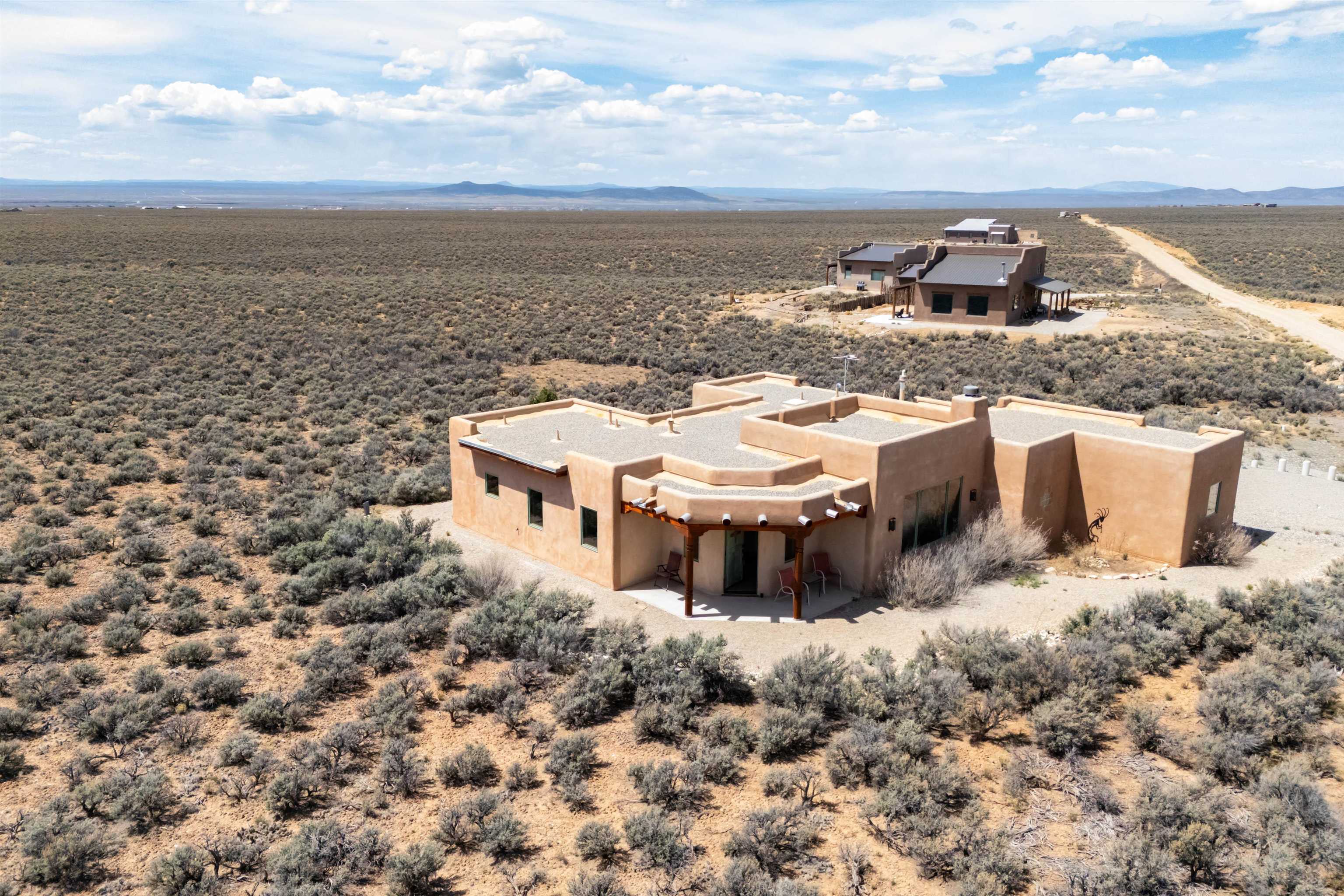 There are properties that are a home—and there are those that offer a way of life. Set against the vast, uninterrupted skies of Northern New Mexico, this exceptional Pueblo-style residence invites you into a quieter, more intentional rhythm—where light, landscape, and architecture exist in perfect harmony. Privately situated on 1.16 acres near the end of the road, the setting feels expansive yet grounded—framed by panoramic views of the Sangre de Cristo Mountains, with Taos Mountain and Mount Wheeler rising in quiet permanence beyond. The regional cultural and activity center of Taos is only 15 minutes away, with World Class skiing in Taos Ski Valley only 20 minutes. The 1,536 sq. ft. home is a study in timeless Southwestern design. Exposed vigas, soft natural textures, and warm architectural lines create a sense of understated luxury. Expansive windows draw the outside in, filling the home with ever-changing light and anchoring each space to the landscape beyond. The open-concept living area is centered around a traditional kiva fireplace offering warmth and ambiance on crisp mountain evenings. Radiant floor heating ensures year-round comfort, while thoughtful details—a walk-in closet in the main bedroom, ceiling fans, on-demand hot water, and a well-proportioned layout—support effortless daily living. East- and west-facing patios create natural gathering spaces for sunrise coffee and sunset reflection. Practicality meets possibility with an attached single-car garage and a large separate storage space with potential for a studio or creative workspace. Reliable Kit Carson broadband and strong cell service provide modern connectivity without compromising the sense of escape.