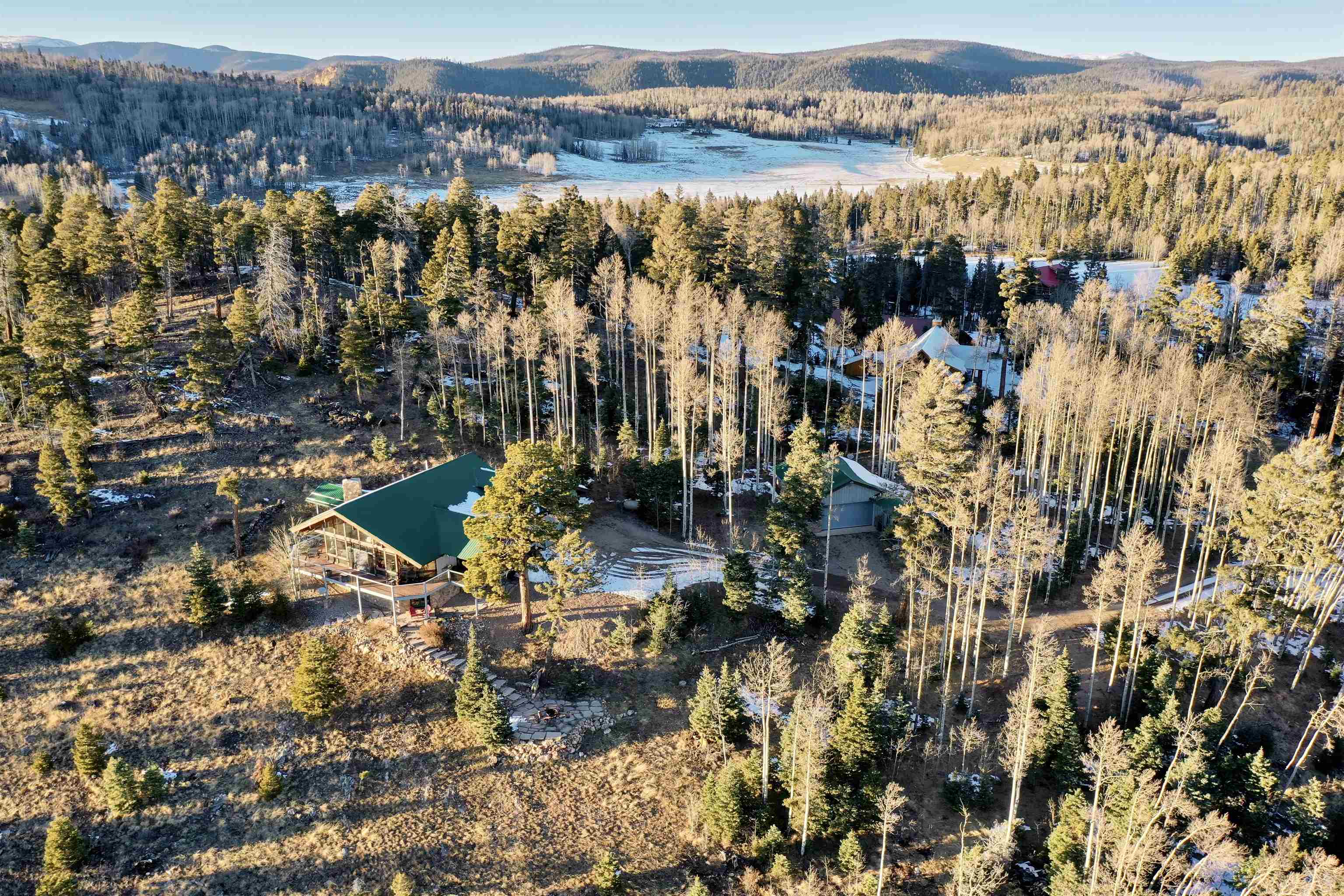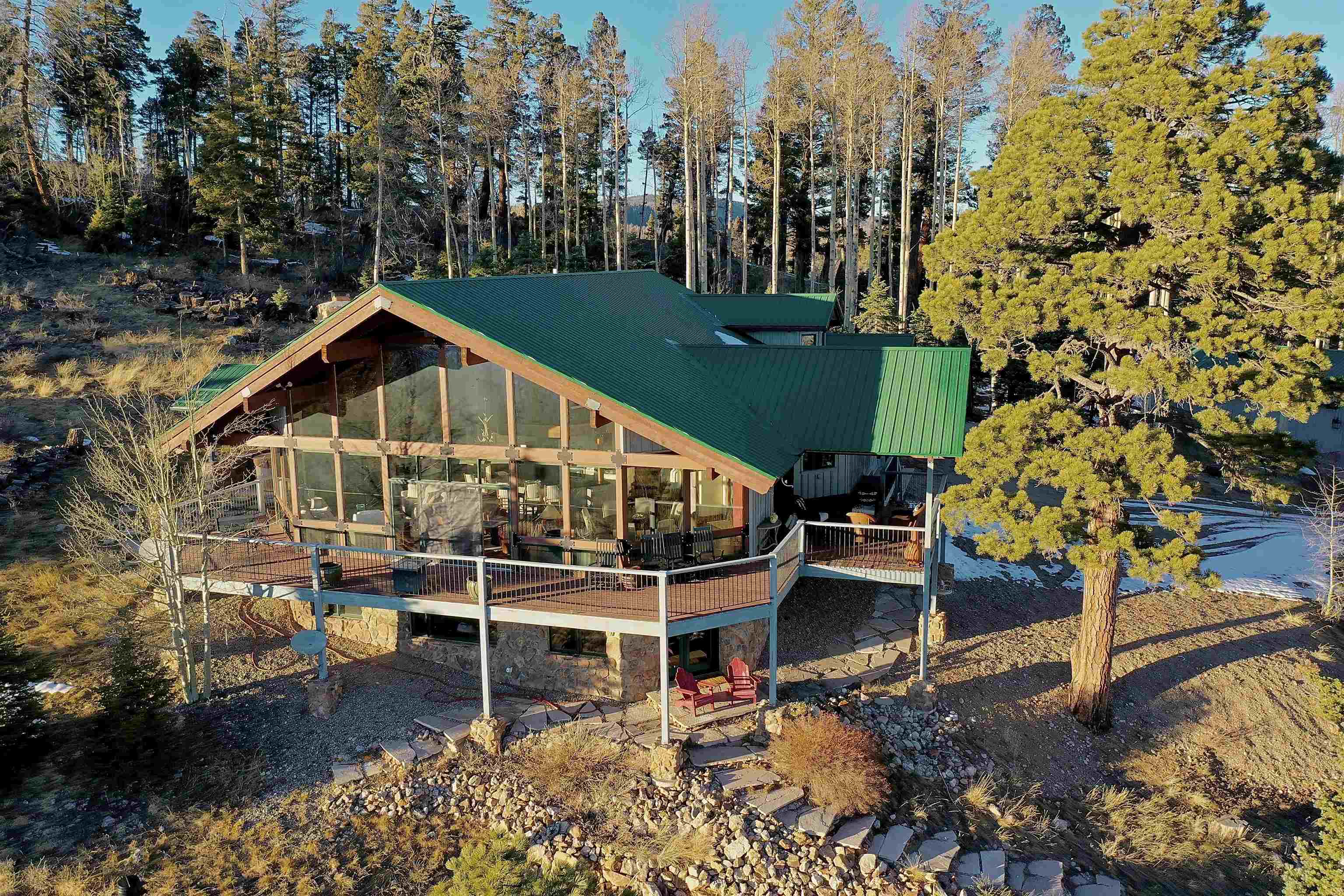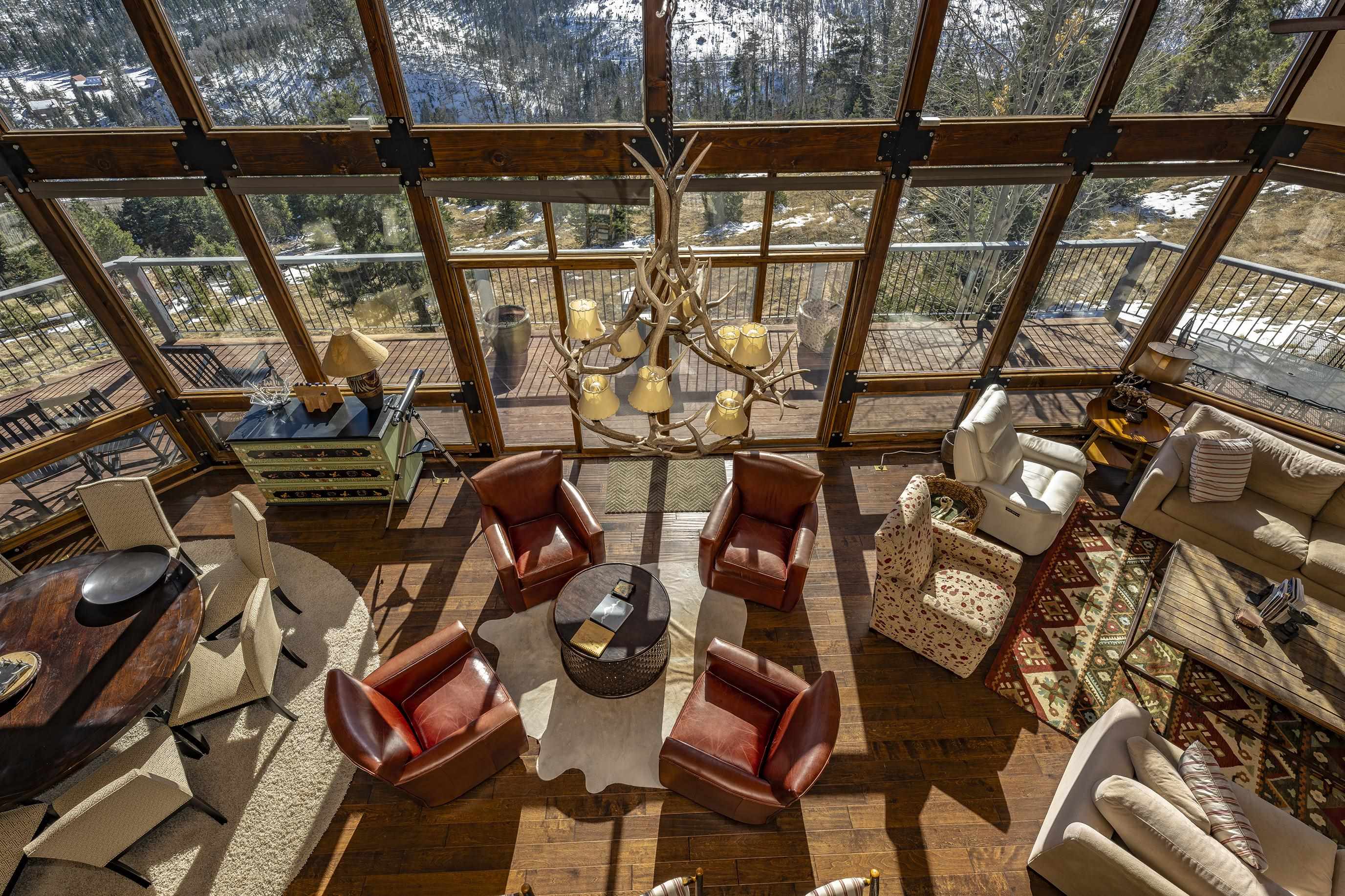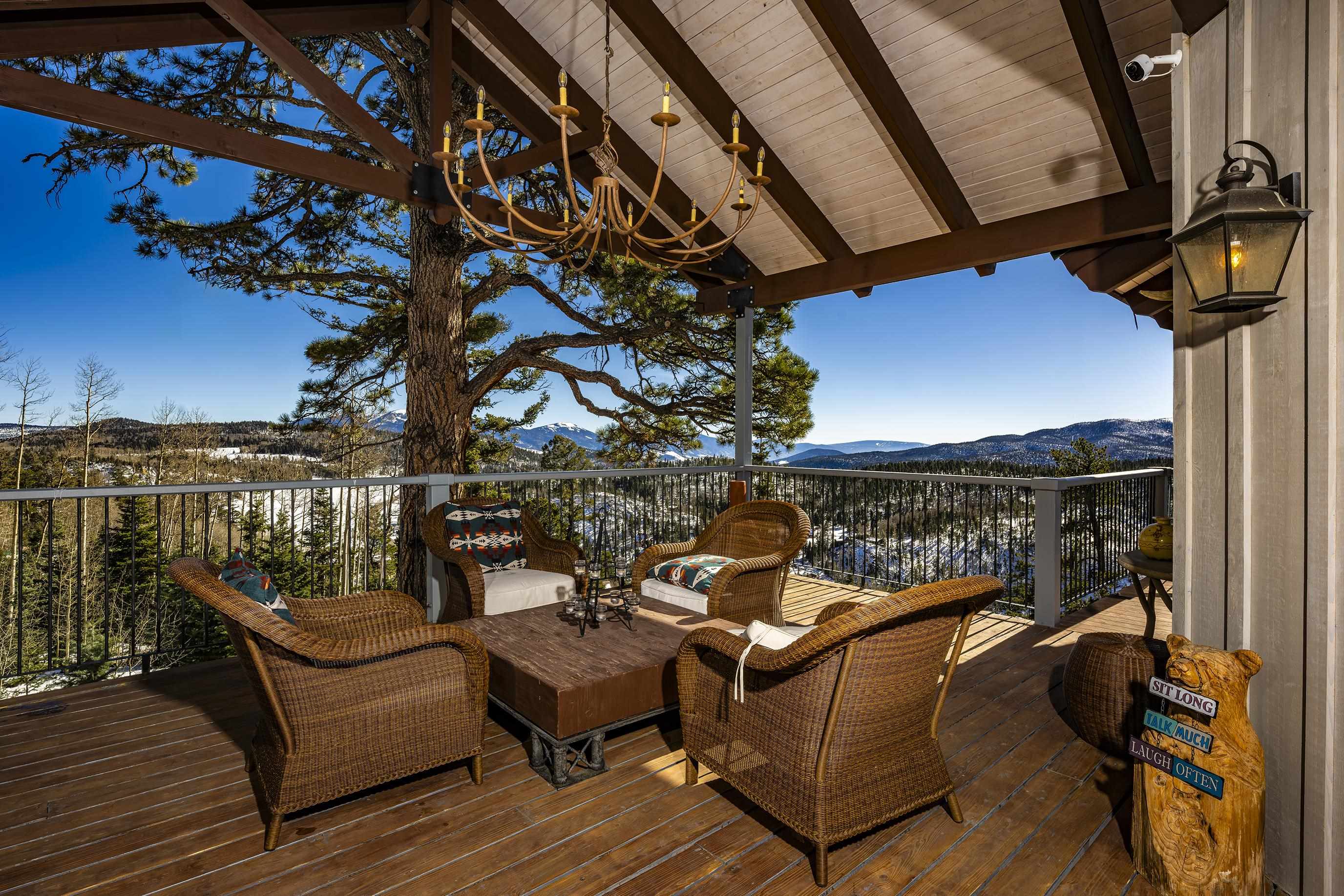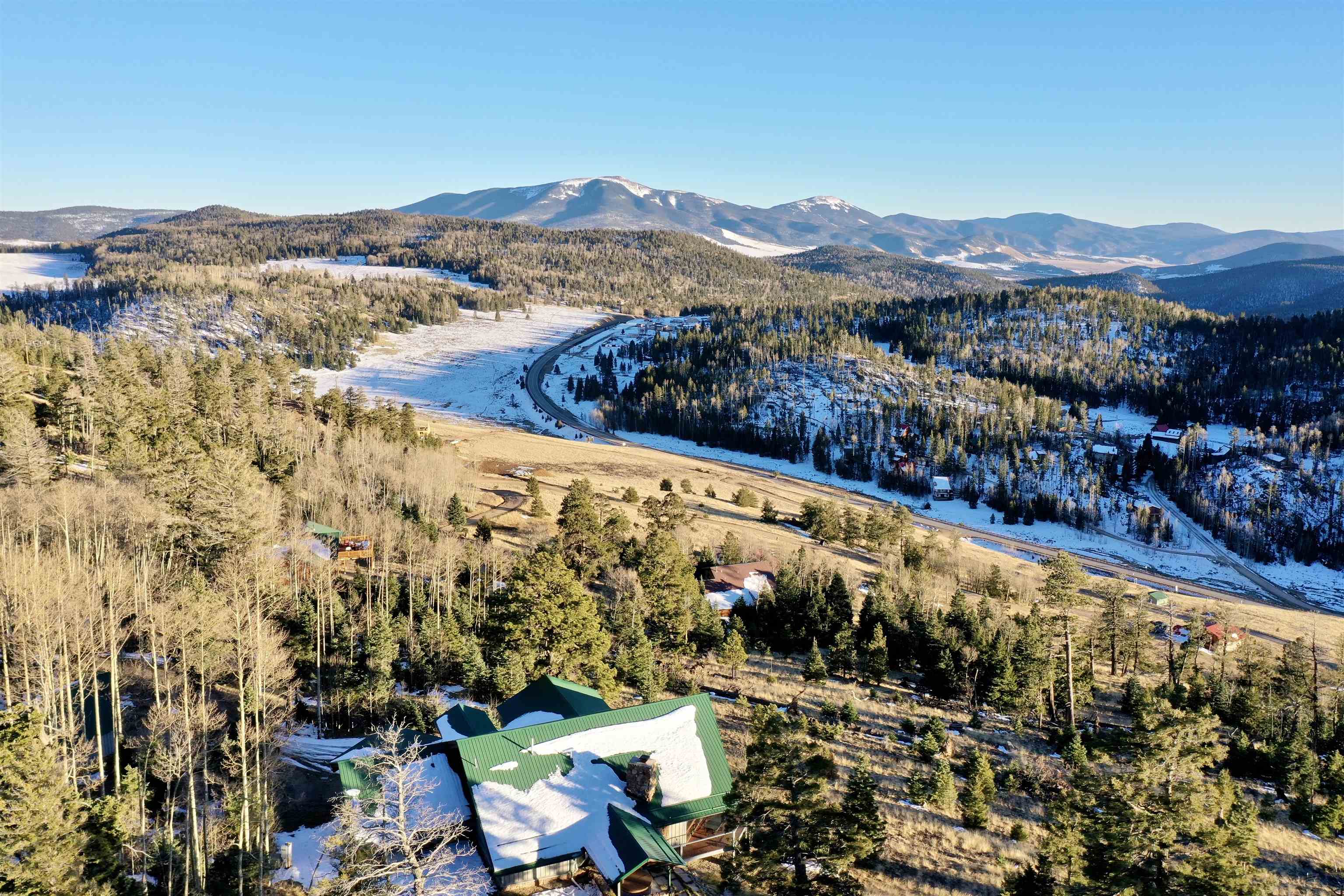 Set on nearly 5 acres of pristine mountain land, this exceptional luxury home offers breathtaking panoramic views of Wheeler Peak and Baldy Mountain. Just 5 minutes from Red River, this expansive residence seamlessly blends superior craftsmanship with the natural beauty of its surroundings, presenting a rare opportunity for the ultimate mountain lifestyle. The open-concept great room features soaring ceilings, a striking wet bar, and large windows that showcase the stunning views. The gourmet kitchen, with its sleek quartz countertops, flows effortlessly into the living area. Radiant floor heating ensures year-round comfort, while southern exposure allows for passive solar gain, flooding the home with natural light. The home offers two luxurious primary suites, each with oversized ensuite bathrooms and walk-in closets. One suite opens to a private hot tub, providing a peaceful retreat with sweeping mountain views. Additionally, a bunk room and a spacious loft offer plenty of room for family and guests. Outside, enjoy a private fire pit and expansive outdoor living areas—ideal for entertaining or unwinding under the stars. A studio guest house with an attached 4-car garage adds privacy for visitors or extended family. Fully furnished and ready to enjoy, this extraordinary mountain retreat combines privacy, luxury, and natural beauty—a perfect sanctuary for those seeking the finest in mountain living.