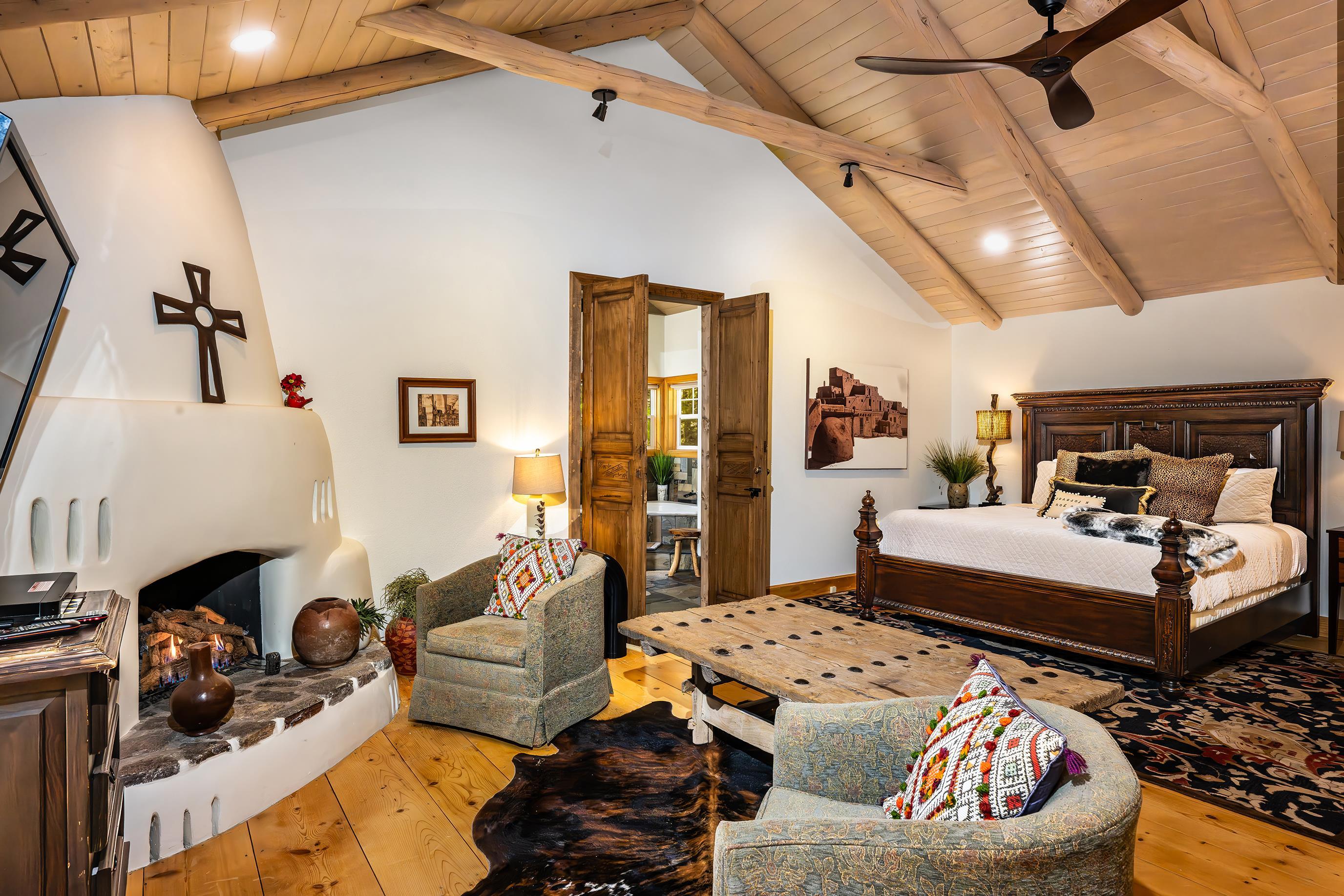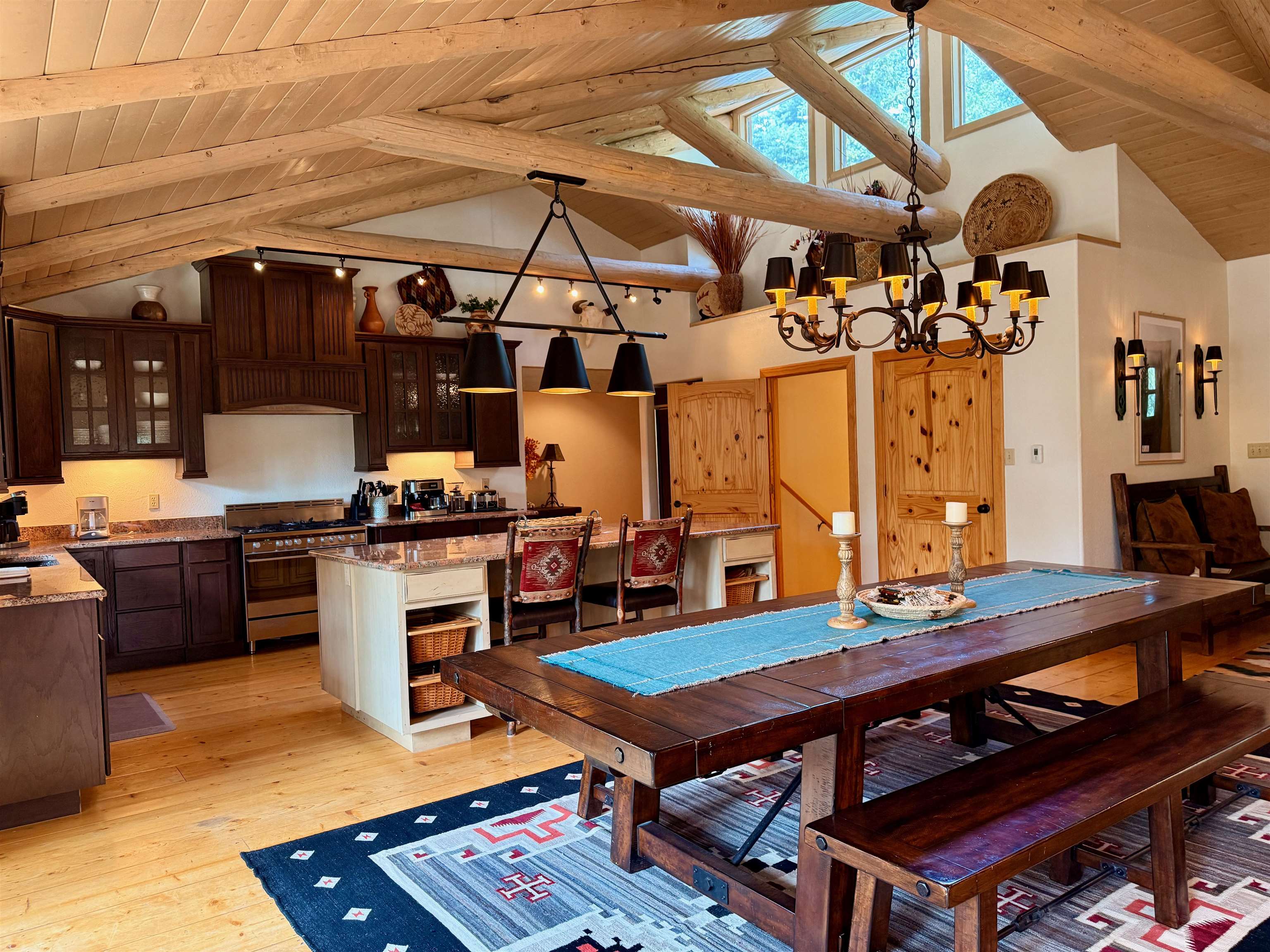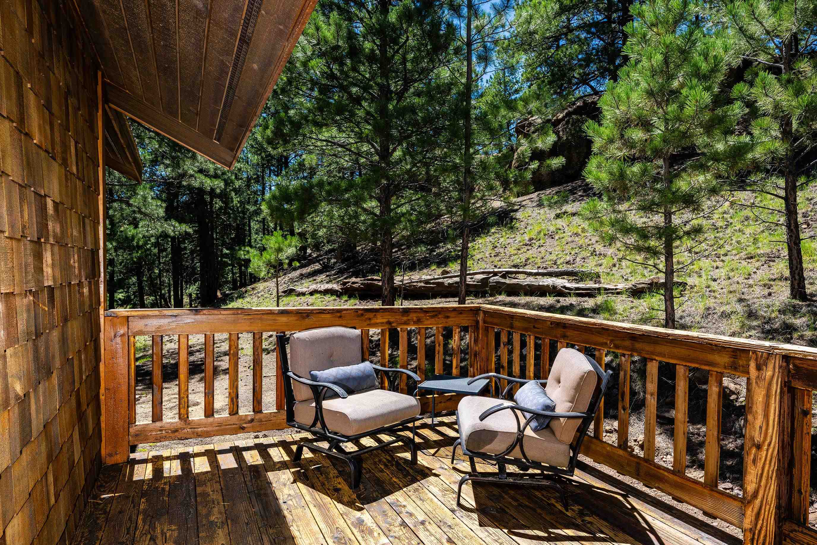 OFFERED FOR SALE...a truly beautiful mountain escape in the Village of Angel Fire, just off the Enchanted Circle of northern New Mexico in the southern Rocky Mountains. Ideally situated on 4 wooded acres in the Angel Fire Resort, known for its ski mountain, nationally recognized mountain bike terrain park, PGA-rated golf course and more. This lovely cabin-style mountain estate home is ready for ski season, Spring Break, Easter and beyond. Fully furnished and fully stocked, the 4300+ square foot home has it all. Having hosted Jimmy Buffet and the cast of Disney’s Lone Ranger among others, it can easily accommodate parties of 20+ yet is still cozy for you or the two of you and your large family. Angel Fire does not restrict the number of short-term rentals as do Taos and Santa Fe. Because of its easy all-weather access, this property can produce income year around. The lower level with its separate kitchen, high-capacity laundry room and separate entry can be locked off as a separate rental or opened to the rest of the house for family and friends. The very large Primary Suite with its soaring ceilings, has a fireplace, whirlpool tub, shower and private deck nestled into dramatic rock outcroppings. A wrap-around deck opening off the great room has a large outdoor fireplace for entertaining and a hot tub for relieving stress. Dual Bosch high-capacity tankless water heaters ensure plenty of hot water for 20+ people. Washers and dryers are on both levels. Recent renovations in 2021 added dramatic architectural details and high-grade insulation throughout the main floor keeping temperatures moderate year around. Fiber-optic internet is throughout the house, enabling working from home or making internet available to large groups of guests. Only minutes away to the Resort’s ski mountain and numerous other amenities, you can ski on your lunch hour. Angel Fire airport with its jet-capable runway for private aircraft is also only minutes away. Advanced Air, in December of 2024, began 5 weekly round-trip flights from Albuquerque. And now…the best for last… Angel Fire’s average summer temperature is 76 degrees with little to no humidity. No mosquitoes, chiggers, fleas and poisonous snakes.
