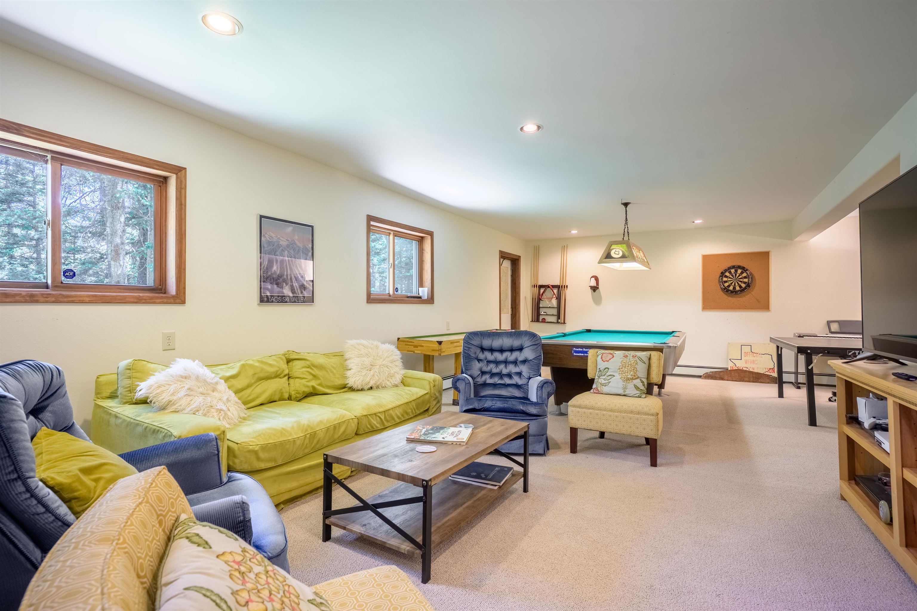 This beautiful A-frame home in Taos Ski Valley offers a world-class location, steps from the slopes. The main entrance leads you to the middle floor, which features a bright, updated kitchen with modern appliances and an open-plan living and dining area. From here, you can step out onto a large, covered west-facing deck. It's an ideal spot to enjoy the sound of the river and unwind after skiing in the winter, or to grill out in the summer. This floor also includes two well-appointed bedrooms that share a newly upgraded bathroom. On the top floor, you'll find two more bedrooms, a large laundry room, and another shared bathroom. The west-side bedroom on this floor also features a Juliet balcony with views of the Taos Ski Valley mountain peaks. Downstairs, there's an expansive family game room with multiple exterior doors that provide access to the surrounding grounds and an additional ground-floor deck. This level also includes two more bedrooms sharing a recently updated bathroom, along with the home’s mechanical room and other storage areas. Thoughtful lighting throughout makes this home feel bright, airy, and welcoming. There is ample storage for ski and sports equipment, as well as a large, well built, modern two-car covered parking area directly out front on Zap’s Road. This home is a perfect family retreat or a great rental property that can accommodate group bookings. Come enjoy all that Taos Ski Valley has to offer including skiing, snowboarding, hiking, horseback riding, rock climbing, shops, restaurant and MORE!