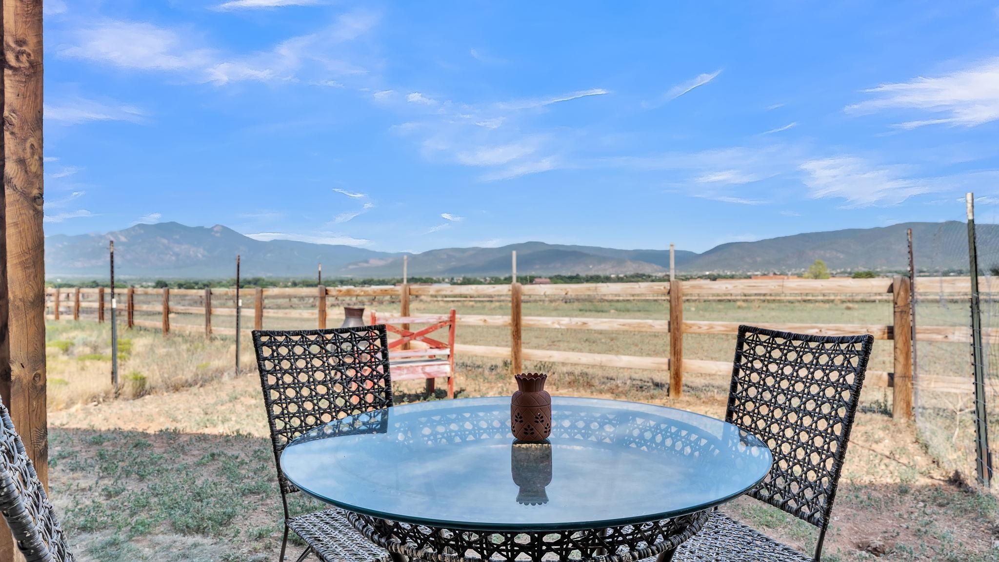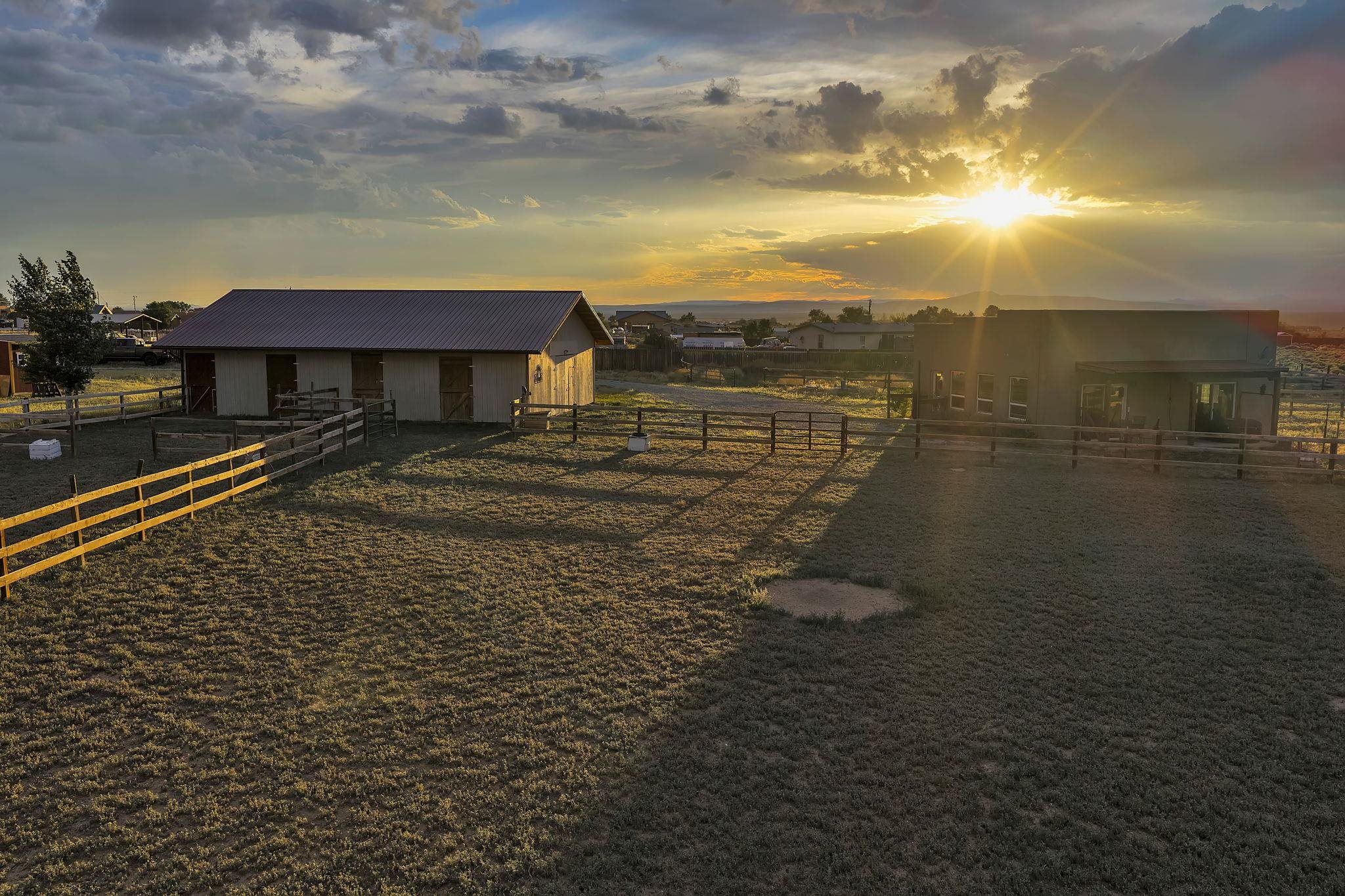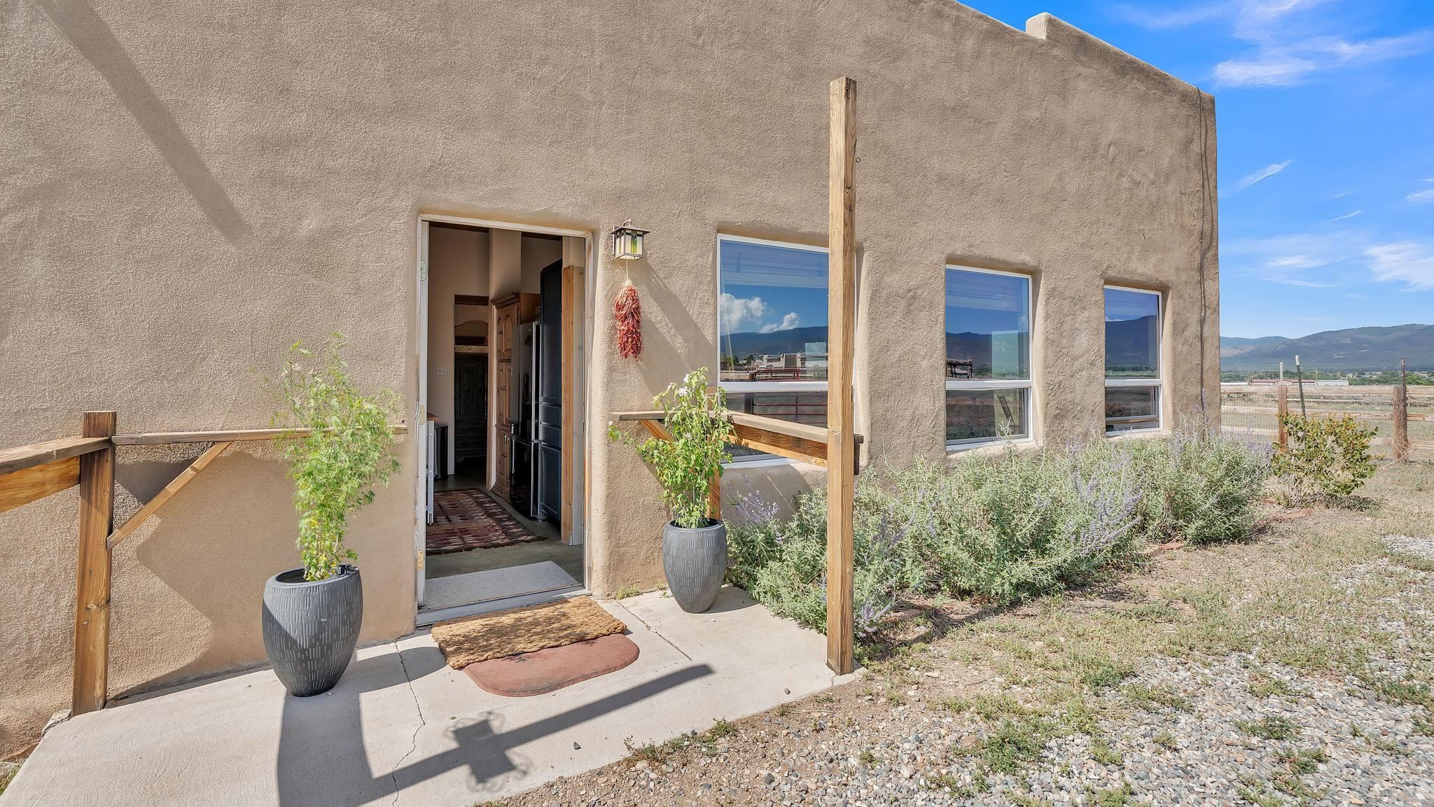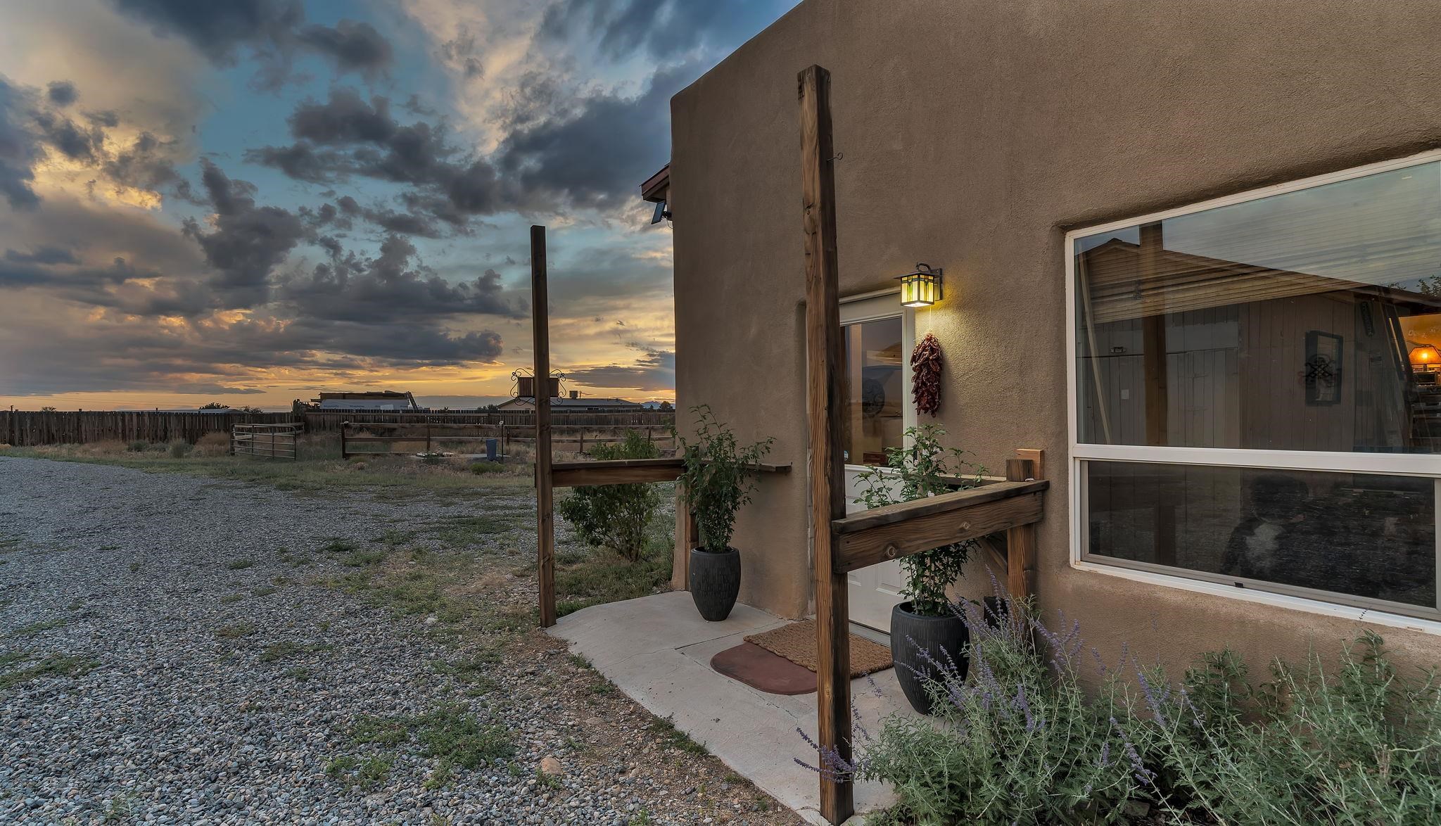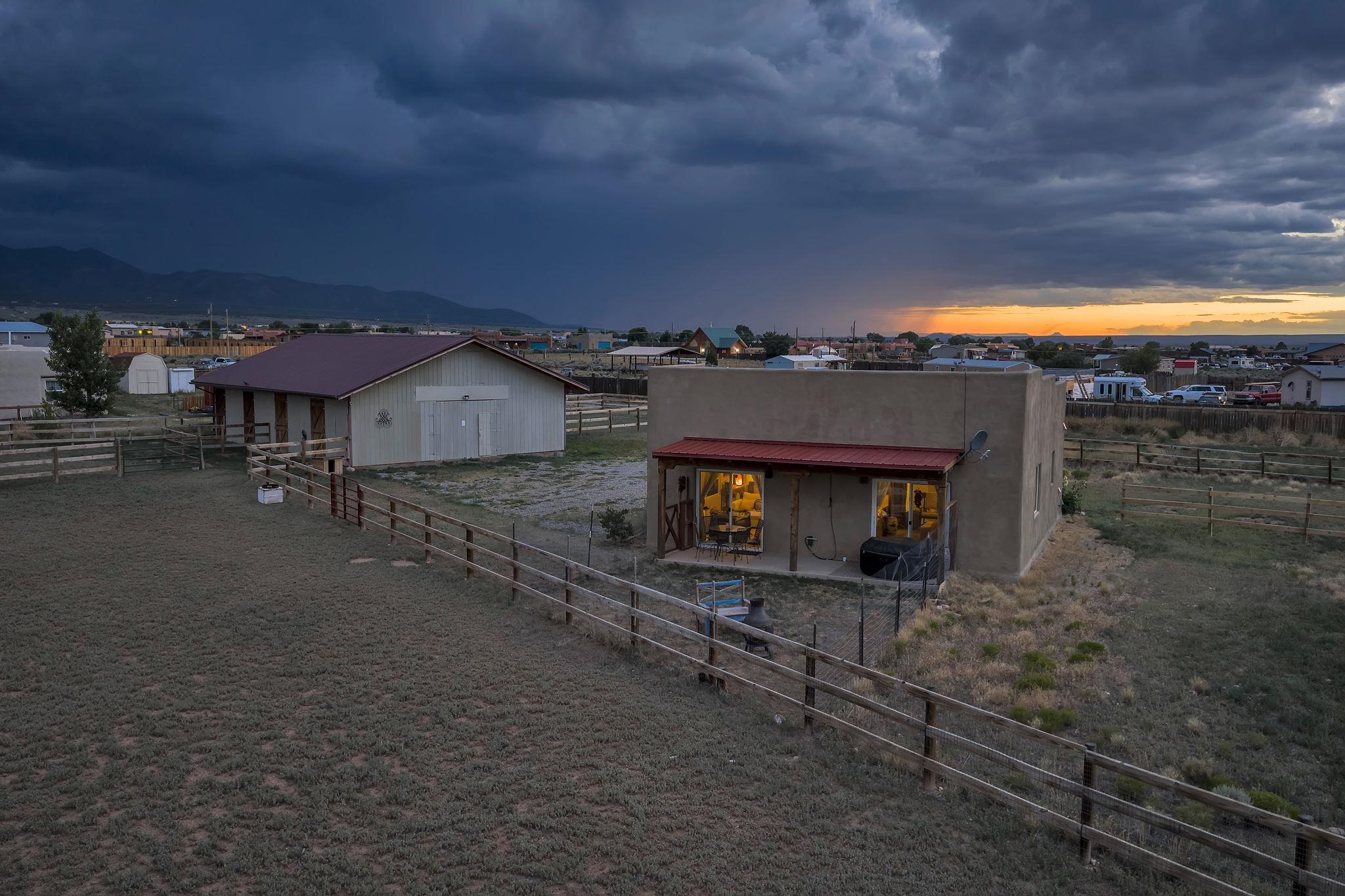 Magical Equestrian Property on the Llano Mesa in Taos ~ Here at 172 West Romero Road strategically perched up on the Llano Mesa, you will experience the perfect equestrian lifestyle at a stunning property, tailor-made for horse lovers and livestock owners. If you like to make some extra income as a short term rental, this residence also has you covered. Situated on 1.59 fenced acres, this unique home and stable offer a harmonious blend of comfortable living and top-tier amenities for you and your animals. The charming pueblo-style house is designed for efficiency and relaxation, with stunning indoor and outdoor views of our mountains and majestic sunsets or sunrises. The floor plan is wide-open with a combined living, kitchen, and sleeping area, along with a full bathroom and laundry space. Included is a cooling and heating mini split for comfort. You'll stay cozy all winter with in-floor radiant heating and passive solar heat from the sun, ensuring a warm and energy-efficient environment. The impressive 34x48 barn, constructed a few years ago with thoroughbreds in mind, is the centerpiece of this equestrian haven. It features six 12x12 stalls that can be easily converted to 12x24, each with exterior dutch doors leading to private turnouts. The barn also includes a dedicated tack room, a wash stall, and a spacious hay loft. The thoughtfully designed grounds include a 132x66 sand arena and four separate paddocks, all enclosed by secure stockade and 3-rail wooden fencing. With the entire property perimeter fenced and gated, your animals have ample space to roam freely and safely. Even the wildlife love this property as you might experience frequent bluebirds, hummingbirds, and foxes hanging out under an occasional dreamy double rainbow. This property minutes from Central Taos, and a close proximity to nature, is a one-of-a-kind find for both you and your animals under the big New Mexico sky.