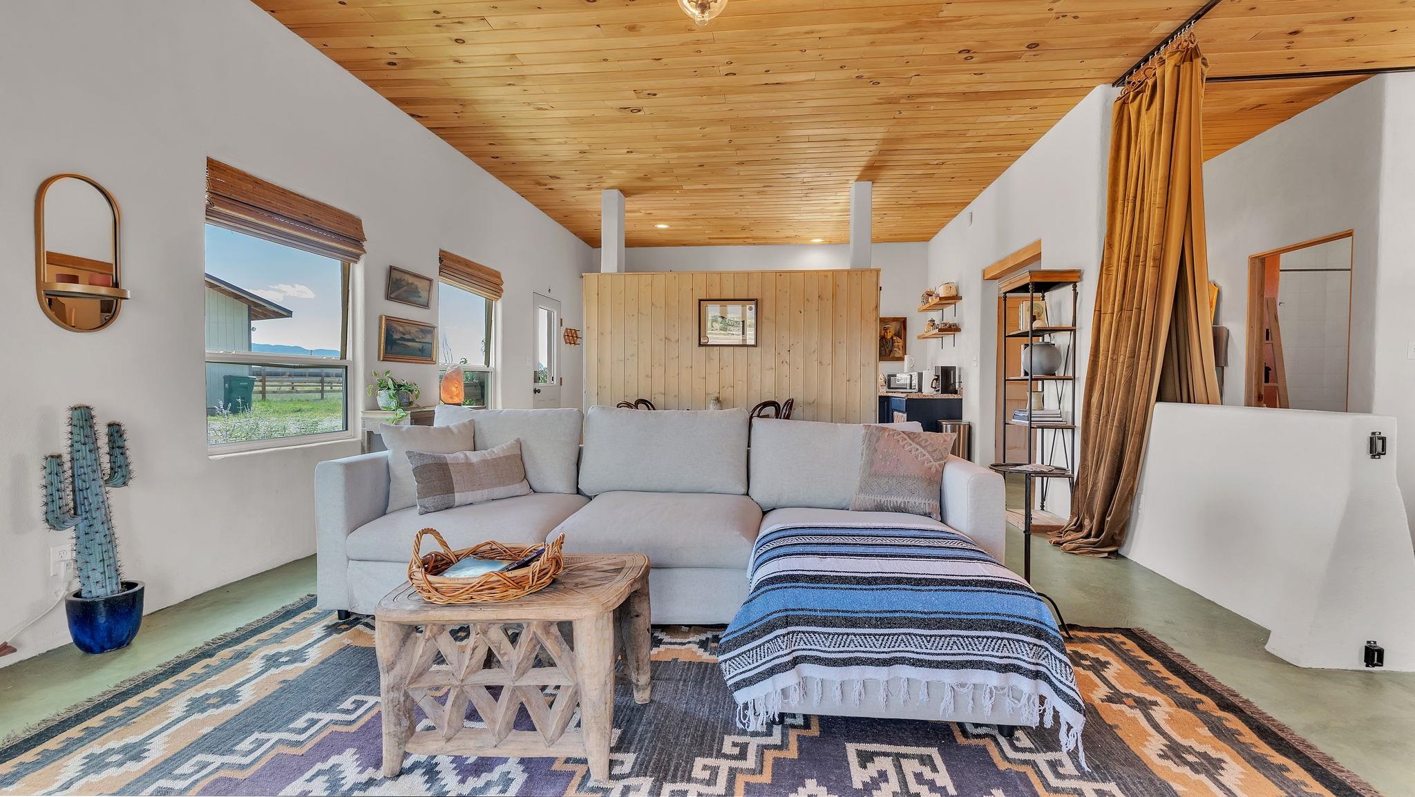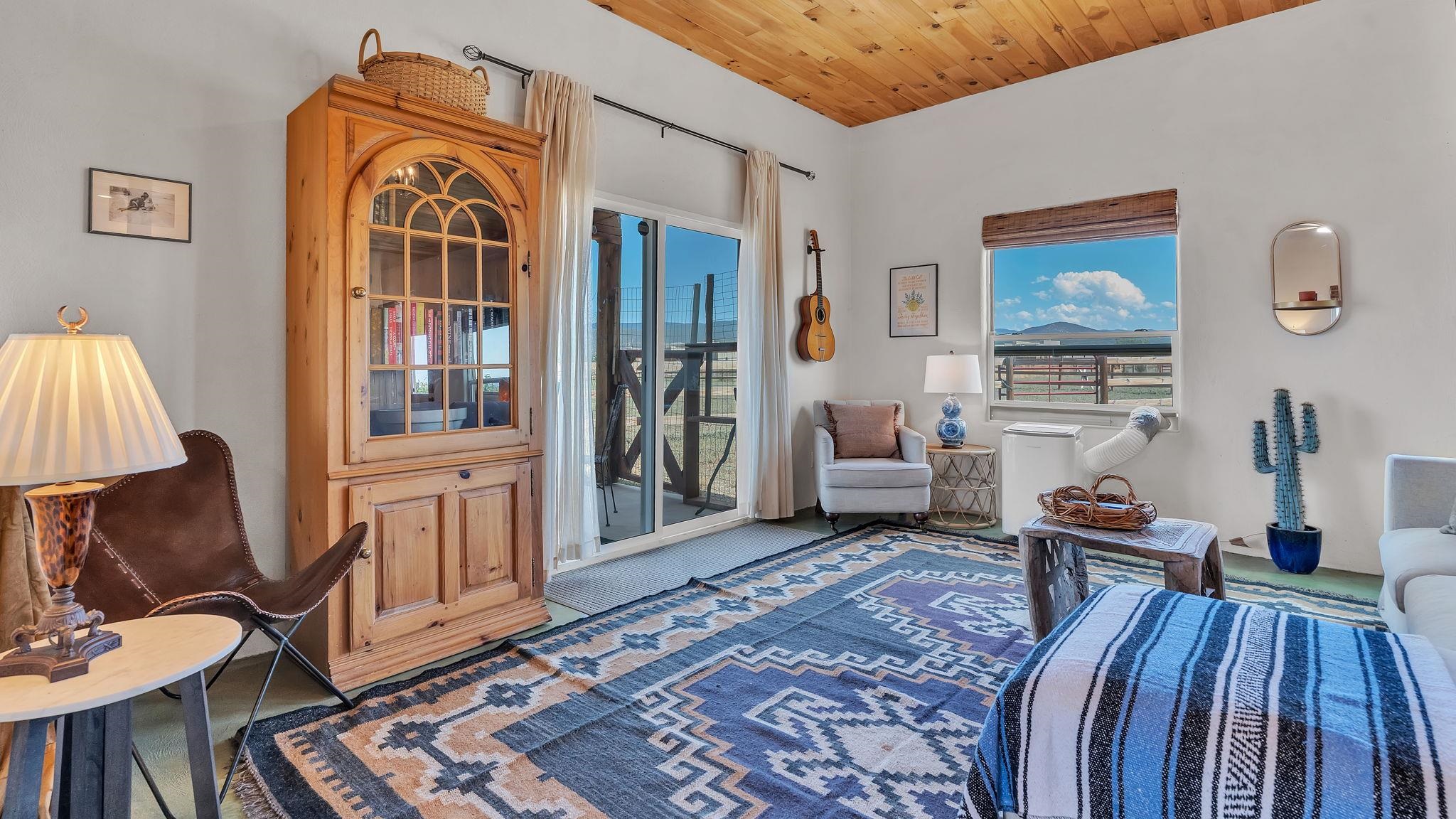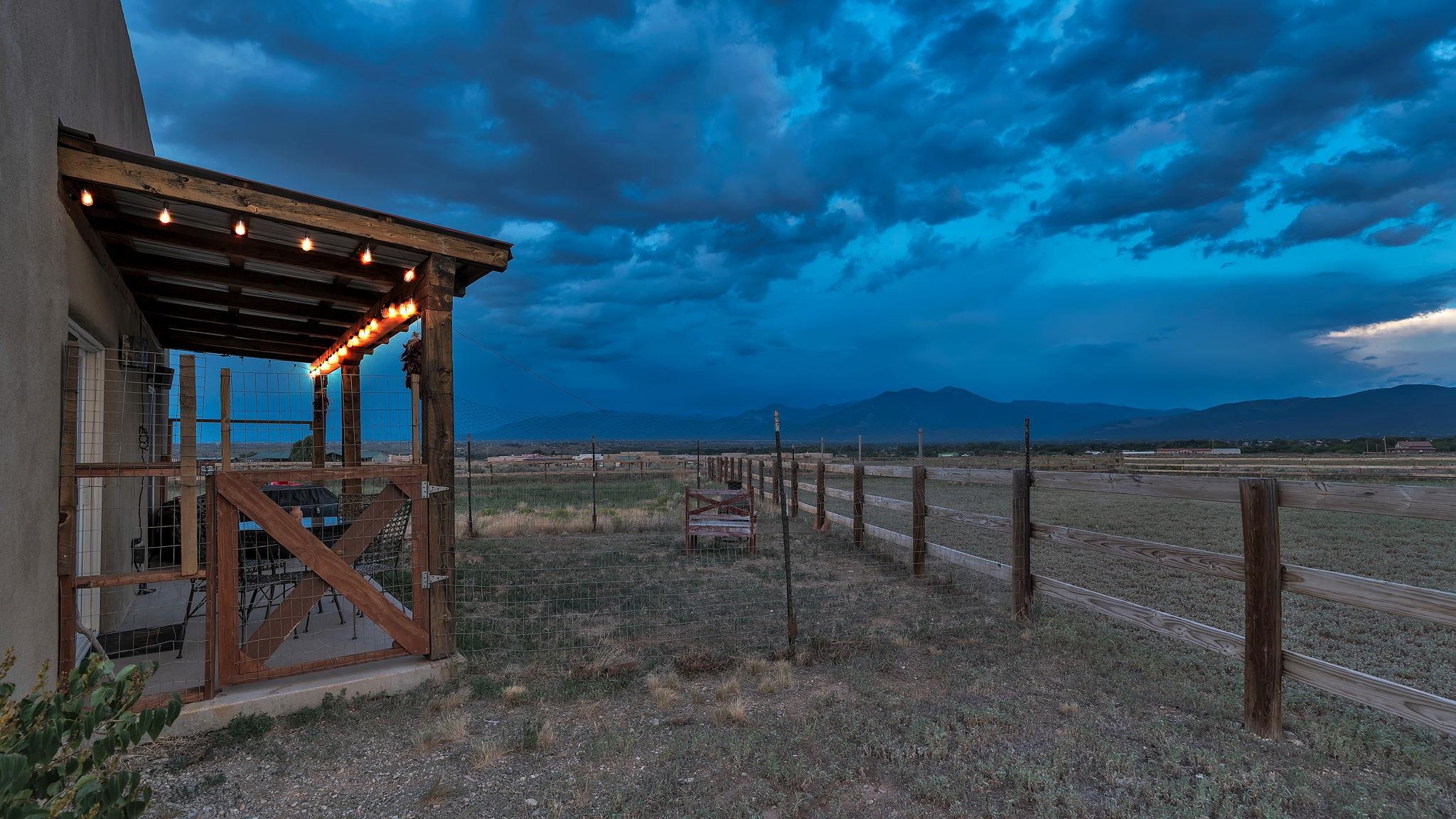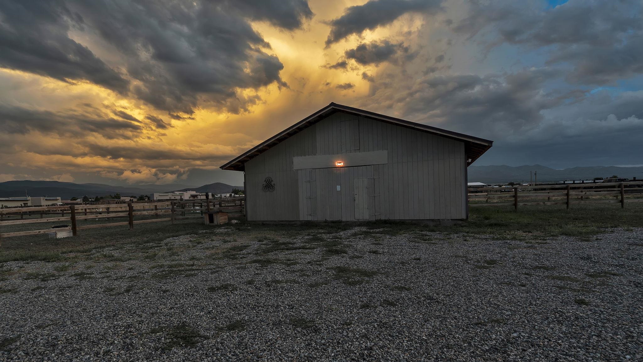 Magical Equestrian Property on the Llano Mesa in Taos ~ Here at 172 West Romero Road strategically perched up on the Llano Mesa, you will experience the perfect equestrian lifestyle at a stunning property, tailor-made for horse lovers and livestock owners. If you like to make some extra income as a short term rental, this residence also has you covered. Situated on 1.59 fenced acres, this unique home and stable offer a harmonious blend of comfortable living and top-tier amenities for you and your animals. The charming pueblo-style house is designed for efficiency and relaxation, with stunning indoor and outdoor views of our mountains and majestic sunsets or sunrises. The floor plan is wide-open with a combined living, kitchen, and sleeping area, along with a full bathroom and laundry space. Included is a cooling and heating mini split for comfort. You'll stay cozy all winter with in-floor radiant heating and passive solar heat from the sun, ensuring a warm and energy-efficient environment. The impressive 34x48 barn, constructed a few years ago with thoroughbreds in mind, is the centerpiece of this equestrian haven. It features six 12x12 stalls that can be easily converted to 12x24, each with exterior dutch doors leading to private turnouts. The barn also includes a dedicated tack room, a wash stall, and a spacious hay loft. The thoughtfully designed grounds include a 132x66 sand arena and four separate paddocks, all enclosed by secure stockade and 3-rail wooden fencing. With the entire property perimeter fenced and gated, your animals have ample space to roam freely and safely. Even the wildlife love this property as you might experience frequent bluebirds, hummingbirds, and foxes hanging out under an occasional dreamy double rainbow. This property minutes from Central Taos, and a close proximity to nature, is a one-of-a-kind find for both you and your animals under the big New Mexico sky.