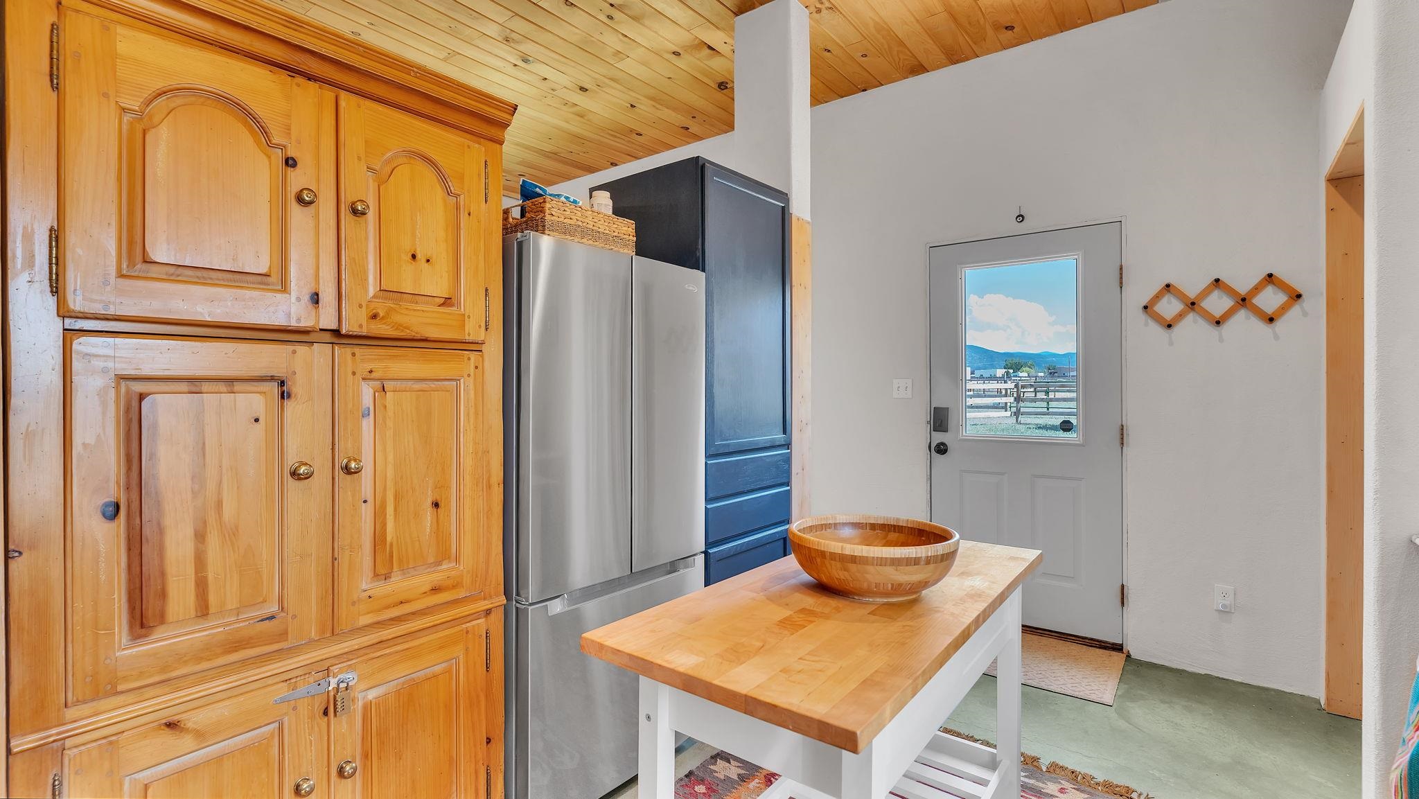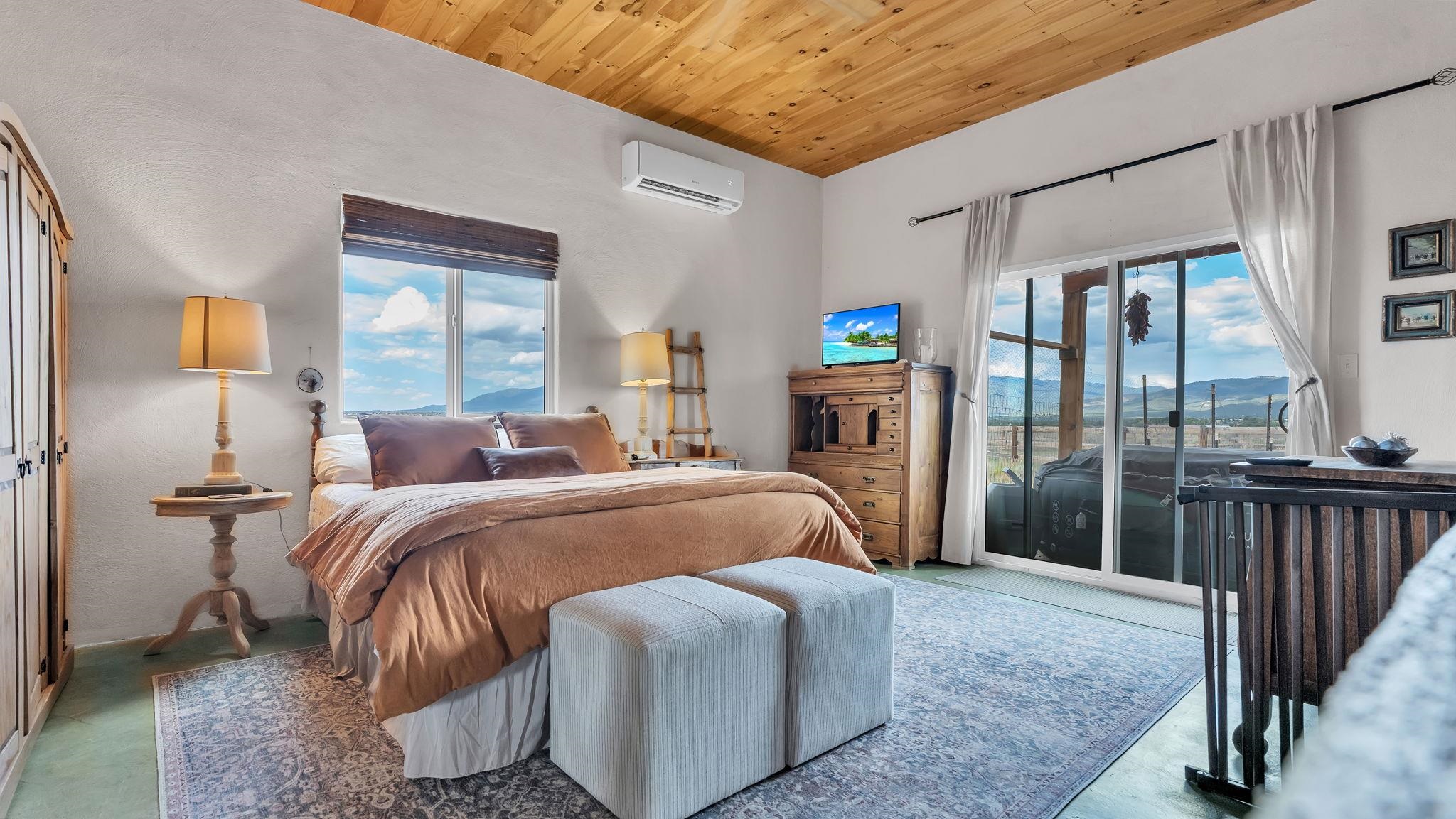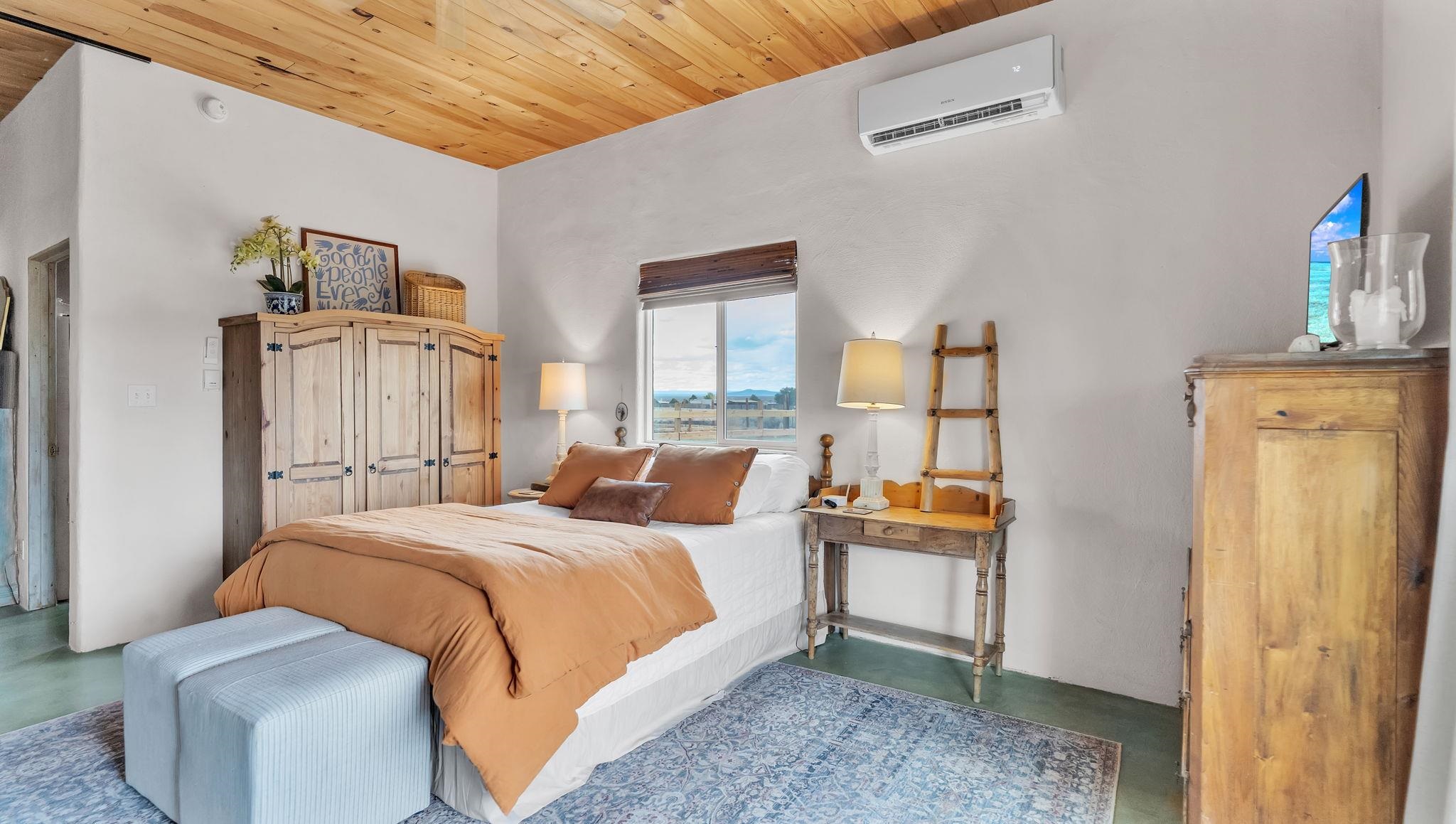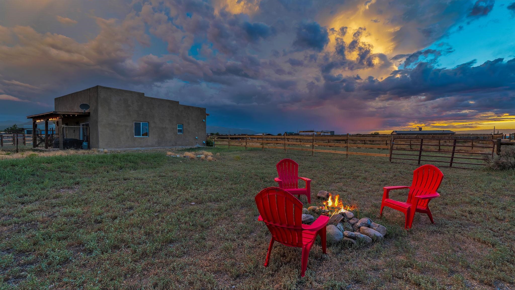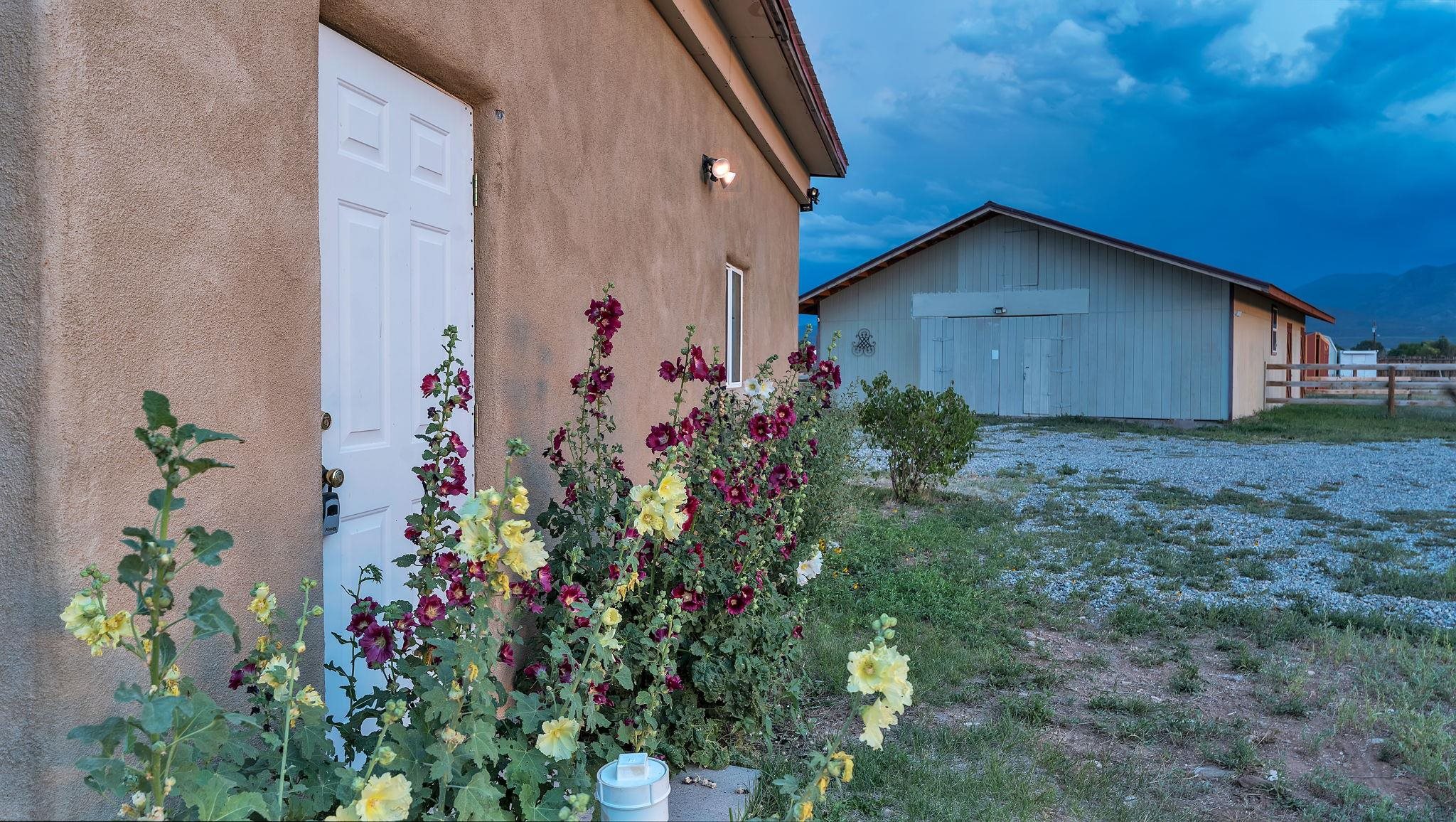 Magical Equestrian Property on the Llano Mesa in Taos ~ Here at 172 West Romero Road strategically perched up on the Llano Mesa, you will experience the perfect equestrian lifestyle at a stunning property, tailor-made for horse lovers and livestock owners. If you like to make some extra income as a short term rental, this residence also has you covered. Situated on 1.59 fenced acres, this unique home and stable offer a harmonious blend of comfortable living and top-tier amenities for you and your animals. The charming pueblo-style house is designed for efficiency and relaxation, with stunning indoor and outdoor views of our mountains and majestic sunsets or sunrises. The floor plan is wide-open with a combined living, kitchen, and sleeping area, along with a full bathroom and laundry space. Included is a cooling and heating mini split for comfort. You'll stay cozy all winter with in-floor radiant heating and passive solar heat from the sun, ensuring a warm and energy-efficient environment. The impressive 34x48 barn, constructed a few years ago with thoroughbreds in mind, is the centerpiece of this equestrian haven. It features six 12x12 stalls that can be easily converted to 12x24, each with exterior dutch doors leading to private turnouts. The barn also includes a dedicated tack room, a wash stall, and a spacious hay loft. The thoughtfully designed grounds include a 132x66 sand arena and four separate paddocks, all enclosed by secure stockade and 3-rail wooden fencing. With the entire property perimeter fenced and gated, your animals have ample space to roam freely and safely. Even the wildlife love this property as you might experience frequent bluebirds, hummingbirds, and foxes hanging out under an occasional dreamy double rainbow. This property minutes from Central Taos, and a close proximity to nature, is a one-of-a-kind find for both you and your animals under the big New Mexico sky.
