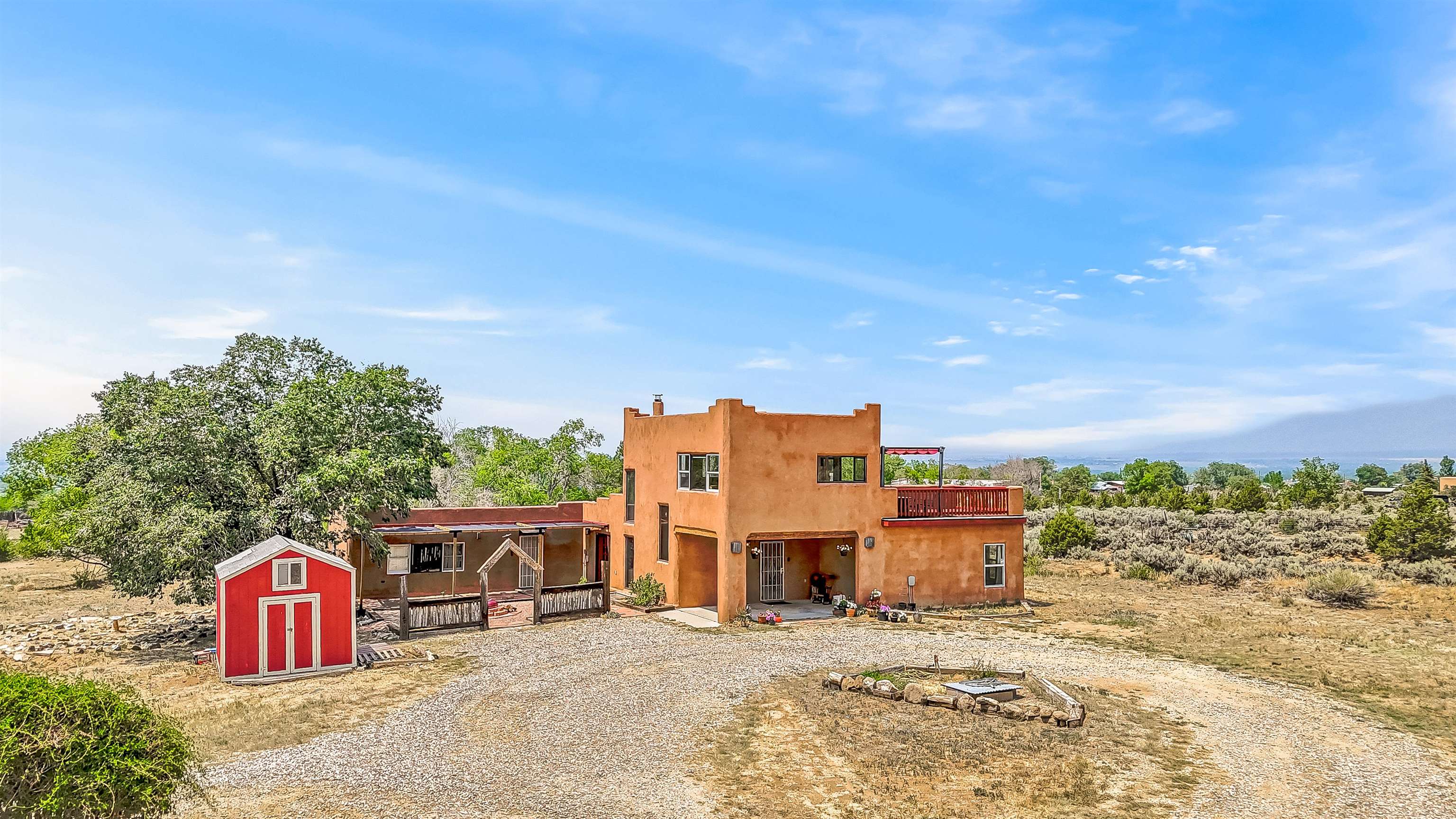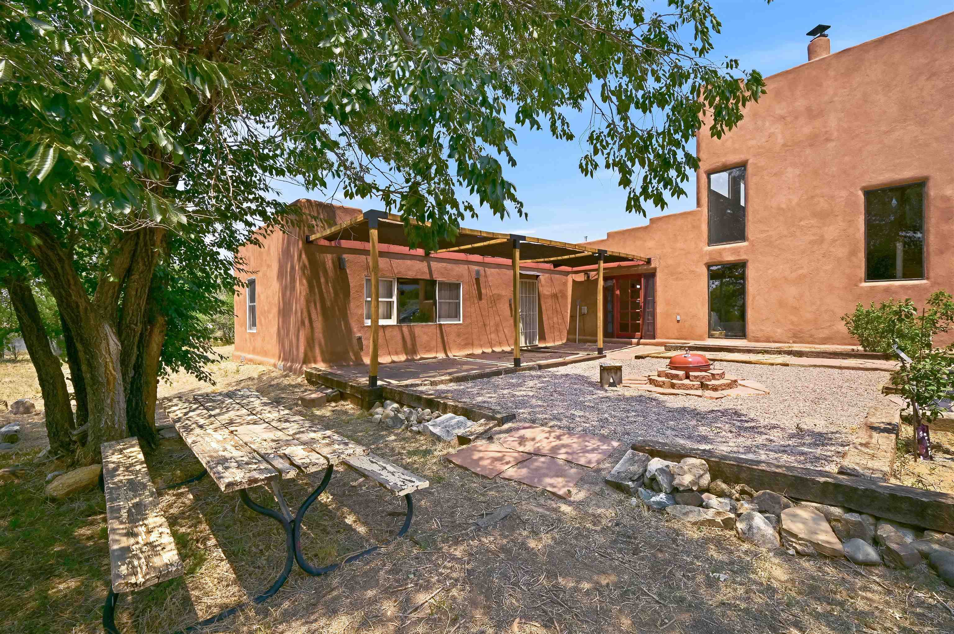 Discover a Unique Taos Living and Investment Opportunity! Nestled in Ranchos de Taos, just outside town limits, this exceptional property offers a serene lifestyle combined with a positive, steady rental income. You'll be living in a peaceful neighborhood, yet just 4 miles from Taos Plaza, a half-mile from Holy Cross Hospital, and moments from the Weimer Foothills trails. This unique offering includes four total units. The owner-occupied main home features an open living, dining, and kitchen area with clerestory windows and a loft. The cozy kiva fireplace, a two-story chimney before a sunken living area, was crafted by renowned artisan Carmen Velarde and inspired by the iconic Taos Inn. Enjoy abundant natural light and an upstairs loft/studio with a large second-story viewing deck offering breathtaking mountain views, including Taos Mountain, and stretching all the way to Colorado – perfect for watching spectacular sunsets and stargazing. The main home was beautifully remodeled in 2018, with upgraded bathroom, kitchen flooring, and cabinets, and the outdoor area was enhanced in 2023. Beyond the main residence, you'll find an extended owner's suite that has been partitioned as a studio rental, a separate 1-bedroom, 1-bathroom guest house, and a truly special adobe studio/chapel. This studio, a replica of a church chancel, was originally built for artist Fr. William Hart McNichols by master adobe builder Trini Velarde. Constructed with traditional adobes, mud floors, and vigas painted with natural plant dyes, this studio remains cool in summer and remarkably warm in winter. This is more than just a home; it's an incredible investment opportunity to own a piece of Taos's rich artistic and building heritage with established rental income.
