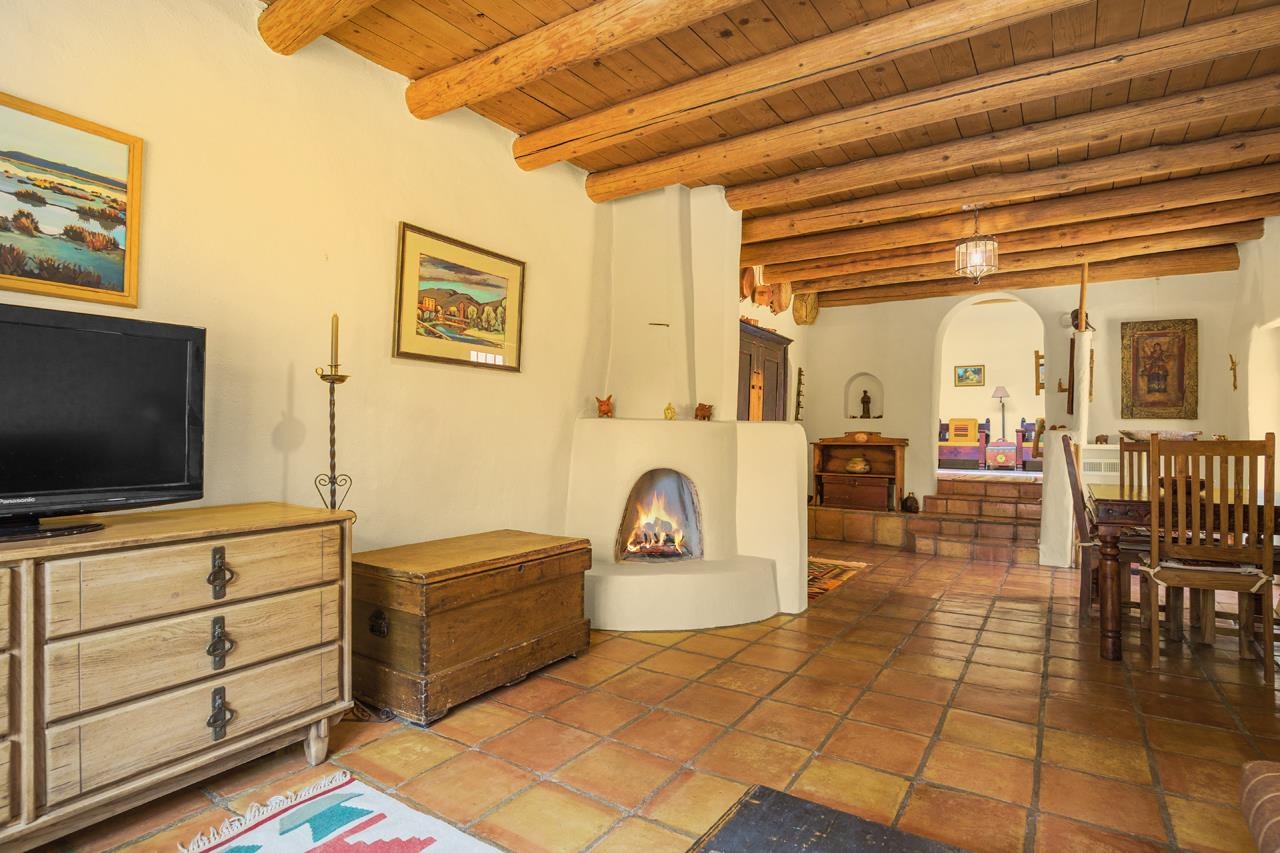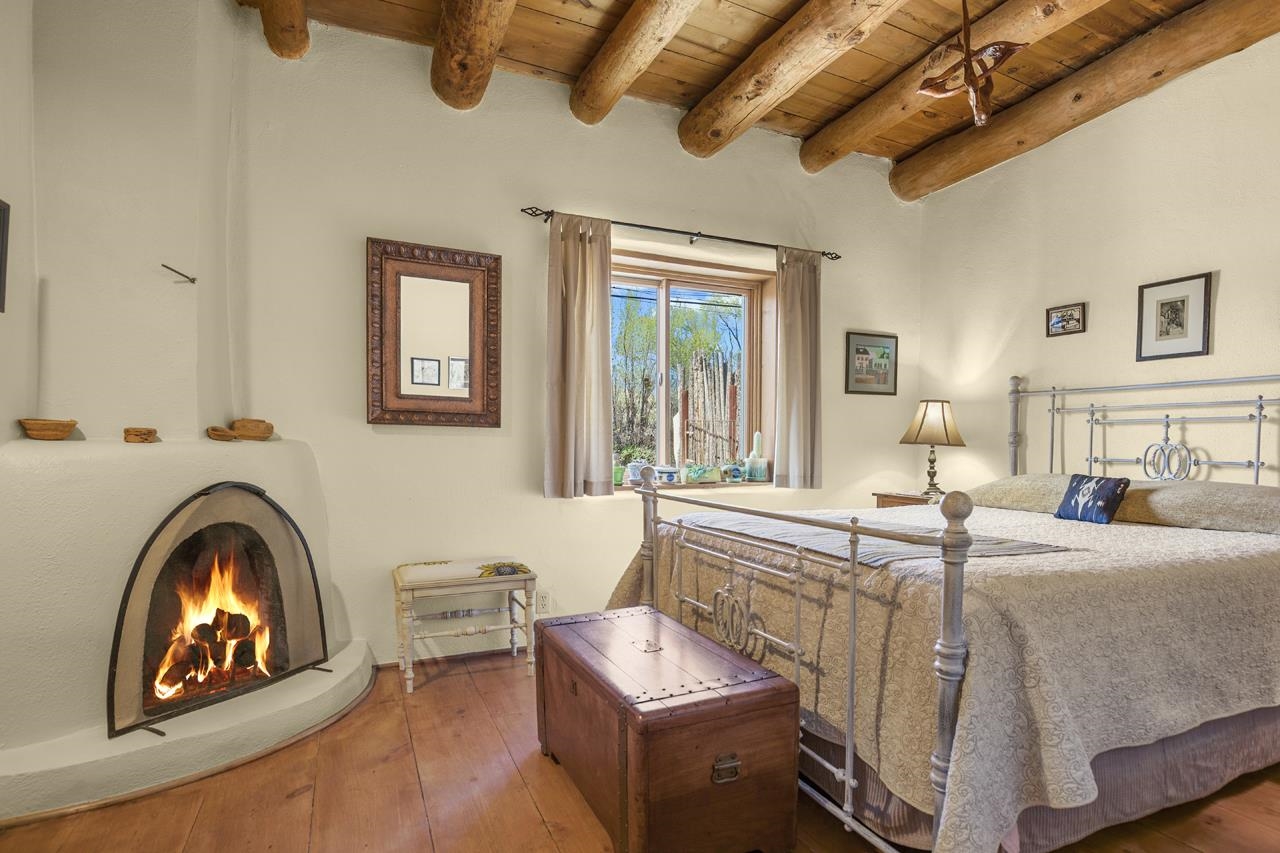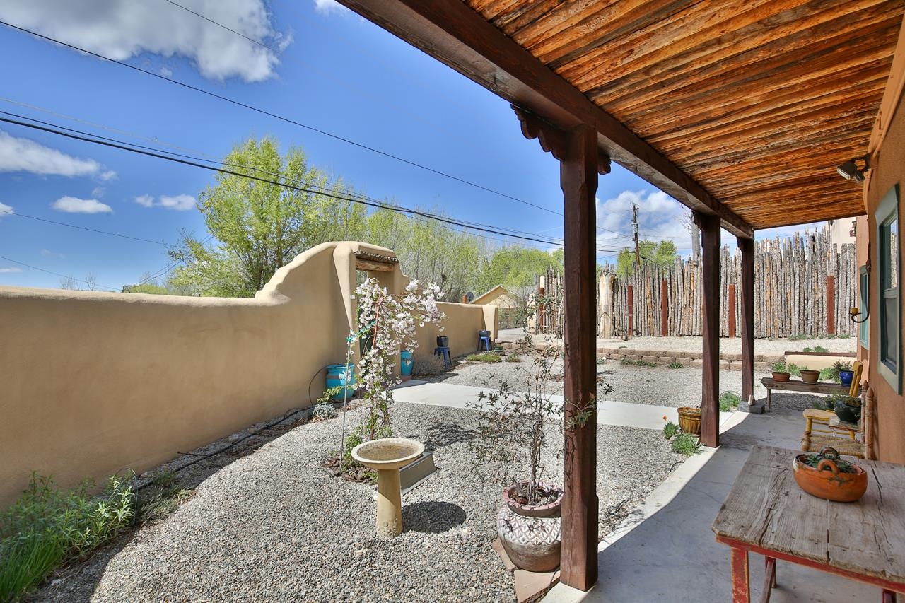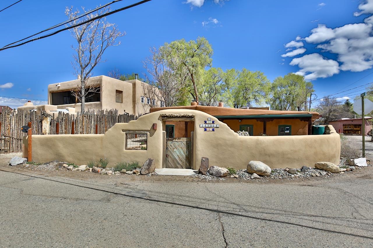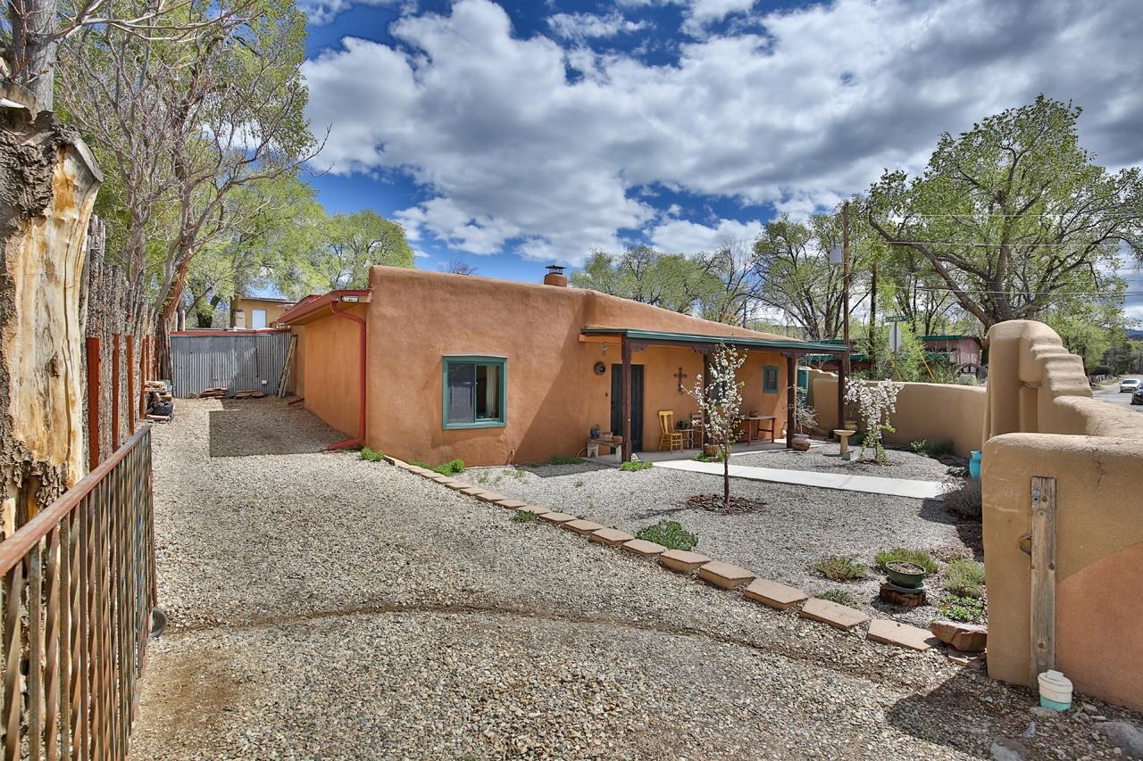 Enchanting, authentic adobe home in the historic neighborhood by the Ranchos de Taos Plaza. This tastefully renovated 2-bedroom + extra room/2-bath home offers classic Taos "character" throughout: saltillo tile and wide-plank wood floors; ceilings with hand-hewn viga beams; a mixture of latillas, tongue & groove, and coved plaster in the spaces between the beams; 3 "beehive" wood-burning fireplaces for cozy warmth and ambiance; colorful porcelain Mexican tiles in kitchen and baths; nichos and bancos; hand-plastered walls. The thick adobe walls are naturally insulating and sound-attenuating (it's so quiet inside), and they keep the house cool in summer and warm in winter. The efficient galley kitchen looks out onto honeysuckle-covered grillwork. The appliances are only a few years old. The extra room is currently set up as a library/den but it could be a third bedroom. It features a fireplace, south-facing clerestory window, a large closet/storage space behind rustic wood doors,and a built-in desk and antique library drawers. The rear courtyard is completely enclosed by adobe walls, offering a wonderful setting for outdoor living and entertaining. There are fruit trees (peach, plum, pear), a concrete slab for cooking and dining, and a banco for extra seating. Inside the adobe wall along Valerio Road, the front yard includes a traditional "portal" and a xeriscaped yard with cherry and weeping crabapple trees, and native water-wise perennial plants which attract birds (especially hummingbirds) and bees. The driveway next to the house can accommodate 2-3 vehicles. The property also includes a parking area directly across Valerio Road; it can handle another3-4 vehicles. The original part of the home is thought to date from the late 1800's. Situated in a traditional Taos neighborhood, walking distance to historic San Francisco de Asis church, a couple of restaurants, galleries, a coffee shop, and the post office. Located less than 4 miles from Taos Plaza, near traditional agricultural fields and acequias (irrigation ditches) coming from the Rio Grande del Rancho. In 2023, the owners had a new Brai-type (modified Bitumen) roof installed over the living-dining portion of the house. The remainder of the roof is metal. Rain gutters were installed in 2021. The entire interior and the wood exterior trim was repainted in 2025. The wood floors were recently refinished. Note: Many of the fine furnishings are available separately. Any documents included with this listing are provided as a courtesy only. Buyer should rely on documents provided with title commitment. Neither the Listing Broker nor Seller warrant the square footage of the home or the acreage of the property. If the size of the home or the property acreage is of material concern to Buyer, then Buyer should have it measured and/or surveyed. The fires depicted in the fireplaces are virtually included.