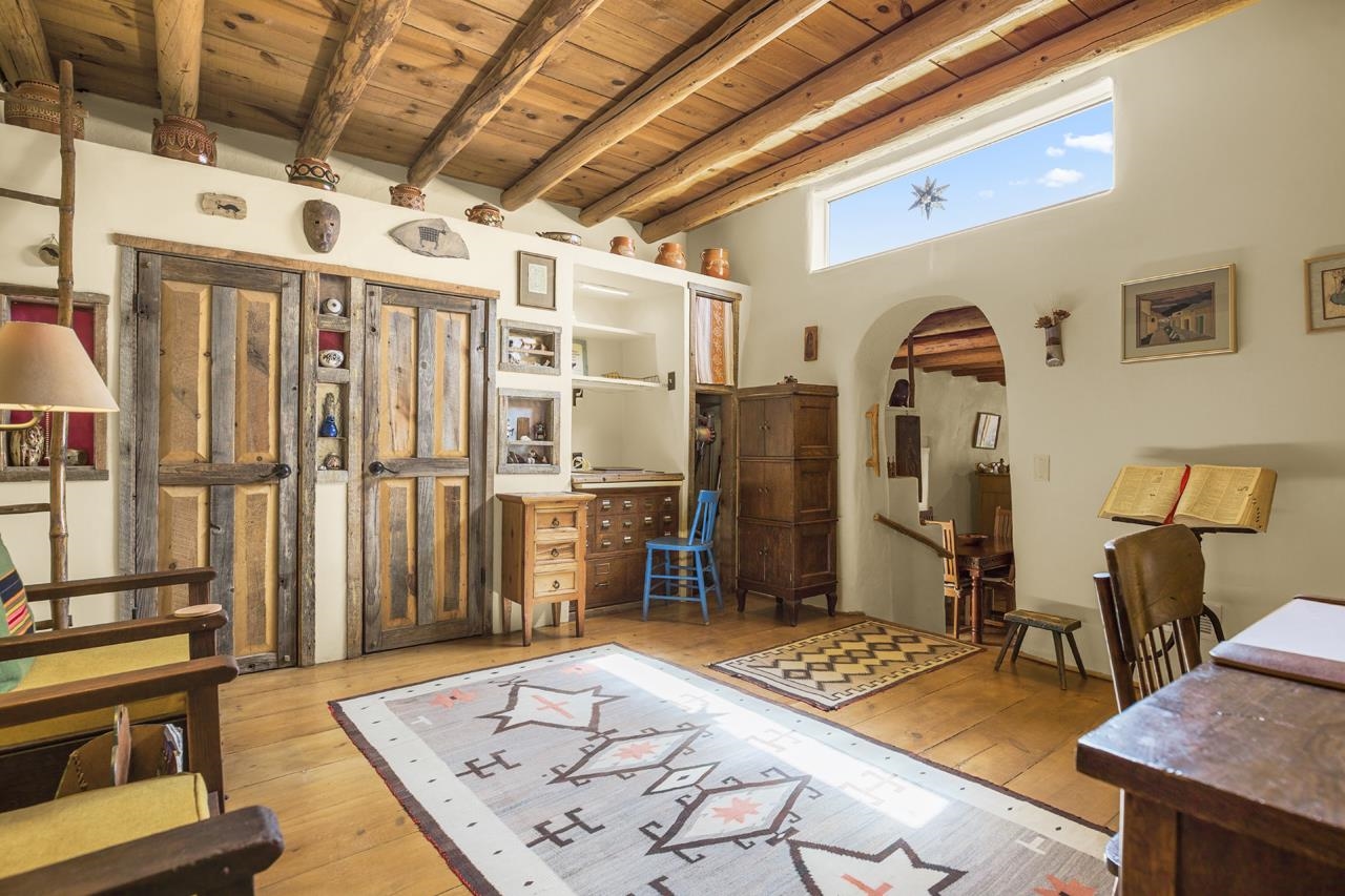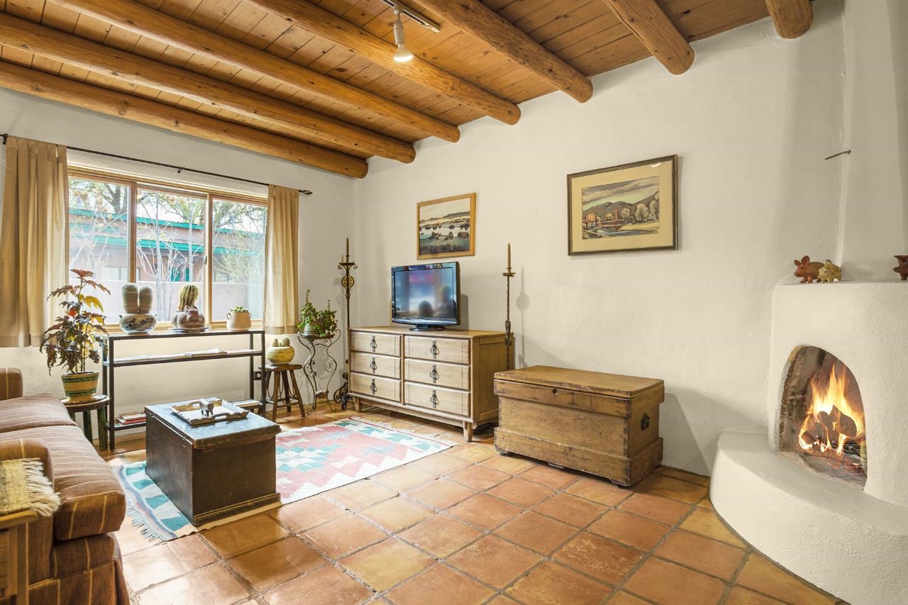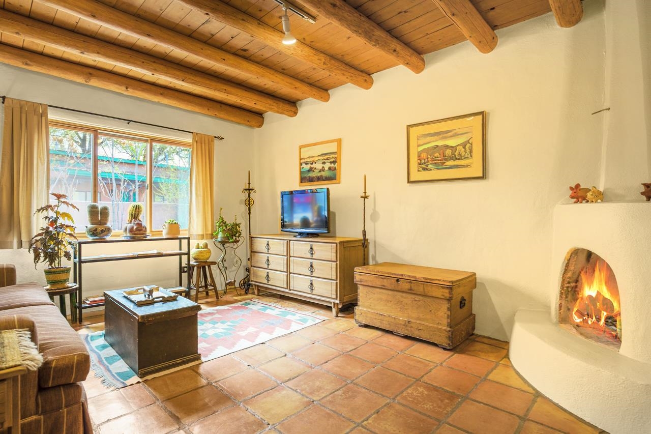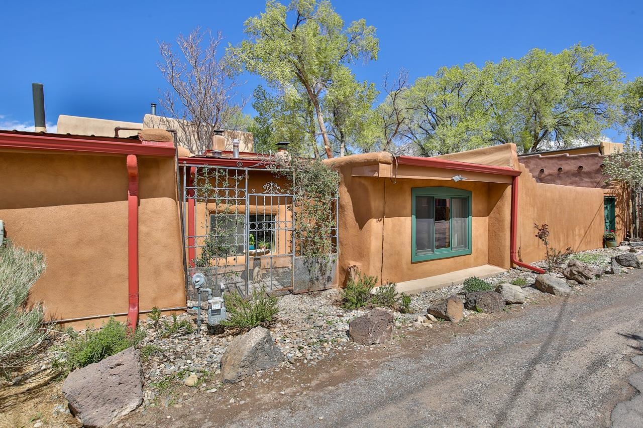 Enchanting, authentic adobe home in the historic neighborhood by the Ranchos de Taos Plaza. This tastefully renovated 2-bedroom + extra room/2-bath home offers classic Taos "character" throughout: saltillo tile and wide-plank wood floors; ceilings with hand-hewn viga beams; a mixture of latillas, tongue & groove, and coved plaster in the spaces between the beams; 3 "beehive" wood-burning fireplaces for cozy warmth and ambiance; colorful porcelain Mexican tiles in kitchen and baths; nichos and bancos; hand-plastered walls. The thick adobe walls are naturally insulating and sound-attenuating (it's so quiet inside), and they keep the house cool in summer and warm in winter. The efficient galley kitchen looks out onto honeysuckle-covered grillwork. The appliances are only a few years old. The extra room is currently set up as a library/den but it could be a third bedroom. It features a fireplace, south-facing clerestory window, a large closet/storage space behind rustic wood doors,and a built-in desk and antique library drawers. The rear courtyard is completely enclosed by adobe walls, offering a wonderful setting for outdoor living and entertaining. There are fruit trees (peach, plum, pear), a concrete slab for cooking and dining, and a banco for extra seating. Inside the adobe wall along Valerio Road, the front yard includes a traditional "portal" and a xeriscaped yard with cherry and weeping crabapple trees, and native water-wise perennial plants which attract birds (especially hummingbirds) and bees. The driveway next to the house can accommodate 2-3 vehicles. The property also includes a parking area directly across Valerio Road; it can handle another3-4 vehicles. The original part of the home is thought to date from the late 1800's. Situated in a traditional Taos neighborhood, walking distance to historic San Francisco de Asis church, a couple of restaurants, galleries, a coffee shop, and the post office. Located less than 4 miles from Taos Plaza, near traditional agricultural fields and acequias (irrigation ditches) coming from the Rio Grande del Rancho. In 2023, the owners had a new Brai-type (modified Bitumen) roof installed over the living-dining portion of the house. The remainder of the roof is metal. Rain gutters were installed in 2021. The entire interior and the wood exterior trim was repainted in 2025. The wood floors were recently refinished. Note: Many of the fine furnishings are available separately. Any documents included with this listing are provided as a courtesy only. Buyer should rely on documents provided with title commitment. Neither the Listing Broker nor Seller warrant the square footage of the home or the acreage of the property. If the size of the home or the property acreage is of material concern to Buyer, then Buyer should have it measured and/or surveyed. The fires depicted in the fireplaces are virtually included.