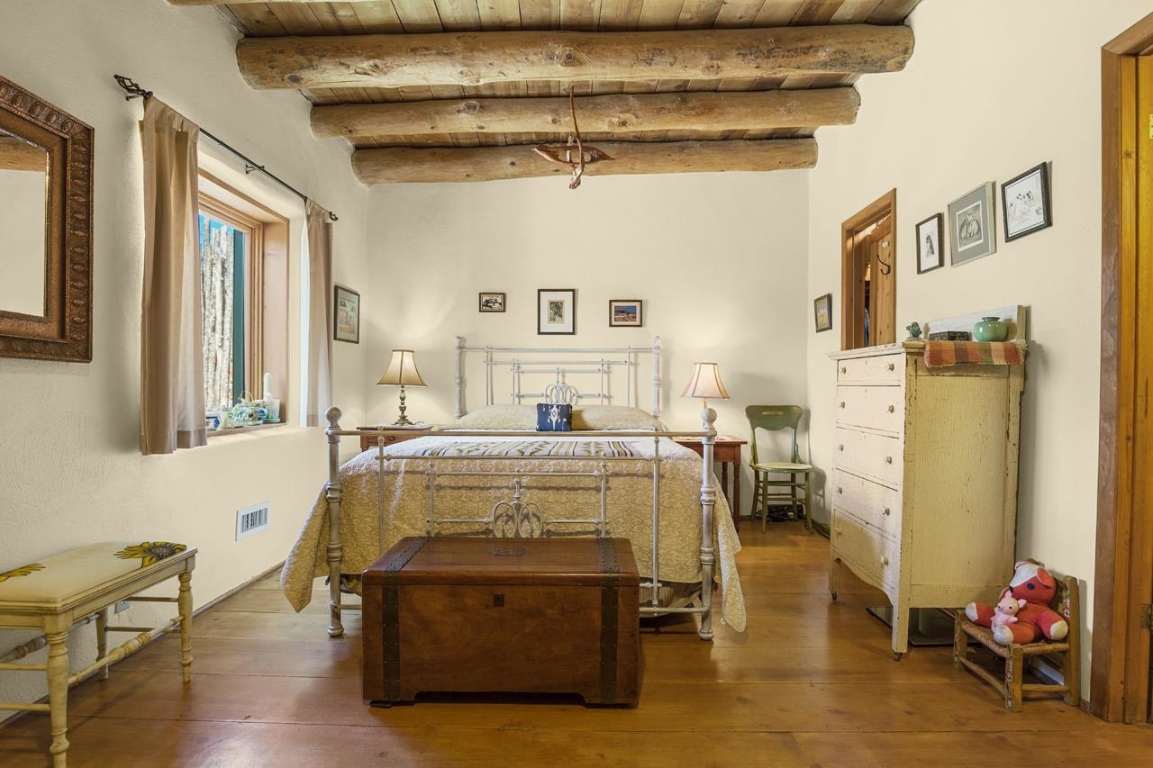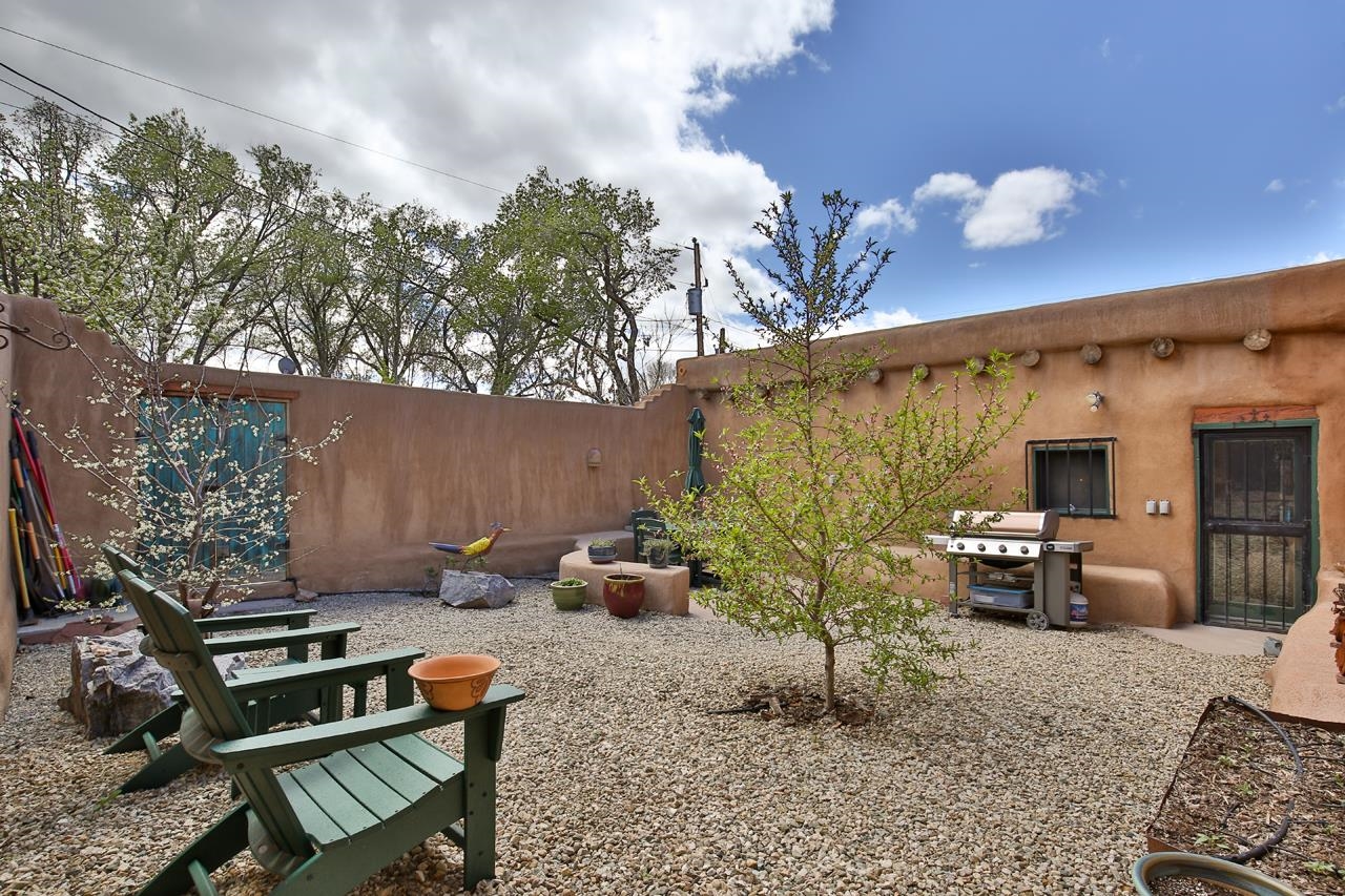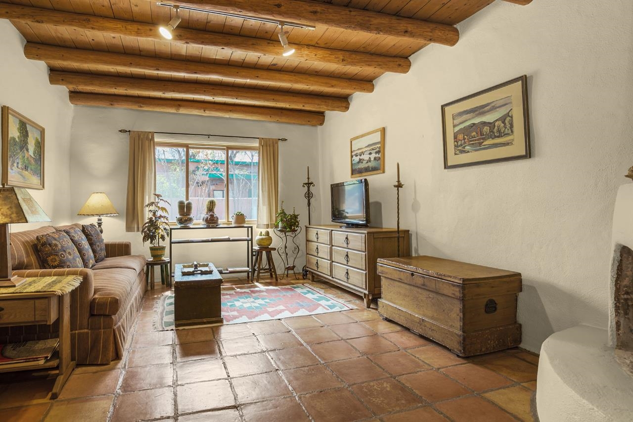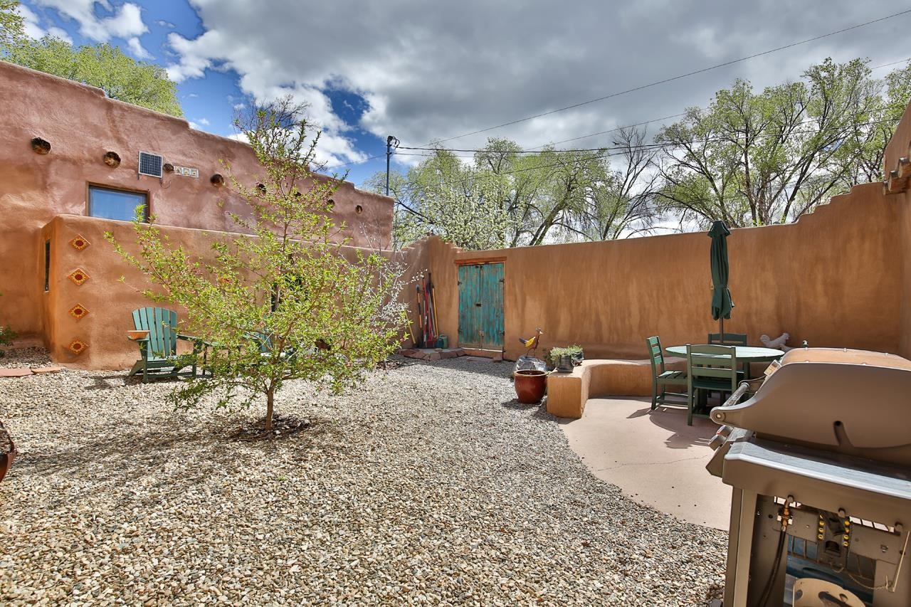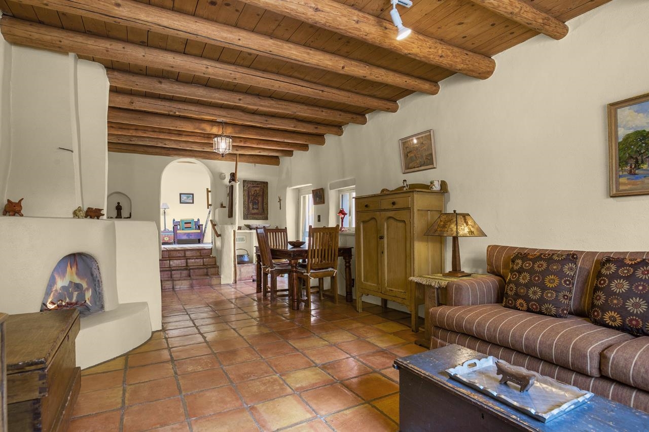 Enchanting, authentic adobe home in the historic neighborhood by the Ranchos de Taos Plaza. This tastefully renovated 2-bedroom + extra room/2-bath home offers classic Taos "character" throughout: saltillo tile and wide-plank wood floors; ceilings with hand-hewn viga beams; a mixture of latillas, tongue & groove, and coved plaster in the spaces between the beams; 3 "beehive" wood-burning fireplaces for cozy warmth and ambiance; colorful porcelain Mexican tiles in kitchen and baths; nichos and bancos; hand-plastered walls. The thick adobe walls are naturally insulating and sound-attenuating (it's so quiet inside), and they keep the house cool in summer and warm in winter. The efficient galley kitchen looks out onto honeysuckle-covered grillwork. The appliances are only a few years old. The extra room is currently set up as a library/den but it could be a third bedroom. It features a fireplace, south-facing clerestory window, a large closet/storage space behind rustic wood doors,and a built-in desk and antique library drawers. The rear courtyard is completely enclosed by adobe walls, offering a wonderful setting for outdoor living and entertaining. There are fruit trees (peach, plum, pear), a concrete slab for cooking and dining, and a banco for extra seating. Inside the adobe wall along Valerio Road, the front yard includes a traditional "portal" and a xeriscaped yard with cherry and weeping crabapple trees, and native water-wise perennial plants which attract birds (especially hummingbirds) and bees. The driveway next to the house can accommodate 2-3 vehicles. The property also includes a parking area directly across Valerio Road; it can handle another3-4 vehicles. The original part of the home is thought to date from the late 1800's. Situated in a traditional Taos neighborhood, walking distance to historic San Francisco de Asis church, a couple of restaurants, galleries, a coffee shop, and the post office. Located less than 4 miles from Taos Plaza, near traditional agricultural fields and acequias (irrigation ditches) coming from the Rio Grande del Rancho. In 2023, the owners had a new Brai-type (modified Bitumen) roof installed over the living-dining portion of the house. The remainder of the roof is metal. Rain gutters were installed in 2021. The entire interior and the wood exterior trim was repainted in 2025. The wood floors were recently refinished. Note: Many of the fine furnishings are available separately. Any documents included with this listing are provided as a courtesy only. Buyer should rely on documents provided with title commitment. Neither the Listing Broker nor Seller warrant the square footage of the home or the acreage of the property. If the size of the home or the property acreage is of material concern to Buyer, then Buyer should have it measured and/or surveyed. The fires depicted in the fireplaces are virtually included.