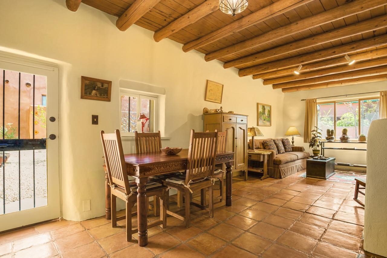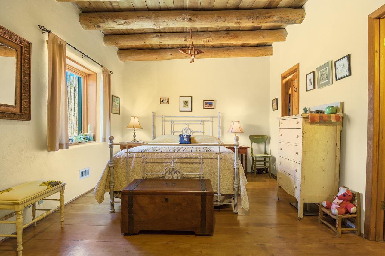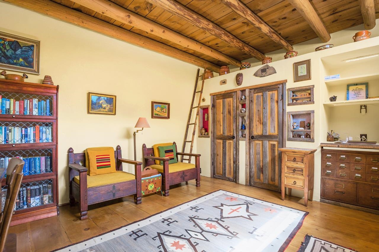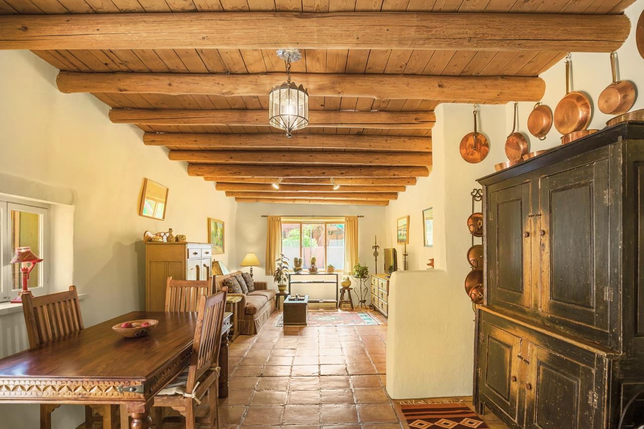 Enchanting, authentic adobe home in the historic neighborhood by the Ranchos de Taos Plaza. This tastefully renovated 2-bedroom + extra room/2-bath home offers classic Taos "character" throughout: saltillo tile and wide-plank wood floors; ceilings with hand-hewn viga beams; a mixture of latillas, tongue & groove, and coved plaster in the spaces between the beams; 3 "beehive" wood-burning fireplaces for cozy warmth and ambiance; colorful porcelain Mexican tiles in kitchen and baths; nichos and bancos; hand-plastered walls. The thick adobe walls are naturally insulating and sound-attenuating (it's so quiet inside), and they keep the house cool in summer and warm in winter. The efficient galley kitchen looks out onto honeysuckle-covered grillwork. The appliances are only a few years old. The extra room is currently set up as a library/den but it could be a third bedroom. It features a fireplace, south-facing clerestory window, a large closet/storage space behind rustic wood doors,and a built-in desk and antique library drawers. The rear courtyard is completely enclosed by adobe walls, offering a wonderful setting for outdoor living and entertaining. There are fruit trees (peach, plum, pear), a concrete slab for cooking and dining, and a banco for extra seating. Inside the adobe wall along Valerio Road, the front yard includes a traditional "portal" and a xeriscaped yard with cherry and weeping crabapple trees, and native water-wise perennial plants which attract birds (especially hummingbirds) and bees. The driveway next to the house can accommodate 2-3 vehicles. The property also includes a parking area directly across Valerio Road; it can handle another3-4 vehicles. The original part of the home is thought to date from the late 1800's. Situated in a traditional Taos neighborhood, walking distance to historic San Francisco de Asis church, a couple of restaurants, galleries, a coffee shop, and the post office. Located less than 4 miles from Taos Plaza, near traditional agricultural fields and acequias (irrigation ditches) coming from the Rio Grande del Rancho. In 2023, the owners had a new Brai-type (modified Bitumen) roof installed over the living-dining portion of the house. The remainder of the roof is metal. Rain gutters were installed in 2021. The entire interior and the wood exterior trim was repainted in 2025. The wood floors were recently refinished. Note: Many of the fine furnishings are available separately. Any documents included with this listing are provided as a courtesy only. Buyer should rely on documents provided with title commitment. Neither the Listing Broker nor Seller warrant the square footage of the home or the acreage of the property. If the size of the home or the property acreage is of material concern to Buyer, then Buyer should have it measured and/or surveyed. The fires depicted in the fireplaces are virtually included.