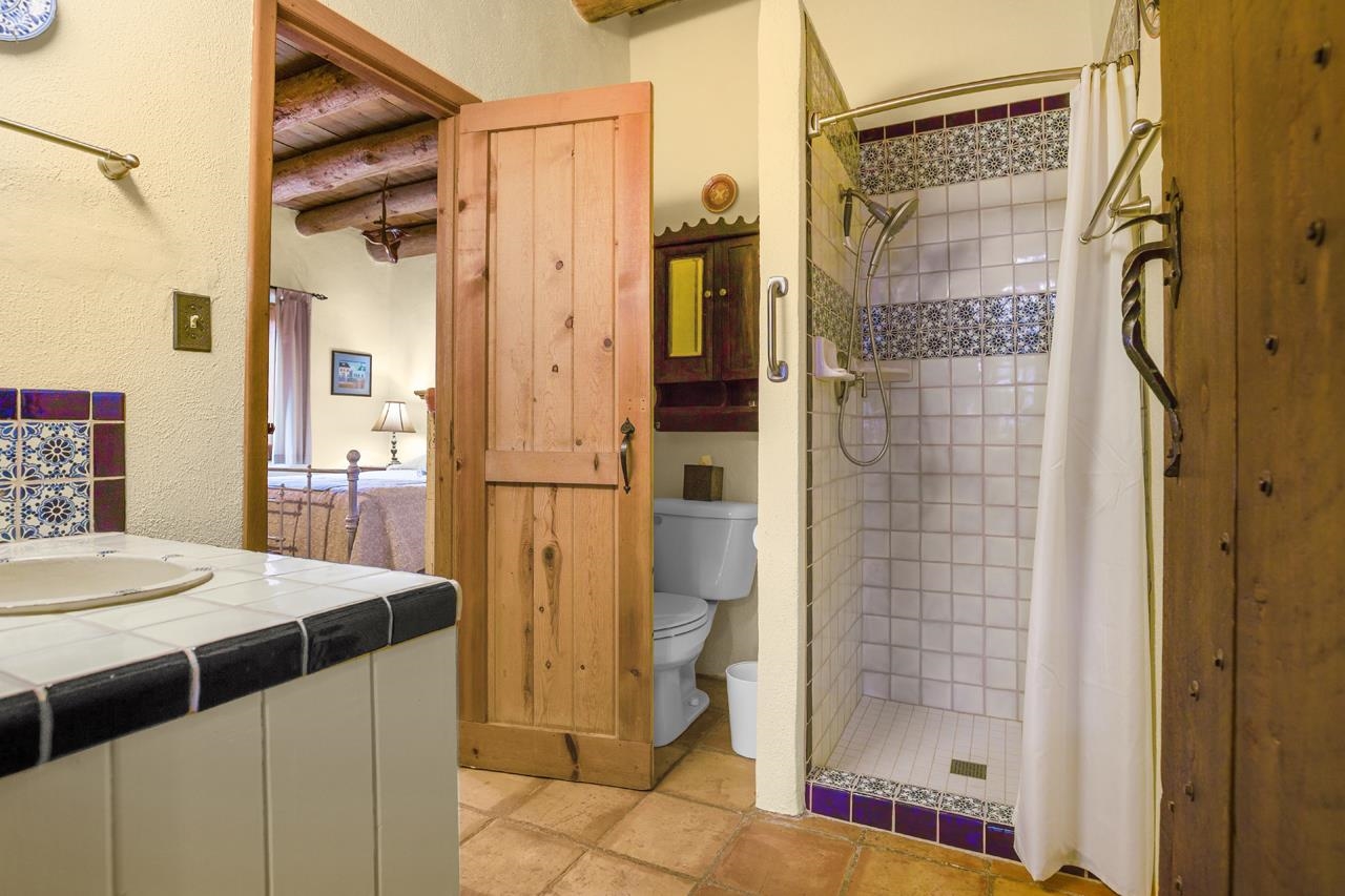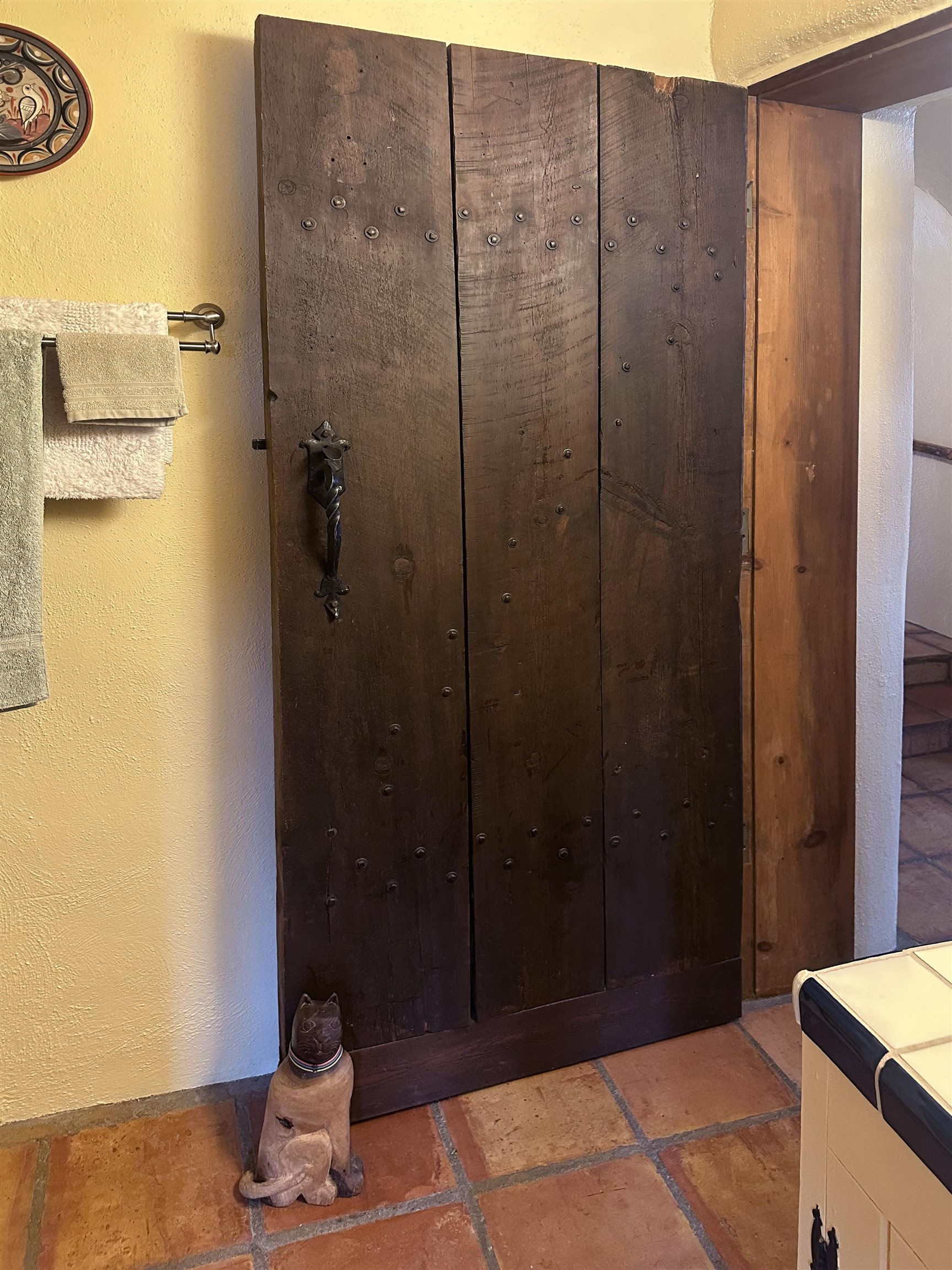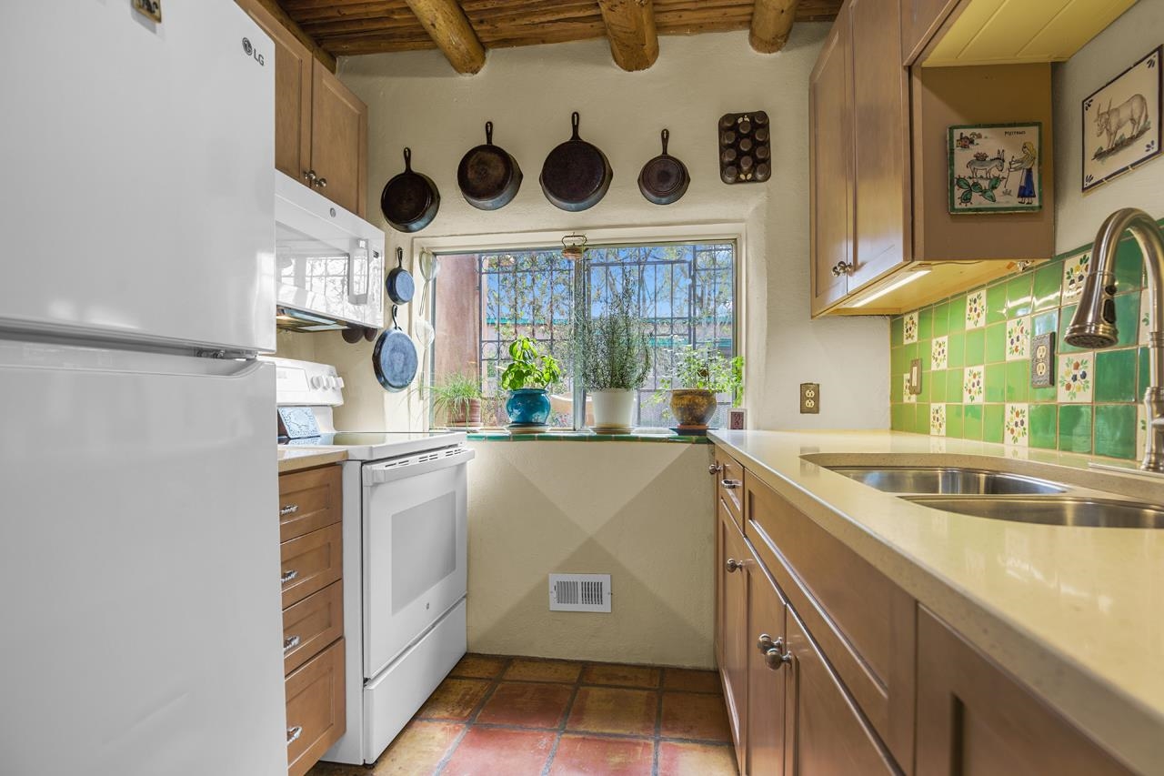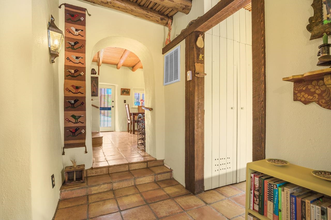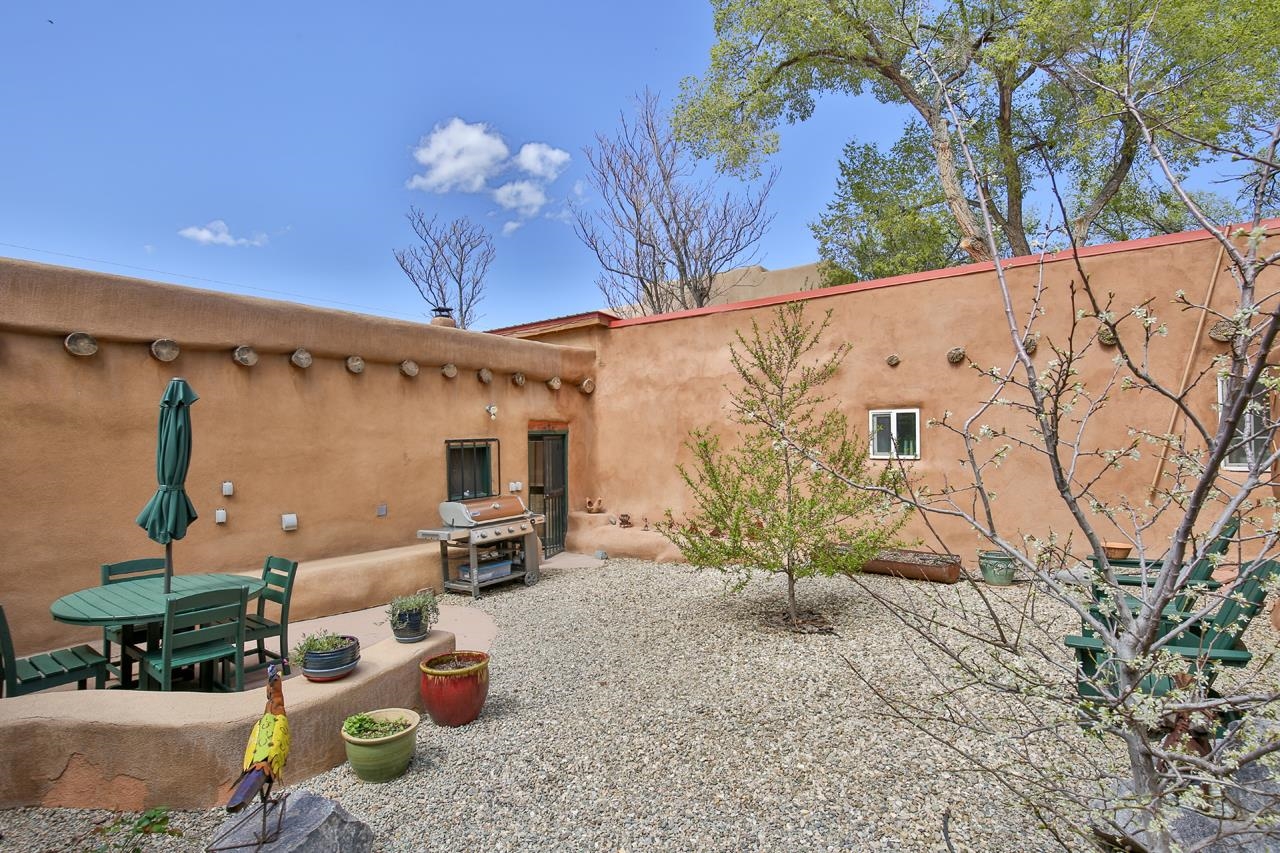 Enchanting, authentic adobe home in the historic neighborhood by the Ranchos de Taos Plaza. This tastefully renovated 2-bedroom + extra room/2-bath home offers classic Taos "character" throughout: saltillo tile and wide-plank wood floors; ceilings with hand-hewn viga beams; a mixture of latillas, tongue & groove, and coved plaster in the spaces between the beams; 3 "beehive" wood-burning fireplaces for cozy warmth and ambiance; colorful porcelain Mexican tiles in kitchen and baths; nichos and bancos; hand-plastered walls. The thick adobe walls are naturally insulating and sound-attenuating (it's so quiet inside), and they keep the house cool in summer and warm in winter. The efficient galley kitchen looks out onto honeysuckle-covered grillwork. The appliances are only a few years old. The extra room is currently set up as a library/den but it could be a third bedroom. It features a fireplace, south-facing clerestory window, a large closet/storage space behind rustic wood doors,and a built-in desk and antique library drawers. The rear courtyard is completely enclosed by adobe walls, offering a wonderful setting for outdoor living and entertaining. There are fruit trees (peach, plum, pear), a concrete slab for cooking and dining, and a banco for extra seating. Inside the adobe wall along Valerio Road, the front yard includes a traditional "portal" and a xeriscaped yard with cherry and weeping crabapple trees, and native water-wise perennial plants which attract birds (especially hummingbirds) and bees. The driveway next to the house can accommodate 2-3 vehicles. The property also includes a parking area directly across Valerio Road; it can handle another3-4 vehicles. The original part of the home is thought to date from the late 1800's. Situated in a traditional Taos neighborhood, walking distance to historic San Francisco de Asis church, a couple of restaurants, galleries, a coffee shop, and the post office. Located less than 4 miles from Taos Plaza, near traditional agricultural fields and acequias (irrigation ditches) coming from the Rio Grande del Rancho. In 2023, the owners had a new Brai-type (modified Bitumen) roof installed over the living-dining portion of the house. The remainder of the roof is metal. Rain gutters were installed in 2021. The entire interior and the wood exterior trim was repainted in 2025. The wood floors were recently refinished. Note: Many of the fine furnishings are available separately. Any documents included with this listing are provided as a courtesy only. Buyer should rely on documents provided with title commitment. Neither the Listing Broker nor Seller warrant the square footage of the home or the acreage of the property. If the size of the home or the property acreage is of material concern to Buyer, then Buyer should have it measured and/or surveyed. The fires depicted in the fireplaces are virtually included.