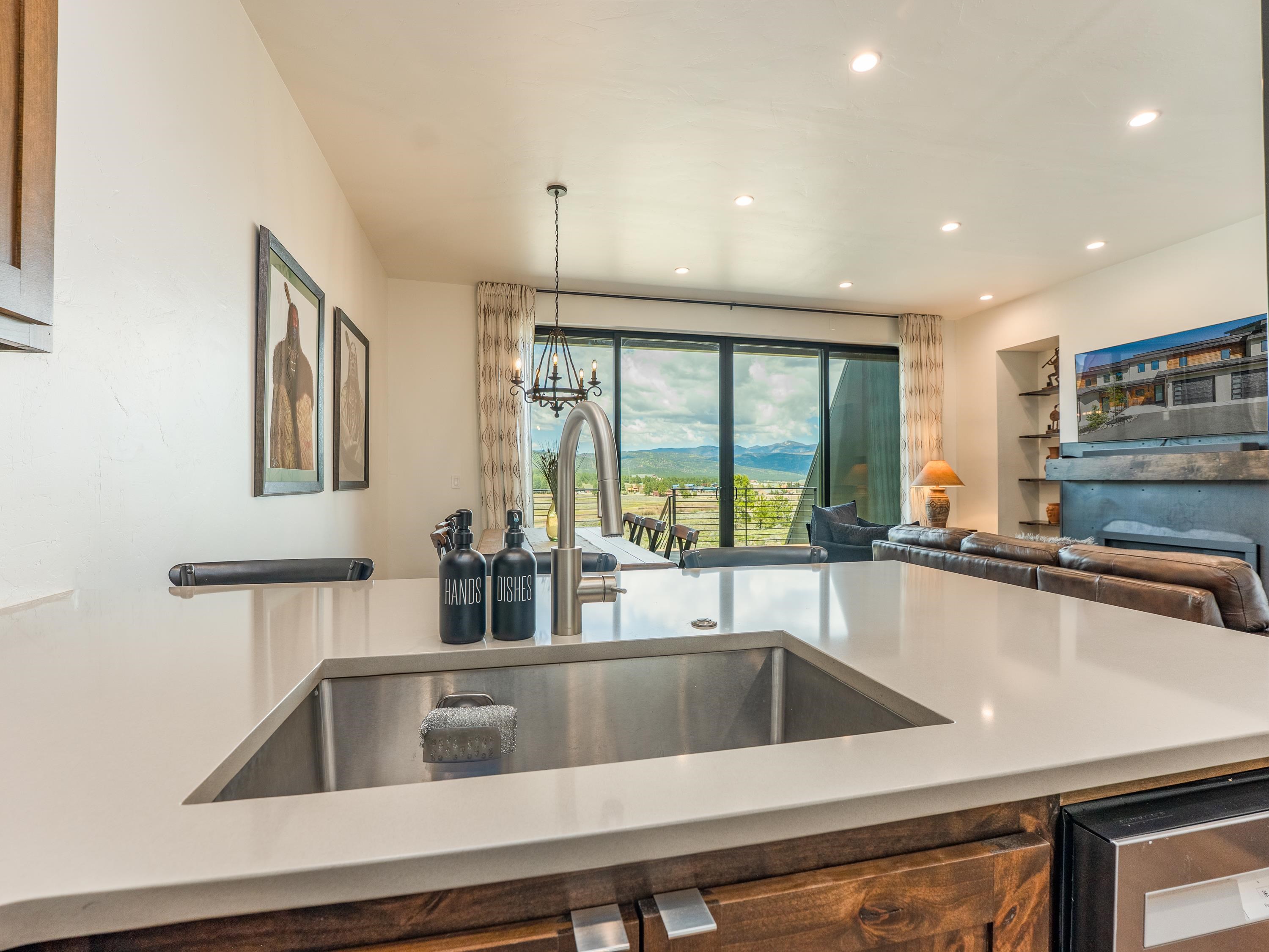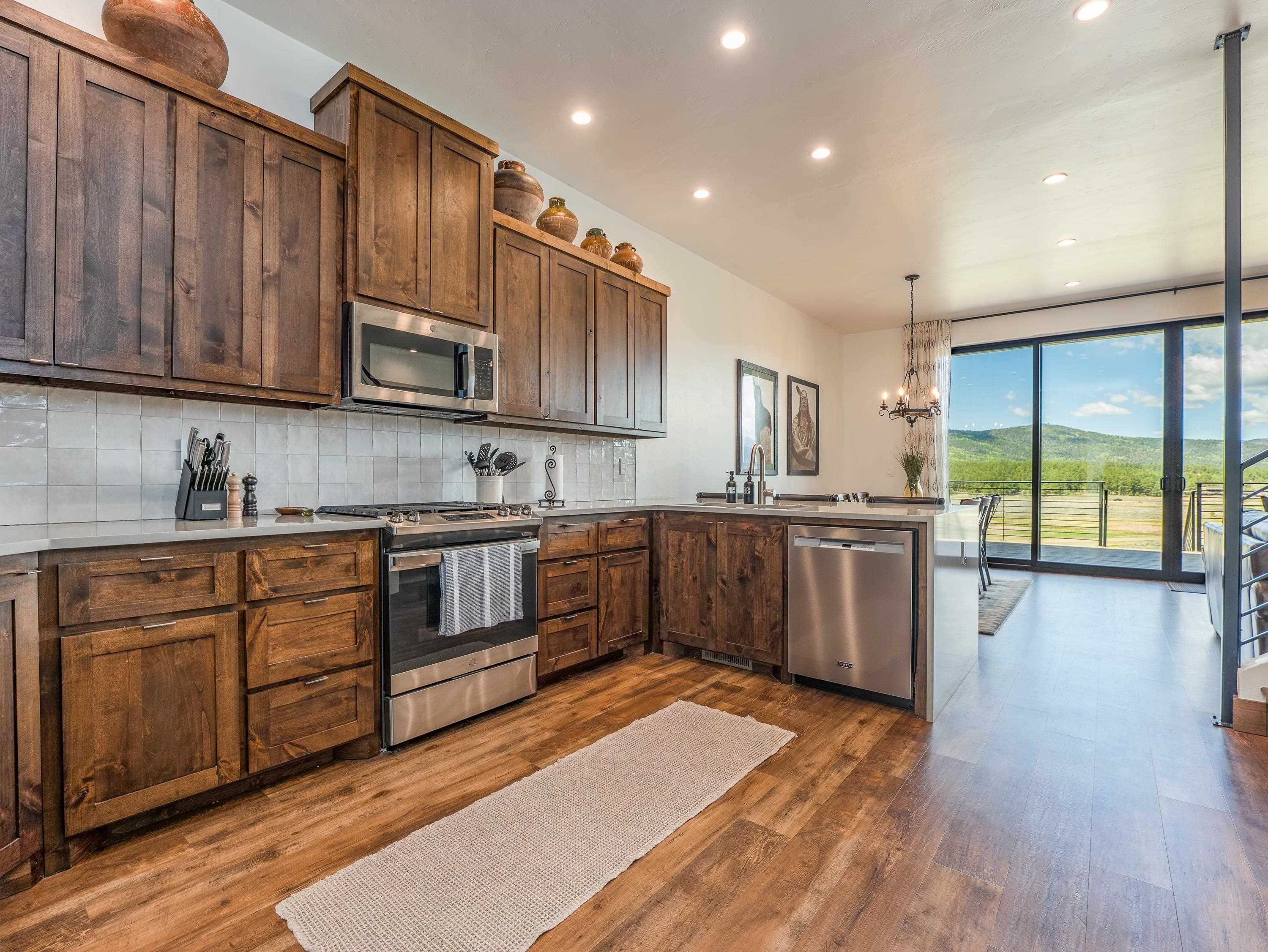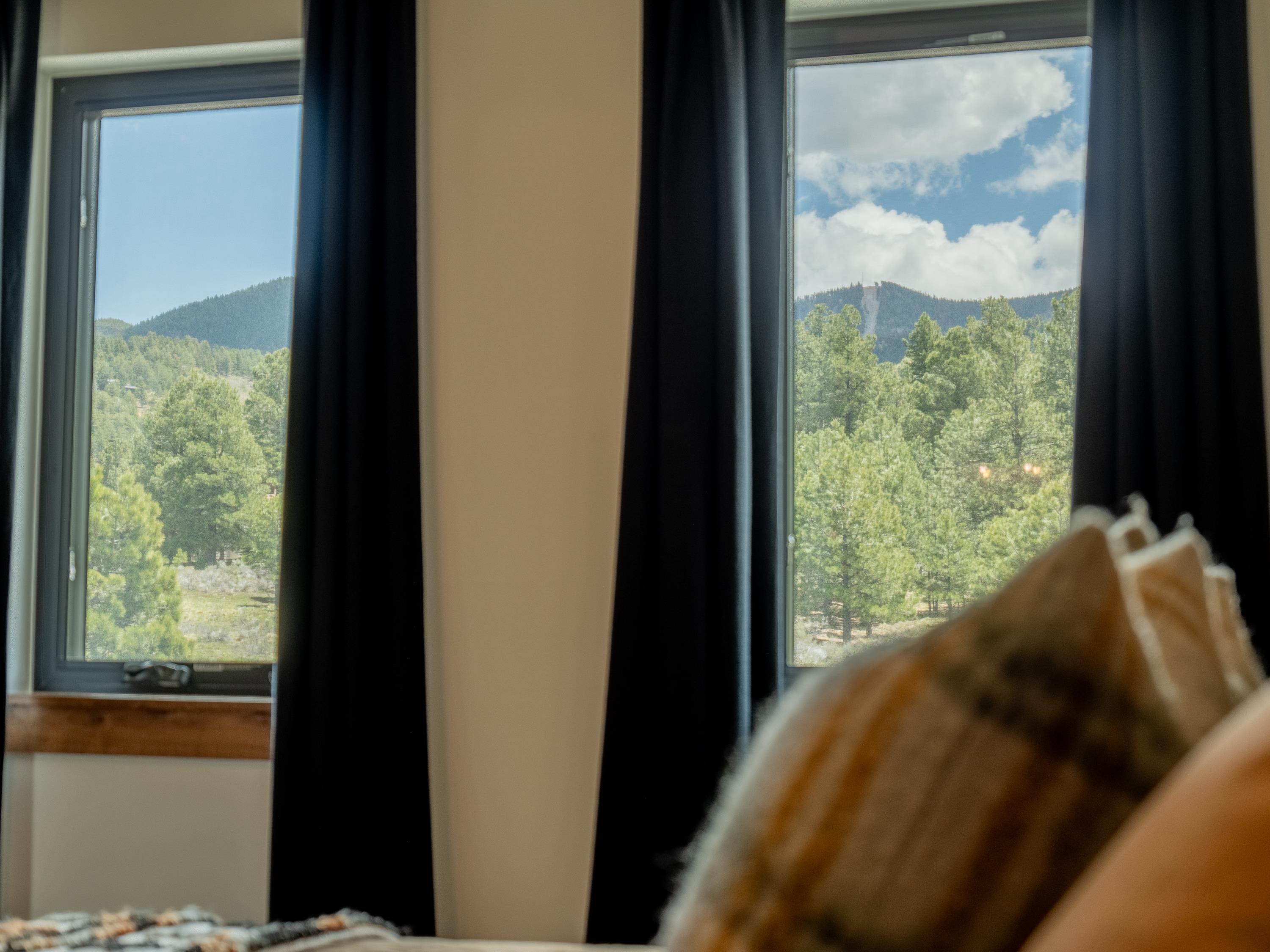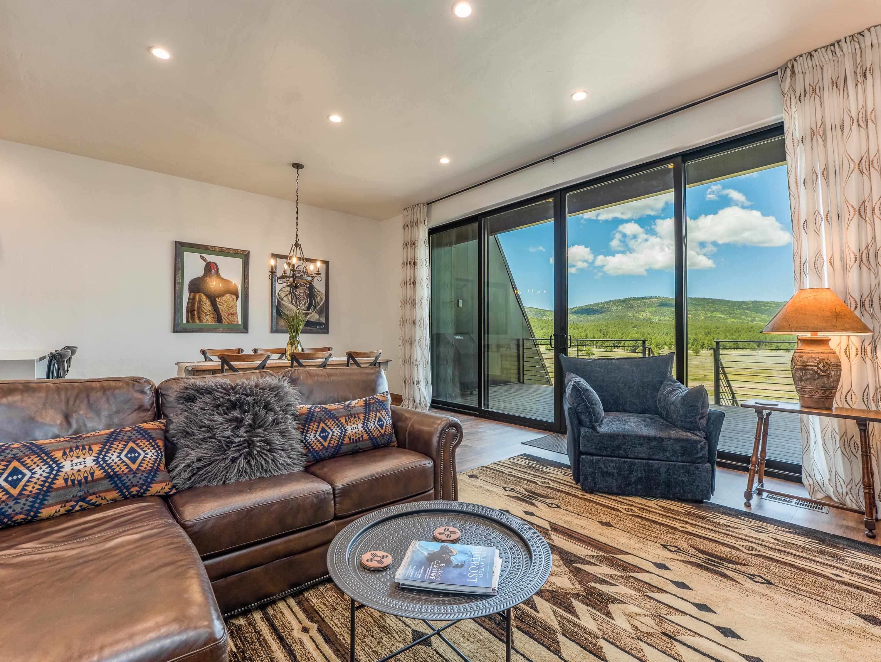 Introducing Valley View Villa #2 — a refined blend of modern mountain architecture, energy efficiency, and effortless ownership in the heart of Angel Fire. Set against a backdrop of mountain peaks and protected wetlands, this newly built townhome showcases panoramic views from every room and a thoughtfully curated design that balances style, function, and serenity. Tall ceilings and expansive windows flood the main living area with natural light and frame sweeping views of Cieneguilla Creek and Wheeler Peak. The kitchen is equally suited for daily living and entertaining, featuring clean lines, generous cabinetry, bar-top seating, and a walk-in pantry. The primary suite includes oversized glass doors opening to a private balcony with dramatic mountain vistas, and an ensuite bath with a dual-sink vanity, walk-in shower, private water closet, and a spacious walk-in closet. Two additional guest bedrooms and two full bathrooms are located on the second level, offering both comfort and privacy. A third-floor flex space—complete with its own bathroom and dry bar—adds versatility for a media room, game space, or overflow sleeping area. Additional highlights include an attached one-car garage, fenced yard, discreet storage beneath the home, central heating and air conditioning. Just minutes from the Angel Fire village center and resort amenities, this luxury lock-and-leave residence combines exceptional quality, a tranquil setting, and true turn-key convenience. Offered fully furnished, decorated, and equipped.