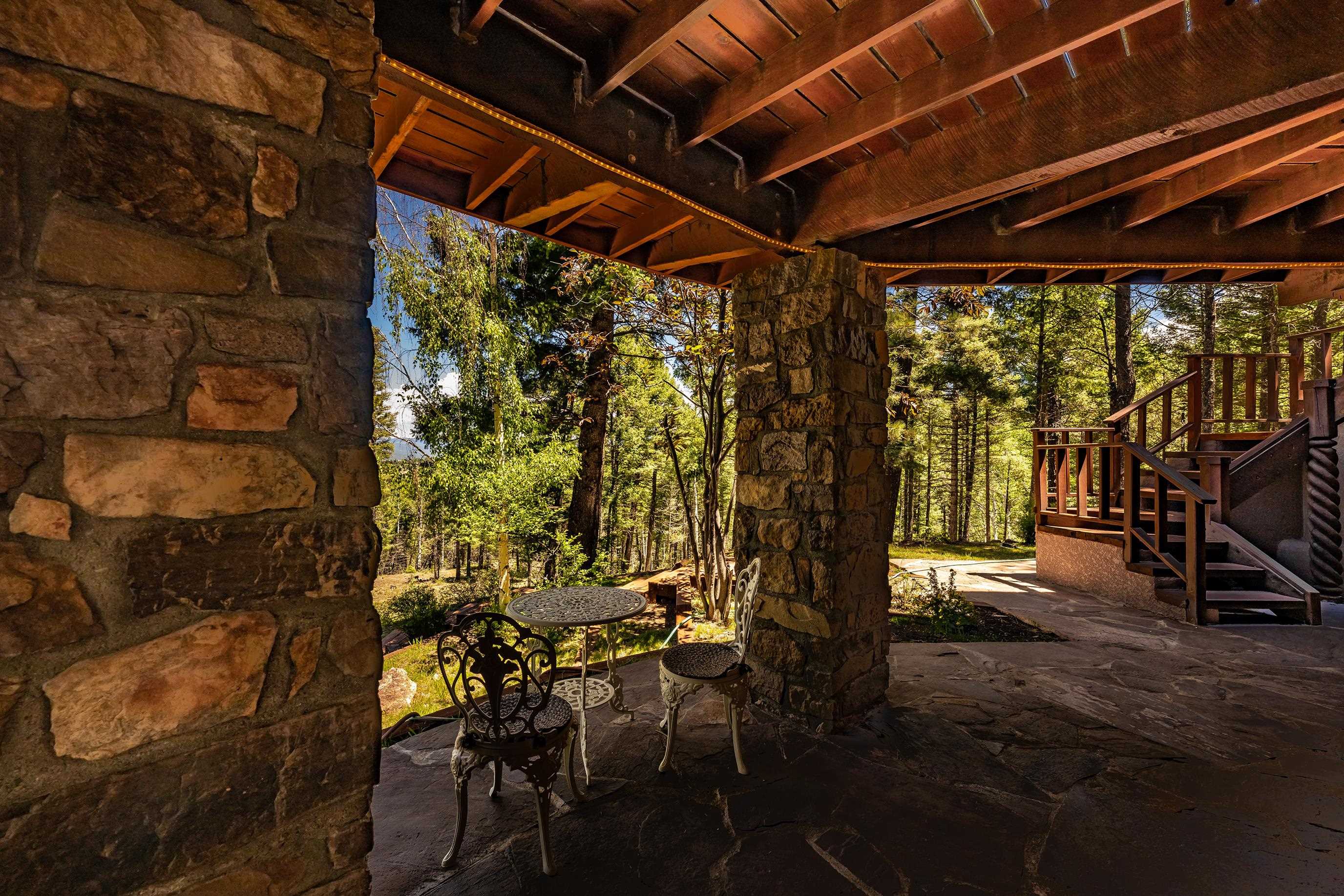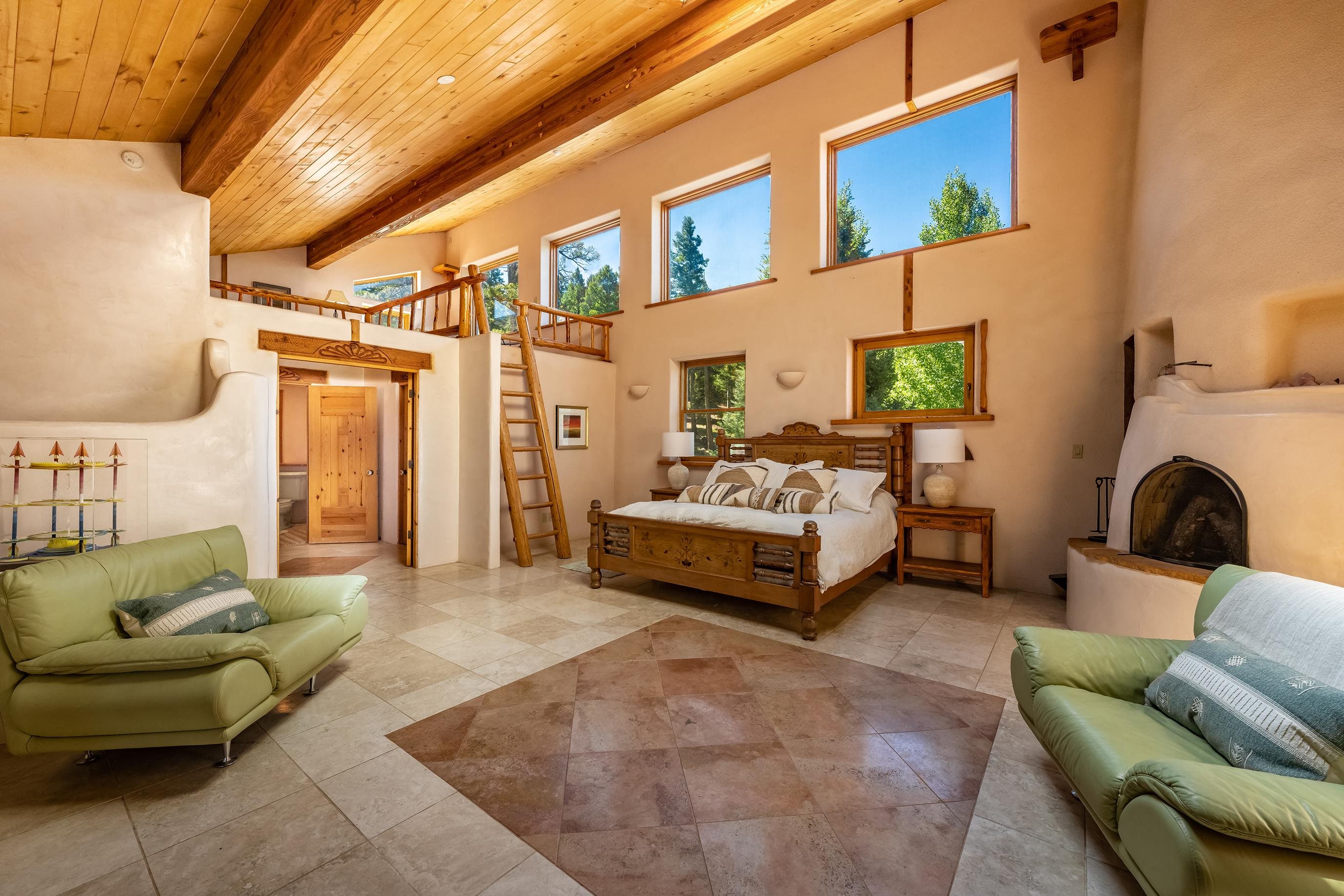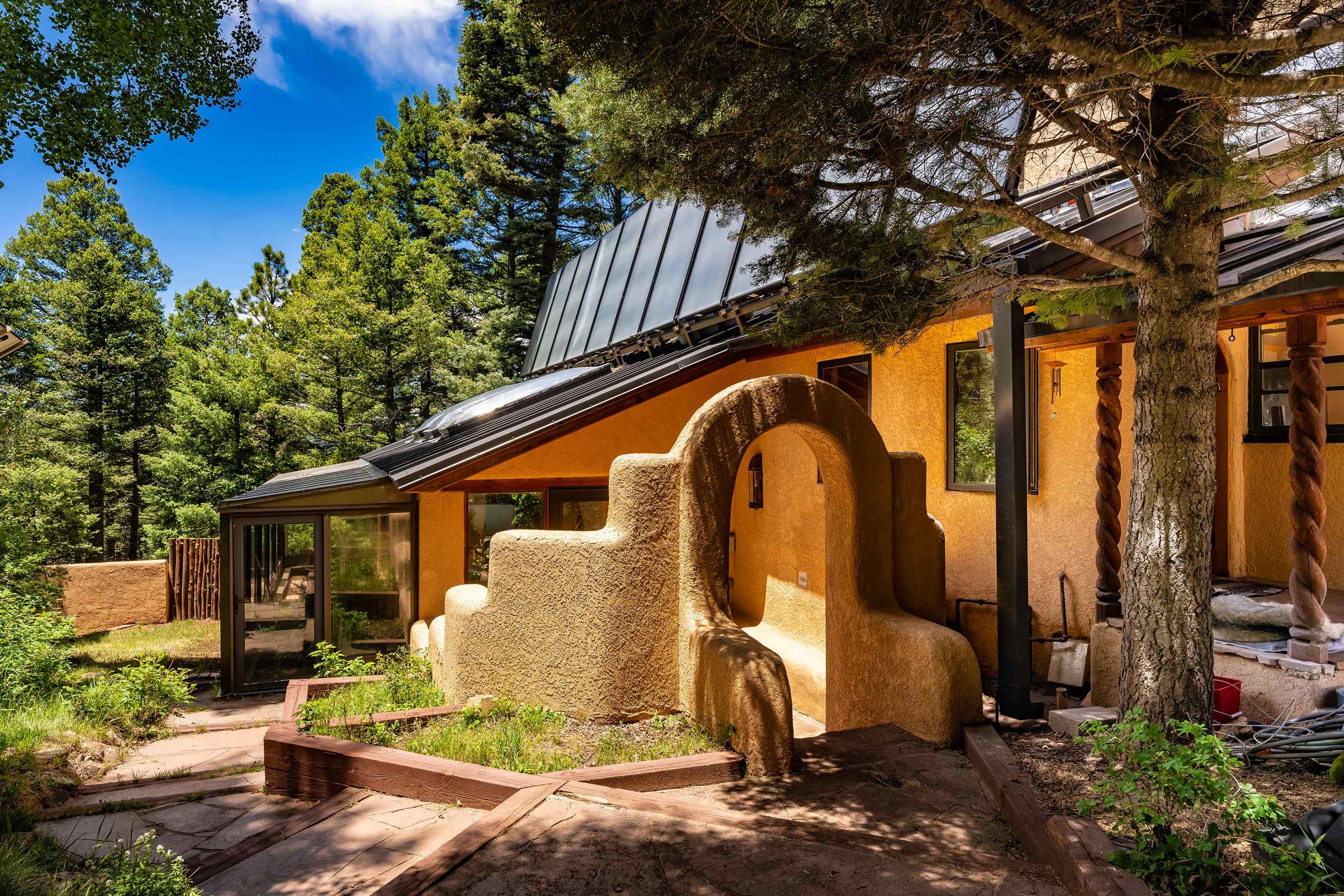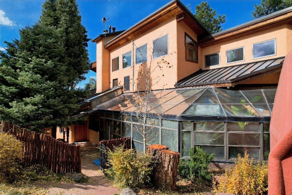 A Sustainable Estate in the southern Rocky Mountains of northern New Mexico can be yours.This Eco-Masterpiece is on 45 acres of native forest and wildlife habitat situated within Angel Fire Resort. An emerging destination, this family ski resort has 86 ski trails and mountain biking mid-May to mid-October. The Resort has an 18-hole PGA Golf Course, tennis and pickleball courts, and a country club with pool, fitness center and fine dining. Angel Fire Airport, a 10-minute drive to its jet-capable runway, serves private aircraft as well as Advance Air's 5 roundtrips a week from Albuquerque. Privacy and seclusion are secured on all sides with the north boundary being the 130,000-acre historic CS Ranch. A seasonal creek runs through a private 6-acre meadow. This legacy home is built to last with many green and sustainable features. It will continue to provide privacy, security, energy, food and enjoyment as a nurturing retreat for years to come. Beautiful - Indoors and Out, Practical, Resilient. This modern home is designed with the vision to survive the challenges of the future. With panoramic, forever views of the Wheeler range, this mighty three-story 8,074 sq ft Eco-block home, with 12 and 24-inch thick walls, is built to endure the elements and last for generations.There are 6,784 sq. ft of heated, move-in ready dramatic living space with two interior greenhouses created by carefully selected local craftsmen. The first floor features an authentic adobe Casita with its own full kitchen, custom cabinetry, furniture and a private entrance. The Casita has been in a successful short-term rental program, with numerous five-star reviews. Adjacent to the Casita on the first floor are 575 sq ft of utility and mechanical rooms, extensive working storage, and a 715 sq ft space designed as a separate apartment with its own entrance ready for you to complete to your liking. The overall floor plan is in the Photo Gallery of this listing. Outdoors there are 2,500 sq ft of tiered, organic gardens in the walled area south of the patio. In addition, two food and flower-producing greenhouses are inside - one in the Atrium hot tub room, and a larger one off the main kitchen for easy access to fresh food year-round. The spacious light-filled kitchen has been fully upgraded with high quality appliances, special granite countertops, a large working island and walk-in pantry. The modern passive solar architecture sets this solar sanctuary apart. This intelligent home has many solar and high-tech features - solar electricity and whole-house radiant floor heating, as well as passive solar features enabled by the homes’ perfect solar alignment. The whole home is a green design, built from the ground up with many sustainable, non-toxic features (see list in the Photo Gallery) that provide energy efficiency, comfort, strength, and durability. Modern solar panel tracking racks with updated batteries cut utility bills. Solar Thermal panels quietly supply the primary heat day and night. The local utility, Kit Carson Electric Coop, operates a major 6MW solar farm microgrid with 6MW/hr battery backup, providing double-back up to the home’s solar system, focused on the resilience of the home office. There is ultra high-speed fiber-optic internet/Wi-Fi throughout, enabling full-time working from home. You must see this special property to truly appreciate the craftsmanship in every room - from the vaulted ceilings, beautiful local beams and vigas, to the stunning floor-to-ceiling rock wall fireplace in the living room, leading out to the pristine forest that wraps around the home. Private, secure parking for 5 cars: 2 in garage (EV-charging ready) and 3 in parking area. Taos is 24 miles away, offering eclectic shopping, art galleries, restaurants, museums, world-class Taos Ski Valley, and a modern hospital. Historic Santa Fe is just a 2-hour drive. Make an appointment to see this Eco-Masterpiece.