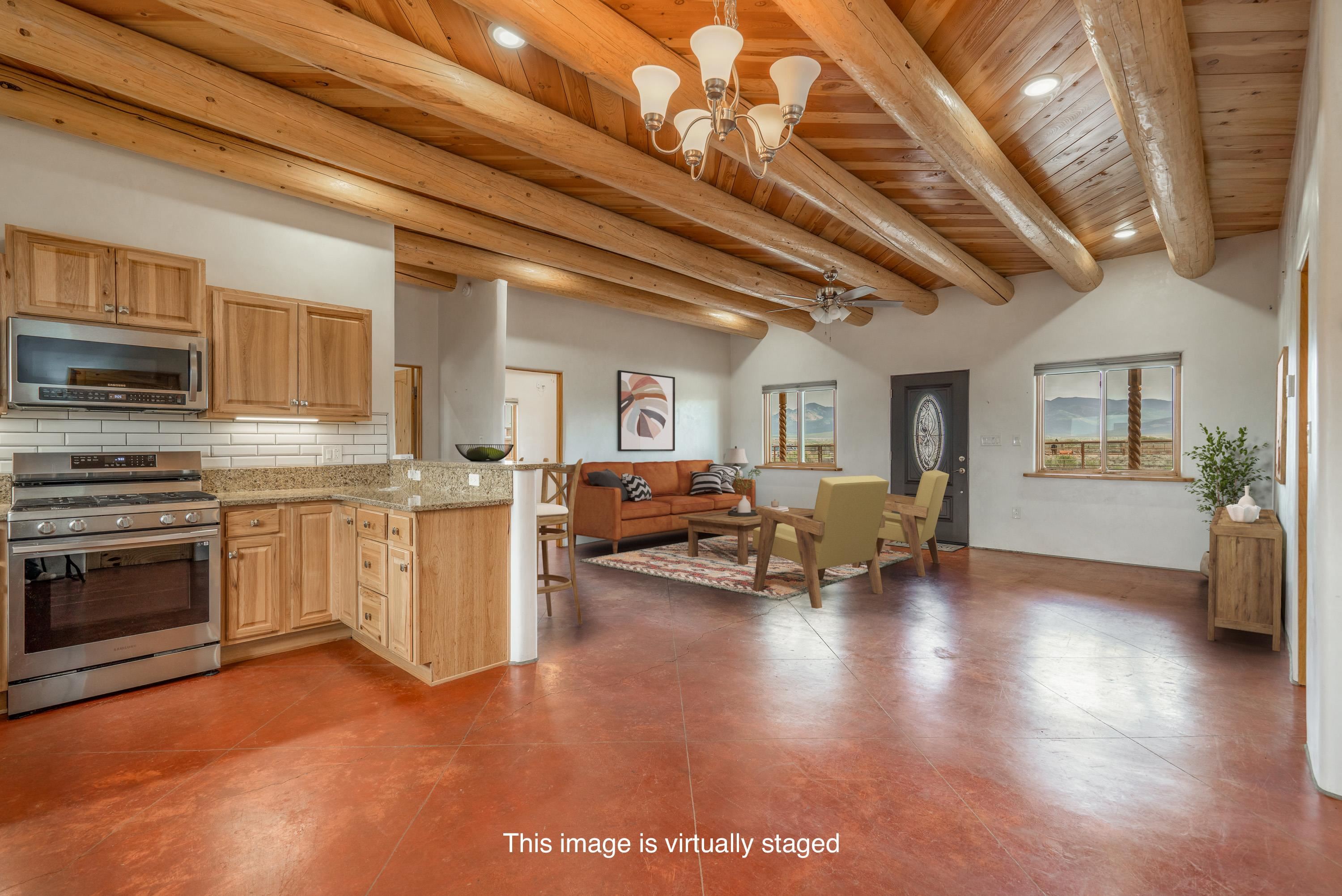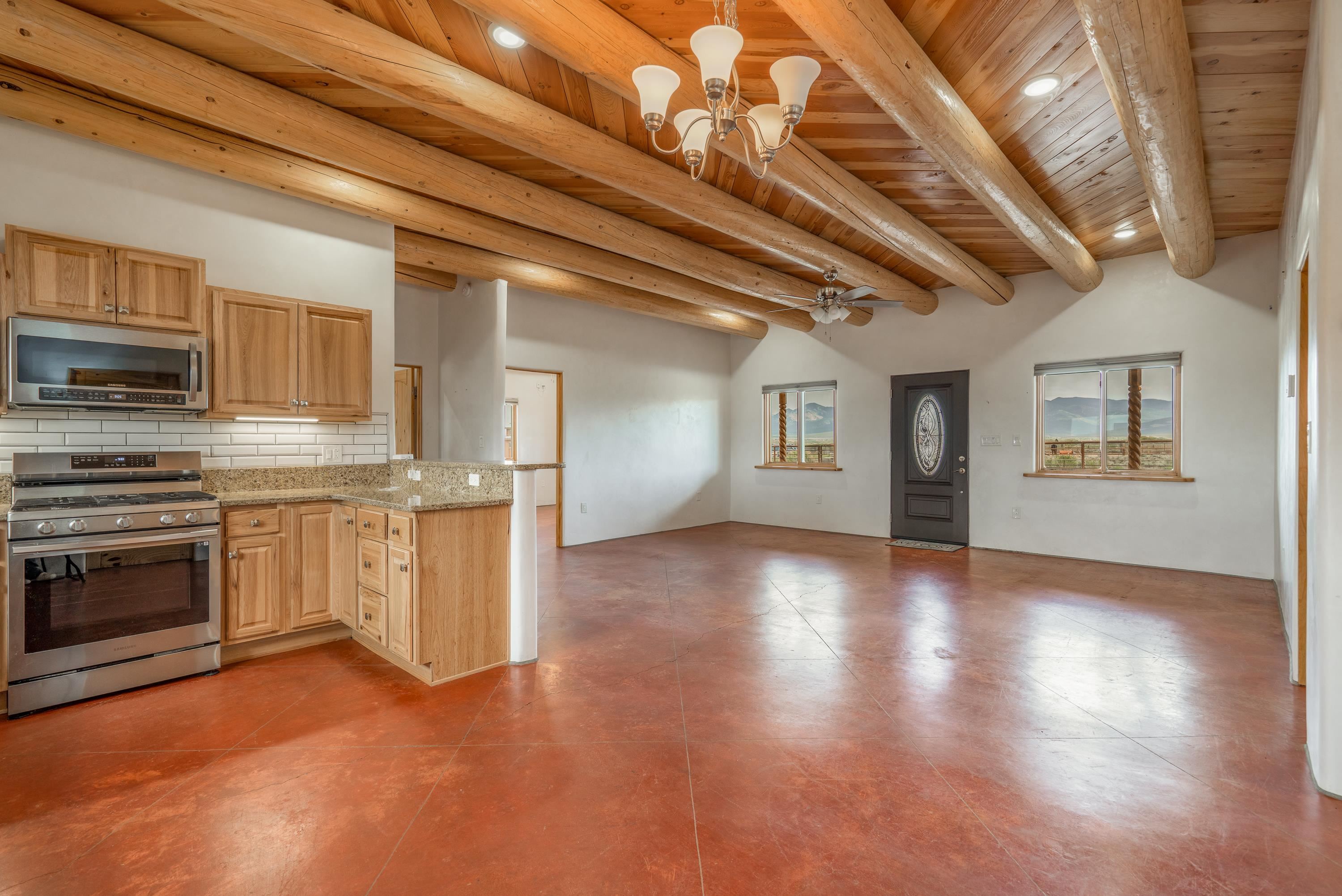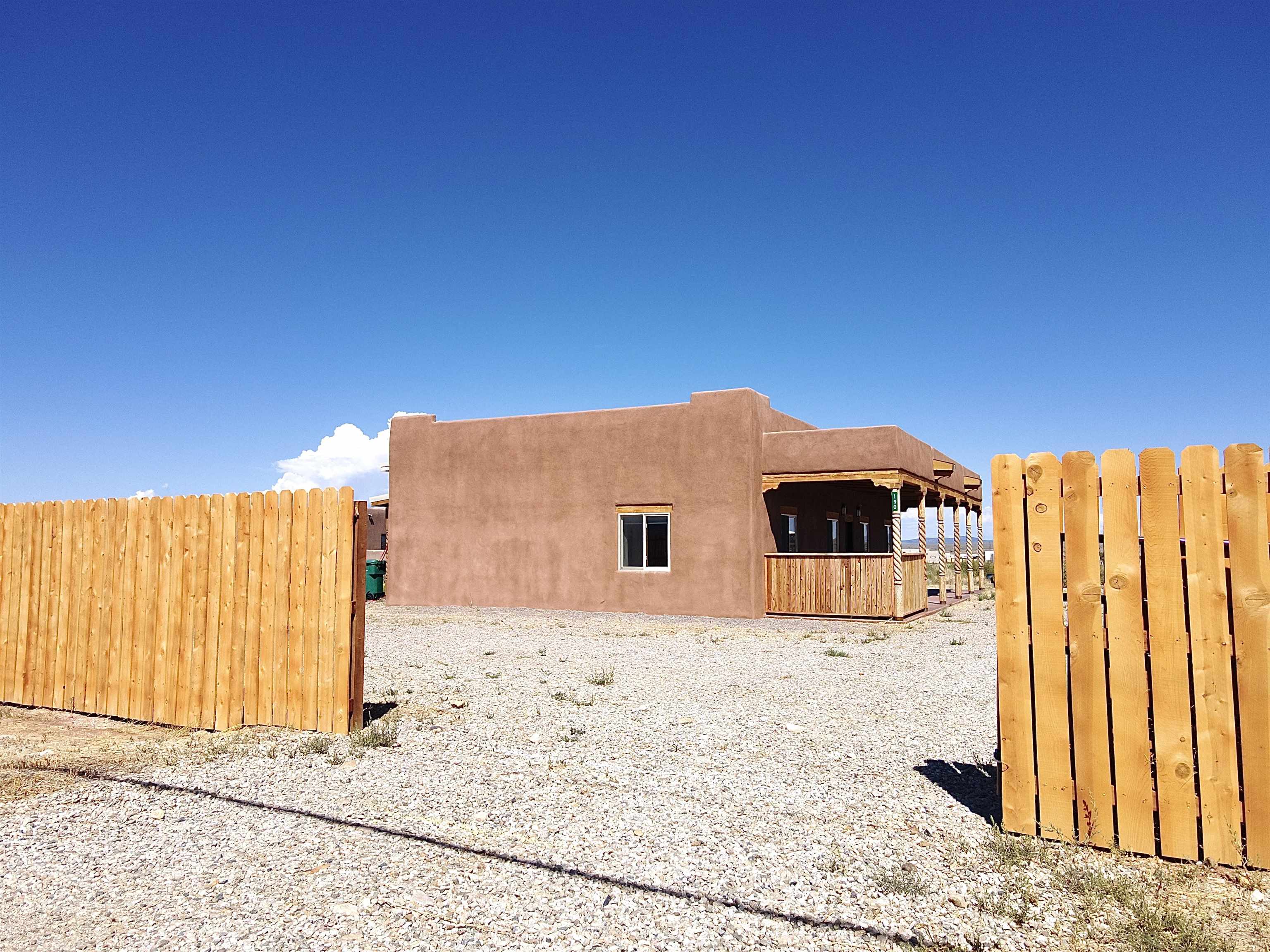 $20,000 price drop! Newer homes with this level of finish don’t come around often. Sitting on just under an acre, this home brings real bang for the buck! - diamond plaster walls, vigas with tongue-and-groove ceilings (yes, even in the closets), granite counters, etched concrete floors, and wood-clad windows. The layout makes sense: primary suite on one side, two bedrooms on the other, and a spacious living area in between. At 1,527 sq ft, there’s room for real furniture, real people, and real-life living. The kitchen lacks nothing, with stainless appliances, granite counters, a big sink, and a picture window that frames the Picuris Mountains. The primary suite has a semi walk-in closet, double vanity, walk-in shower with glass enclosure, and built-ins. The second bath has a soaking tub, because sometimes you just need one. There’s a full-length covered front portal (of course, with mountain views, and it is BIG), plus another covered patio out back. The dedicated laundry room comes with built-in cabinetry—perfect for stashing all the random stuff that somehow ends up everywhere else in the house. Radiant in-floor heating, powered by an on-demand natural gas tankless water heater, paired with solid insulation, means you’ll have time each month for more than just working and paying the utility bills. The home is on septic, connected to a private well, and includes a water softener system. Kit Carson fiber optic internet keeps everything running fast—even when multiple kids are online sucking up all the bandwidth with their latest video gameS. In addition to fiber, Xfinity cable internet and tv are also wired to the home; more choices and redundancy for the home owner! A new fence has been installed for further privacy between the home and the access road! A concrete pad in the driveway is ready for parking, projects, or pickup basketball. The 10x12 shed with extra storage out back seals the deal. Paved access all the way—no mud, no ruts, no nonsense. Just a solid, stylish, low-maintenance home with zero surprises.