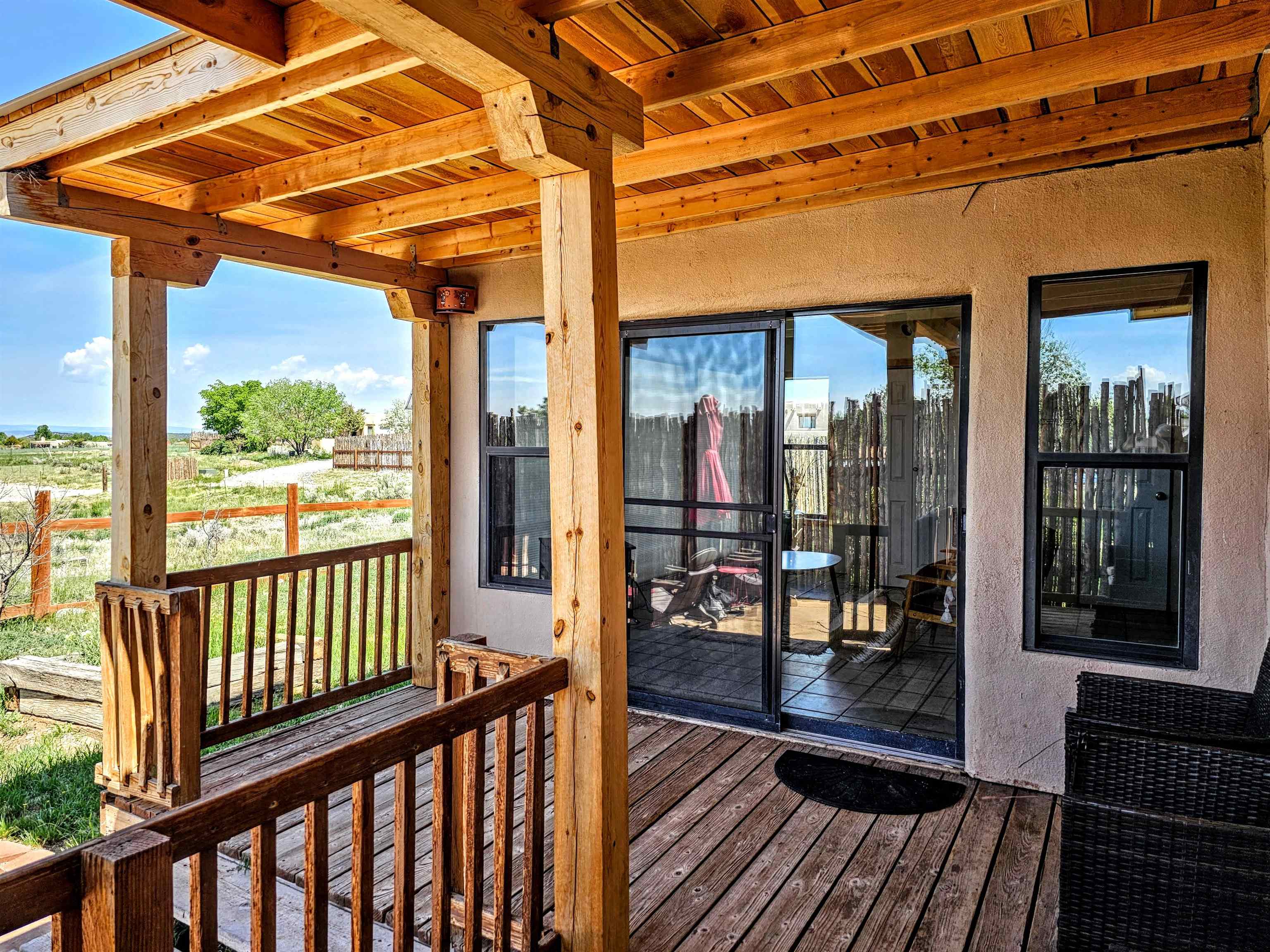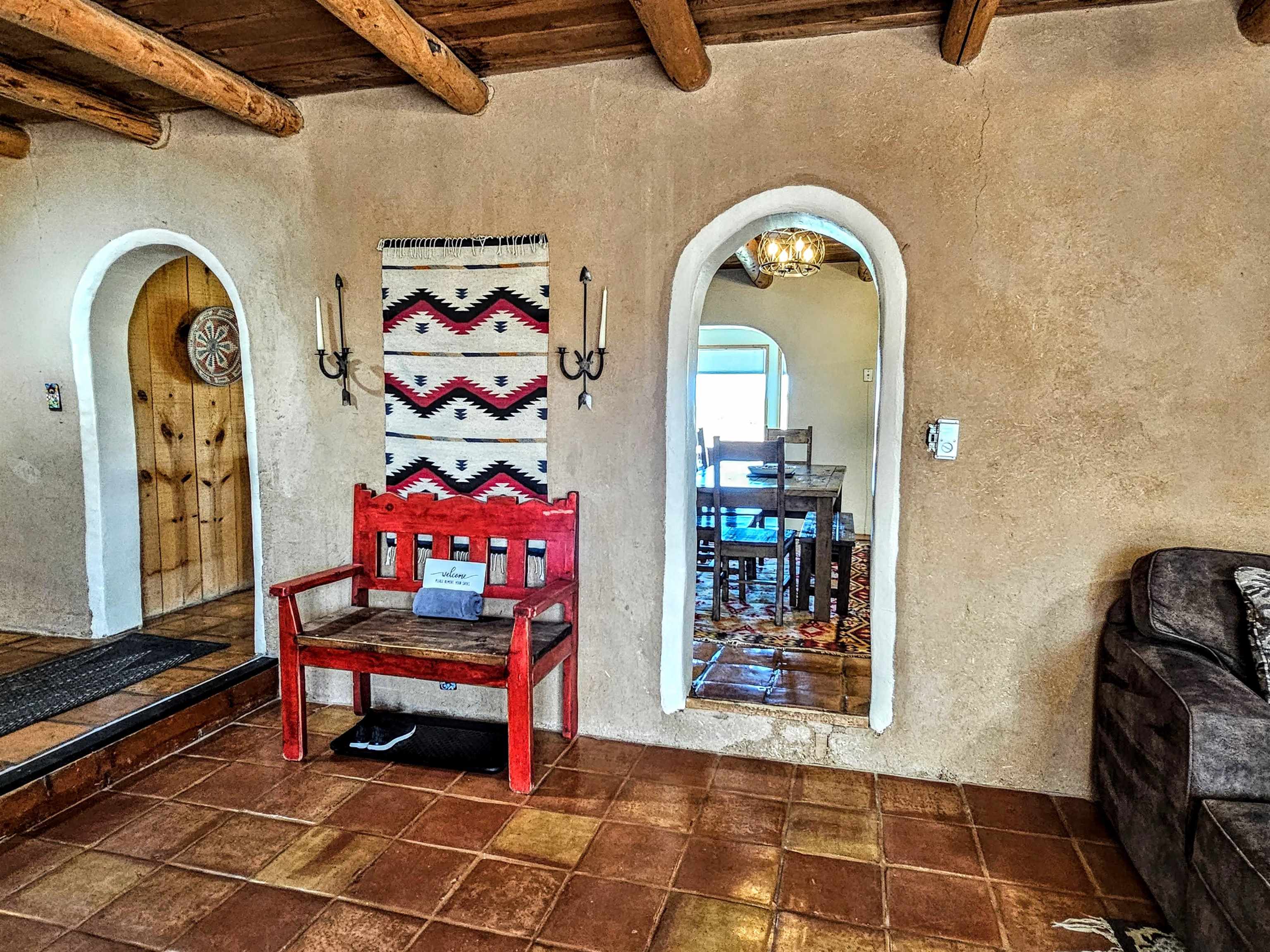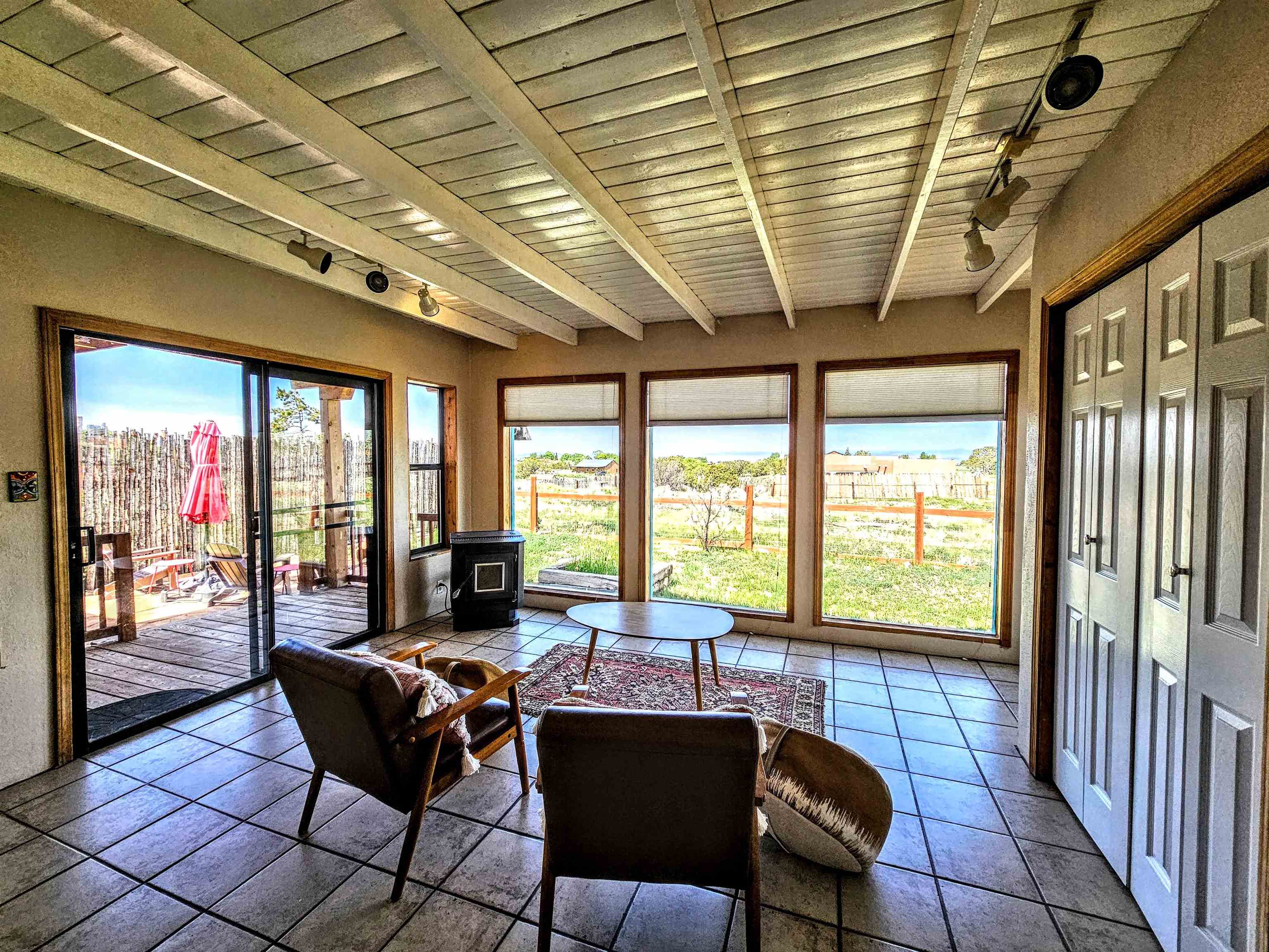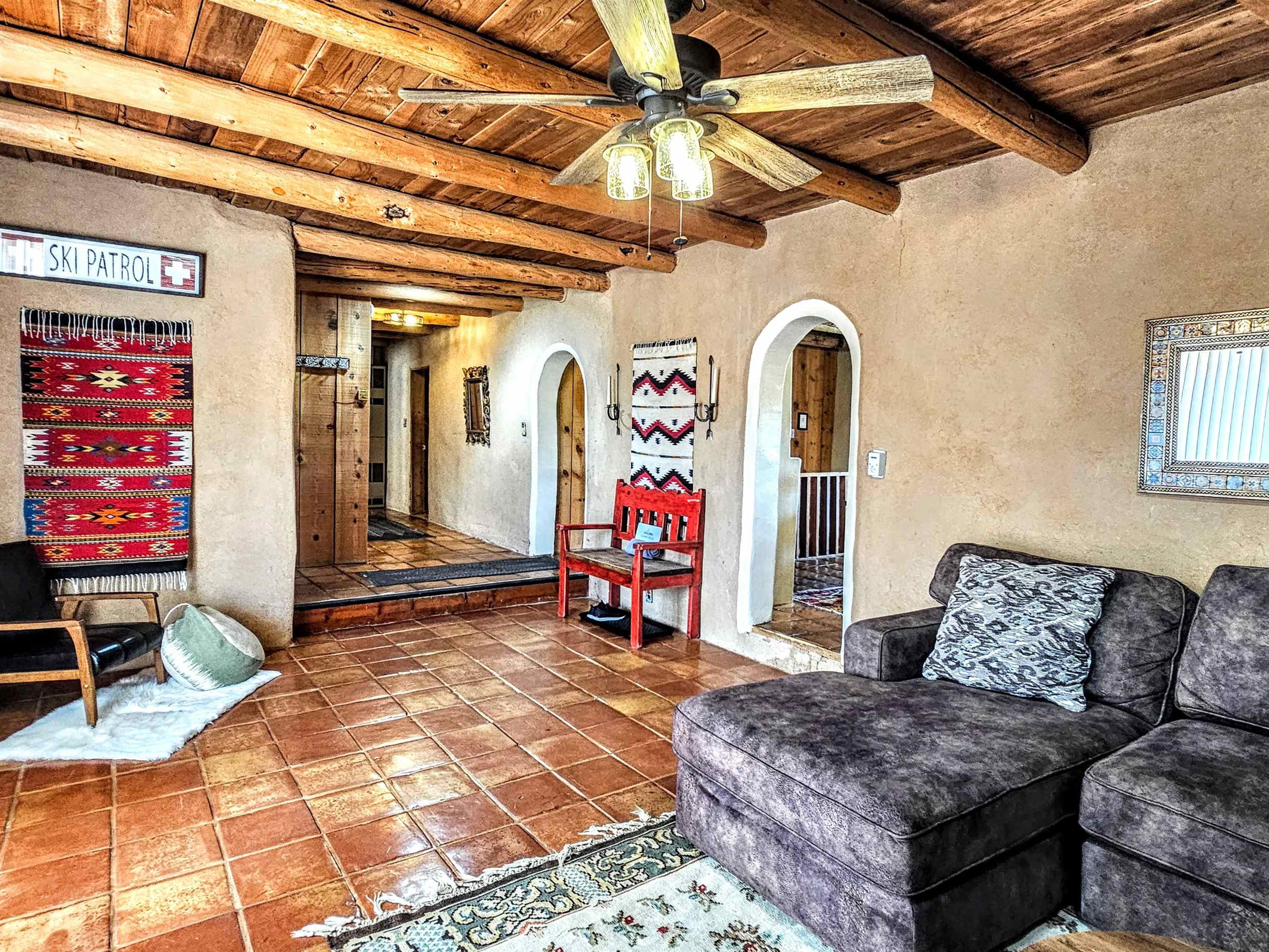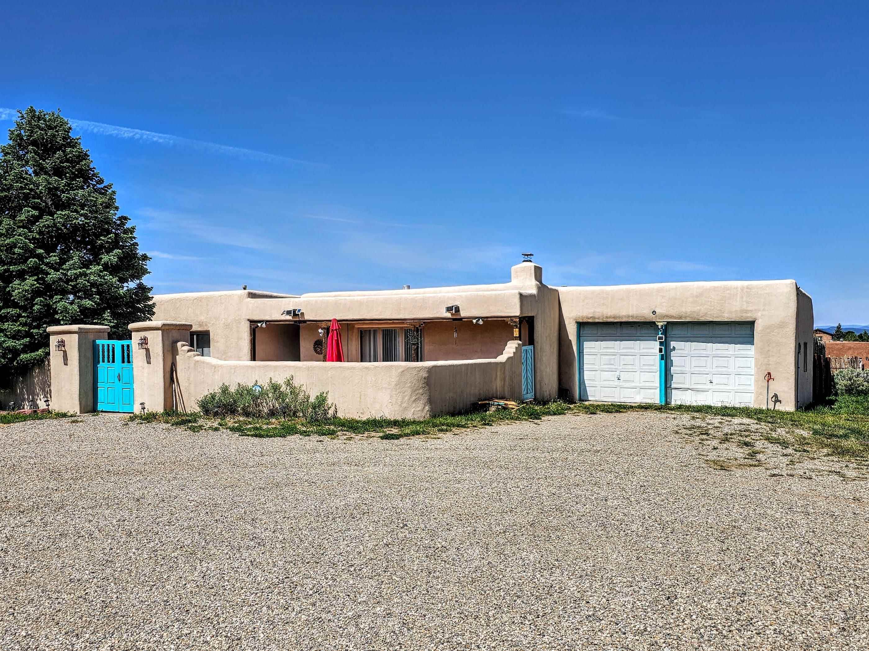 Warm and inviting, this 3bd/2ba adobe home is located on 0.86 acres in desireable Des Montes, close to the village of Arroyo Seco. Enjoy amazing mountain views from the flagstone front walled patio and equally amazing sunset views from the sunroom and adjacent deck. Warm wood accents abound throughout the house including Viga beam ceilings and custom woodworking touches. A wood-burning kiva fireplace compliments the great room and a gas fireplace in the dining room provides cozy charm, with a pellet stove in the west-facing sunroom. The 2-car garage is full adobe construction. Consider the potential for a studio or addition. A one-room basement includes a pool table and TV. Fiberoptic Internet via CenturyLink. Sold furnished. Includes irrigation water rights. Approx. 15 minutes from Taos Ski Valley and the Town of Taos, what a location!