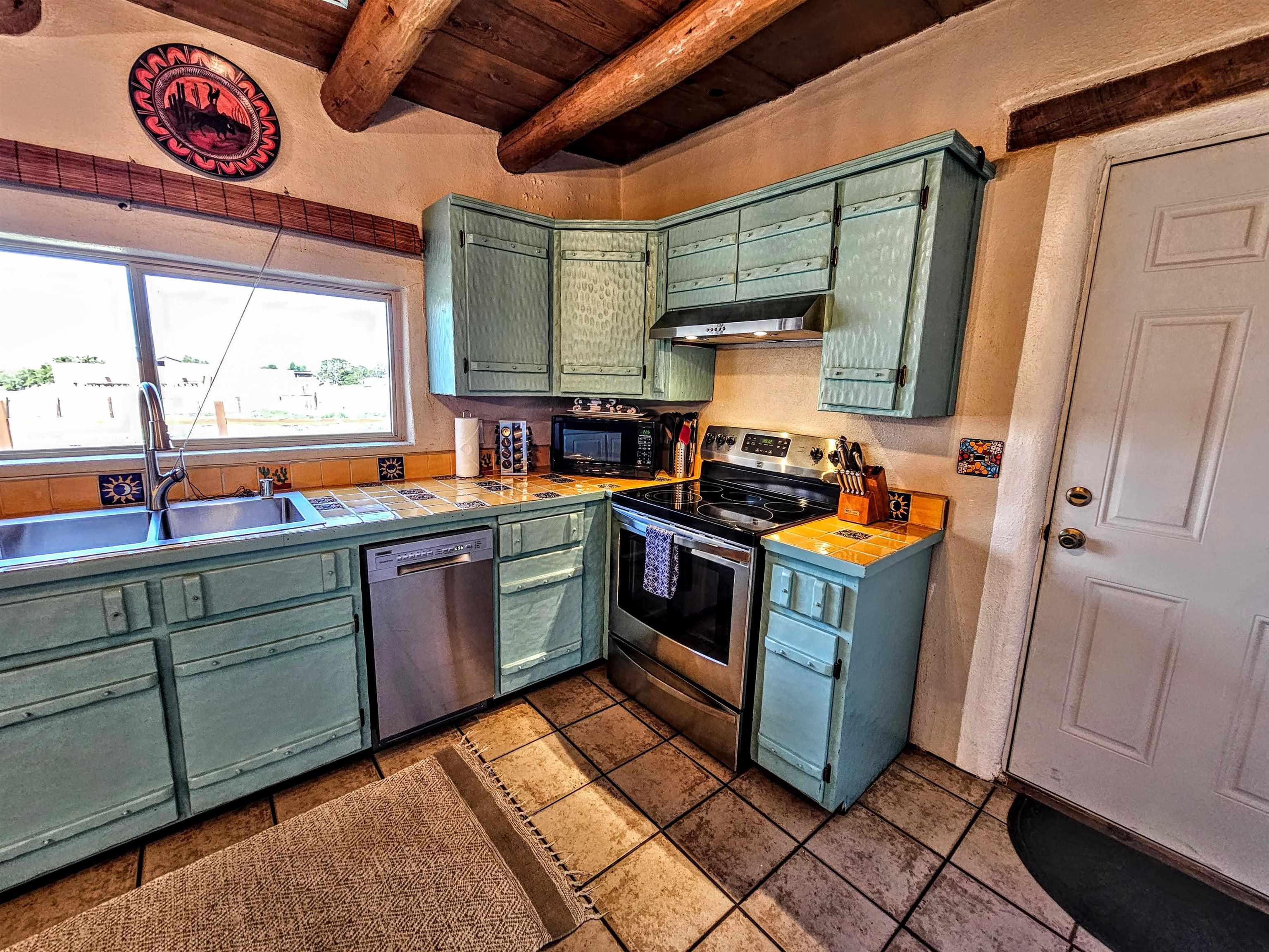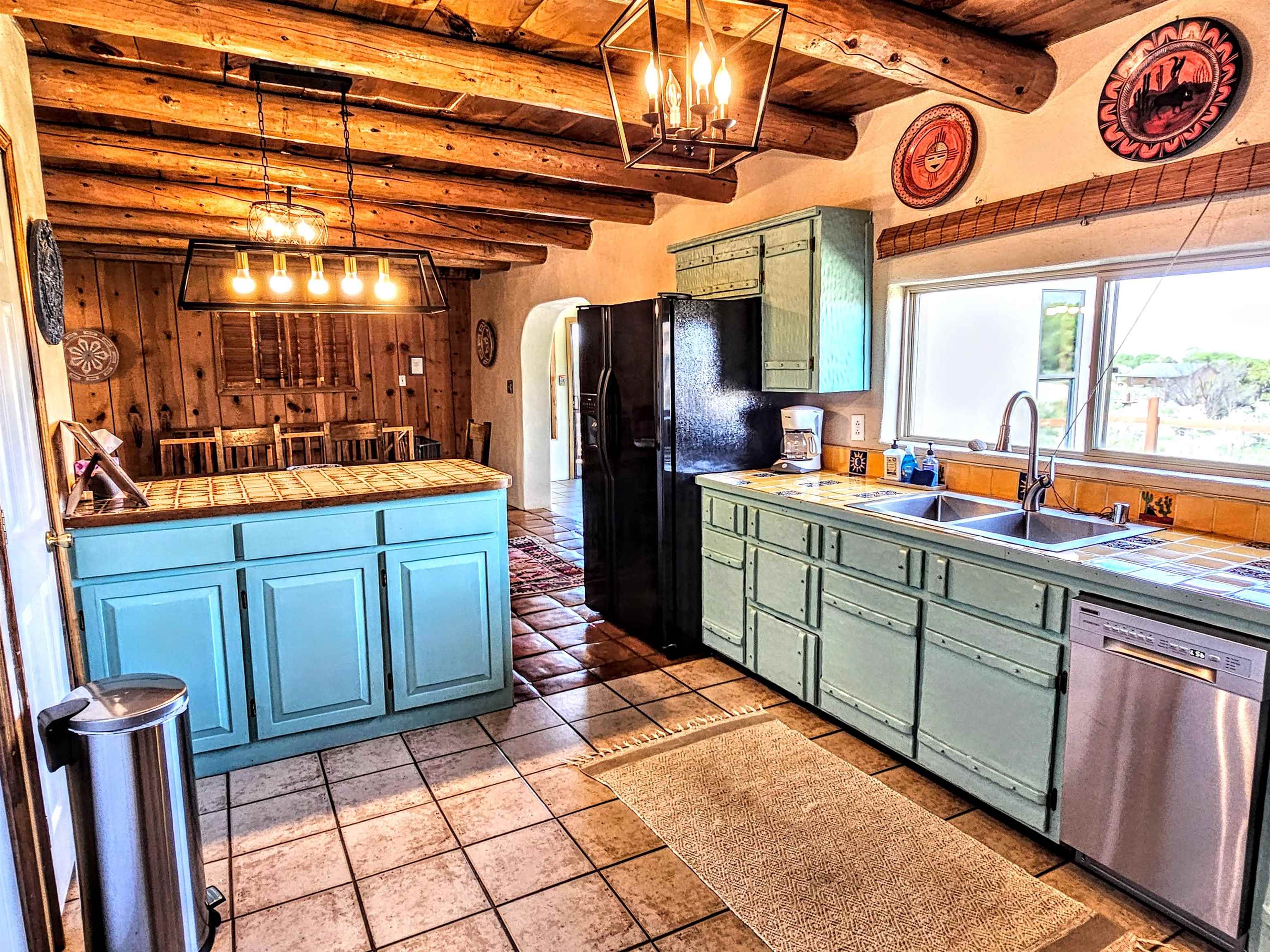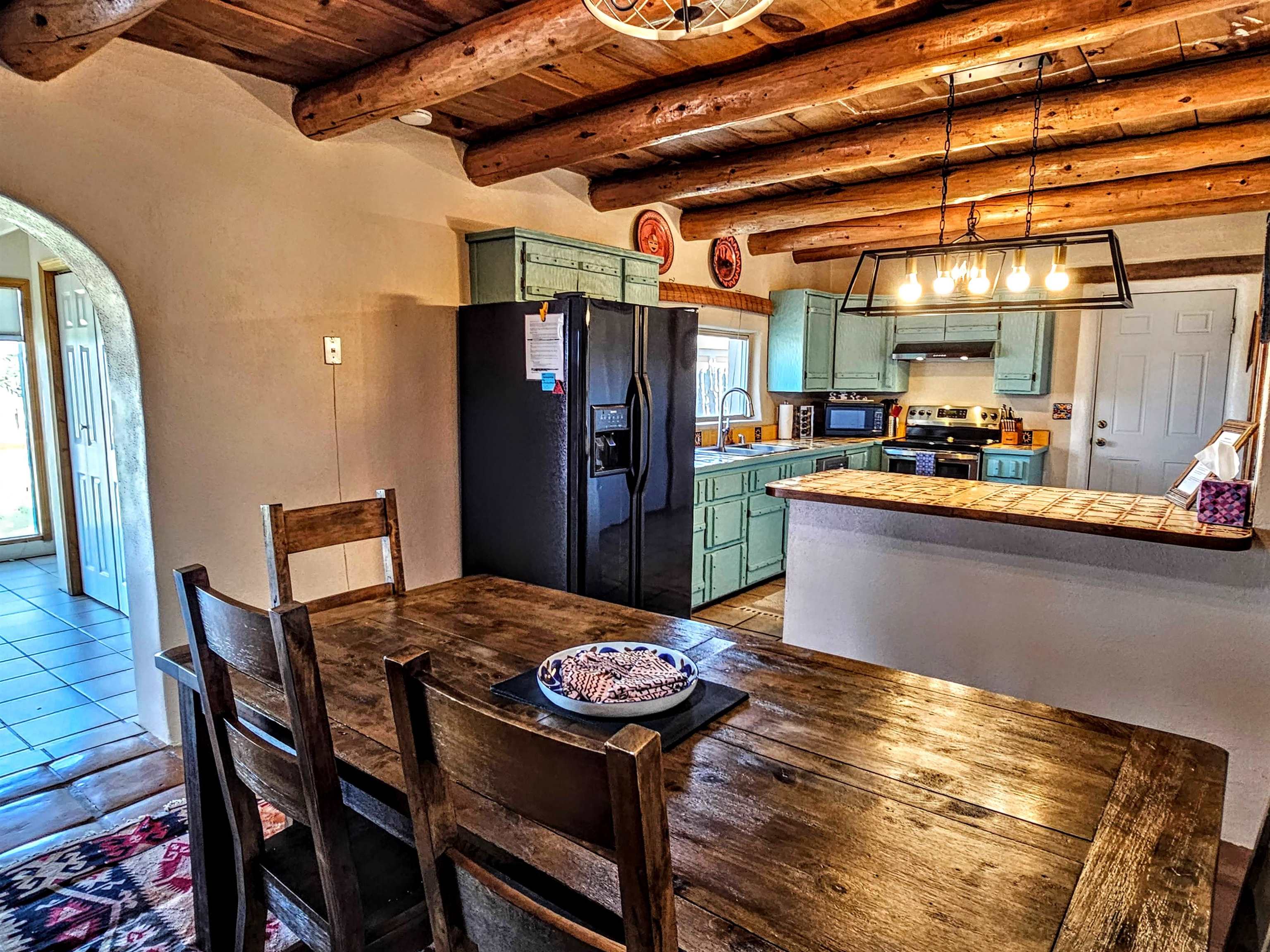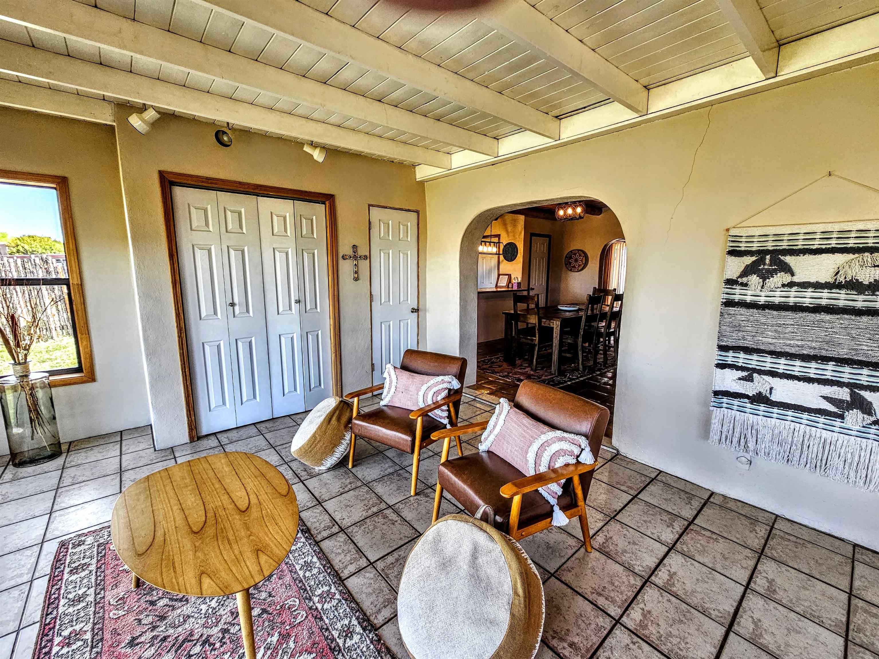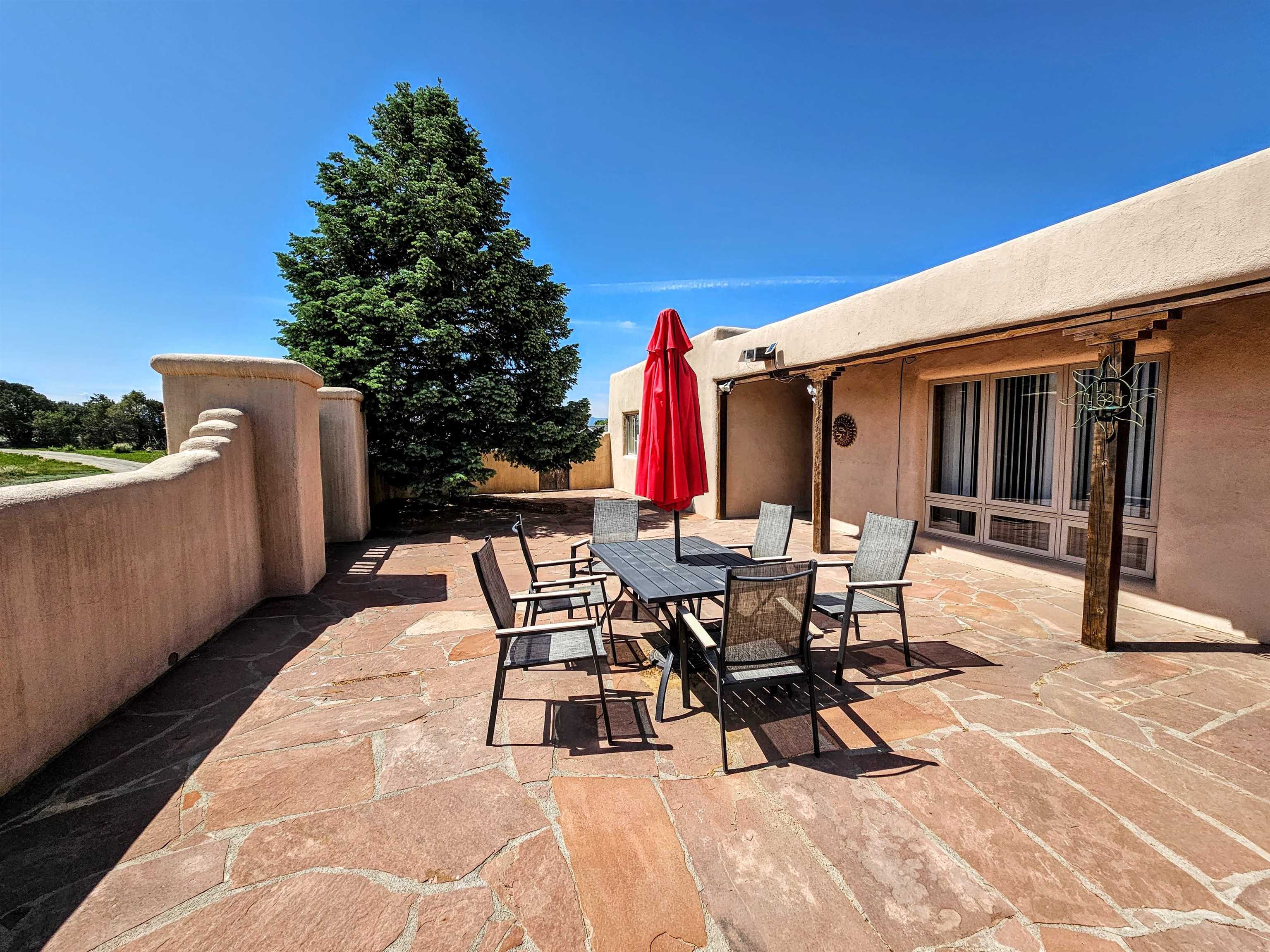 Warm and inviting, this 3bd/2ba adobe home is located on 0.86 acres in desireable Des Montes, close to the village of Arroyo Seco. Enjoy amazing mountain views from the flagstone front walled patio and equally amazing sunset views from the sunroom and adjacent deck. Warm wood accents abound throughout the house including Viga beam ceilings and custom woodworking touches. A wood-burning kiva fireplace compliments the great room and a gas fireplace in the dining room provides cozy charm, with a pellet stove in the west-facing sunroom. The 2-car garage is full adobe construction. Consider the potential for a studio or addition. A one-room basement includes a pool table and TV. Fiberoptic Internet via CenturyLink. Sold furnished. Includes irrigation water rights. Approx. 15 minutes from Taos Ski Valley and the Town of Taos, what a location!