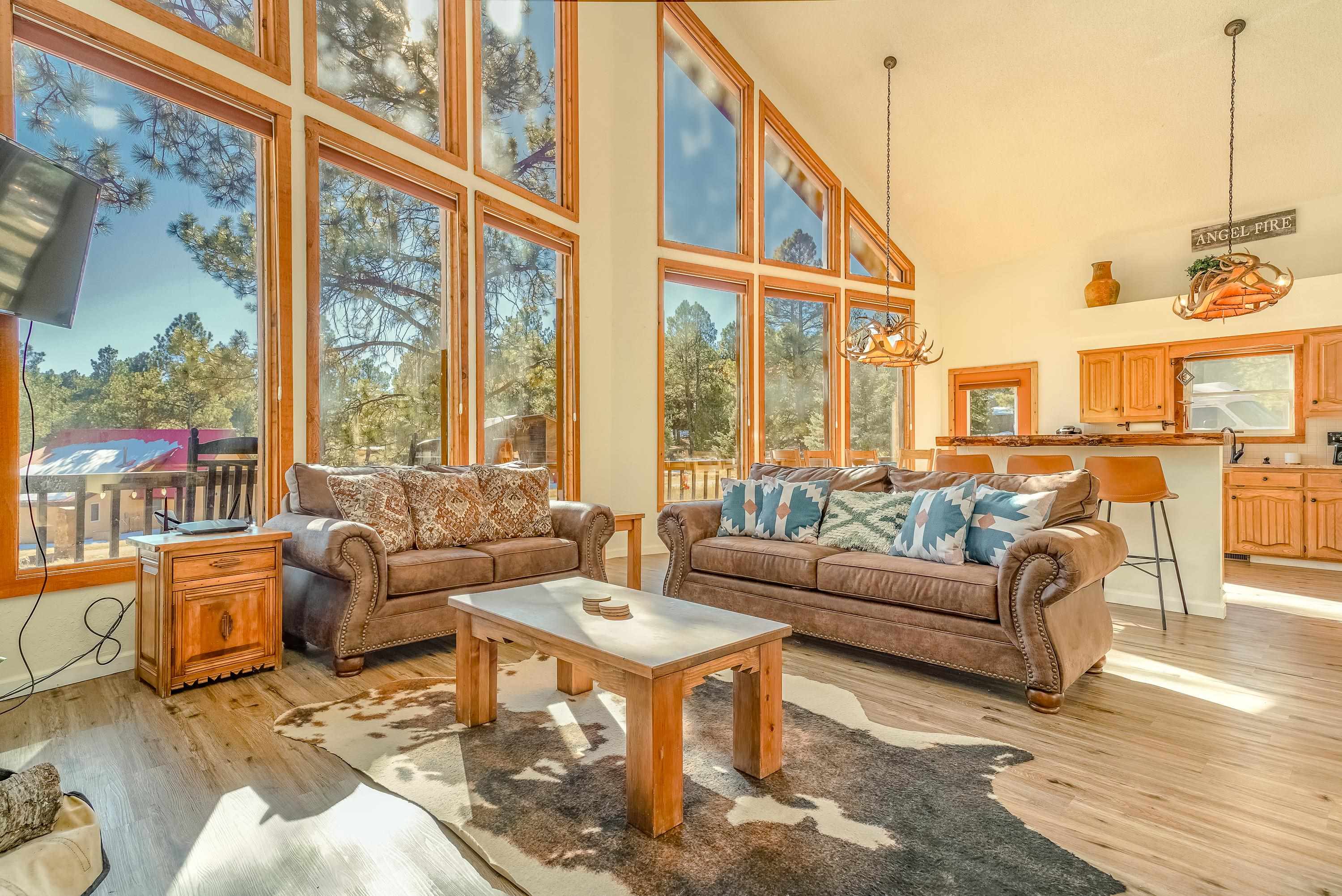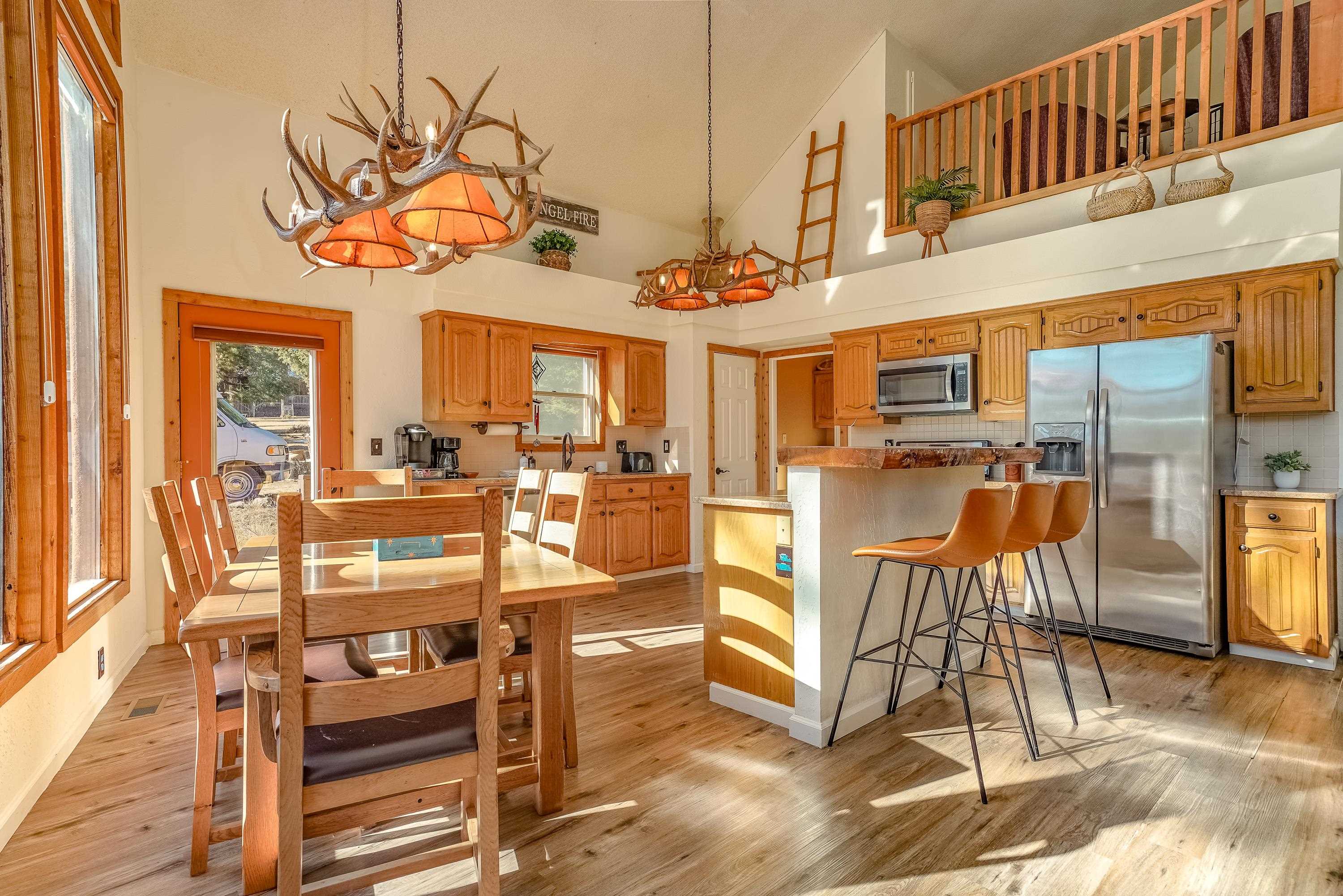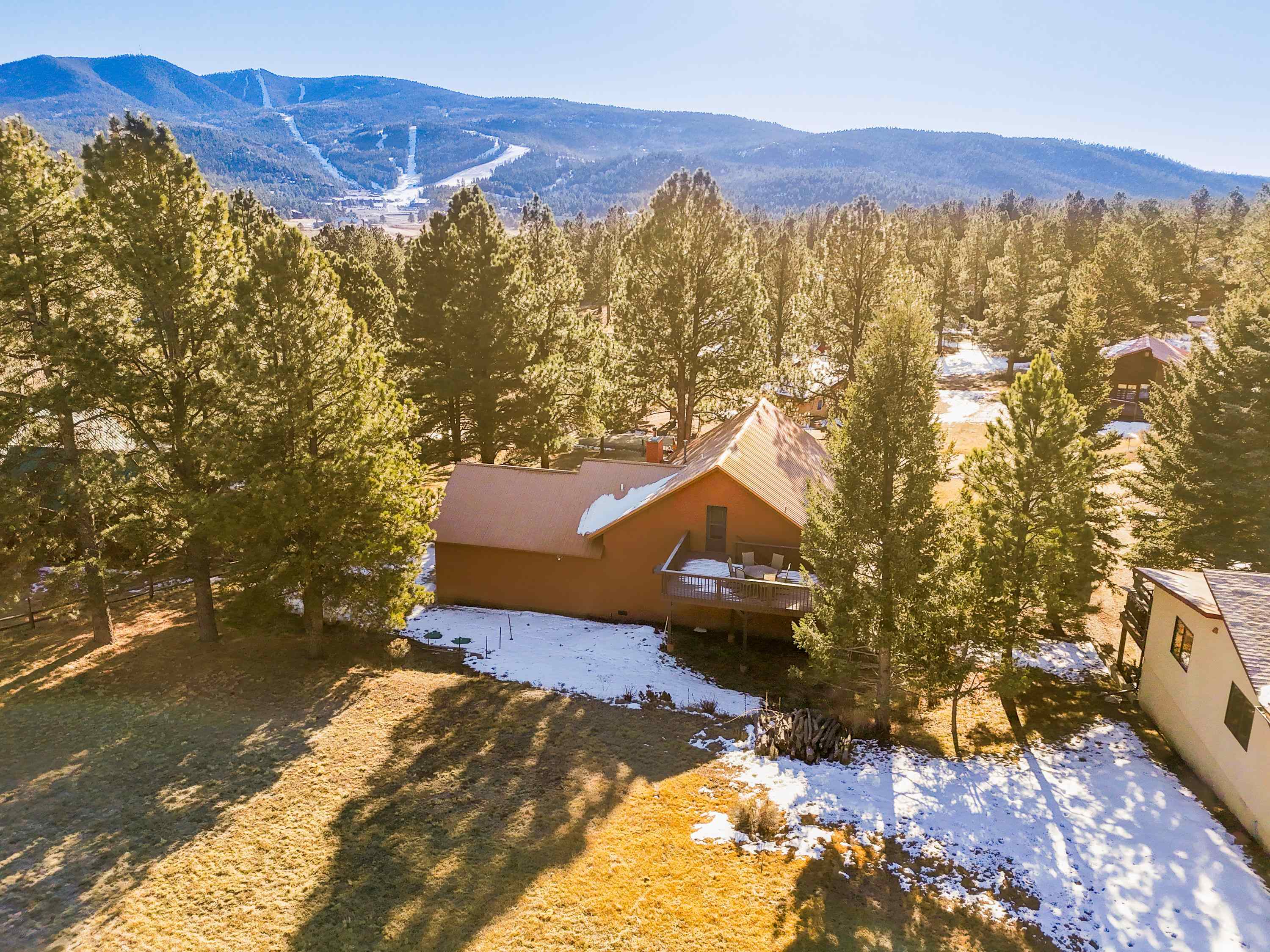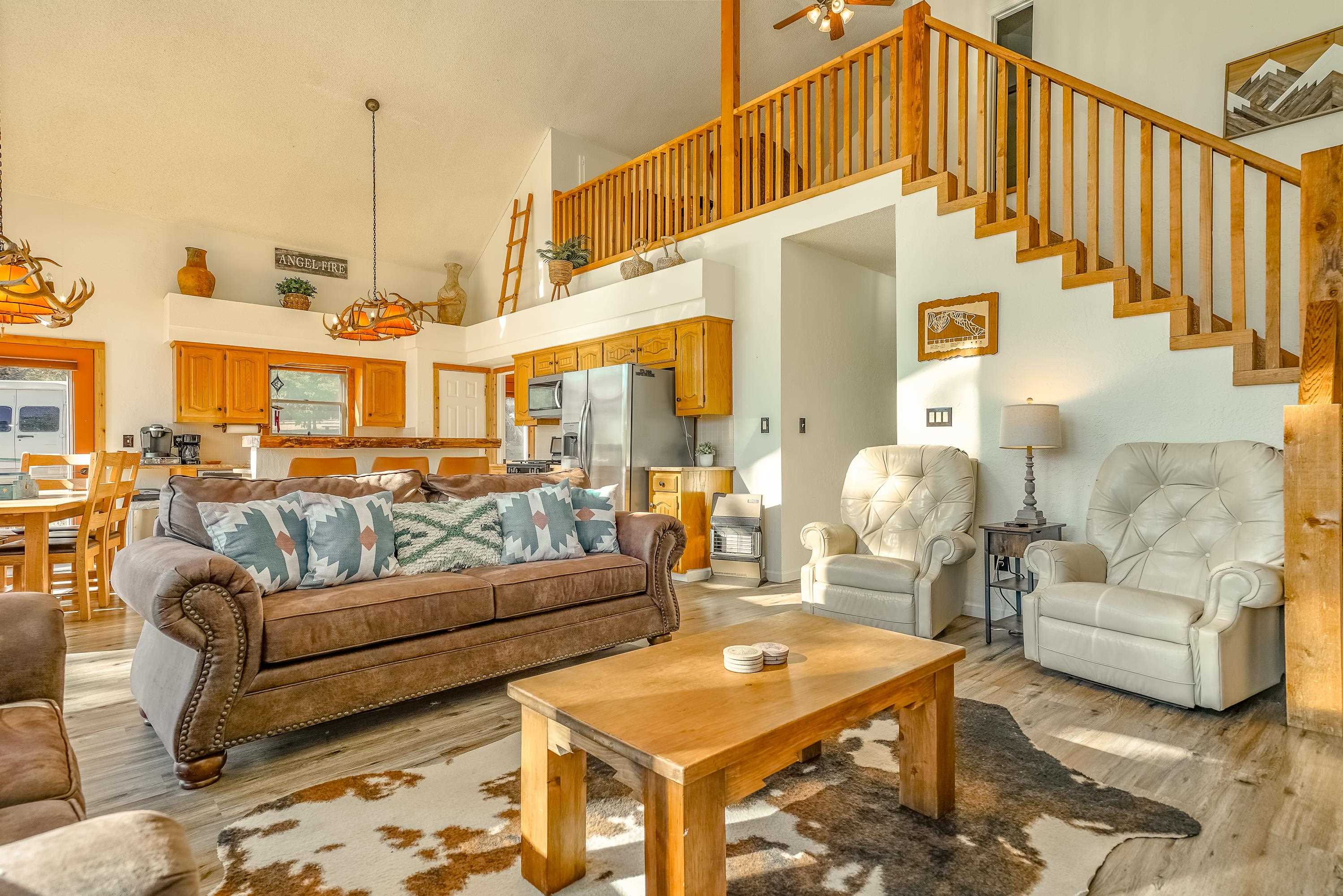 Welcome to 20 Armijo Drive, an Angel Fire chalet in an unbeatable location, just minutes from the grocery store, coffee shop, and local hiking trails. Set on a lovely 0.55-acre lot, this inviting mountain home offers ski area views, a functional layout, and plenty of space for family and friends to spread out comfortably. Step inside to a large mudroom entry, perfect for dropping coats and gear after a day on the slopes. The main living area features vaulted ceilings and oversized windows that bring in beautiful natural light, flowing into an open kitchen and dining space ideal for gatherings. Expansive deck space gives you plenty of space to relax outside - whether you’re chasing sunshine or cooling off in the shade, there’s a spot for every mood. The main-level primary suite makes for easy living, along with an additional guest bedroom, full guest bath, and laundry on the same floor. Upstairs, you’ll find a spacious loft (great for extra sleeping space or a cozy hangout area), plus another bedroom and bath. A private back deck adds the perfect place for quiet morning coffee or winding down after a day of adventure. With an attached 2-car garage, concrete driveway, and easy year-round access, this home is a fantastic fit as a full-time residence, vacation getaway, or potential rental in the heart of Angel Fire.