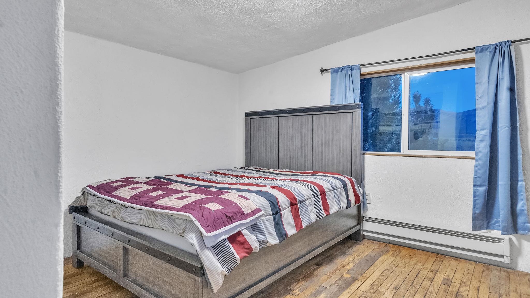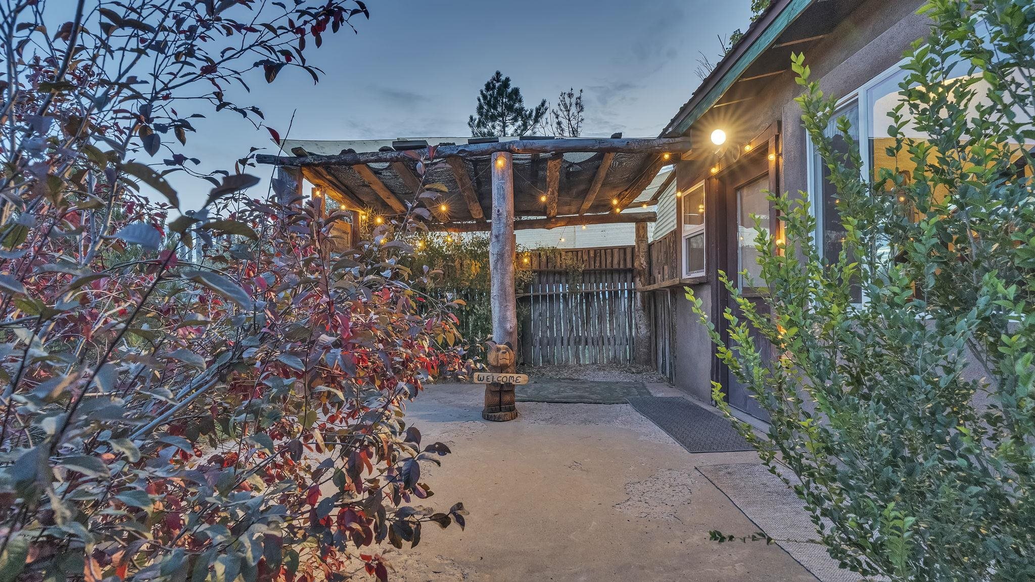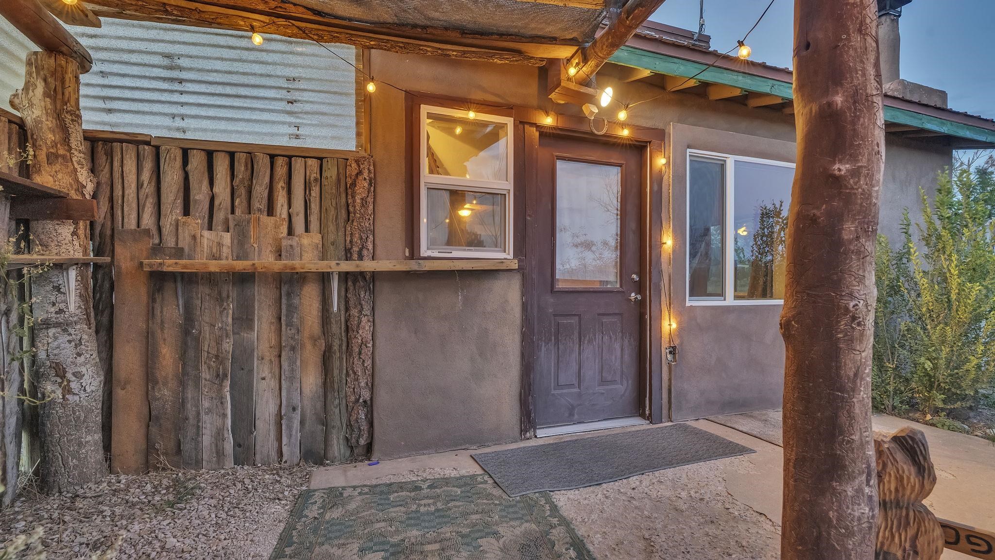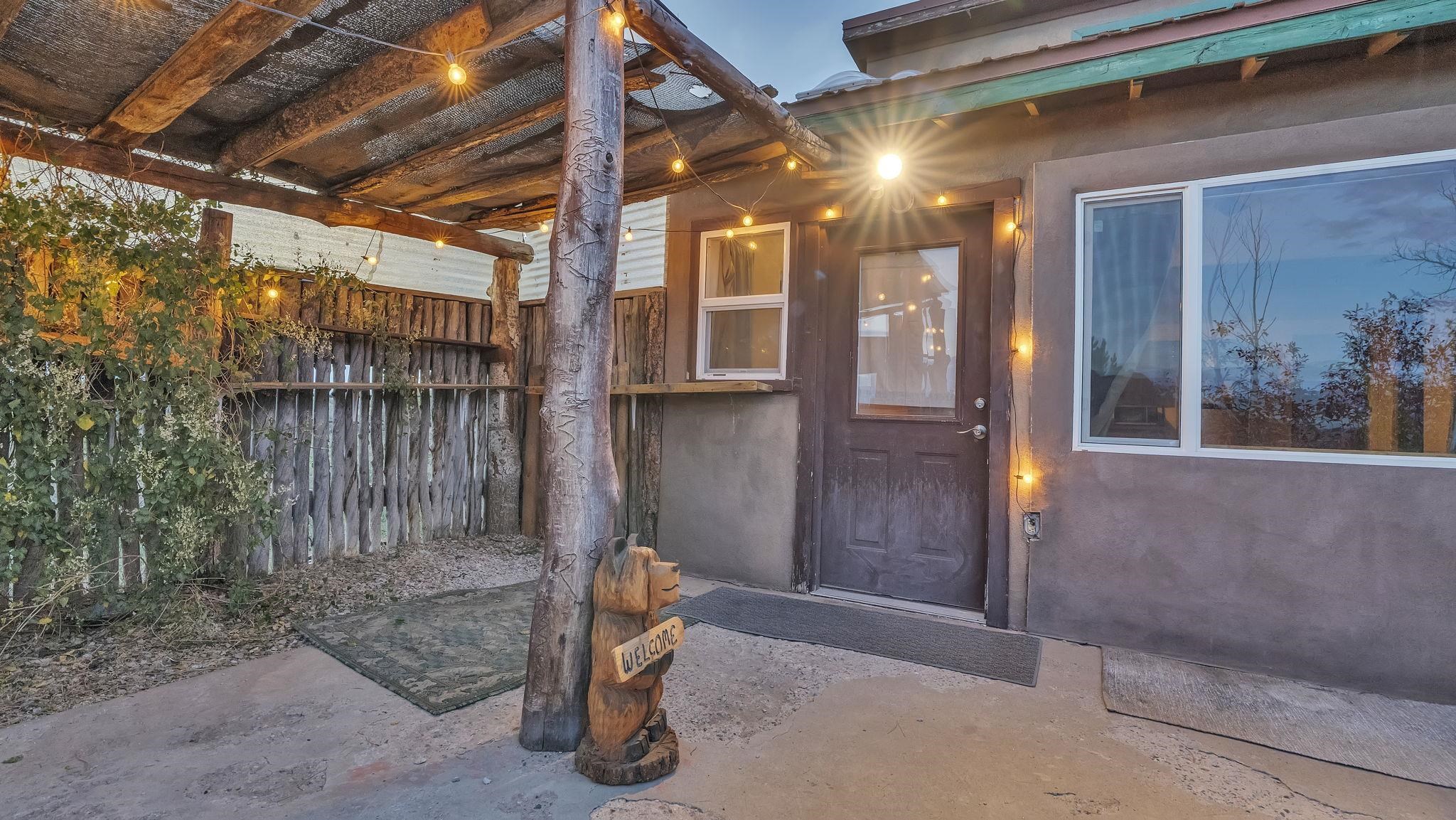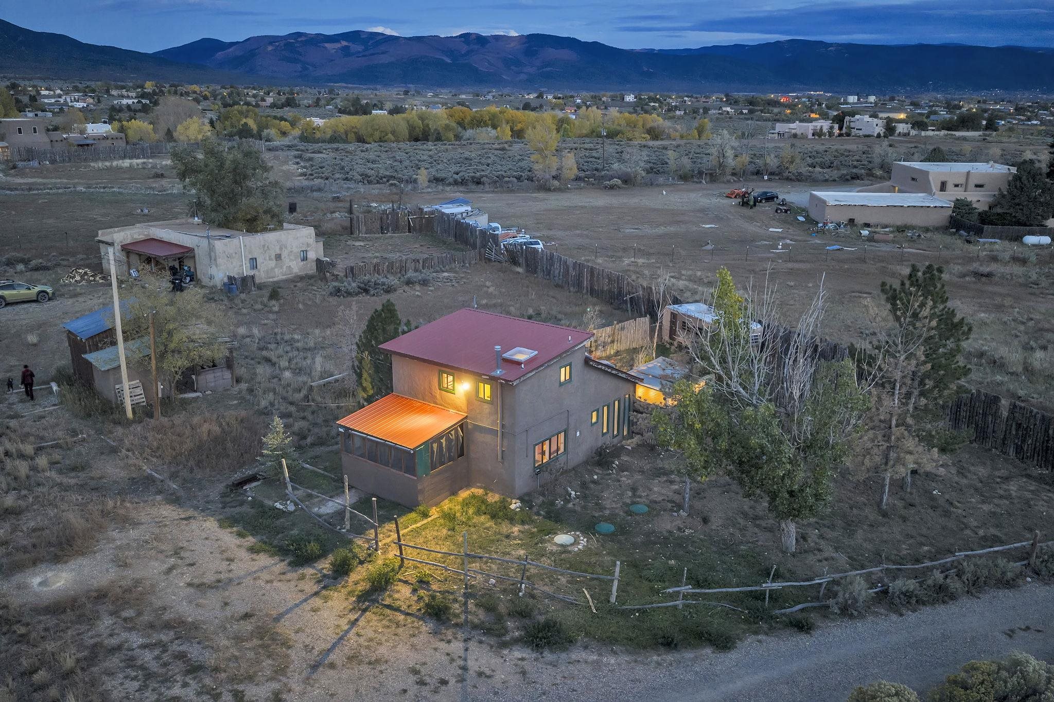 The Taos Escape You've Been Searching For ~ In the Upper Colonias neighborhood conveniently located near Highway 522, you will find this perfect little home situated on three-quarter acres of land with stellar mountain views. The residence capitalizes on panoramic southern exposure which helps to keep the home nice and warm naturally. Inside, the fluid, open-plan is enriched by a traditional kiva fireplace, a reclaimed Spanish-era timber beam, with classic brick floors. The upper level contains a private sanctuary, complete with slate flooring and magnified mountain views. The exterior features a small portal with bistro lighting beside the garden and a secure, fenced perimeter for pets. The grounds are surrounded by trees, punctuated by towering ponderosa pines and aspen. A detached, two-story annex (currently an artist's refuge) offers additional potential, and can possibly be converted to an equine enclosure, offering forty linear feet of secure storage. Here, you will be few minutes from the Taos Ski Valley, the Town of Taos, John Dunn Bridge at the Rio Grande, and many more desirable locations for outdoor exploring. this property presents a rare investment opportunity or a deeply personalized homestead, come see for yourself!
