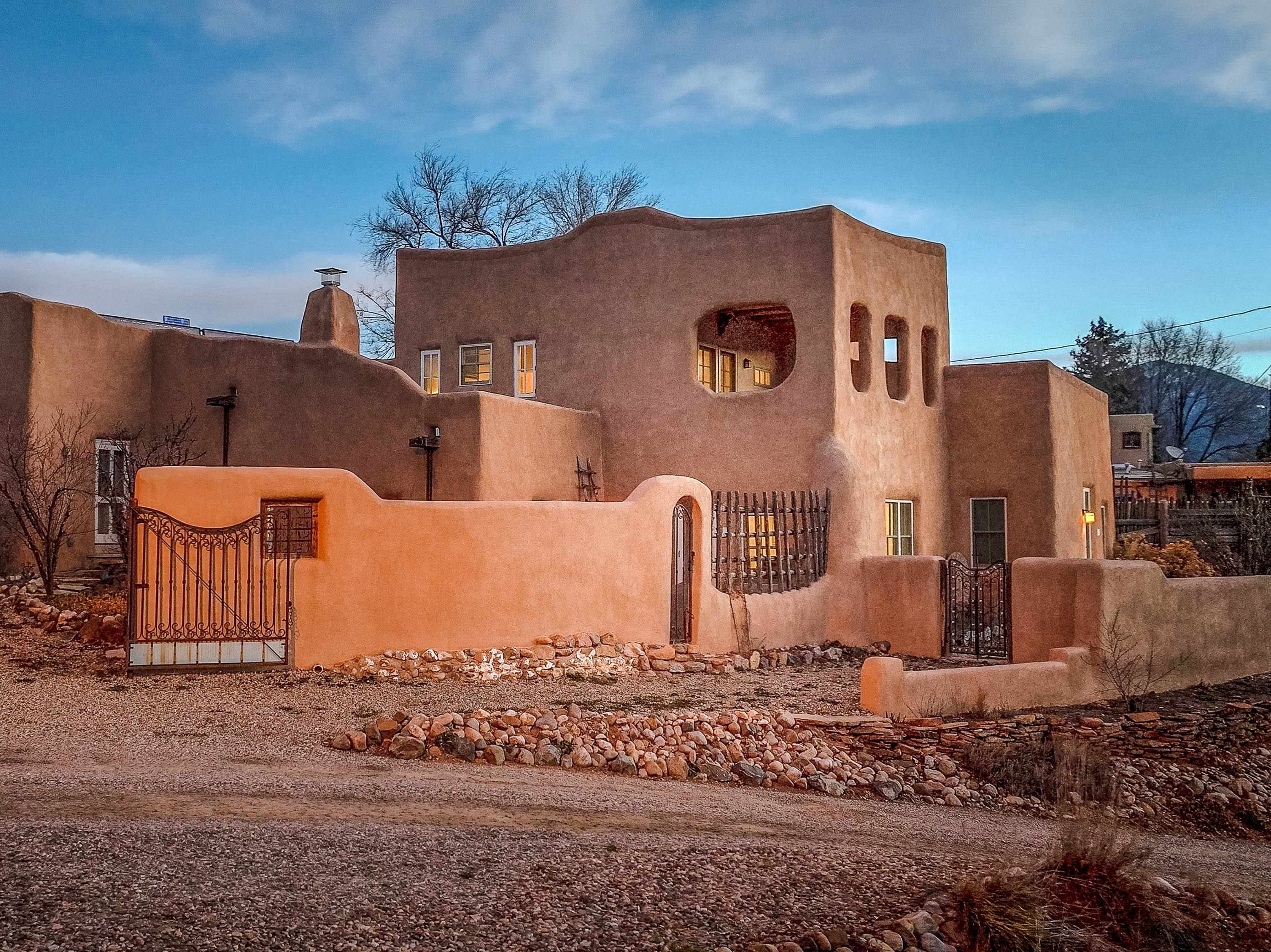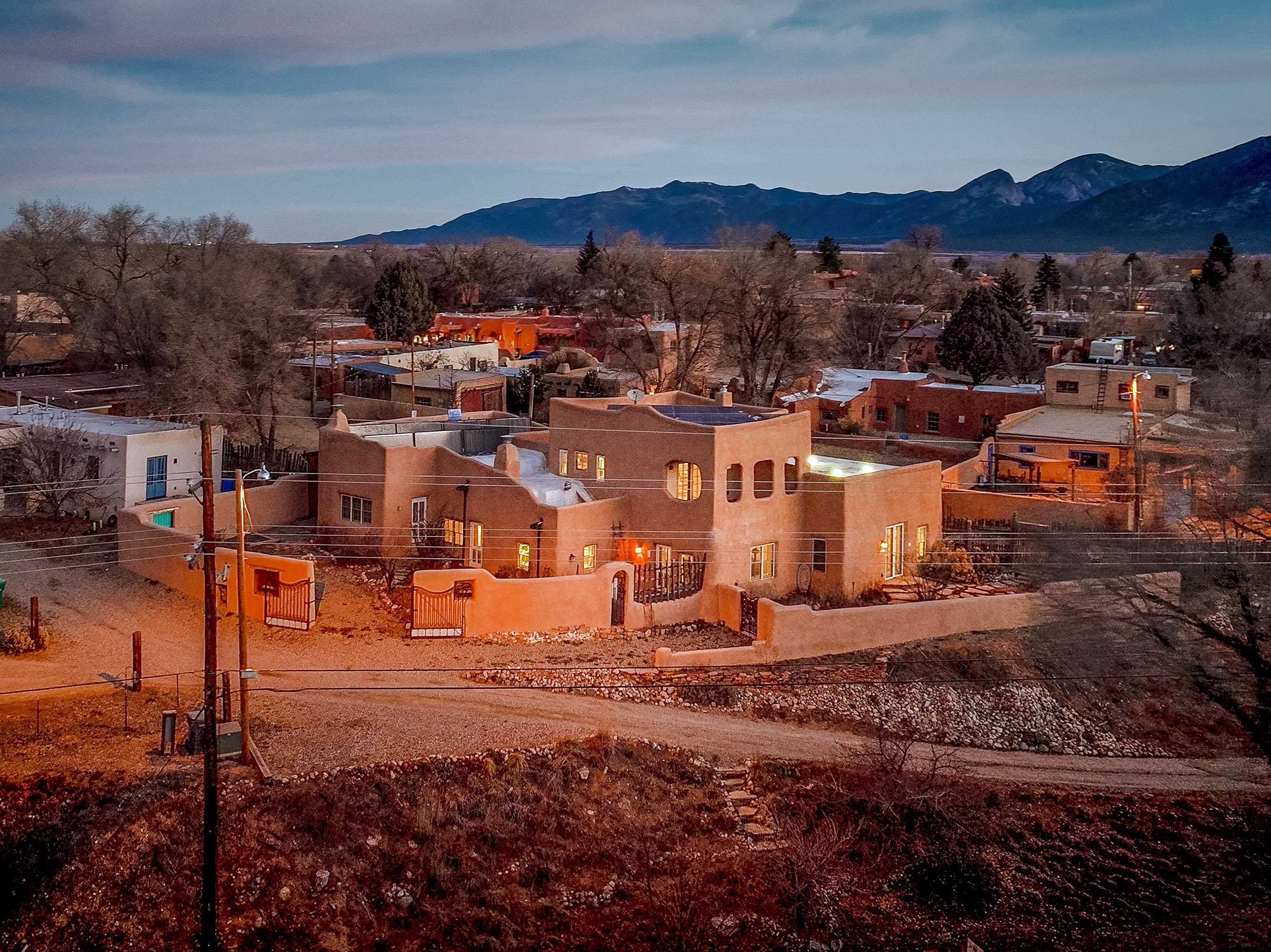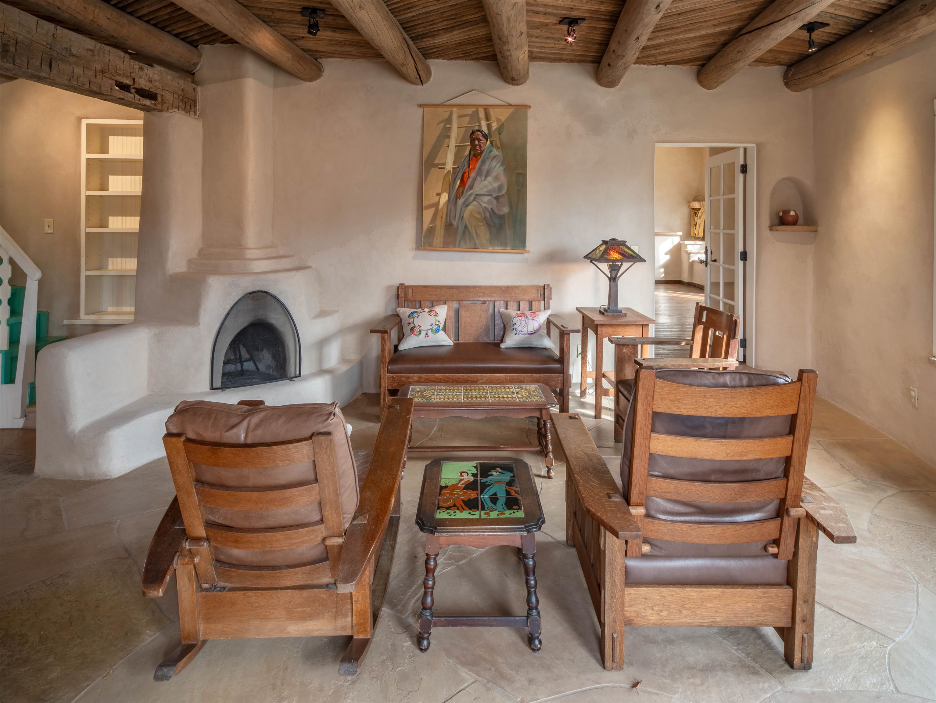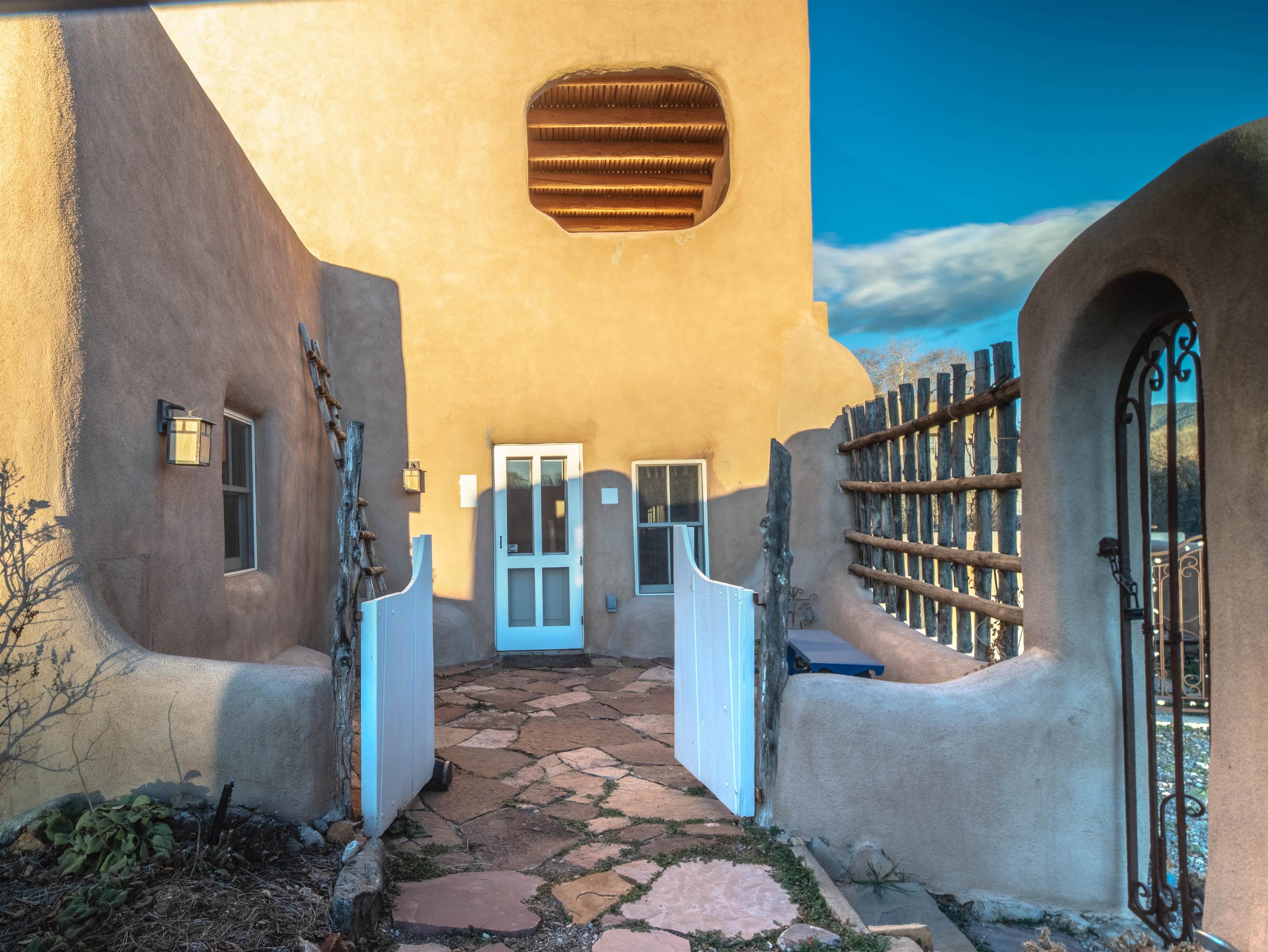 Hidden behind adobe walls in Taos’ historic district, the Ribak Estate unfolds as a rare convergence of place, art, and enduring craftsmanship. Backing up to La Loma Plaza, an enclave established in 1795 - this storied property occupies a setting where Taos’ architectural and artistic traditions remain vividly alive. Owned by the renowned Taos Modernists, Beatrice Mandelman and Louis Ribak, the home served for decades as a residence, studio, gallery, and a gathering place for influential artists whose work helped define Taos on the international stage. That legacy is still palpable today, not as a museum piece, but as a living environment shaped by creativity, conversation, and thoughtful stewardship over generations. Recognized by the State of New Mexico as a significant example of Pueblo Revival architecture and documented on the 1929 town survey, the home reflects the hallmarks of authentic adobe construction: substantial walls, sculpted mud plaster, hand-carved corbels, vigas and latillas, nichos, and four traditional Southwestern fireplaces. In 2006, the residence was comprehensively rebuilt from the ground up, preserving historic integrity while integrating modern systems including radiant floor heating, updated electrical, double-pane windows and doors, and energy-efficient infrastructure. The approximately 3,280-square-foot interior is arranged with uncommon flexibility. The main residence offers two bedrooms and two bathrooms, while a fully independent one-bedroom apartment - seamlessly integrated under the same roof - provides options for guests, extended family, rental income, or creative use. The spaces flow naturally rather than formally, with rooms unfolding in a way that feels organic, collected, and deeply personal. At the center of the home, a welcoming parlor and dining area anchors daily life, illuminated by deep-set windows and enriched by museum-quality antique lighting from the seller’s collection. The adjoining kitchen balances charm and practicality, featuring a Viking range, hand-painted cabinetry, generous storage, and historic painted beams attributed to early Taos artist and historian Blanche Chloe Grant. One of the home’s most compelling spaces is the expansive living room, historically used as an art school and long known as a gathering place for visiting artists and thinkers. Upstairs, the primary suite offers a peaceful retreat with built-in cabinetry, a sitting area, an oversized bath, and French doors opening to both a covered front balcony and a rear Juliet balcony - each offering a different sense of light, sky, and perspective. The separate apartment enjoys its own living area, kitchen, fireplace, and direct access to a private, stone-terraced courtyard - ideal for quiet mornings, creative pursuits, or hosting guests with privacy. Throughout the property, materials have been carefully curated: reclaimed wood, flagstone, Saltillo tile, antique mirrors, and historic lighting create a layered, authentic atmosphere impossible to replicate. Modern sustainability features include roof-fed cisterns, solar hot-water panels with natural-gas backup, photovoltaic panels supplying select electrical outlets, an air-exchange system, Hunter Douglas blinds, and recent mechanical upgrades including a new Polaris boiler and thermostats (2024). Outdoors, the fully enclosed compound offers custom iron gates, mature Spruce and fruit trees, landscaped rockwork, multiple off-street parking spaces, rear alley access, and forthcoming Ranchitos Road sidewalk improvements. This is not simply a historic home - it is a place shaped by ideas and artistry. A rare opportunity to live within one of Taos’ most meaningful residential legacies, thoughtfully preserved for the next chapter. Call us today for a copy of the property’s extensive history, and the numerous improvements made, and then schedule a showing. You do not want to miss this one! This listing has exterior and interior videos for your viewing pleasure.