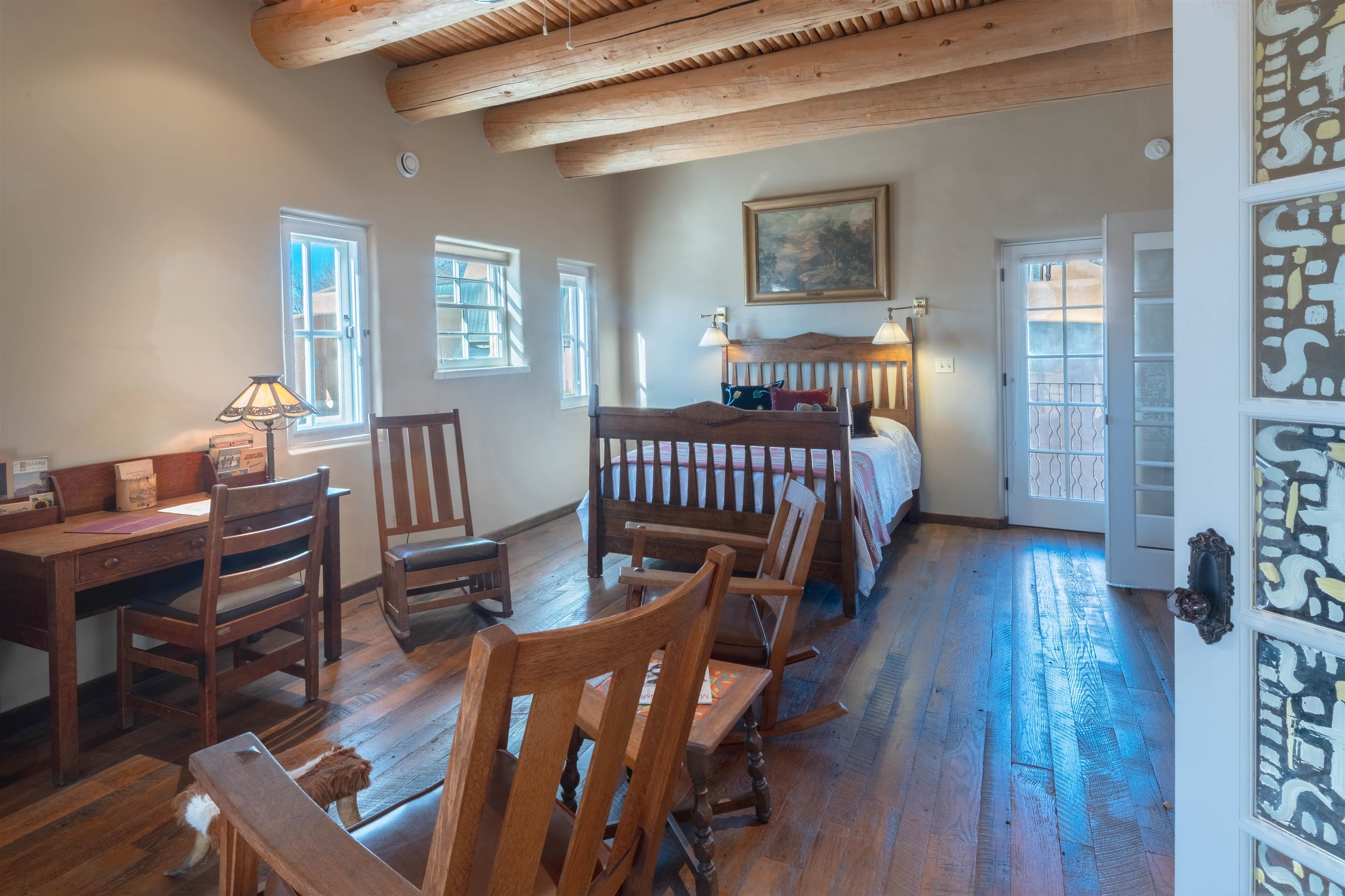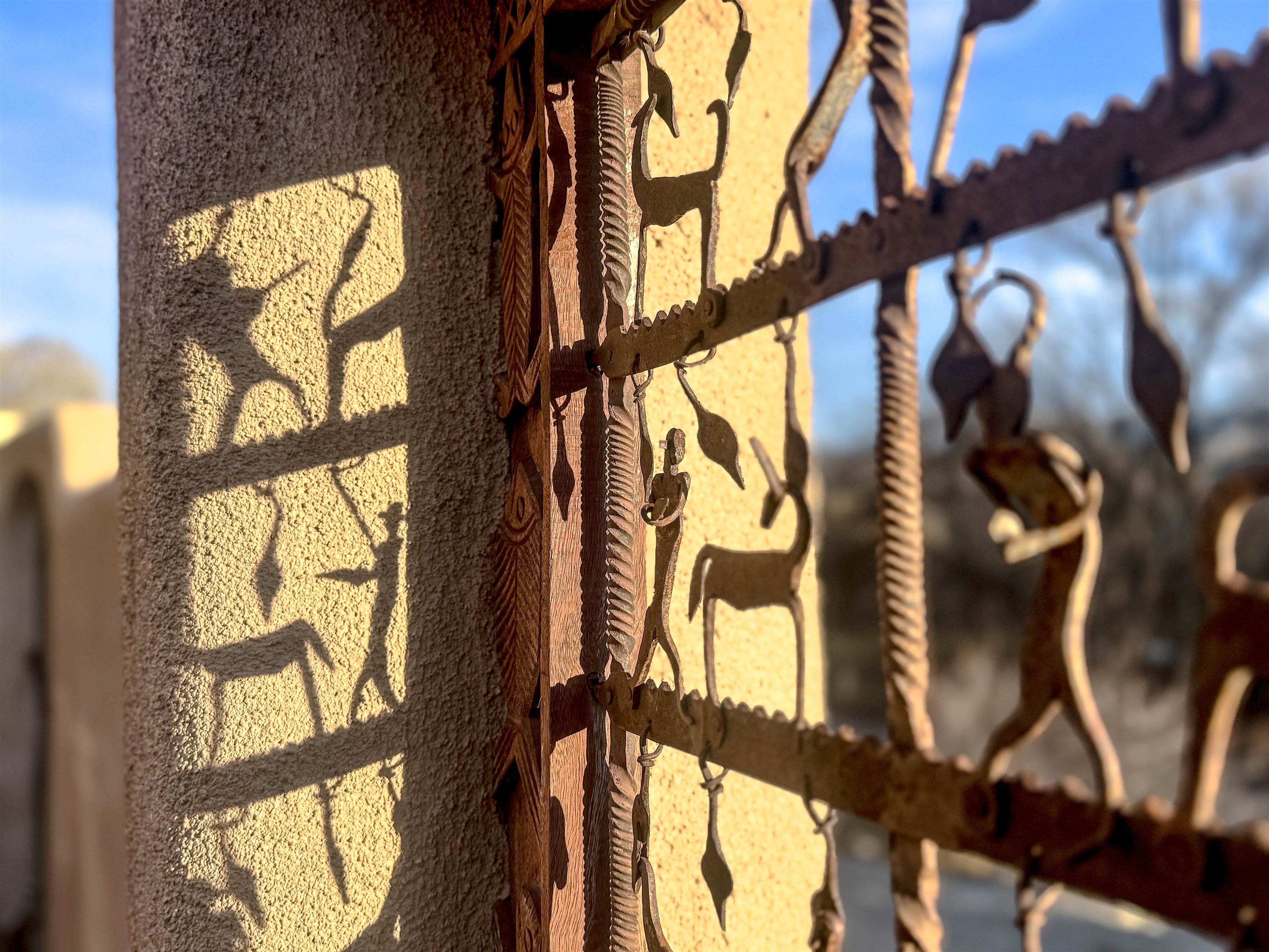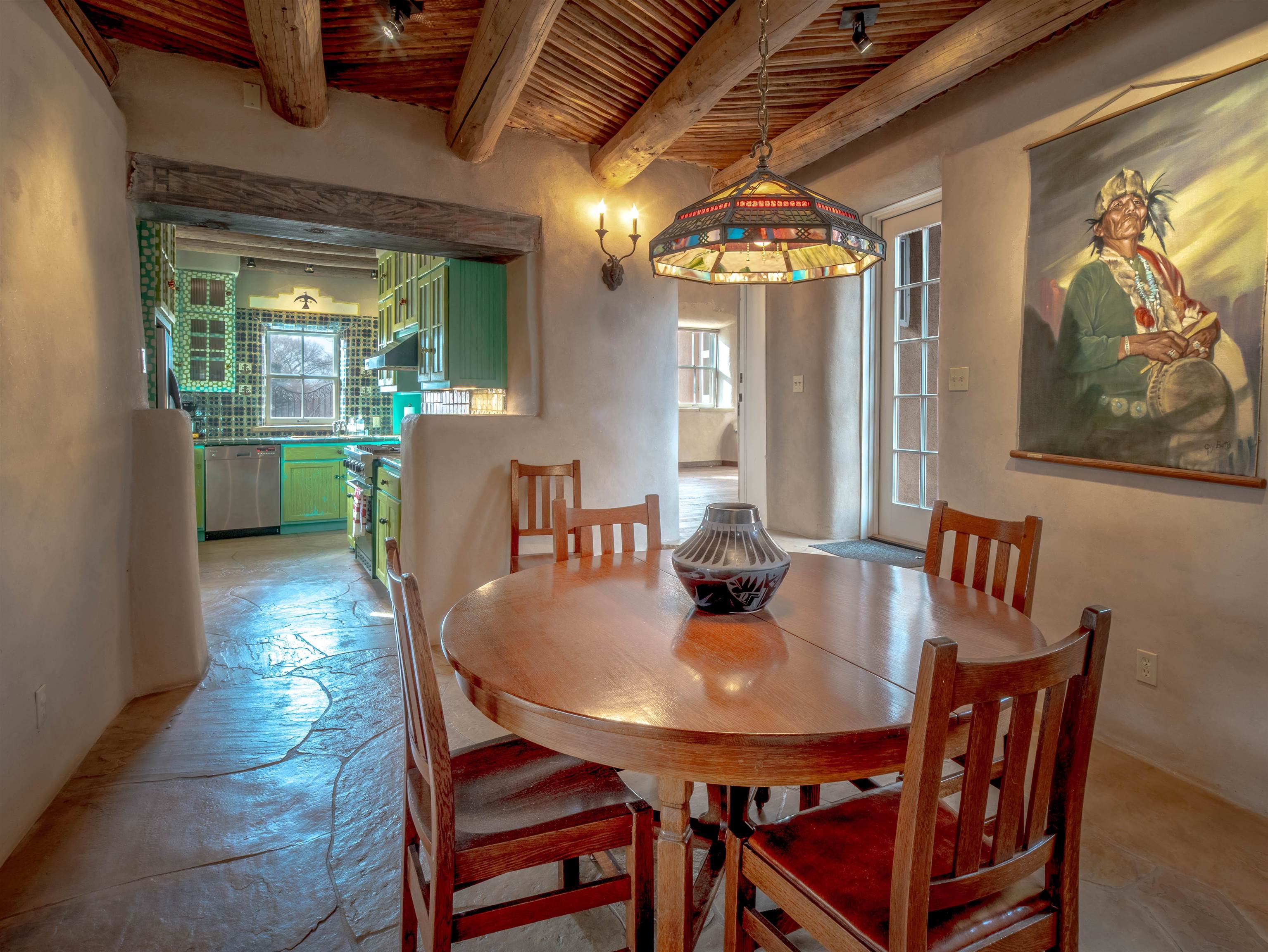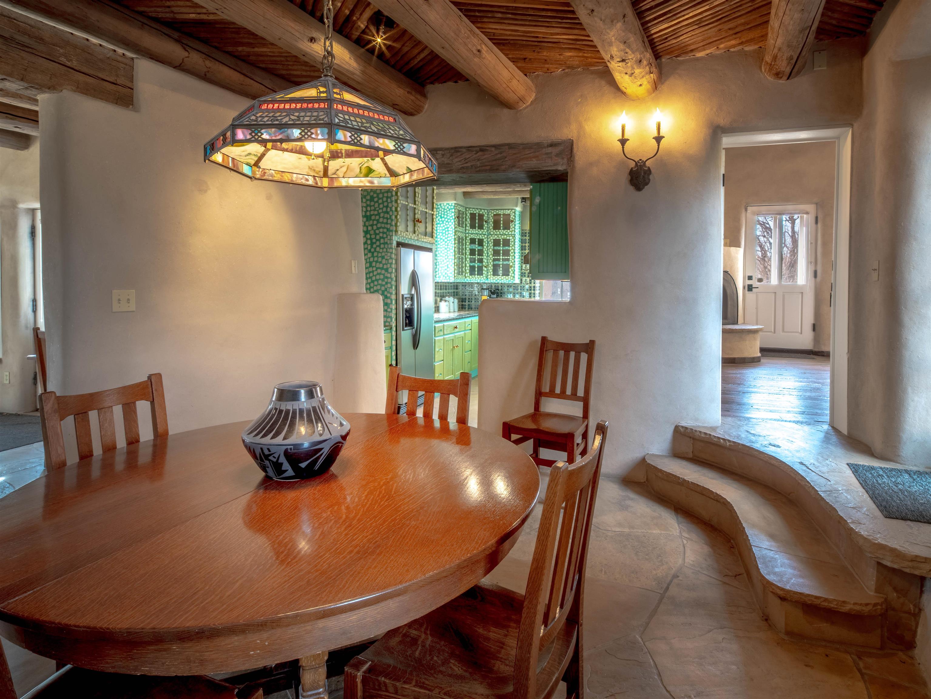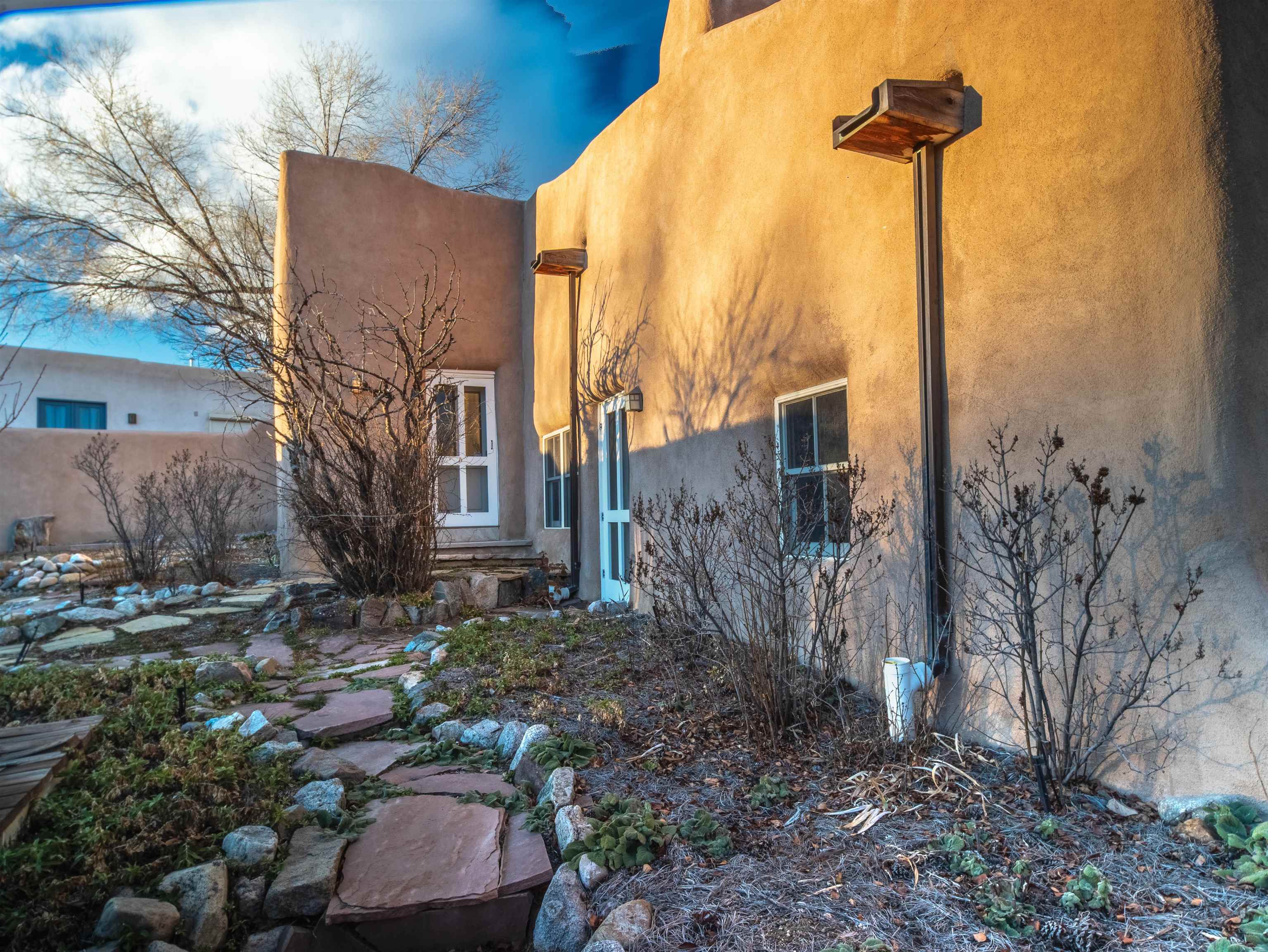Hidden behind adobe walls in Taos’ historic district, the Ribak Estate unfolds as a rare convergence of place, art, and enduring craftsmanship. Backing up to La Loma Plaza, an enclave established in 1795 - this storied property occupies a setting where Taos’ architectural and artistic traditions remain vividly alive. Owned by the renowned Taos Modernists, Beatrice Mandelman and Louis Ribak, the home served for decades as a residence, studio, gallery, and a gathering place for influential artists whose work helped define Taos on the international stage. That legacy is still palpable today, not as a museum piece, but as a living environment shaped by creativity, conversation, and thoughtful stewardship over generations. Recognized by the State of New Mexico as a significant example of Pueblo Revival architecture and documented on the 1929 town survey, the home reflects the hallmarks of authentic adobe construction: substantial walls, sculpted mud plaster, hand-carved corbels, vigas and latillas, nichos, and four traditional Southwestern fireplaces. In 2006, the residence was comprehensively rebuilt from the ground up, preserving historic integrity while integrating modern systems including radiant floor heating, updated electrical, double-pane windows and doors, and energy-efficient infrastructure. The approximately 3,280-square-foot interior is arranged with uncommon flexibility. The main residence offers two bedrooms and two bathrooms, while a fully independent one-bedroom apartment - seamlessly integrated under the same roof - provides options for guests, extended family, rental income, or creative use. The spaces flow naturally rather than formally, with rooms unfolding in a way that feels organic, collected, and deeply personal. At the center of the home, a welcoming parlor and dining area anchors daily life, illuminated by deep-set windows and enriched by museum-quality antique lighting from the seller’s collection. The adjoining kitchen balances charm and practicality, featuring a Viking range, hand-painted cabinetry, generous storage, and historic painted beams attributed to early Taos artist and historian Blanche Chloe Grant. One of the home’s most compelling spaces is the expansive living room, historically used as an art school and long known as a gathering place for visiting artists and thinkers. Upstairs, the primary suite offers a peaceful retreat with built-in cabinetry, a sitting area, an oversized bath, and French doors opening to both a covered front balcony and a rear Juliet balcony - each offering a different sense of light, sky, and perspective. The separate apartment enjoys its own living area, kitchen, fireplace, and direct access to a private, stone-terraced courtyard - ideal for quiet mornings, creative pursuits, or hosting guests with privacy. Throughout the property, materials have been carefully curated: reclaimed wood, flagstone, Saltillo tile, antique mirrors, and historic lighting create a layered, authentic atmosphere impossible to replicate. Modern sustainability features include roof-fed cisterns, solar hot-water panels with natural-gas backup, photovoltaic panels supplying select electrical outlets, an air-exchange system, Hunter Douglas blinds, and recent mechanical upgrades including a new Polaris boiler and thermostats (2024). Outdoors, the fully enclosed compound offers custom iron gates, mature Spruce and fruit trees, landscaped rockwork, multiple off-street parking spaces, rear alley access, and forthcoming Ranchitos Road sidewalk improvements. This is not simply a historic home - it is a place shaped by ideas and artistry. A rare opportunity to live within one of Taos’ most meaningful residential legacies, thoughtfully preserved for the next chapter. Call us today for a copy of the property’s extensive history, and the numerous improvements made, and then schedule a showing. You do not want to miss this one! This listing has exterior and interior videos for your viewing pleasure.