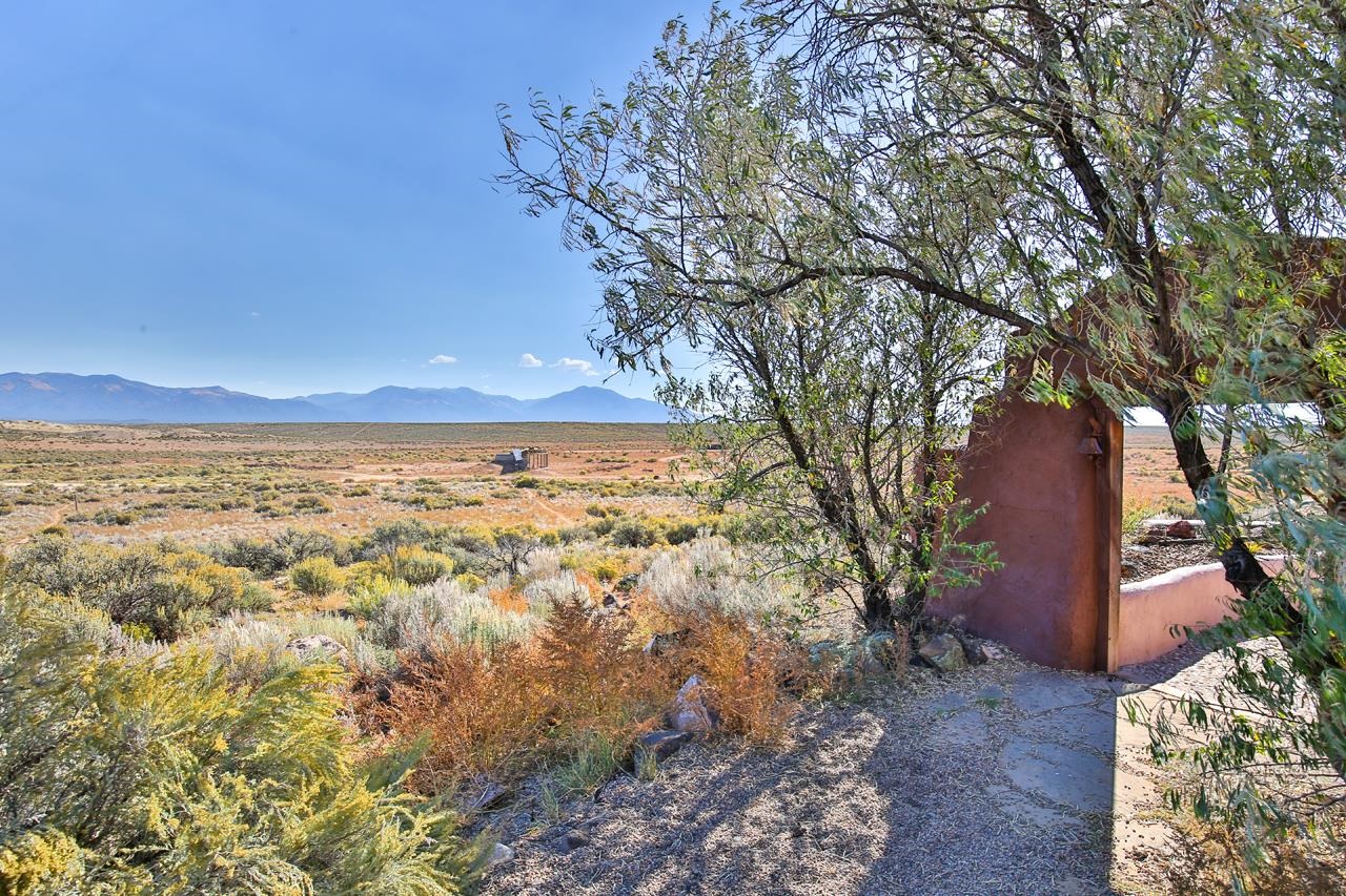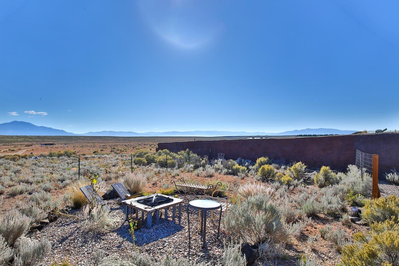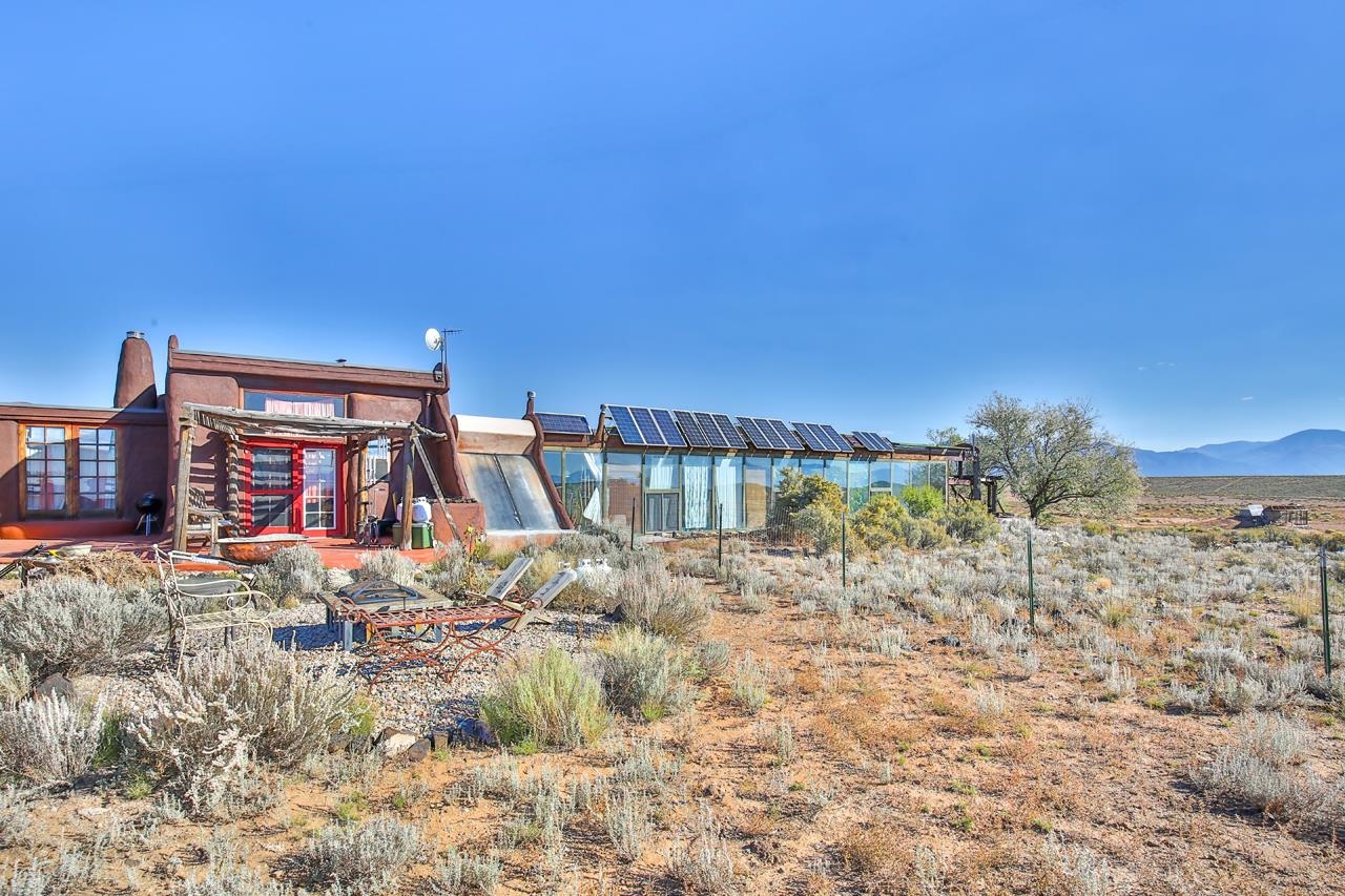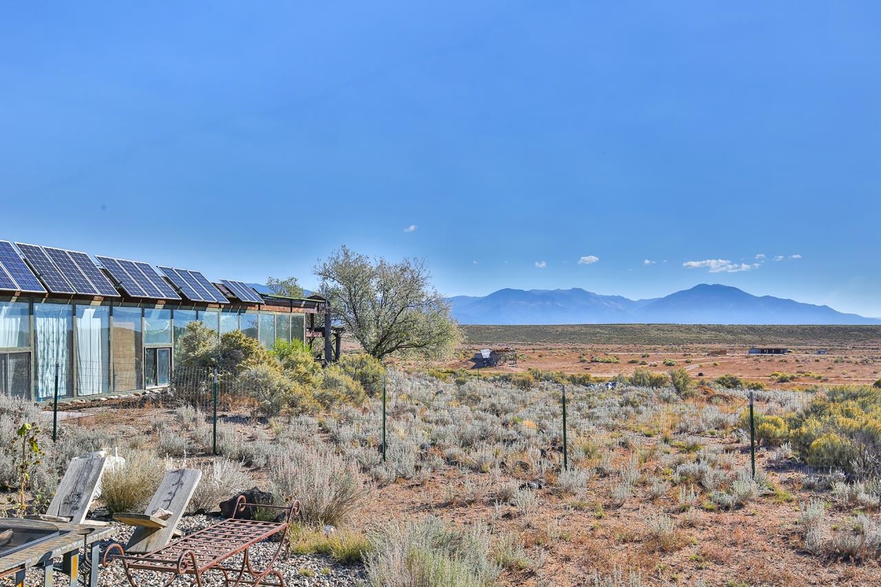 Welcome to what is arguably the best property in the Greater World Community! Set at the end of Lone Tree Lane, a peaceful dead-end road winding through the high mesa, the home sits on a natural rise, offering wide, unobstructed views of Taos Mountain. The main house features two bedrooms and a light-filled bathroom with floor-to-ceiling windows, beautiful wood finishes, and a chandelier for a touch of elegance. The living room is anchored by a grand Rumford fireplace with a smooth mica plaster, complemented by Saltillo tile floors, rough-sawn wood ceilings with beams, real adobe-plastered walls, and a built-in planter perfect for vegetables, flowers, or even tropical plants. The open kitchen includes resin-poured butcher block countertops, custom locally built cabinets with glass inlay, a high-efficiency fridge, and cast iron hardware. With floor-to-ceiling windows lining the south side, the home is passively heated and completely off-grid. A stained concrete patio welcomes you to the home, offering an ideal space for outdoor dining or relaxing while taking in the views. Mature and established Russian Olive trees are placed around the patio and entrance for shade and green screens. The attached guest house includes a full kitchen, bathroom, living room, and one bedroom, along with its own wraparound patio. Pine wood floors complement the kitchen and bedroom, while the living space features Saltillo tile and a wood stove. The flexible layout lets you keep the guest house separate, rent it out, or open it up to create a three-bedroom, two-bathroom home. This home was built to endure the harshest outdoor conditions, surpassing the building codes in place at the time of construction. Its strength comes from concrete bond beams, thousands of dirt compacted tires, lath, concrete plaster, adobe plaster, adobe bricks, oversized timbers, and extra roof insulation. The rear dirt berm adds significant thermal mass, harnessing the earth's natural efficiency to create exceptional insulation. Unlike traditional frame-built homes, the labor and craftsmanship invested in this property are extraordinary—a true labor of love designed to stand the test of time and provide comfort for generations to come. A stucco privacy wall defines the property, creating windbreaks and seclusion. There’s also a standalone 10x12 studio, perfect for an office, art space, or extra storage. The home is entirely off-grid, powered by solar, with rainwater catchment systems feeding buried cisterns, passive solar heating, and a greywater system for irrigation. This one-of-a-kind (seriously!) home is surrounded by community land, ideal for long walks and soaking in the natural beauty. Custom-built from top to bottom, it’s not just a house—it’s a piece of art that will treat you well if you do the same. Step inside and you won’t want to leave.