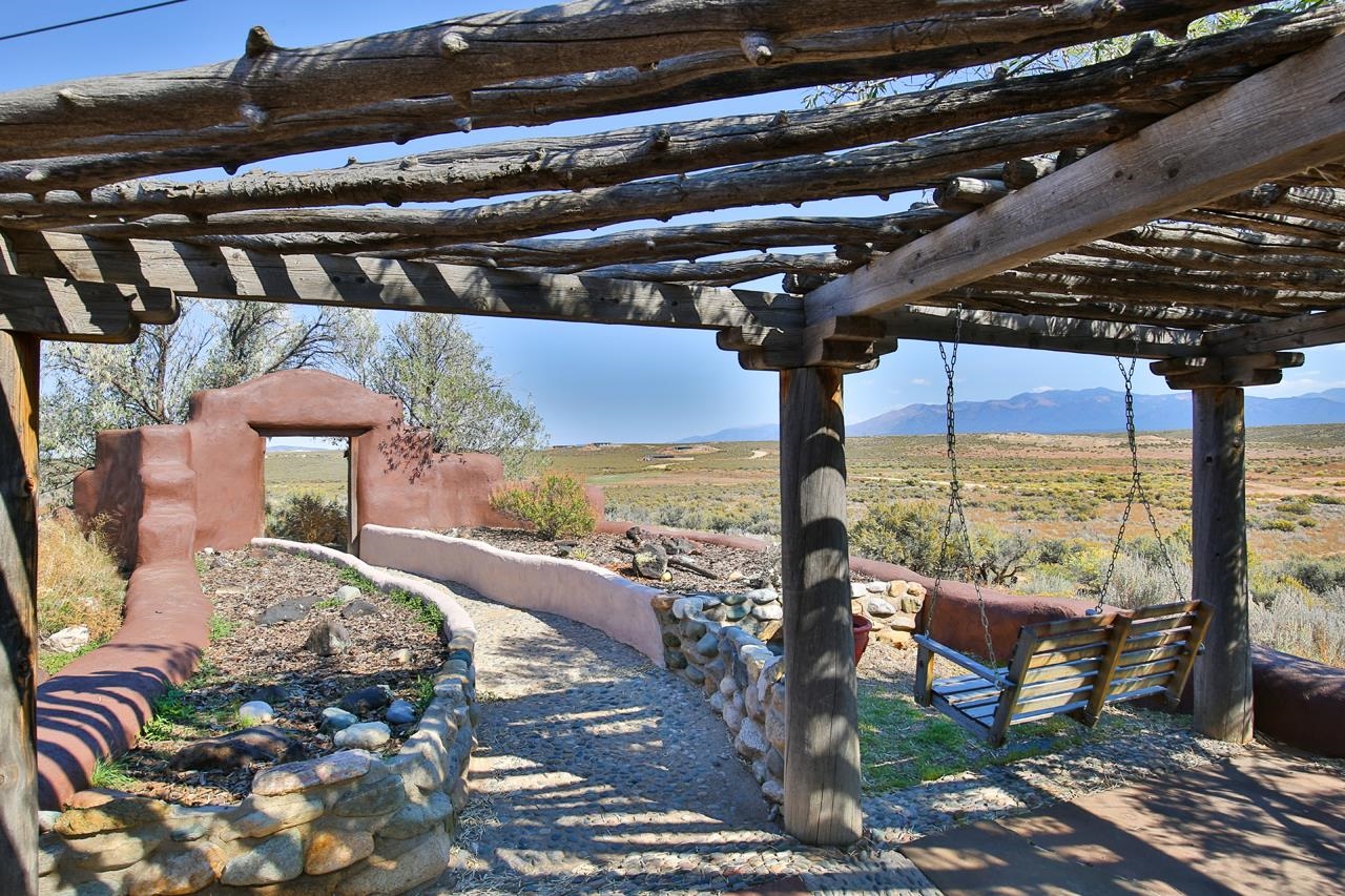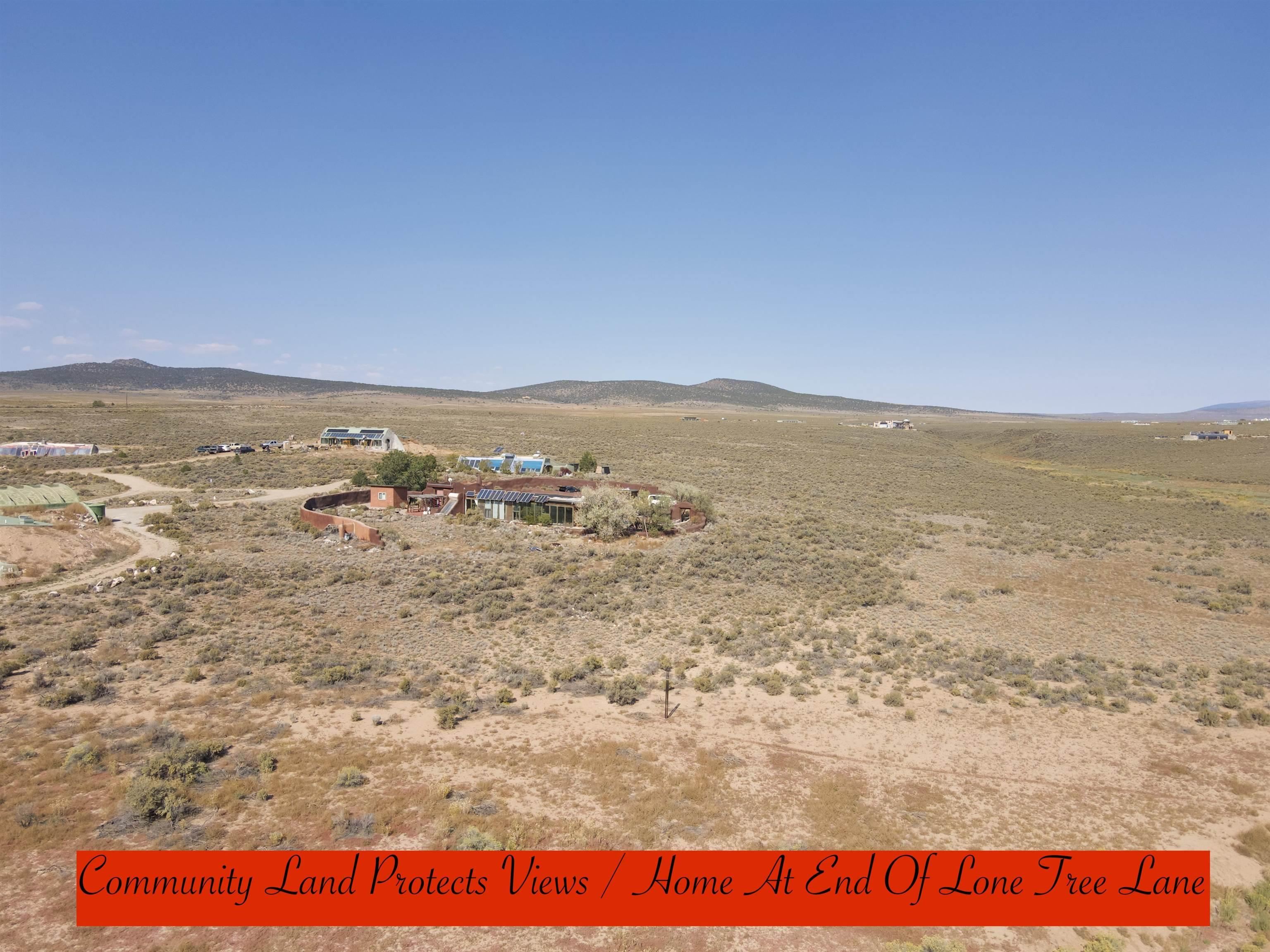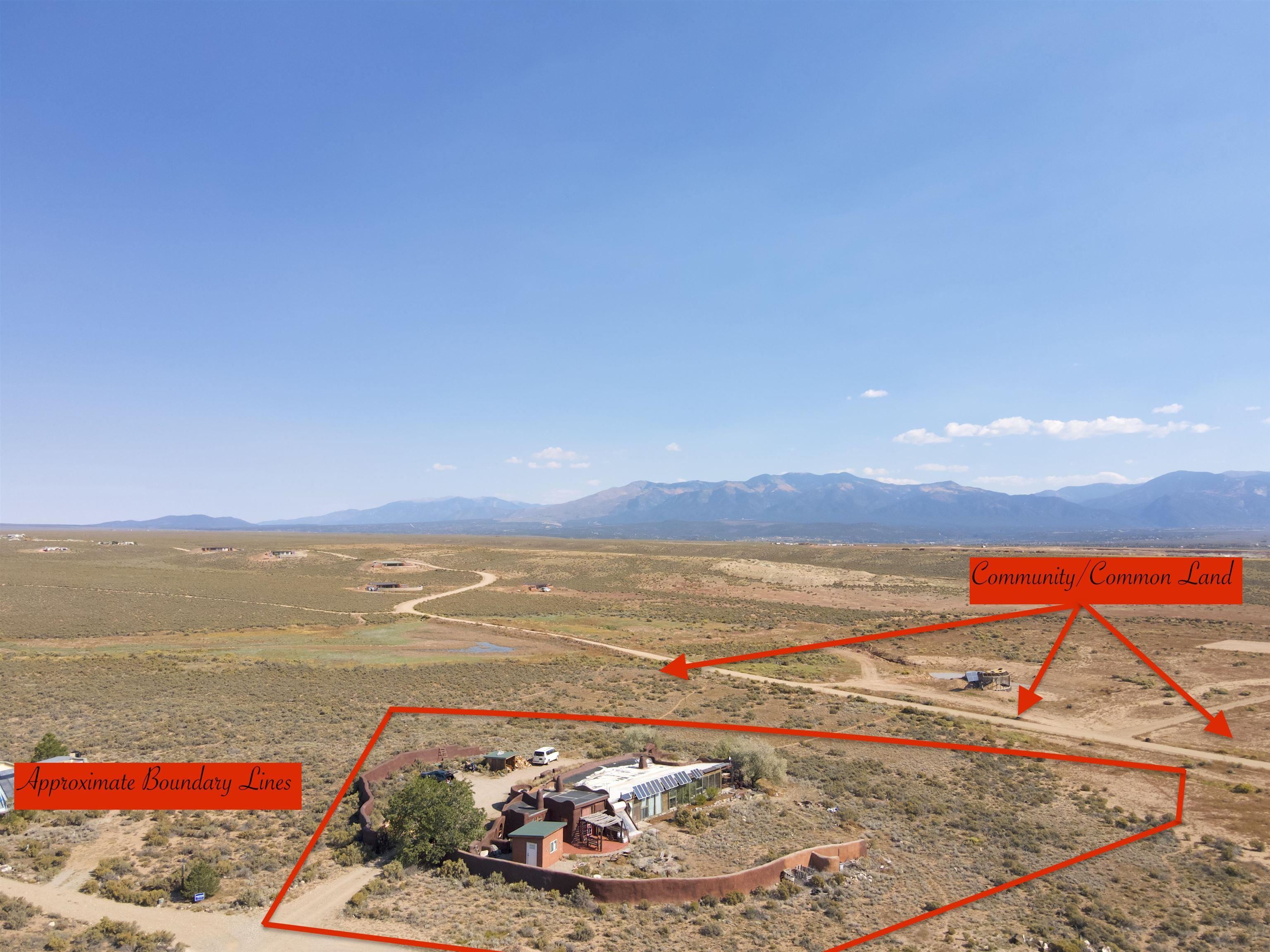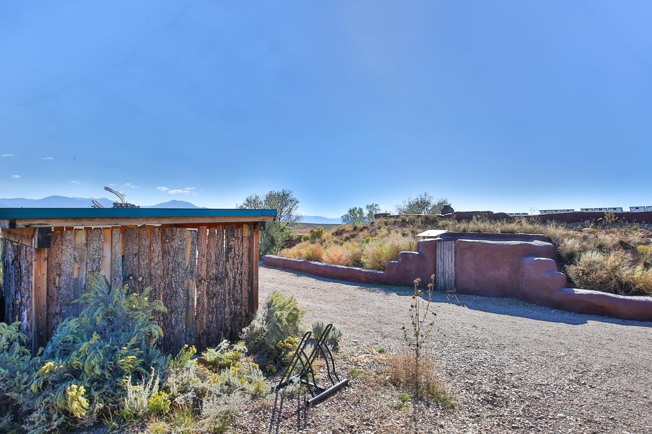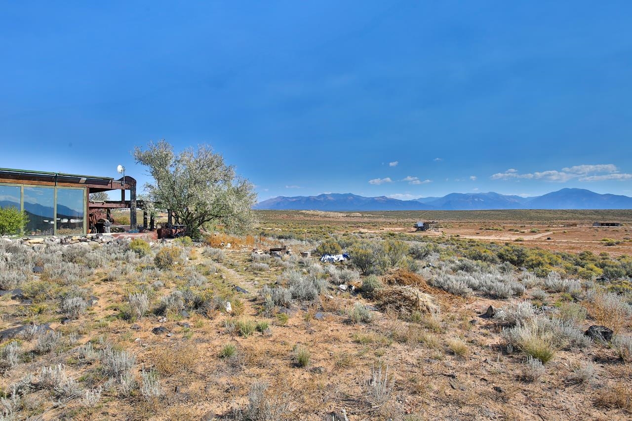 Welcome to what is arguably the best property in the Greater World Community! Set at the end of Lone Tree Lane, a peaceful dead-end road winding through the high mesa, the home sits on a natural rise, offering wide, unobstructed views of Taos Mountain. The main house features two bedrooms and a light-filled bathroom with floor-to-ceiling windows, beautiful wood finishes, and a chandelier for a touch of elegance. The living room is anchored by a grand Rumford fireplace with a smooth mica plaster, complemented by Saltillo tile floors, rough-sawn wood ceilings with beams, real adobe-plastered walls, and a built-in planter perfect for vegetables, flowers, or even tropical plants. The open kitchen includes resin-poured butcher block countertops, custom locally built cabinets with glass inlay, a high-efficiency fridge, and cast iron hardware. With floor-to-ceiling windows lining the south side, the home is passively heated and completely off-grid. A stained concrete patio welcomes you to the home, offering an ideal space for outdoor dining or relaxing while taking in the views. Mature and established Russian Olive trees are placed around the patio and entrance for shade and green screens. The attached guest house includes a full kitchen, bathroom, living room, and one bedroom, along with its own wraparound patio. Pine wood floors complement the kitchen and bedroom, while the living space features Saltillo tile and a wood stove. The flexible layout lets you keep the guest house separate, rent it out, or open it up to create a three-bedroom, two-bathroom home. This home was built to endure the harshest outdoor conditions, surpassing the building codes in place at the time of construction. Its strength comes from concrete bond beams, thousands of dirt compacted tires, lath, concrete plaster, adobe plaster, adobe bricks, oversized timbers, and extra roof insulation. The rear dirt berm adds significant thermal mass, harnessing the earth's natural efficiency to create exceptional insulation. Unlike traditional frame-built homes, the labor and craftsmanship invested in this property are extraordinary—a true labor of love designed to stand the test of time and provide comfort for generations to come. A stucco privacy wall defines the property, creating windbreaks and seclusion. There’s also a standalone 10x12 studio, perfect for an office, art space, or extra storage. The home is entirely off-grid, powered by solar, with rainwater catchment systems feeding buried cisterns, passive solar heating, and a greywater system for irrigation. This one-of-a-kind (seriously!) home is surrounded by community land, ideal for long walks and soaking in the natural beauty. Custom-built from top to bottom, it’s not just a house—it’s a piece of art that will treat you well if you do the same. Step inside and you won’t want to leave.