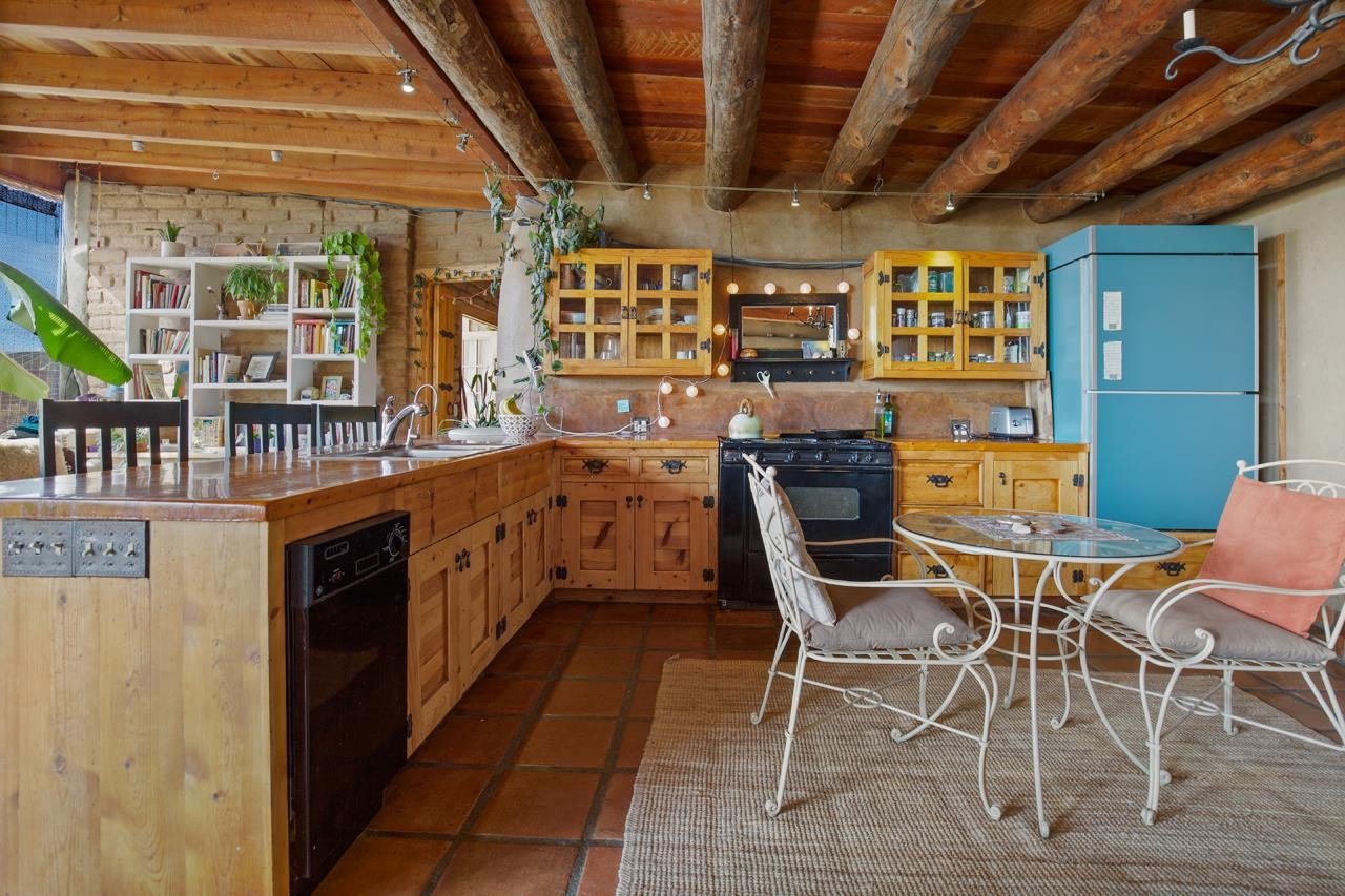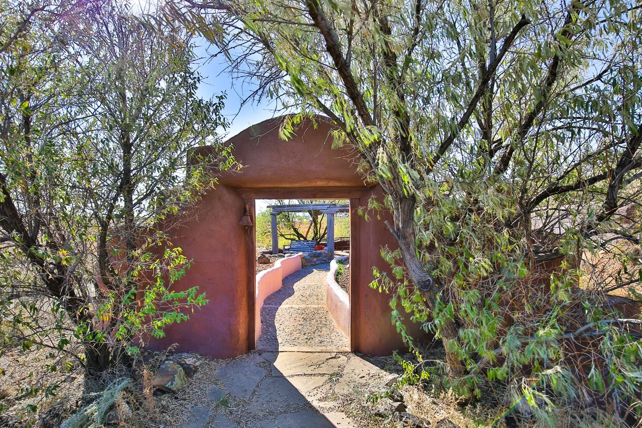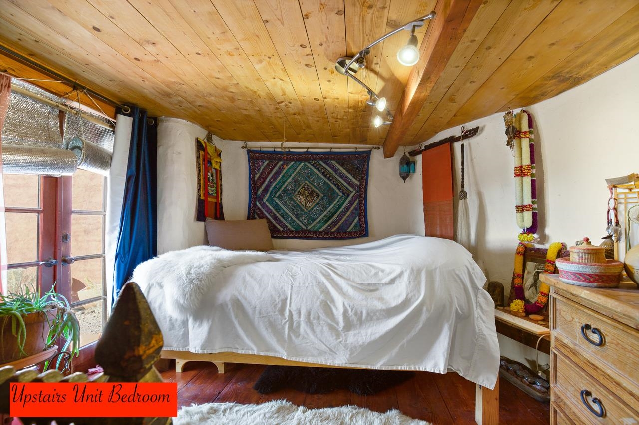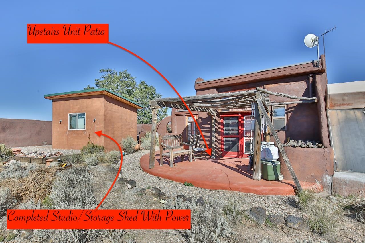 Welcome to what is arguably the best property in the Greater World Community! Set at the end of Lone Tree Lane, a peaceful dead-end road winding through the high mesa, the home sits on a natural rise, offering wide, unobstructed views of Taos Mountain. The main house features two bedrooms and a light-filled bathroom with floor-to-ceiling windows, beautiful wood finishes, and a chandelier for a touch of elegance. The living room is anchored by a grand Rumford fireplace with a smooth mica plaster, complemented by Saltillo tile floors, rough-sawn wood ceilings with beams, real adobe-plastered walls, and a built-in planter perfect for vegetables, flowers, or even tropical plants. The open kitchen includes resin-poured butcher block countertops, custom locally built cabinets with glass inlay, a high-efficiency fridge, and cast iron hardware. With floor-to-ceiling windows lining the south side, the home is passively heated and completely off-grid. A stained concrete patio welcomes you to the home, offering an ideal space for outdoor dining or relaxing while taking in the views. Mature and established Russian Olive trees are placed around the patio and entrance for shade and green screens. The attached guest house includes a full kitchen, bathroom, living room, and one bedroom, along with its own wraparound patio. Pine wood floors complement the kitchen and bedroom, while the living space features Saltillo tile and a wood stove. The flexible layout lets you keep the guest house separate, rent it out, or open it up to create a three-bedroom, two-bathroom home. This home was built to endure the harshest outdoor conditions, surpassing the building codes in place at the time of construction. Its strength comes from concrete bond beams, thousands of dirt compacted tires, lath, concrete plaster, adobe plaster, adobe bricks, oversized timbers, and extra roof insulation. The rear dirt berm adds significant thermal mass, harnessing the earth's natural efficiency to create exceptional insulation. Unlike traditional frame-built homes, the labor and craftsmanship invested in this property are extraordinary—a true labor of love designed to stand the test of time and provide comfort for generations to come. A stucco privacy wall defines the property, creating windbreaks and seclusion. There’s also a standalone 10x12 studio, perfect for an office, art space, or extra storage. The home is entirely off-grid, powered by solar, with rainwater catchment systems feeding buried cisterns, passive solar heating, and a greywater system for irrigation. This one-of-a-kind (seriously!) home is surrounded by community land, ideal for long walks and soaking in the natural beauty. Custom-built from top to bottom, it’s not just a house—it’s a piece of art that will treat you well if you do the same. Step inside and you won’t want to leave.