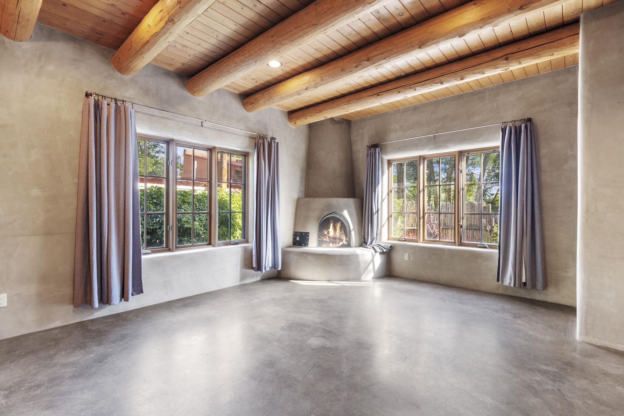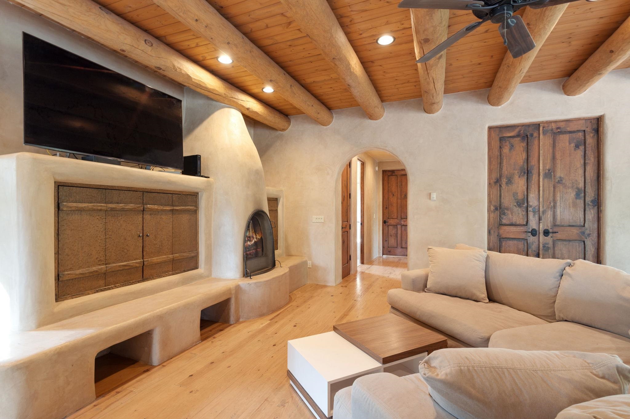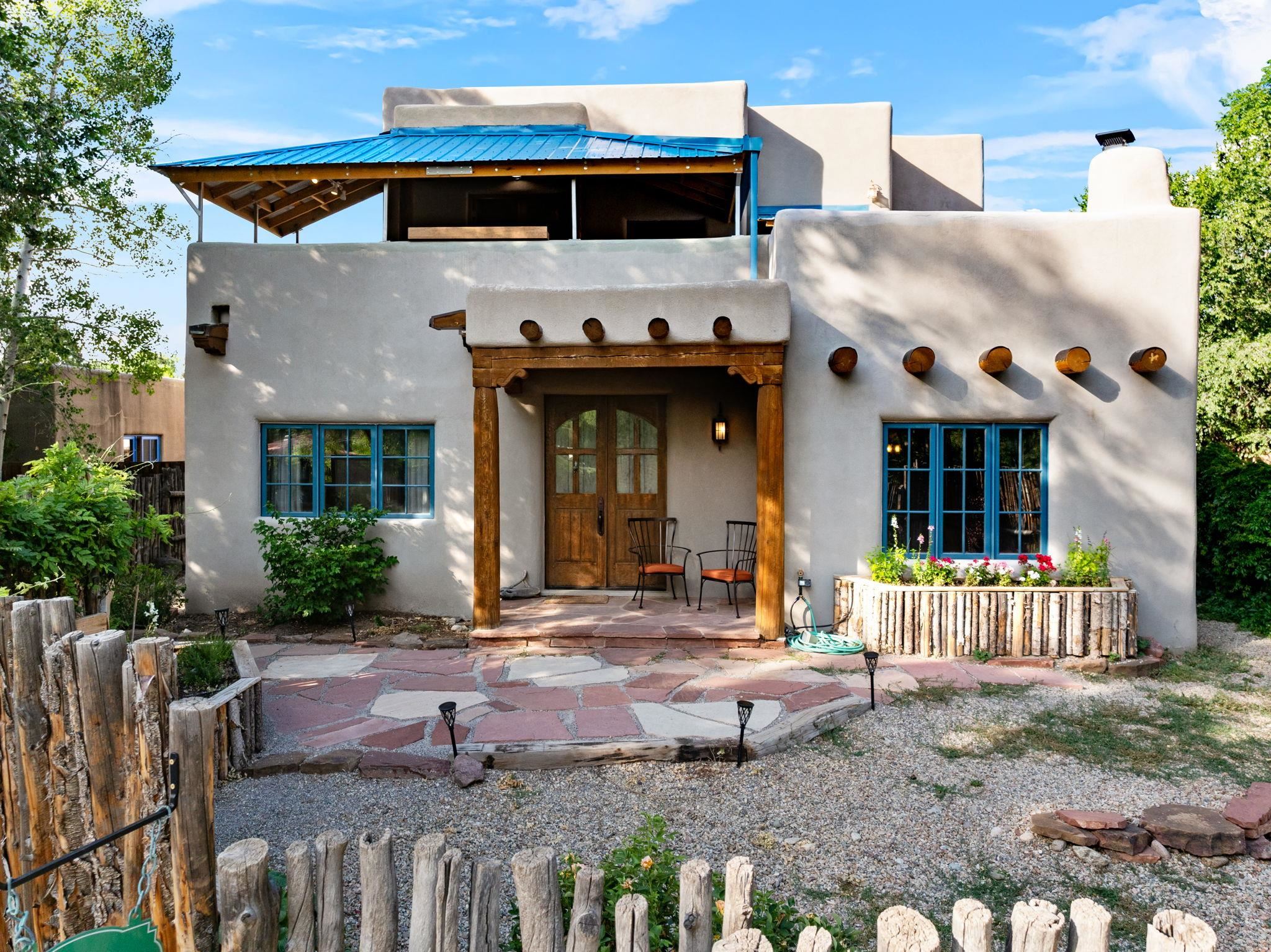 Pure Magnificence on Lund Street Near the Plaza ~ Tucked away on one of the most adorable streets in town, you will find this absolutely brilliant 4 bed 4 bath 3,200 square foot modern classic Southwestern residence with a two-car garage. From the moment you step foot in the fully fenced yard with rose bushes, perennials and subtle landscaping, you feel at HOME. Upon entering the residence you're greeted by some of the finest Southwestern finish work and wood accents the region has to offer, including diamond finished walls with art nichos, vigas on the ceilings, multiple kiva fireplaces, hand carved doors with special shutters, and floors made of wood, tile, and stained concrete heated by in-floor radiant and baseboards. Up the iron and wood spiral staircase, you will find another spacious living area with a newly installed second kitchen, kiva fireplace, along with two bedrooms; one which could serve as a second primary bedroom with its own private balcony. The newly installed outdoor covered BBQ space and lounge area built of durable Trex decking is perfect for year-round use with a large natural gas fire-pit where you will likely spend most of your time breathing in the fresh high-desert air and entertaining your guests. This property is one-of-a-kind. Take a walk or drive-by and be sure to schedule your showing today!
