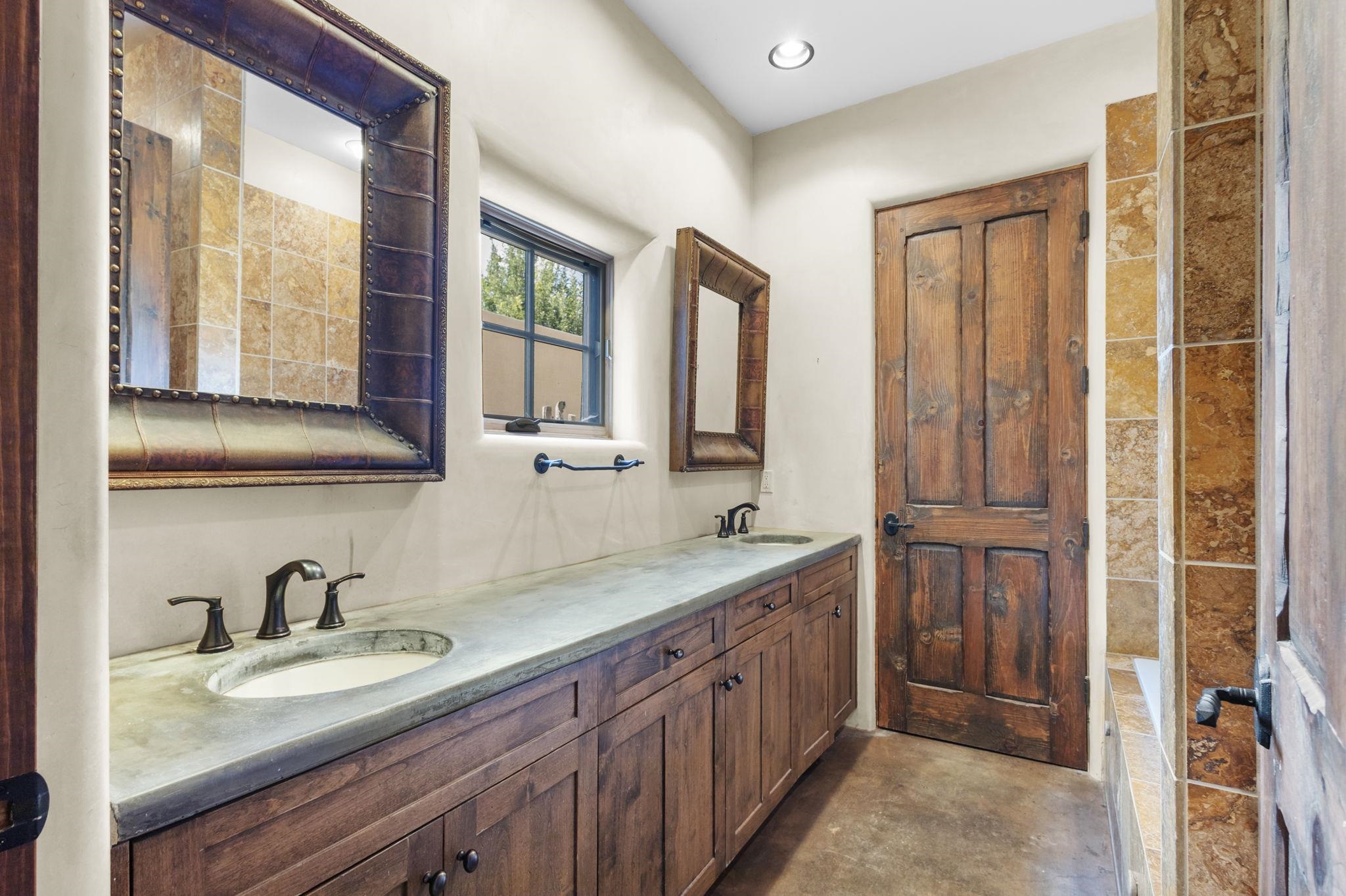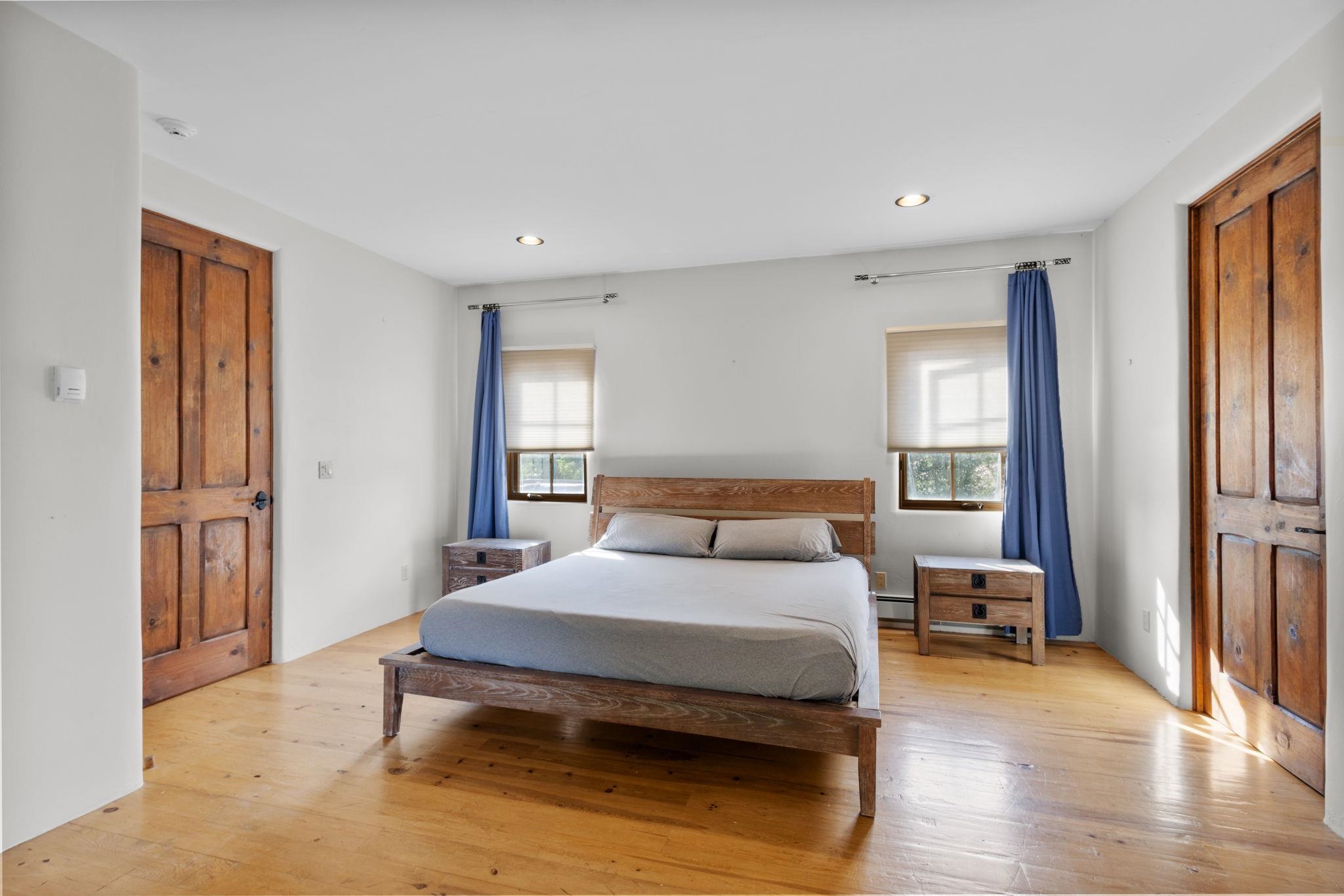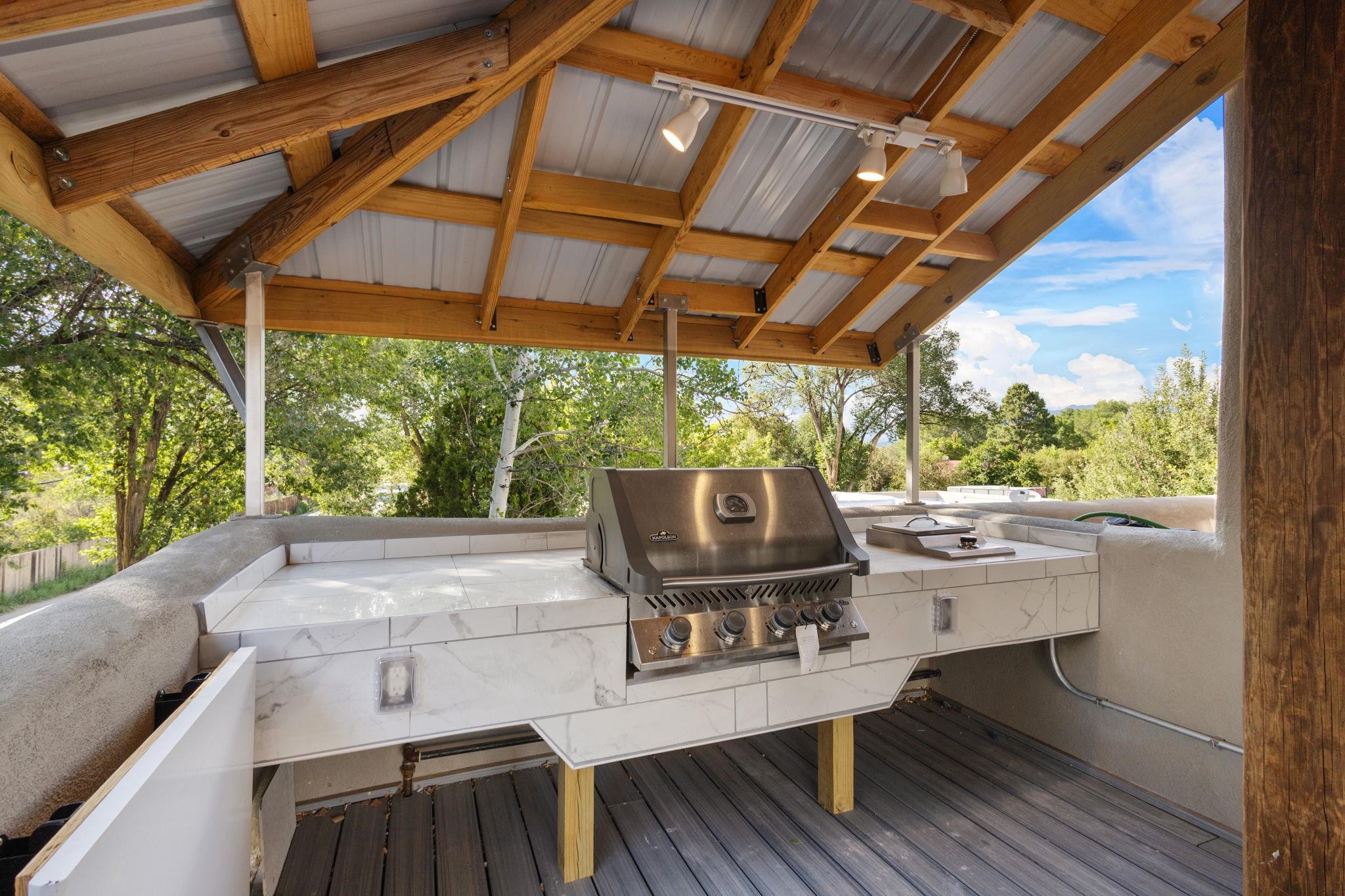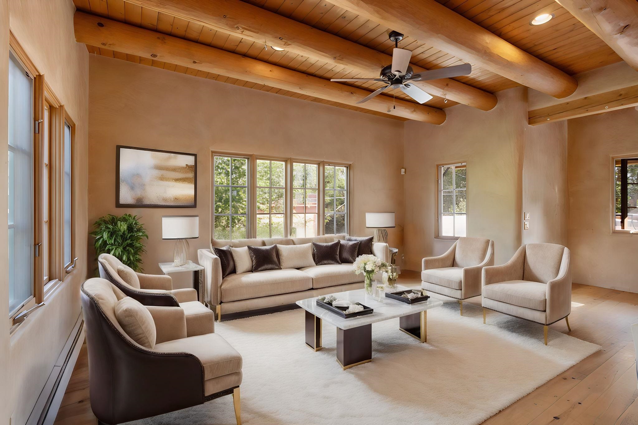 Pure Magnificence on Lund Street Near the Plaza ~ Tucked away on one of the most adorable streets in town, you will find this absolutely brilliant 4 bed 4 bath 3,200 square foot modern classic Southwestern residence with a two-car garage. From the moment you step foot in the fully fenced yard with rose bushes, perennials and subtle landscaping, you feel at HOME. Upon entering the residence you're greeted by some of the finest Southwestern finish work and wood accents the region has to offer, including diamond finished walls with art nichos, vigas on the ceilings, multiple kiva fireplaces, hand carved doors with special shutters, and floors made of wood, tile, and stained concrete heated by in-floor radiant and baseboards. Up the iron and wood spiral staircase, you will find another spacious living area with a newly installed second kitchen, kiva fireplace, along with two bedrooms; one which could serve as a second primary bedroom with its own private balcony. The newly installed outdoor covered BBQ space and lounge area built of durable Trex decking is perfect for year-round use with a large natural gas fire-pit where you will likely spend most of your time breathing in the fresh high-desert air and entertaining your guests. This property is one-of-a-kind. Take a walk or drive-by and be sure to schedule your showing today!
