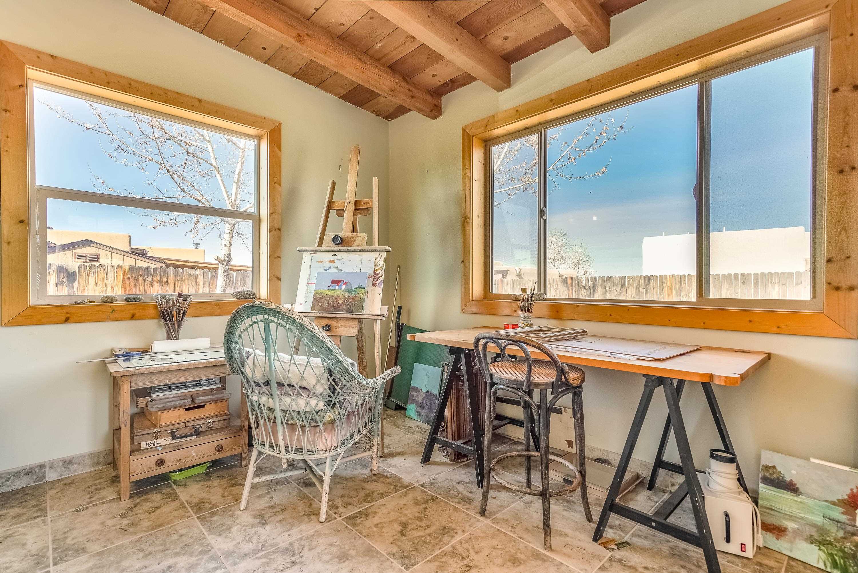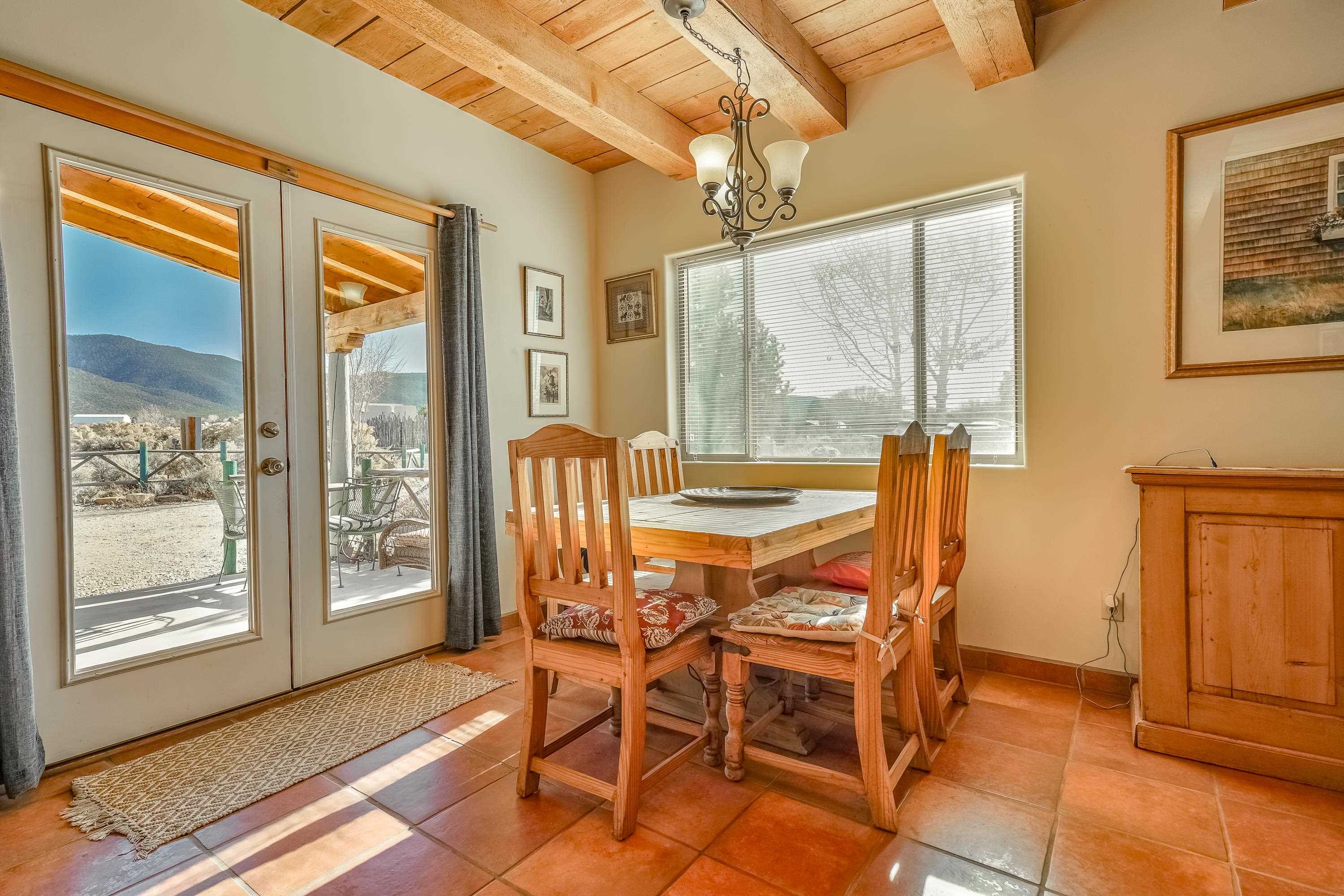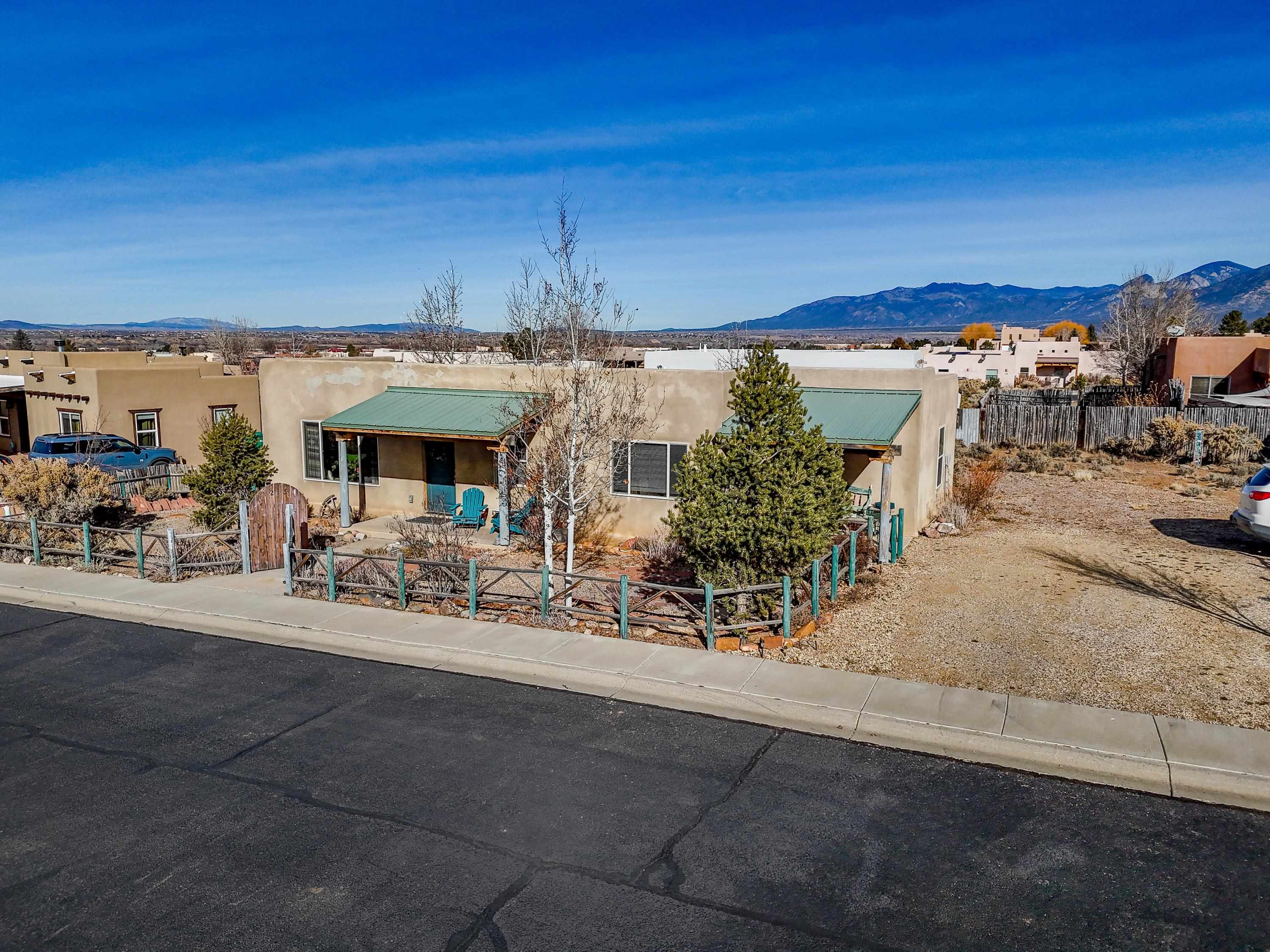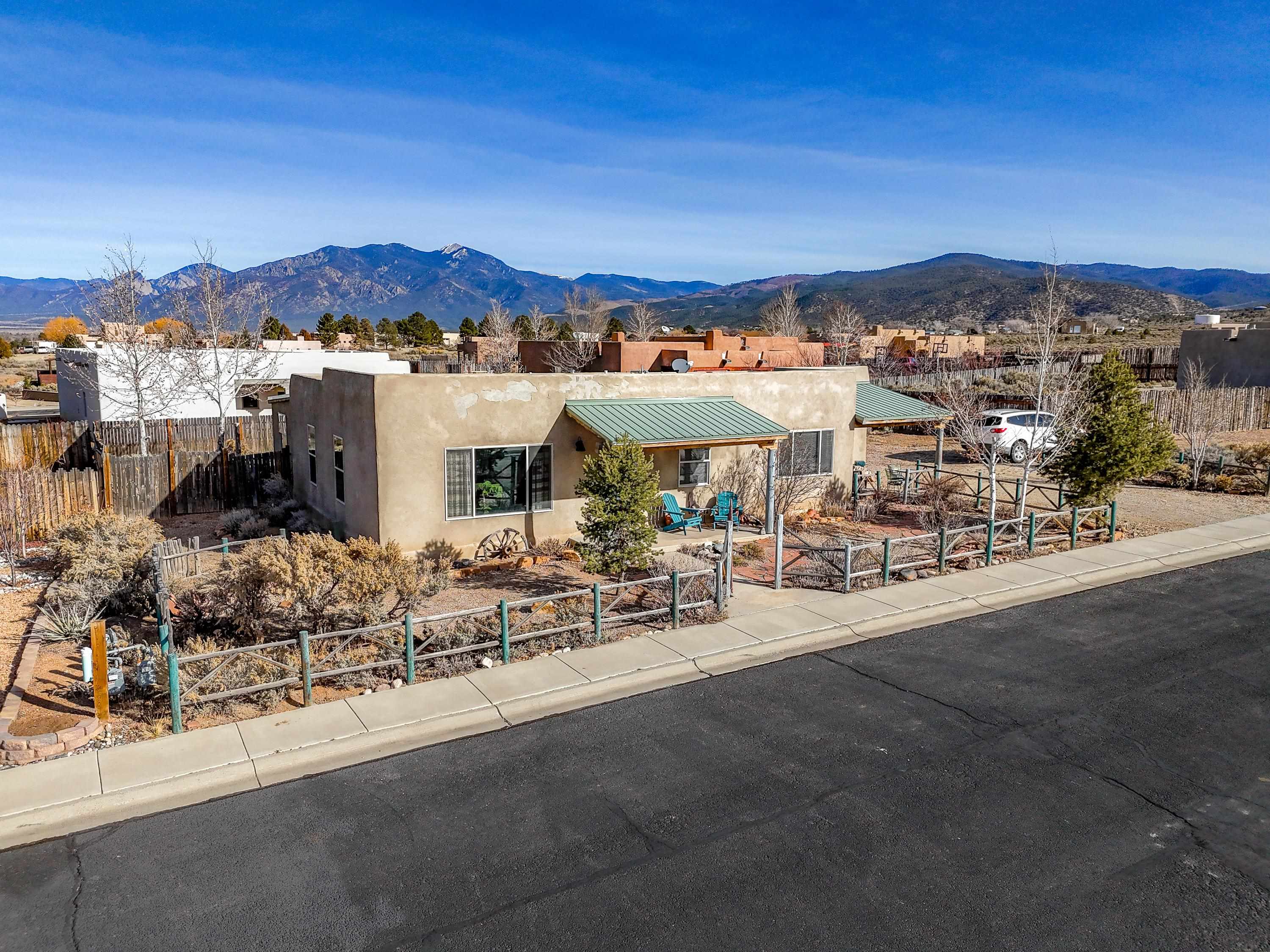 This beautiful 2 bed 2 bath plus studio home is sure to delight. Enjoy an open and spacious living area filled with natural light from abundant windows offering lovely views. The upscale kitchen is thoughtfully designed and features granite countertops plus stainless-steel appliances. Relax on the covered porch taking in great mountain views and unforgettable sunsets. The thoughtfully designed split-bedroom layout offers privacy and the primary suite and has a large walk-in closet. There is a charming artist’s studio or office attached which has its own entrance ideal for a quiet workspace. A truly special home combining comfort, creativity, and convenience. Work from home worry free with High-Speed WiFi available. Conveniently located near the hospital in the Las Olas Subdivision, offering established covenants and close access to walking trail. Just minutes to Taos Plaza with shopping and dining. Take advantage of Taos Air’s direct flights to Dallas and Austin, enhancing effortless travel.