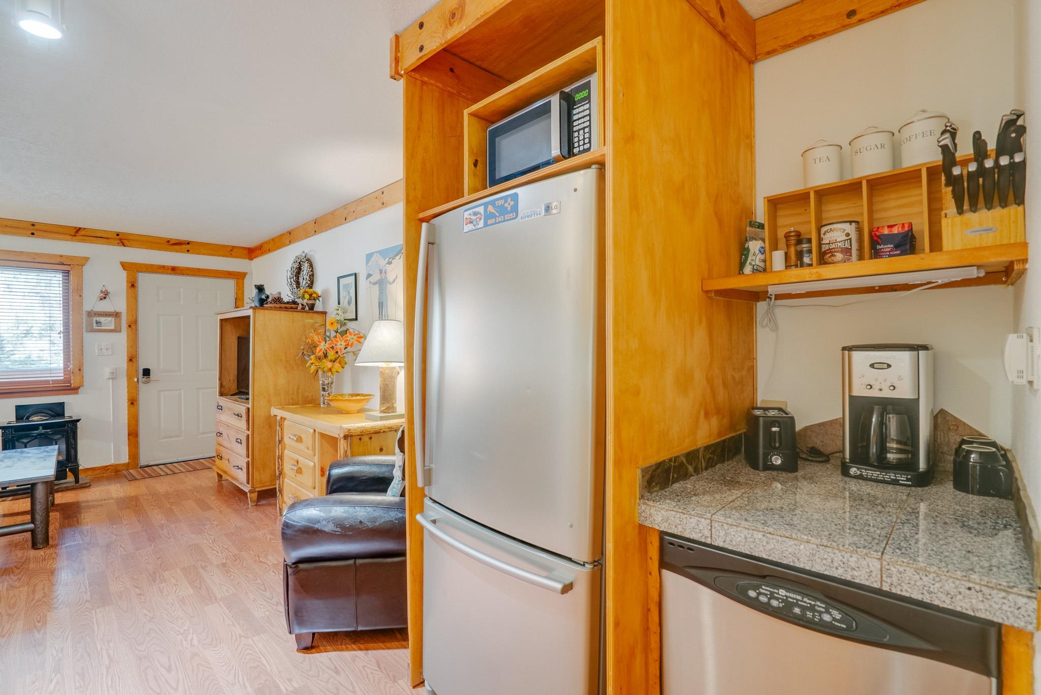 Chamonix 4 has so much charm and practicality with its convertible Murhpy bed/dining table and quaint, yet well-appointed kitchen. Enjoy cozy afternoons by the gas stove, after a day of skiing or hiking, shopping and dining in the Ski Valley. This unit is on the first floor, right off the porch that leads directly to the parking lot, so no need to carry anything up stairs after a long day of travel or adventure on the mountain! Just up the road from the Rio Hondo Learning Center, tucked into the woods- accessible from the slopes via Raspberry Hill and walkable to everything, the Snow Bear is a Ski Valley gem. Currently available for short-term rental through Abode Vacations and is a fantastic investment opportunity! Please inquire about this opportunity should you wish to continue to rent it out!