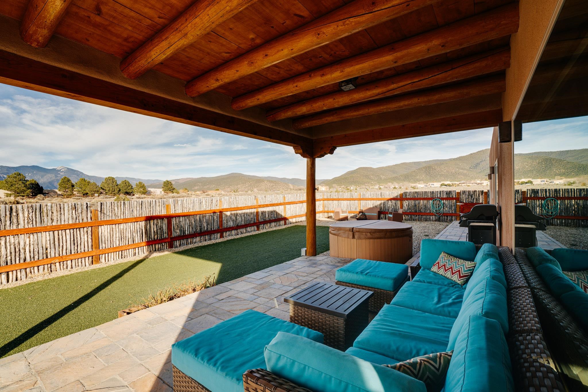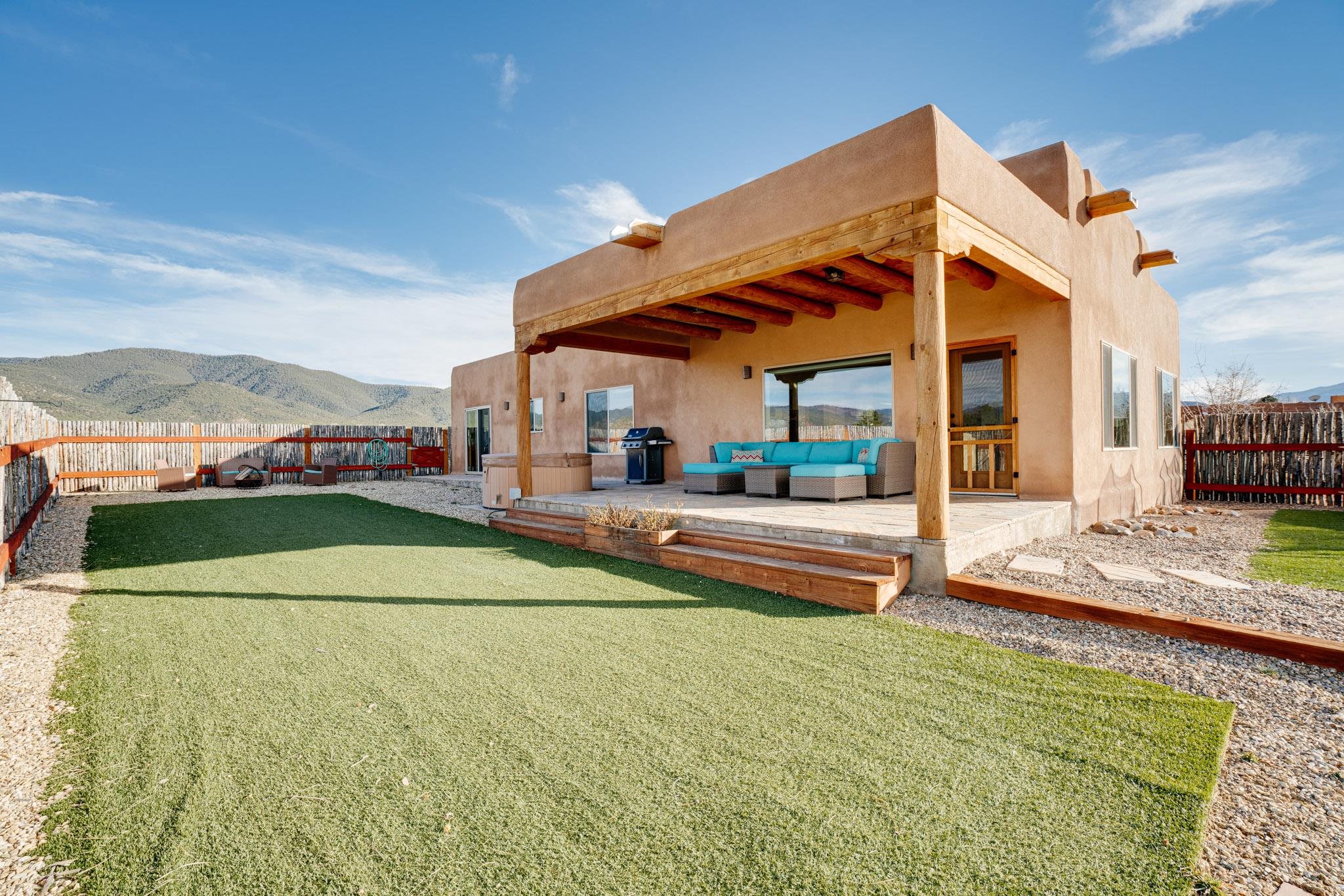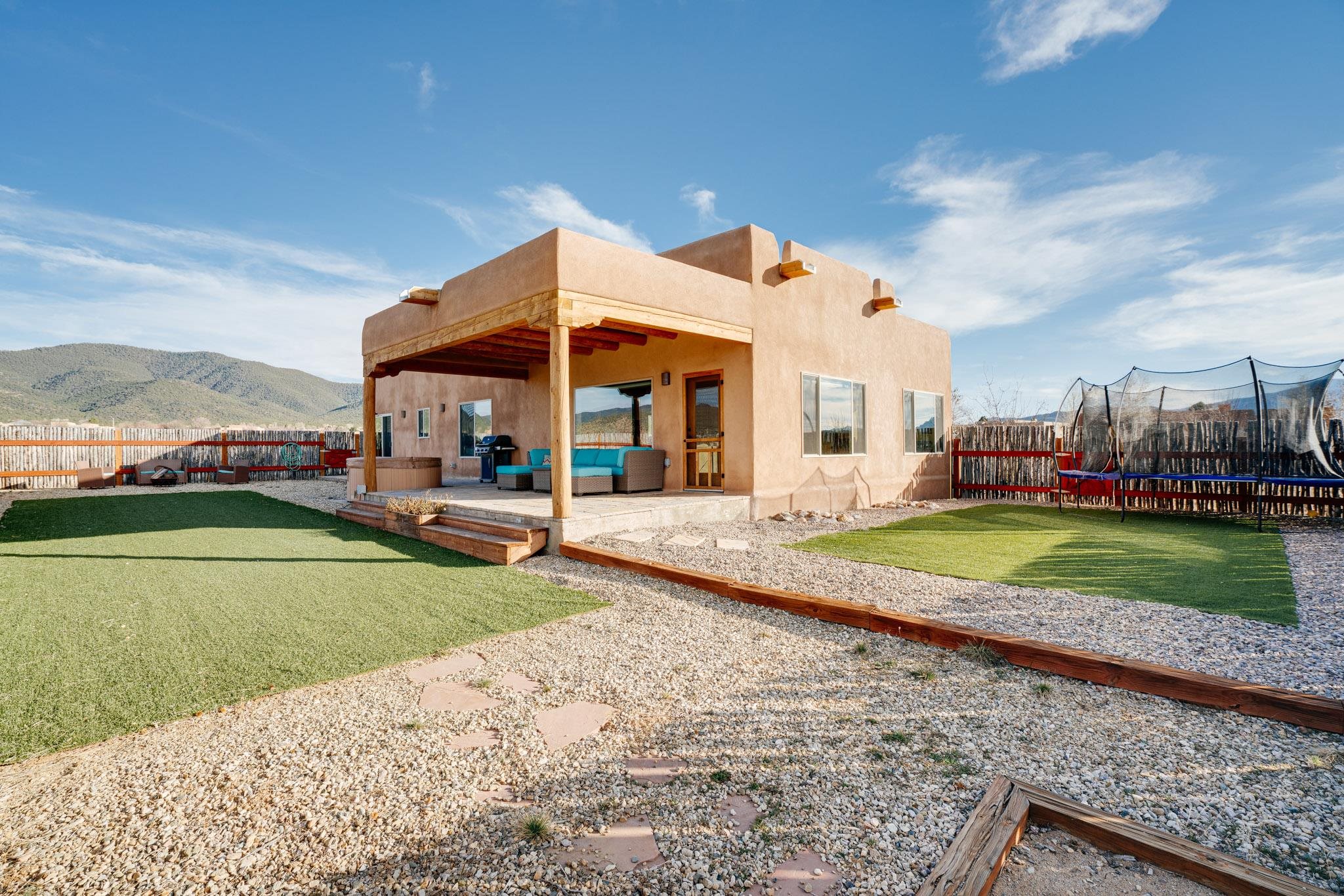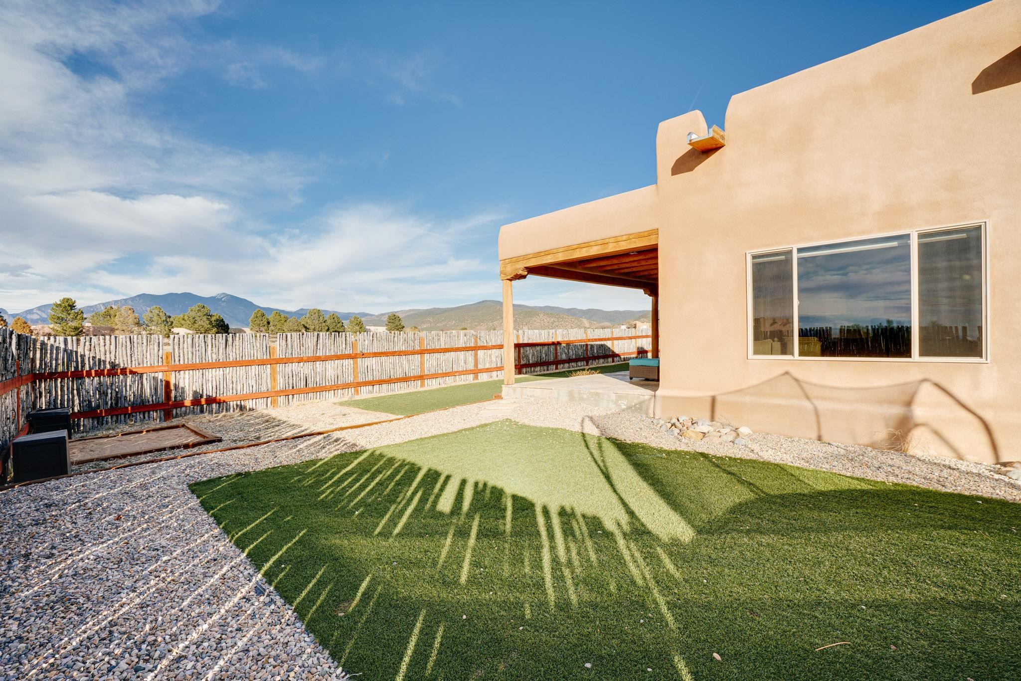 This beautifully designed 1,516 sq ft home offers 3 bedrooms and two bathrooms with a bright, open-concept layout ideal for both comfortable living and effortless entertaining. The living space is centered around a striking picture window that perfectly frames sweeping views of the Sangre de Christo Mountains, flooding the home with natural light and a constant connection to the outdoors. A seamless flow between the kitchen, dining, and living area creates a warm and comfortable atmosphere. Step outside for an outdoor retreat crafted for relaxation and unforgettable views. An expansive covered patio showcases panoramic mountain views - perfect for morning coffee or sunset gatherings. Enjoy year round soaking in the hot tub beneath clear New Mexico skies, while low-maintenance turf keeps the yard prestine. A classic latilla fence adds privacy and timeless New Mexico charm. Set within the private, desirable and well-maintained Las Olas Subdivision, this home offers peace, community, and exceptional access - just five minutes from downtown Taos and 35 minutes from Taos Ski Valley.