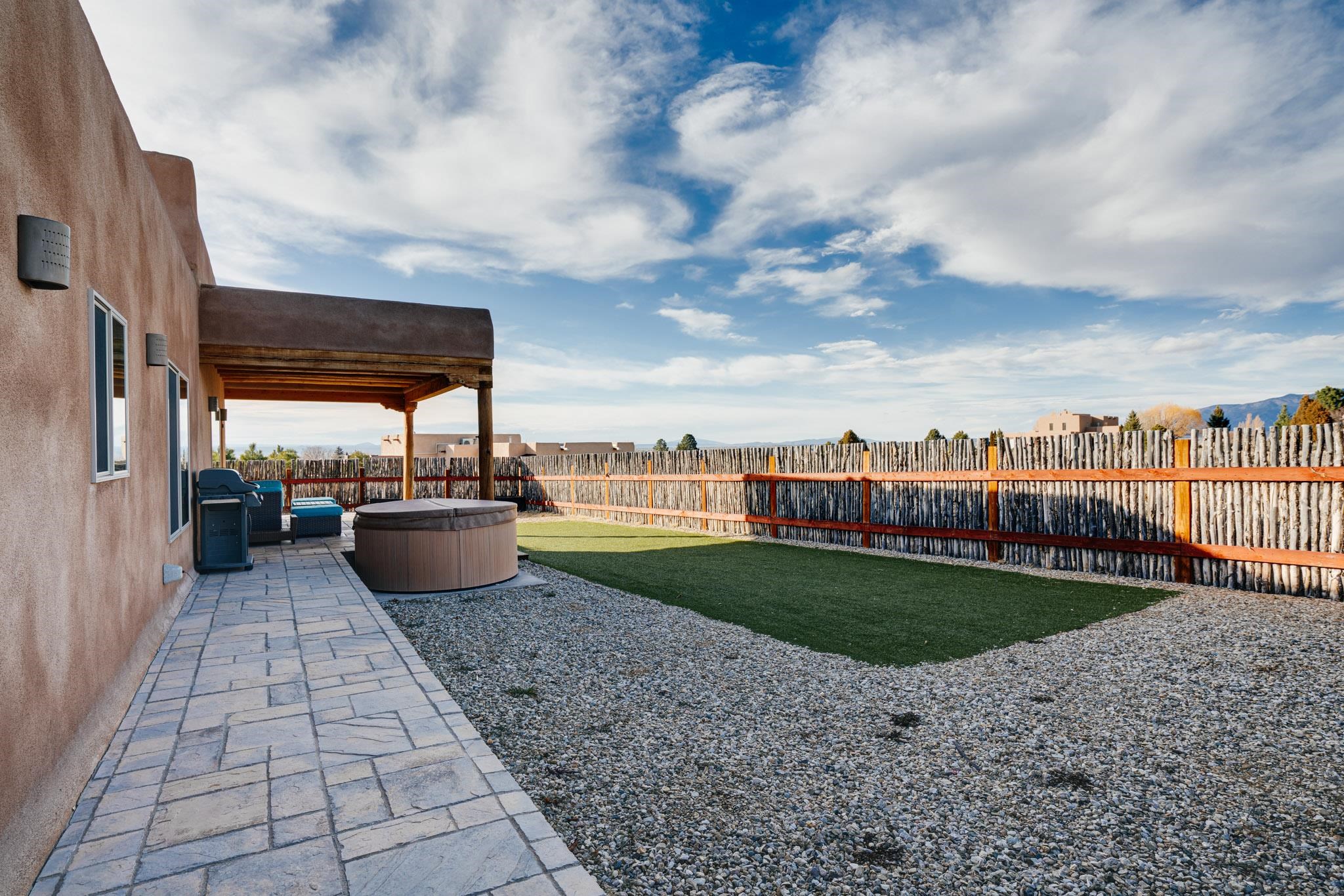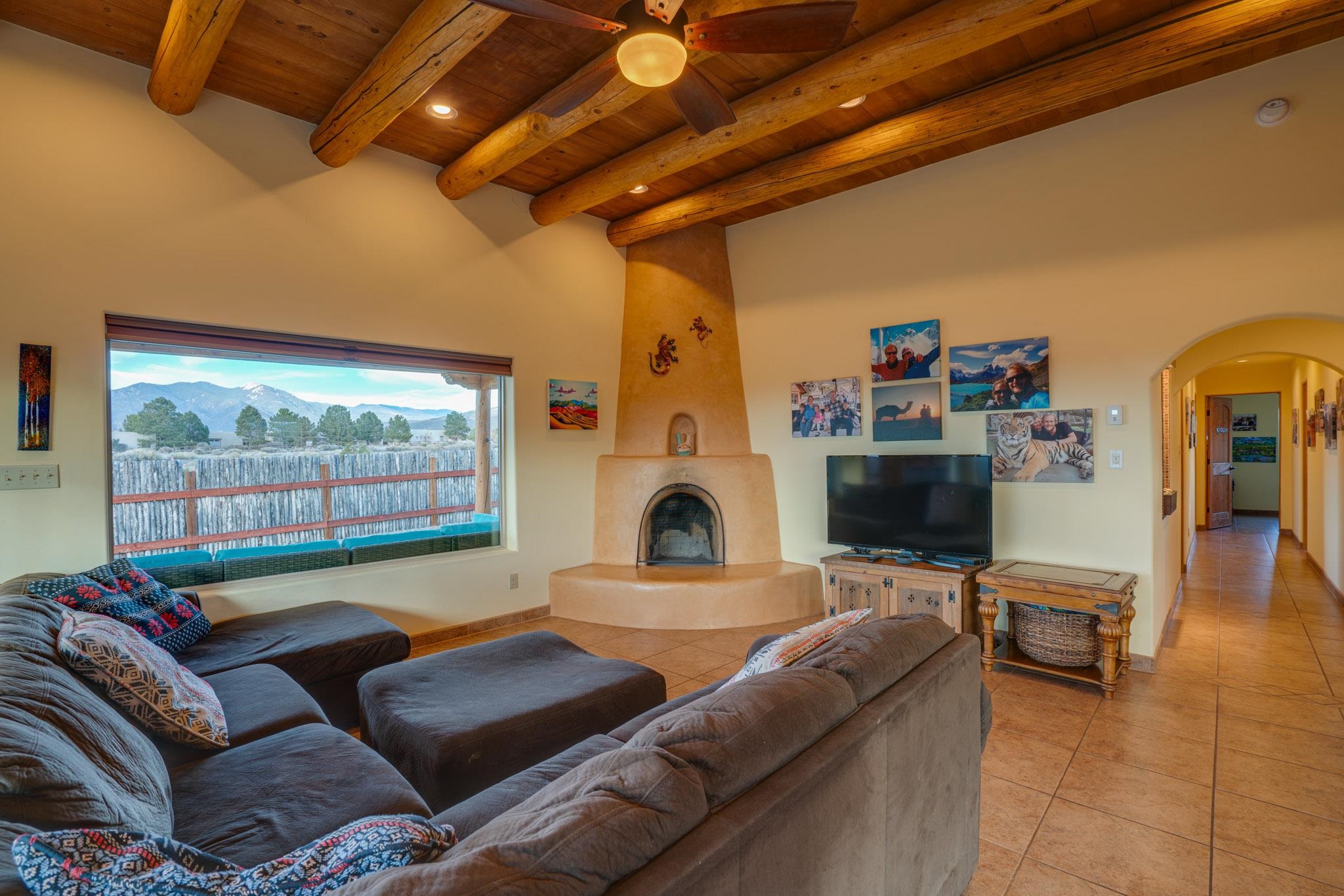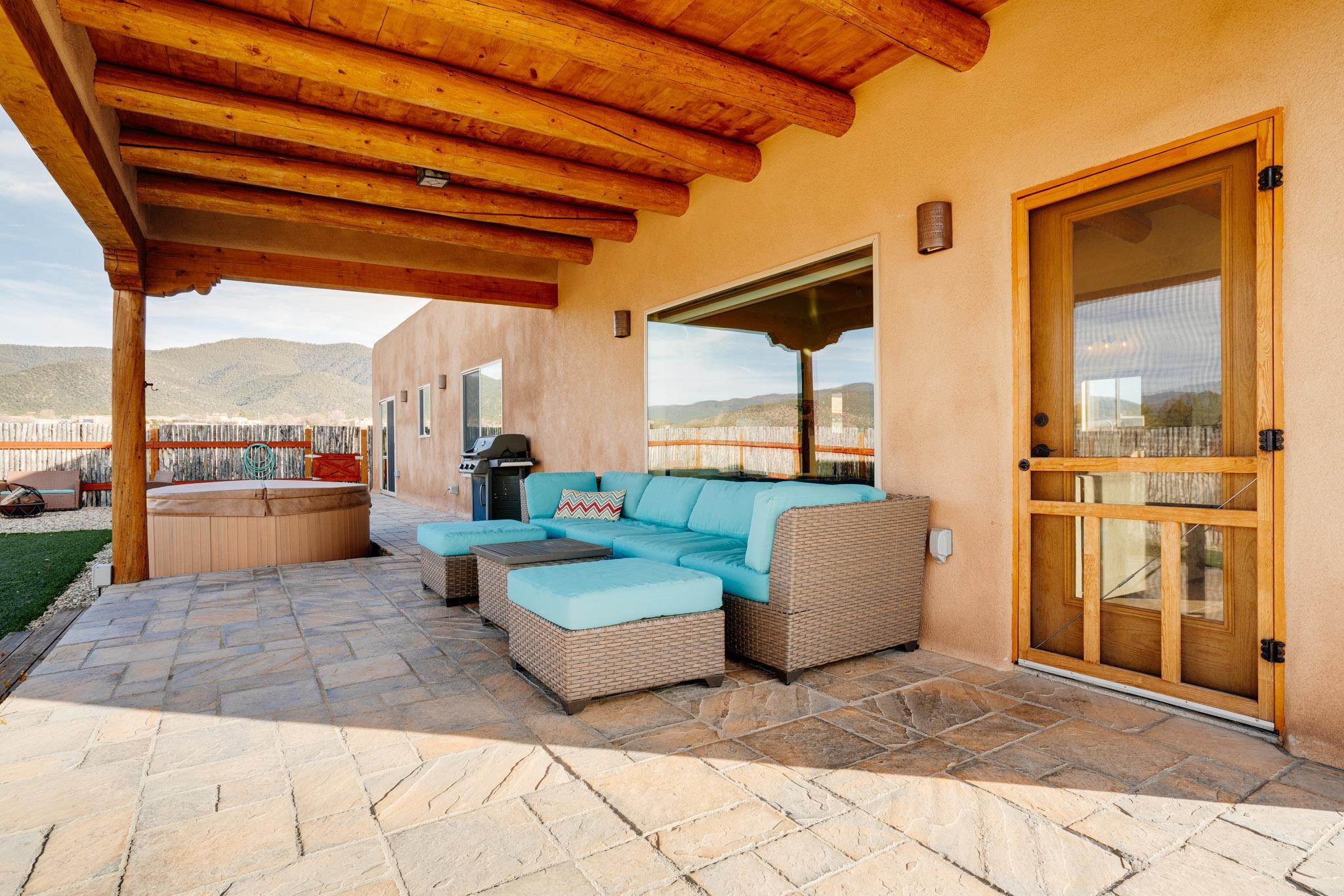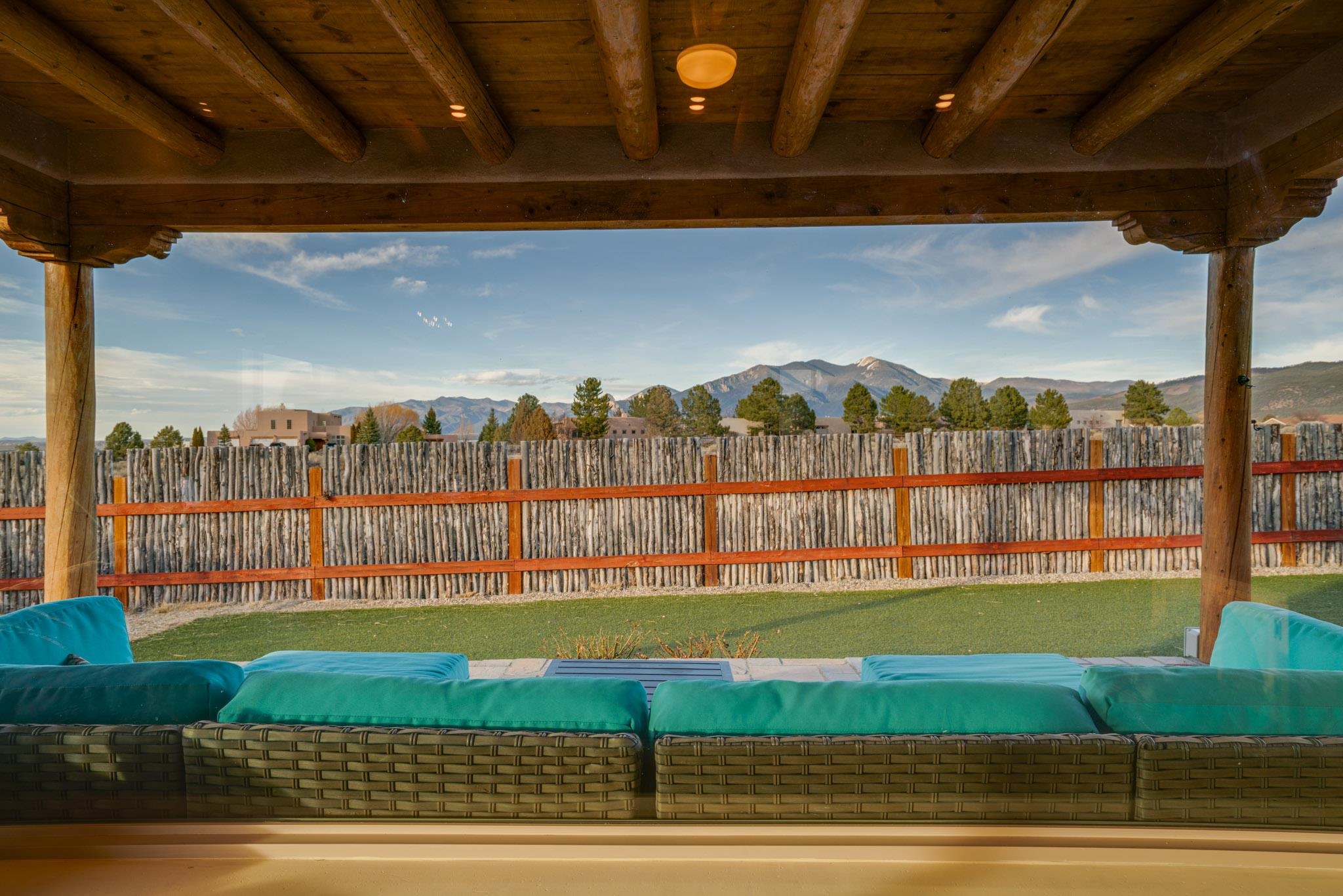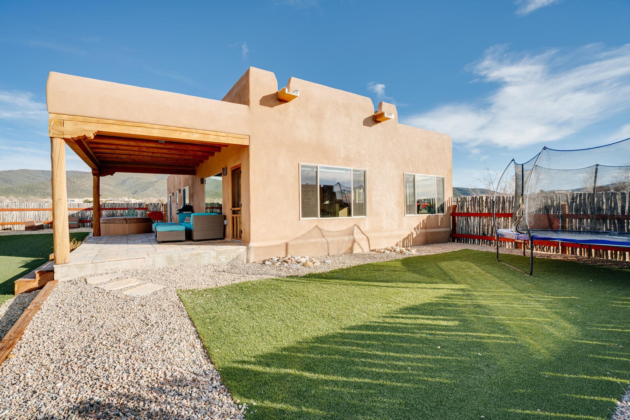 This beautifully designed 1,516 sq ft home offers 3 bedrooms and two bathrooms with a bright, open-concept layout ideal for both comfortable living and effortless entertaining. The living space is centered around a striking picture window that perfectly frames sweeping views of the Sangre de Christo Mountains, flooding the home with natural light and a constant connection to the outdoors. A seamless flow between the kitchen, dining, and living area creates a warm and comfortable atmosphere. Step outside for an outdoor retreat crafted for relaxation and unforgettable views. An expansive covered patio showcases panoramic mountain views - perfect for morning coffee or sunset gatherings. Enjoy year round soaking in the hot tub beneath clear New Mexico skies, while low-maintenance turf keeps the yard prestine. A classic latilla fence adds privacy and timeless New Mexico charm. Set within the private, desirable and well-maintained Las Olas Subdivision, this home offers peace, community, and exceptional access - just five minutes from downtown Taos and 35 minutes from Taos Ski Valley.