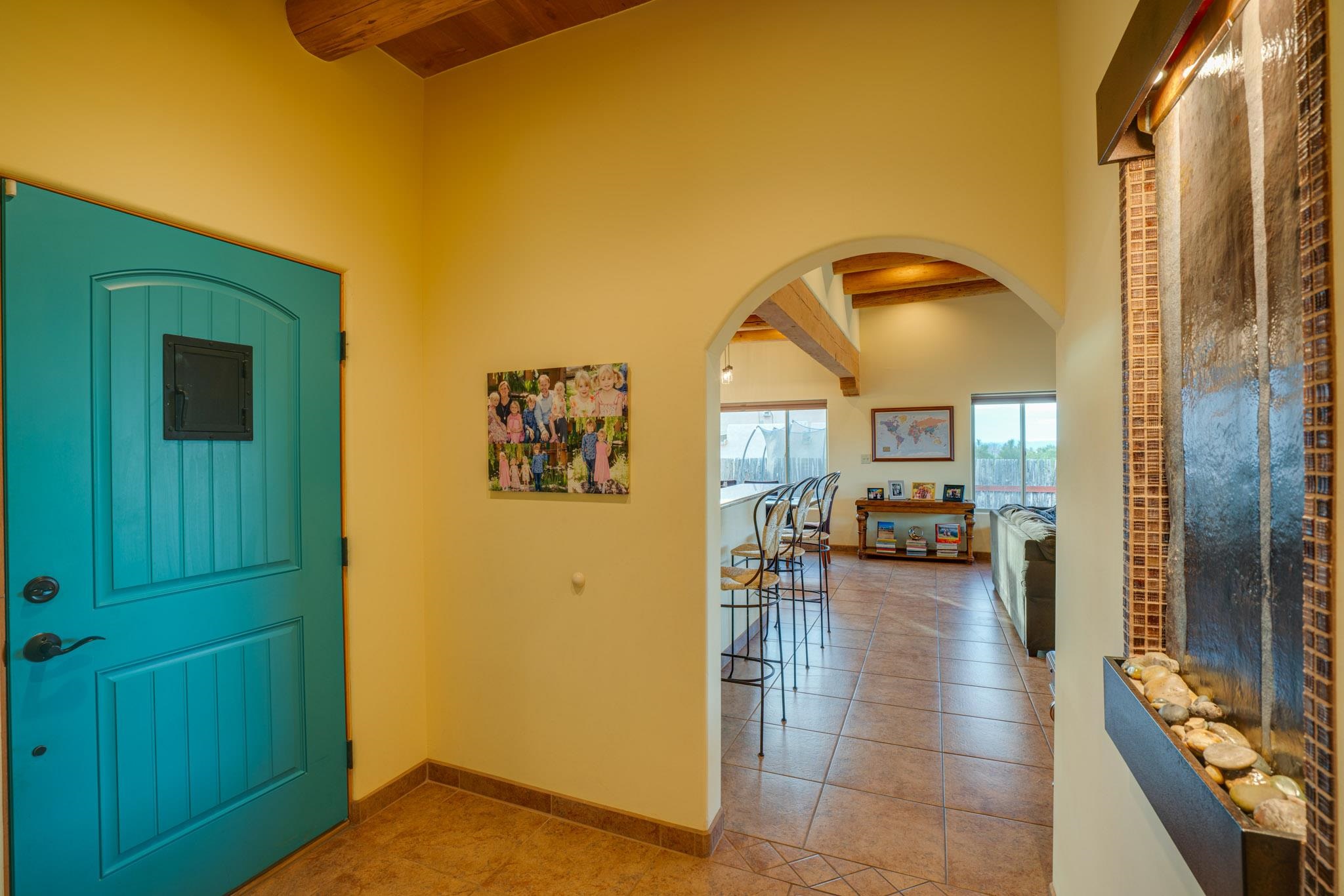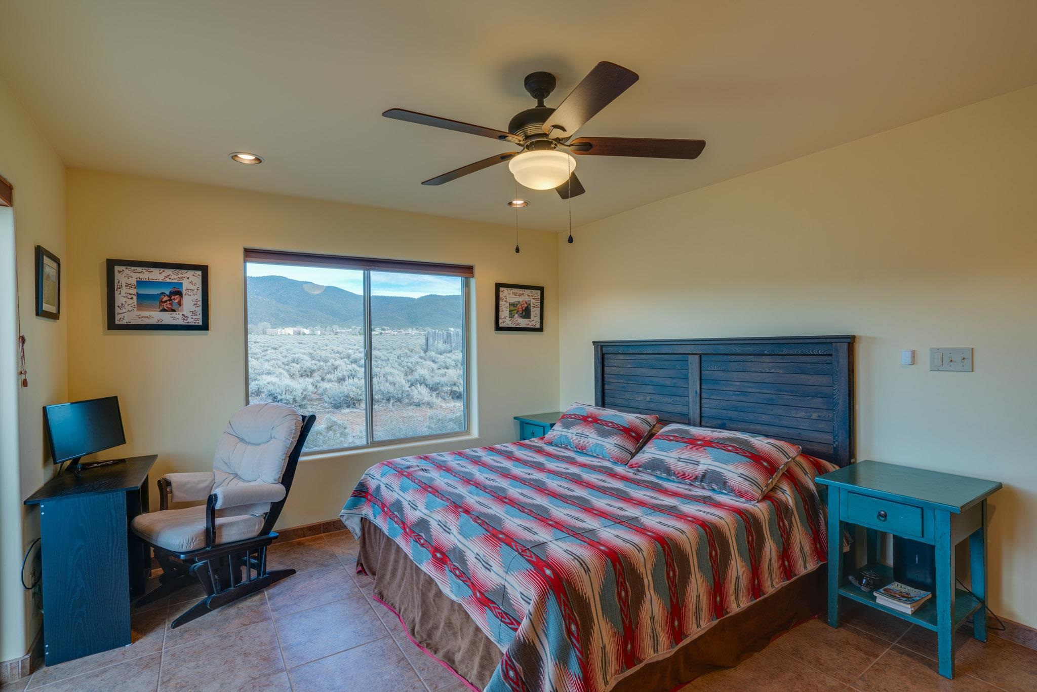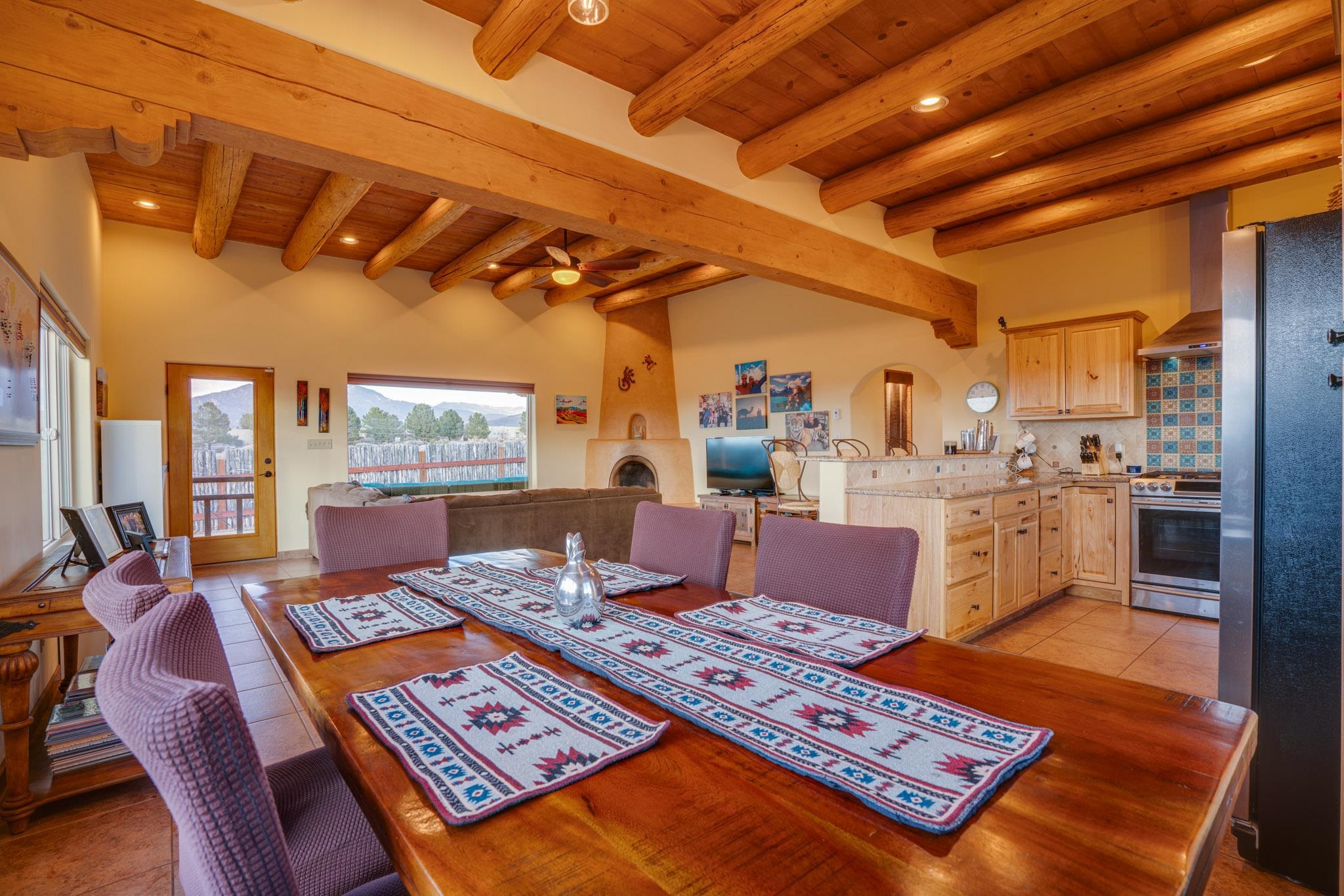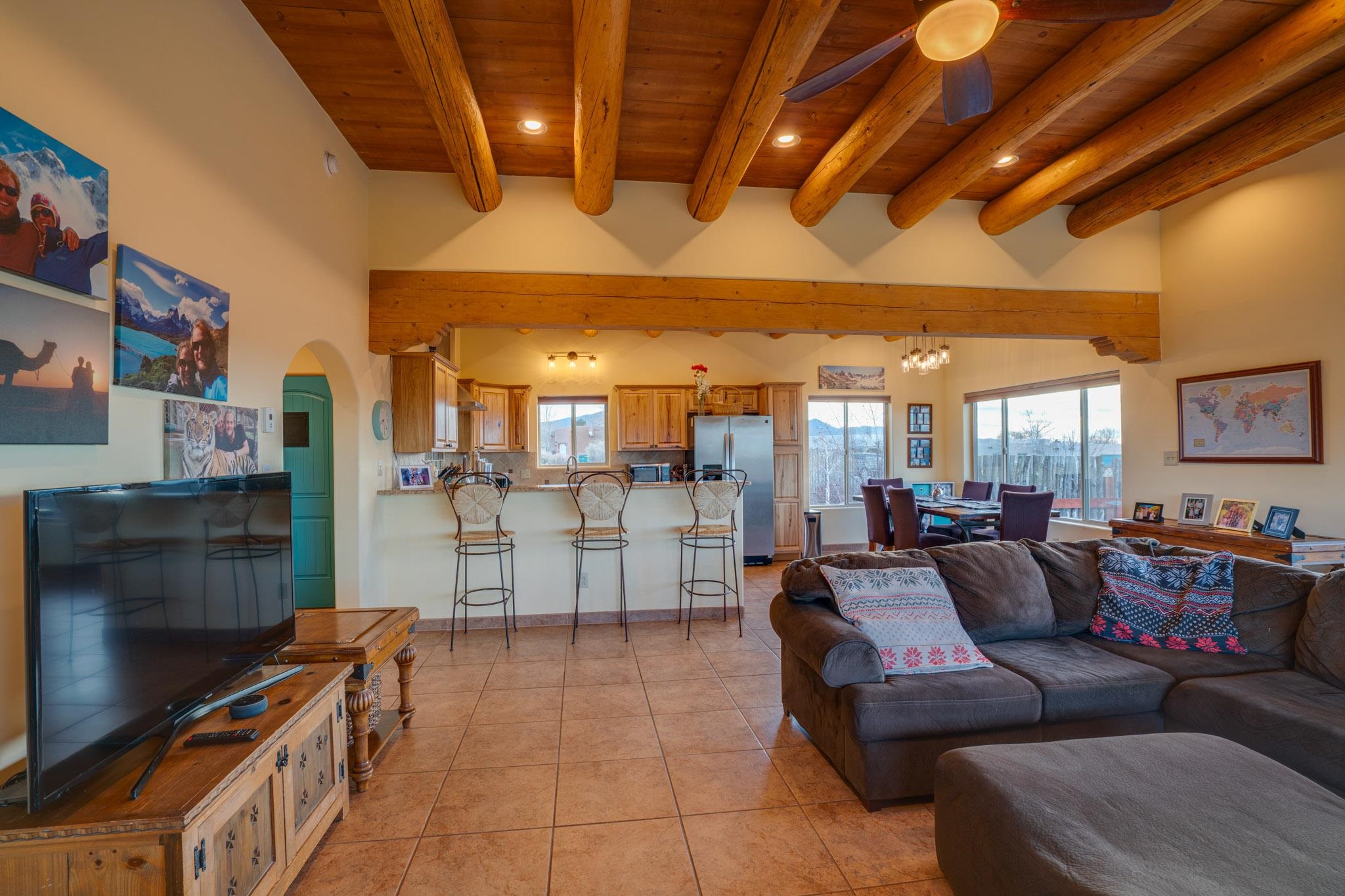 This beautifully designed 1,516 sq ft home offers 3 bedrooms and two bathrooms with a bright, open-concept layout ideal for both comfortable living and effortless entertaining. The living space is centered around a striking picture window that perfectly frames sweeping views of the Sangre de Christo Mountains, flooding the home with natural light and a constant connection to the outdoors. A seamless flow between the kitchen, dining, and living area creates a warm and comfortable atmosphere. Step outside for an outdoor retreat crafted for relaxation and unforgettable views. An expansive covered patio showcases panoramic mountain views - perfect for morning coffee or sunset gatherings. Enjoy year round soaking in the hot tub beneath clear New Mexico skies, while low-maintenance turf keeps the yard prestine. A classic latilla fence adds privacy and timeless New Mexico charm. Set within the private, desirable and well-maintained Las Olas Subdivision, this home offers peace, community, and exceptional access - just five minutes from downtown Taos and 35 minutes from Taos Ski Valley.